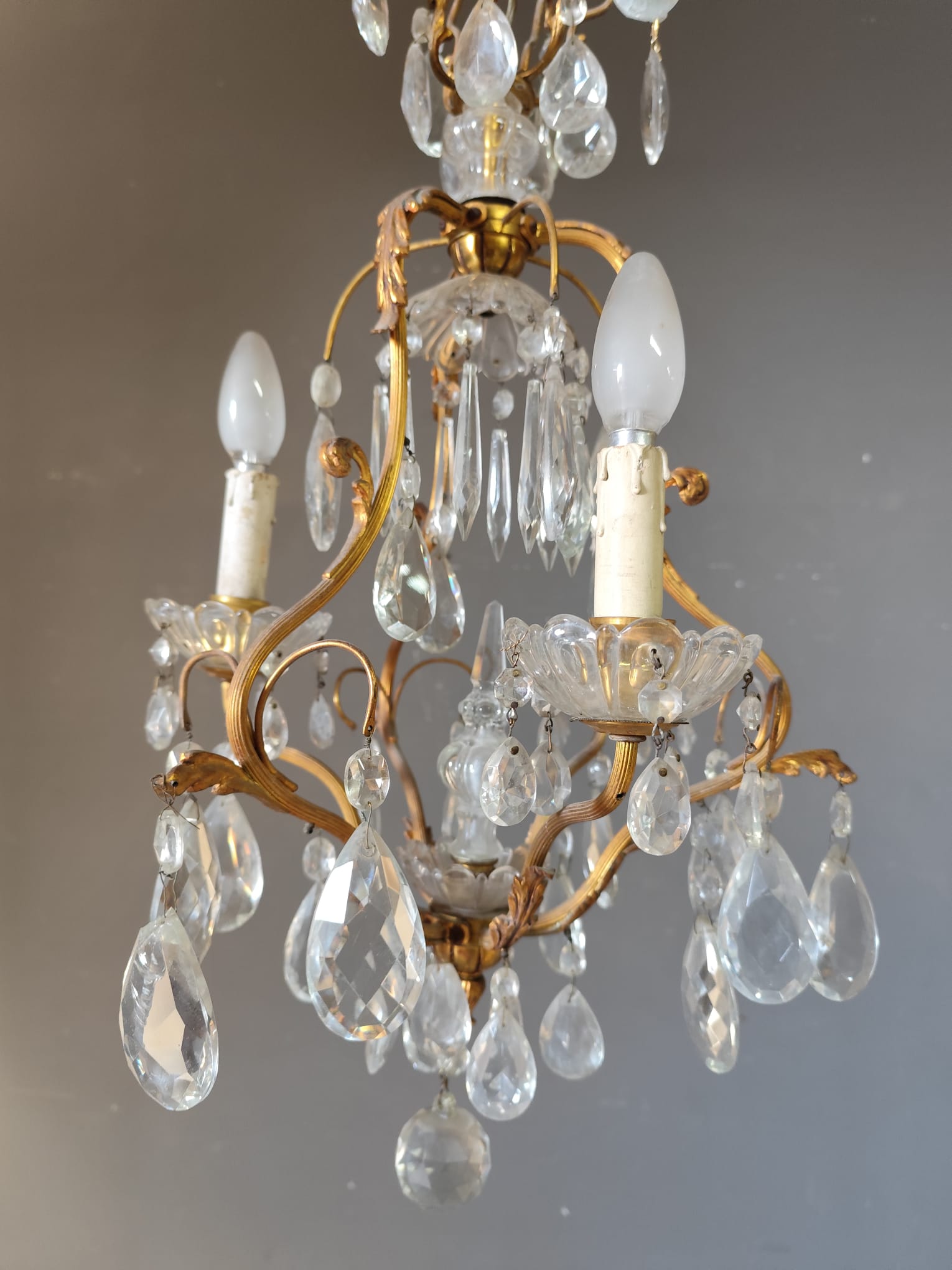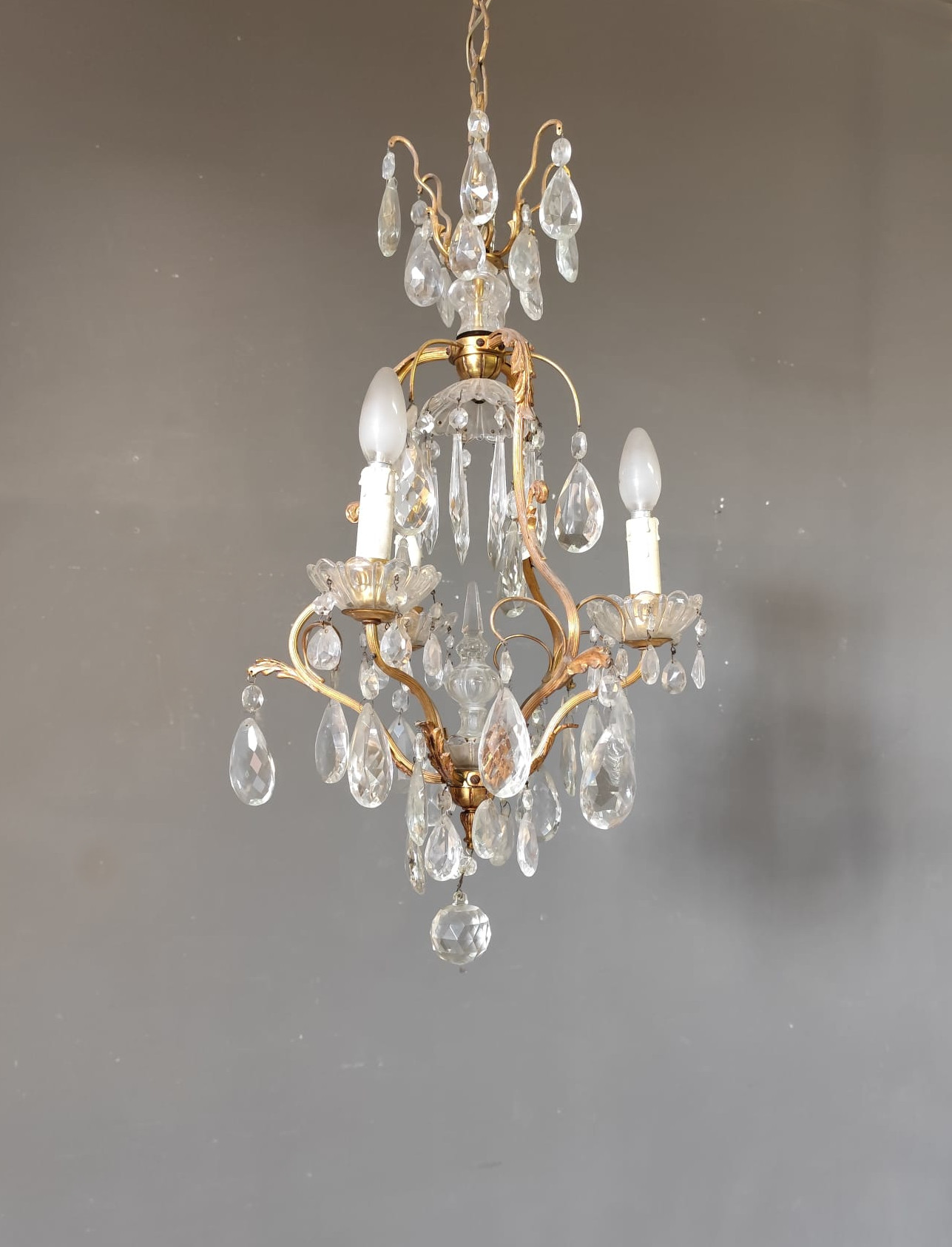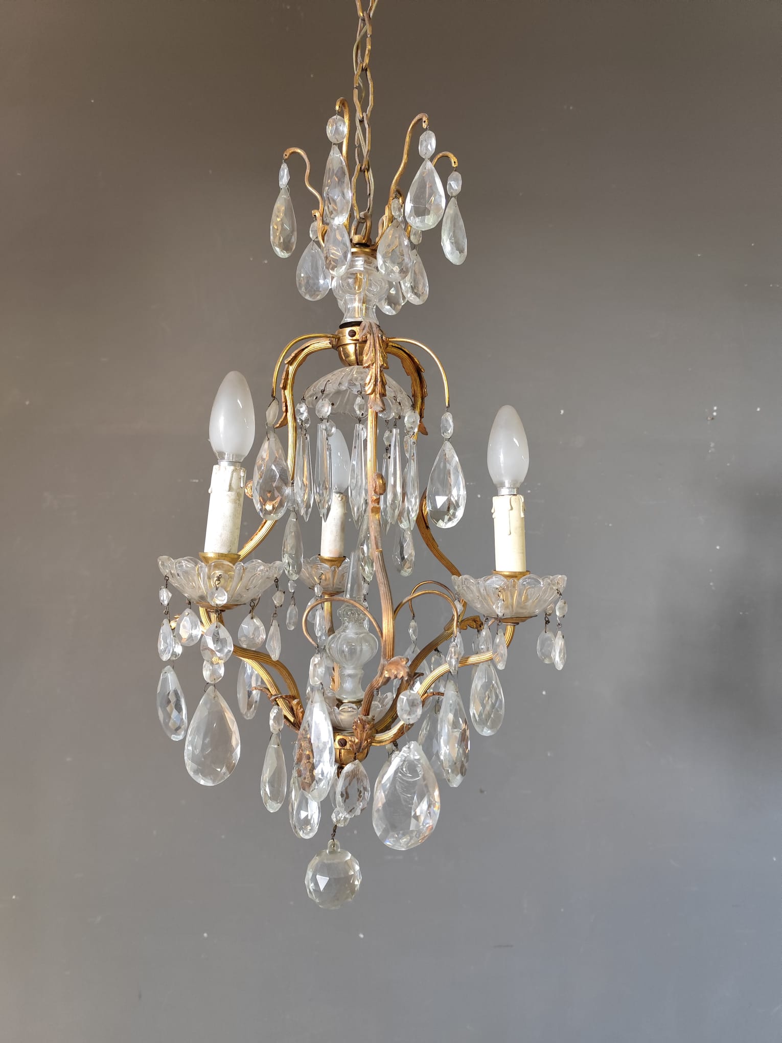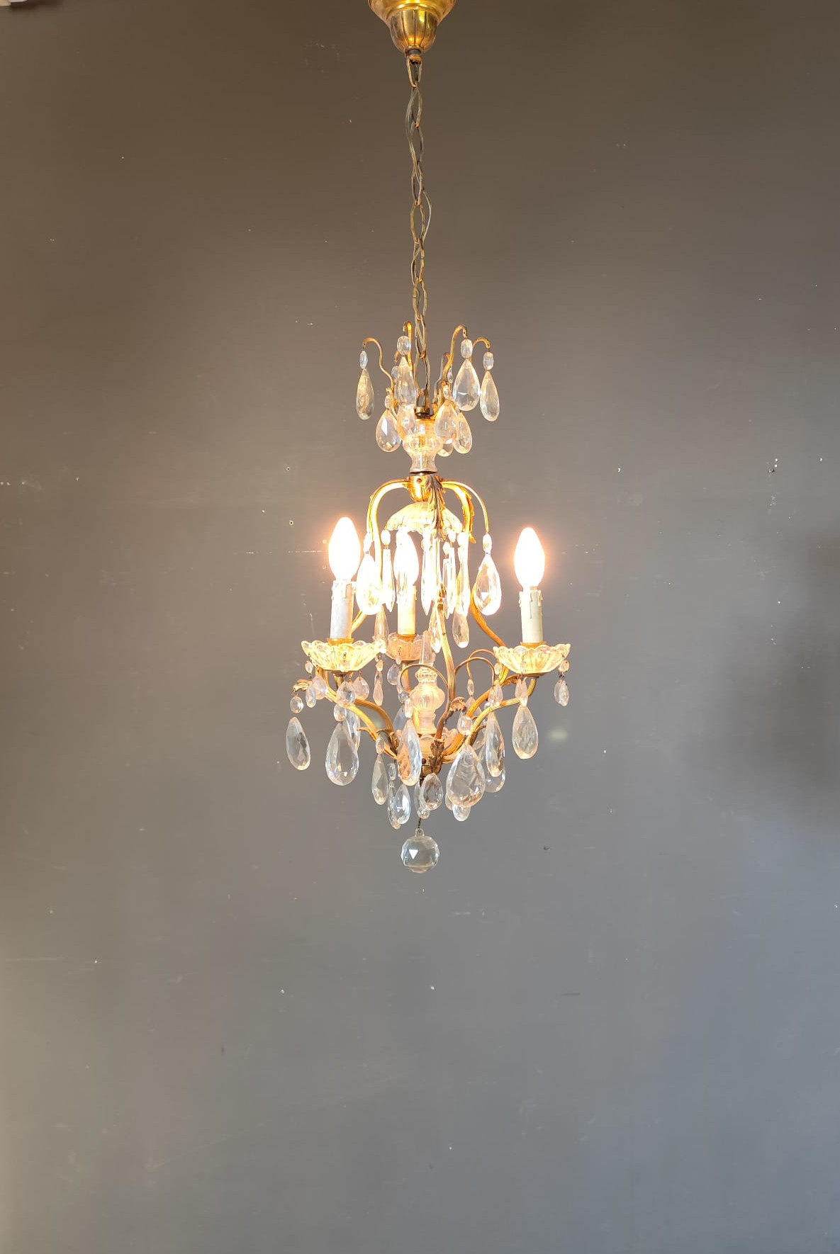 Small gilded bronze three-light chandelier with Bohemian crystal pendants. In perfect condition.