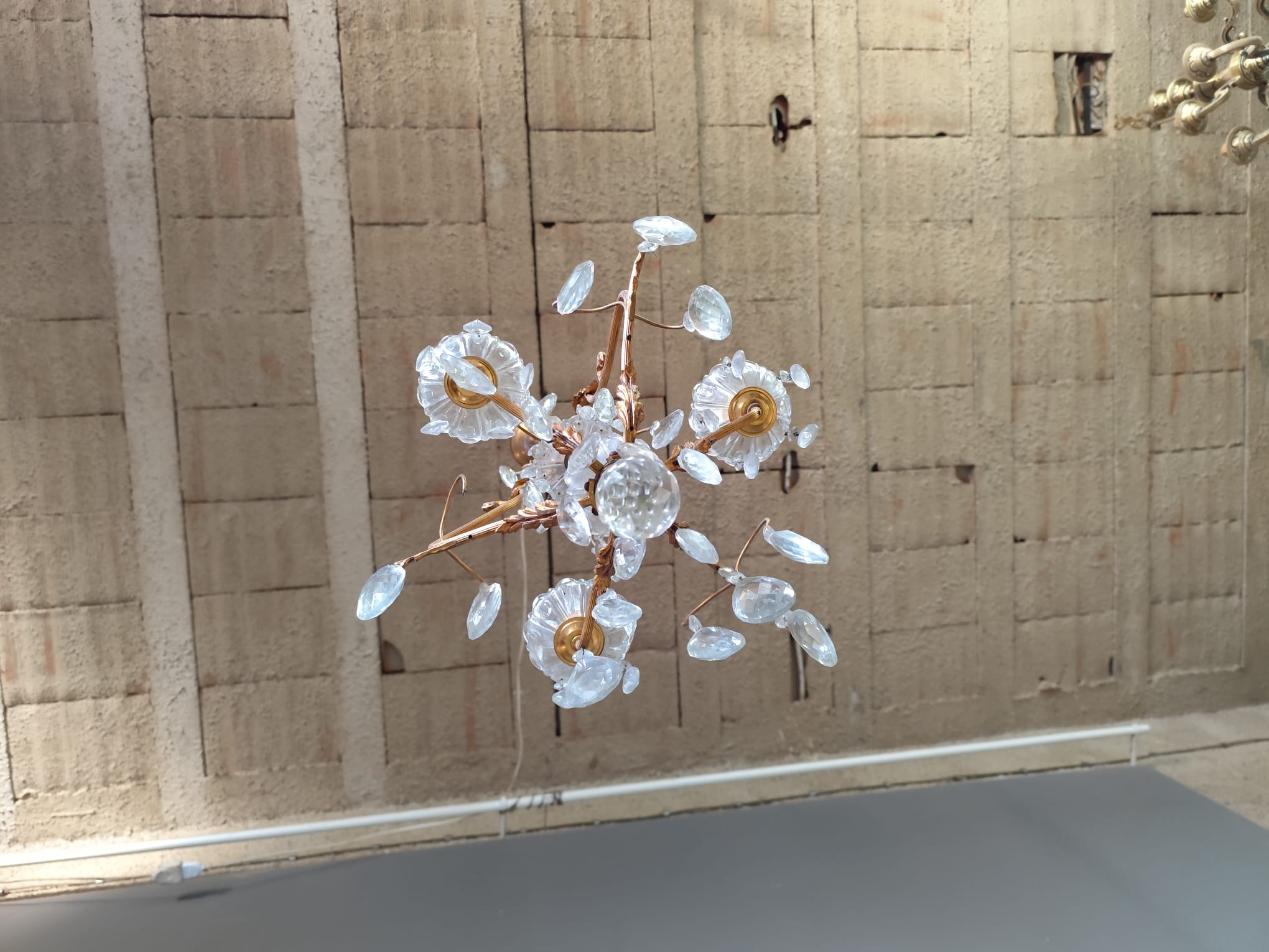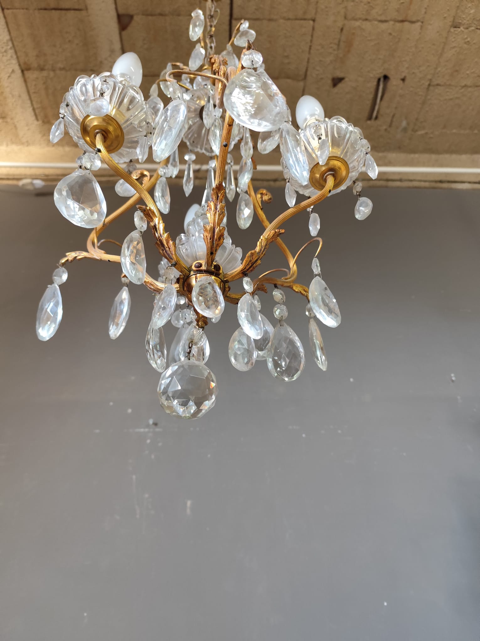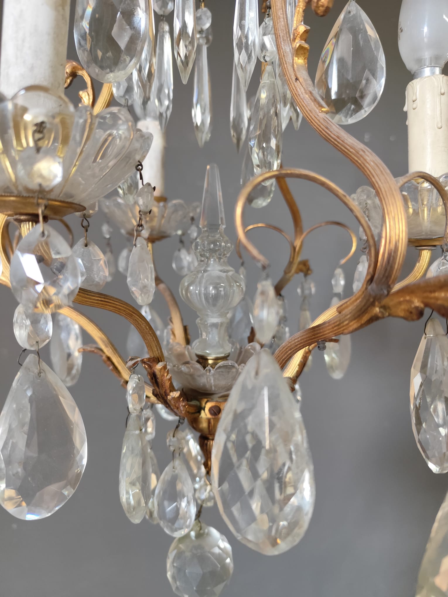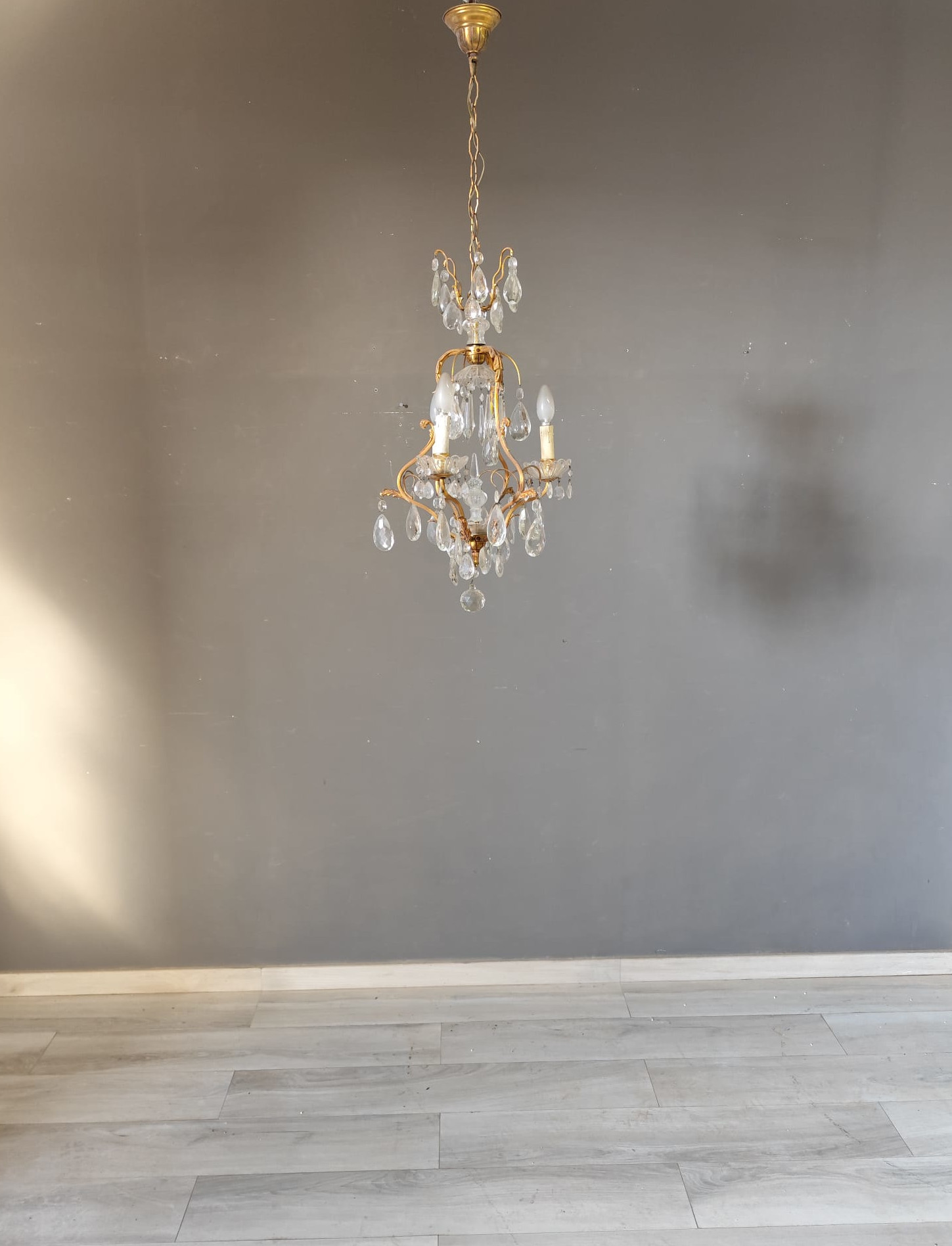 Small gilded bronze three-light chandelier with Bohemian crystal pendants. In perfect condition.