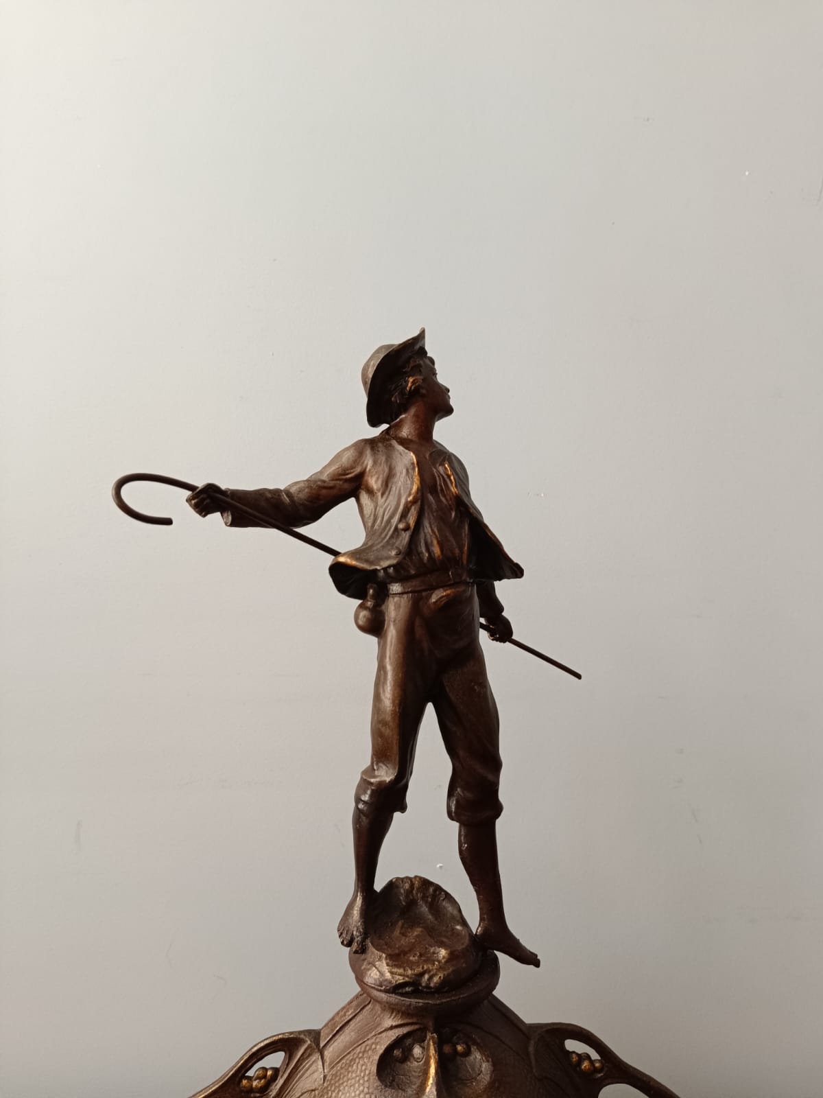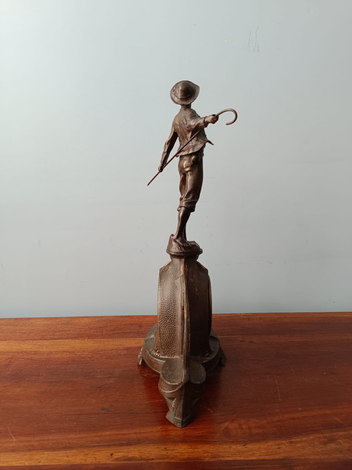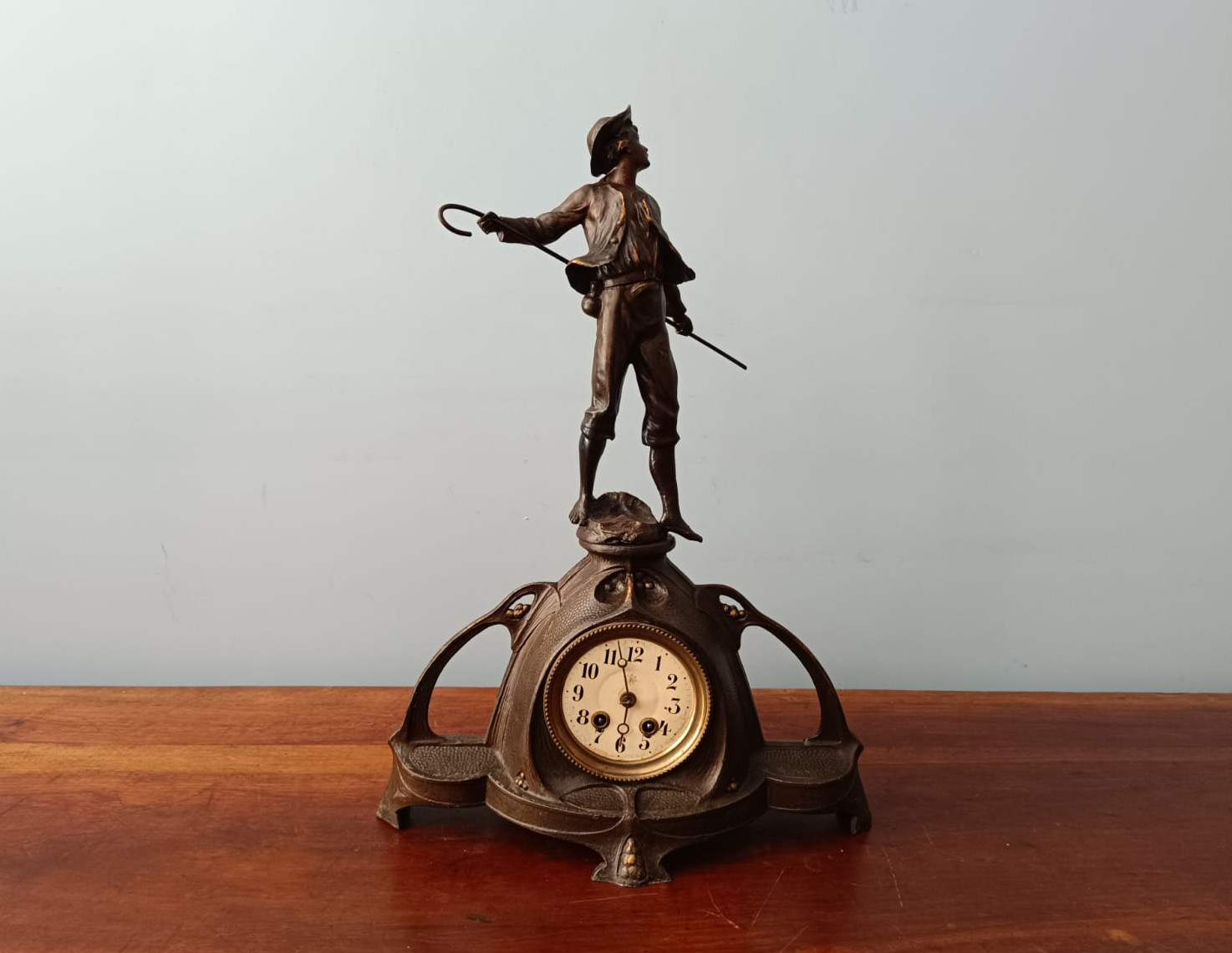 Liberty period sculpture with bronzed antimony clock. The sculpture represents a male figure with a stick.