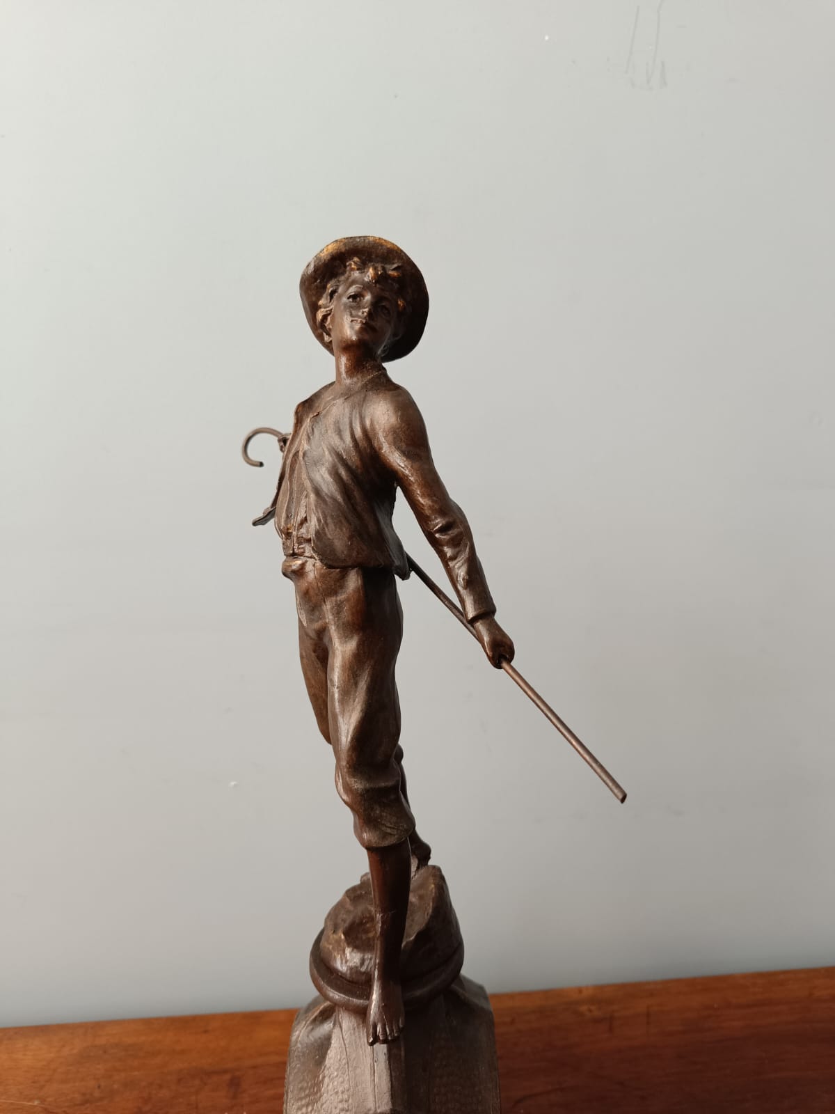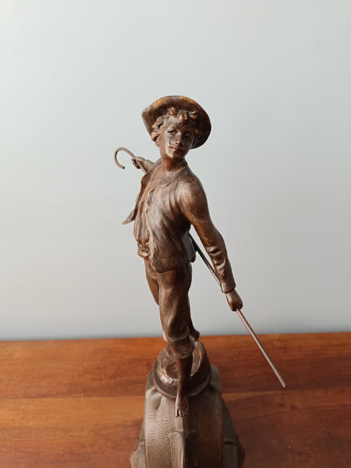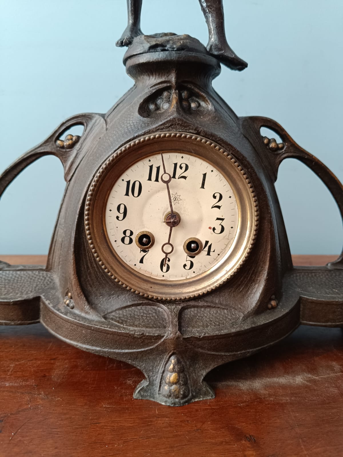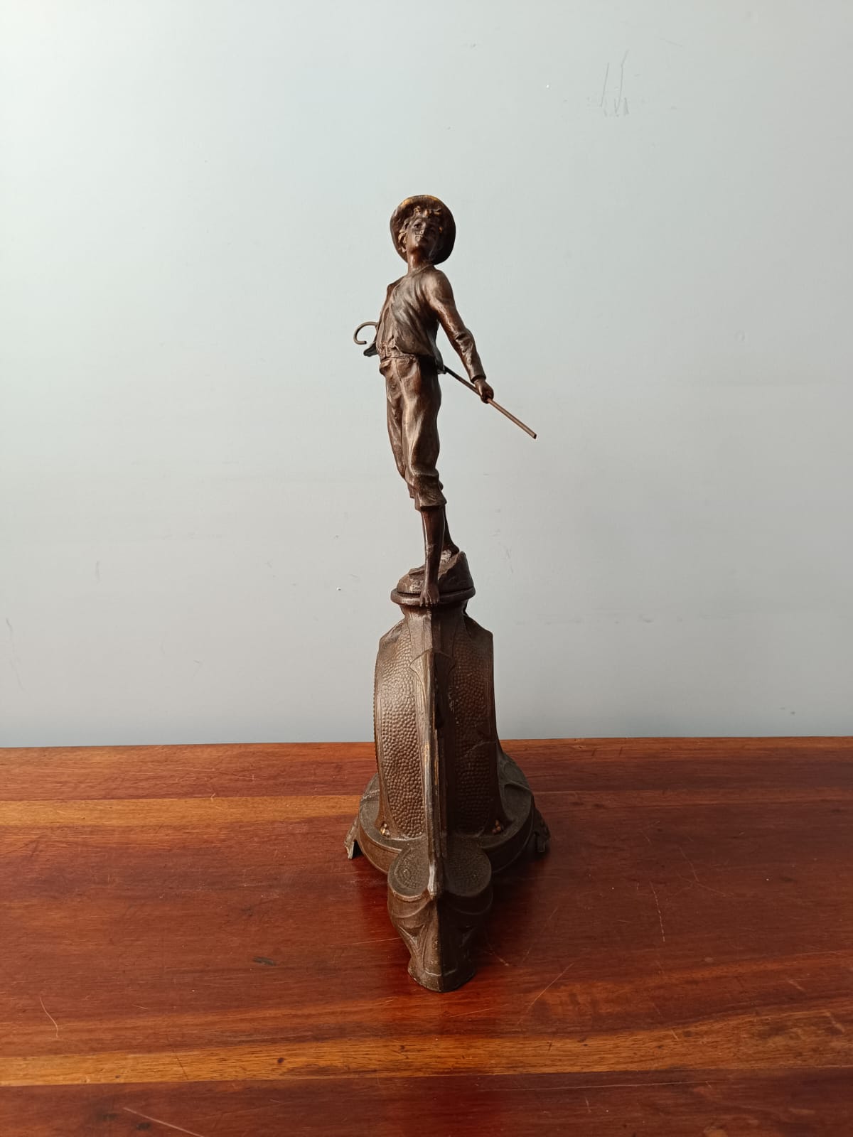 Liberty period sculpture with bronzed antimony clock. The sculpture represents a male figure with a stick.