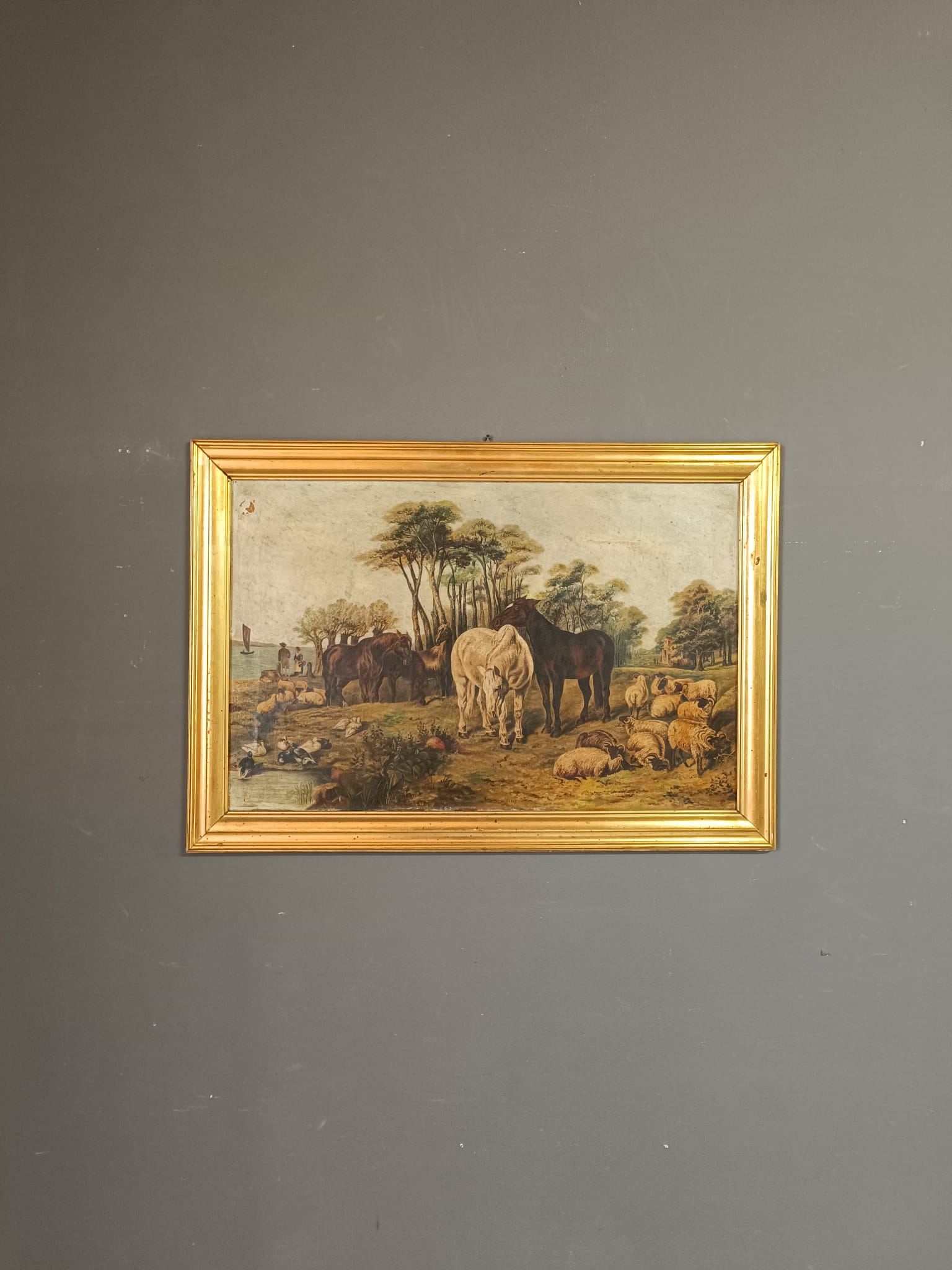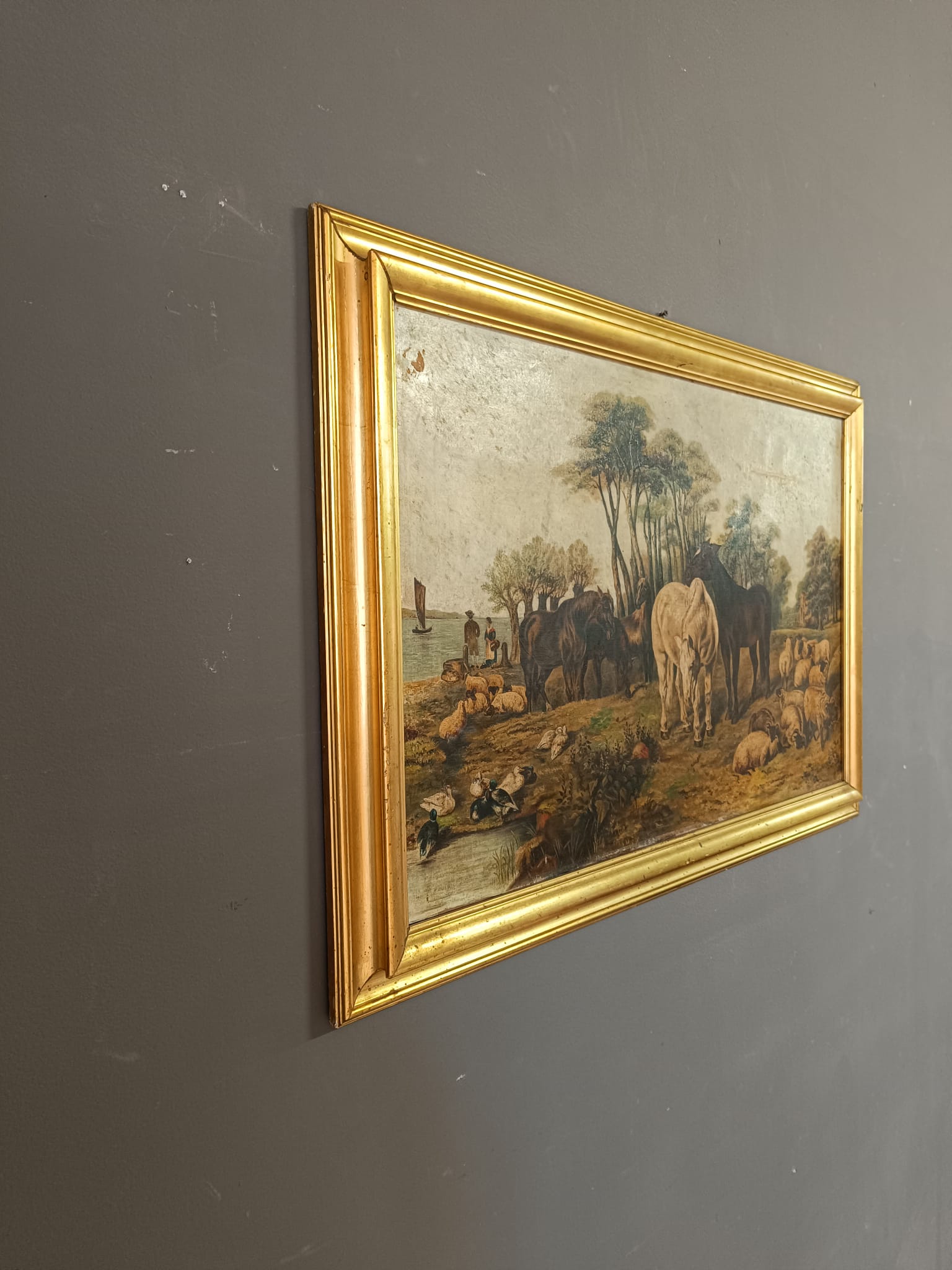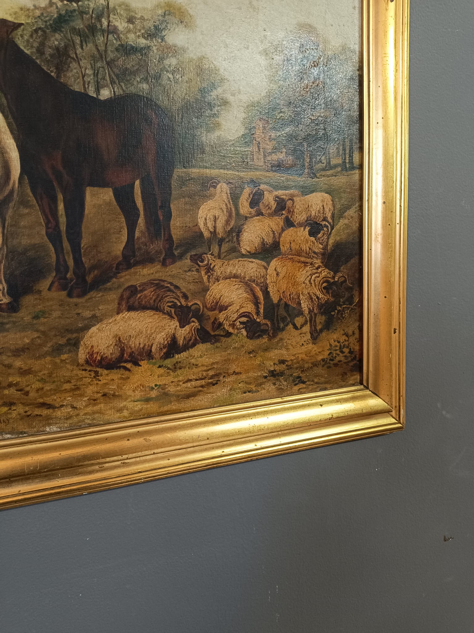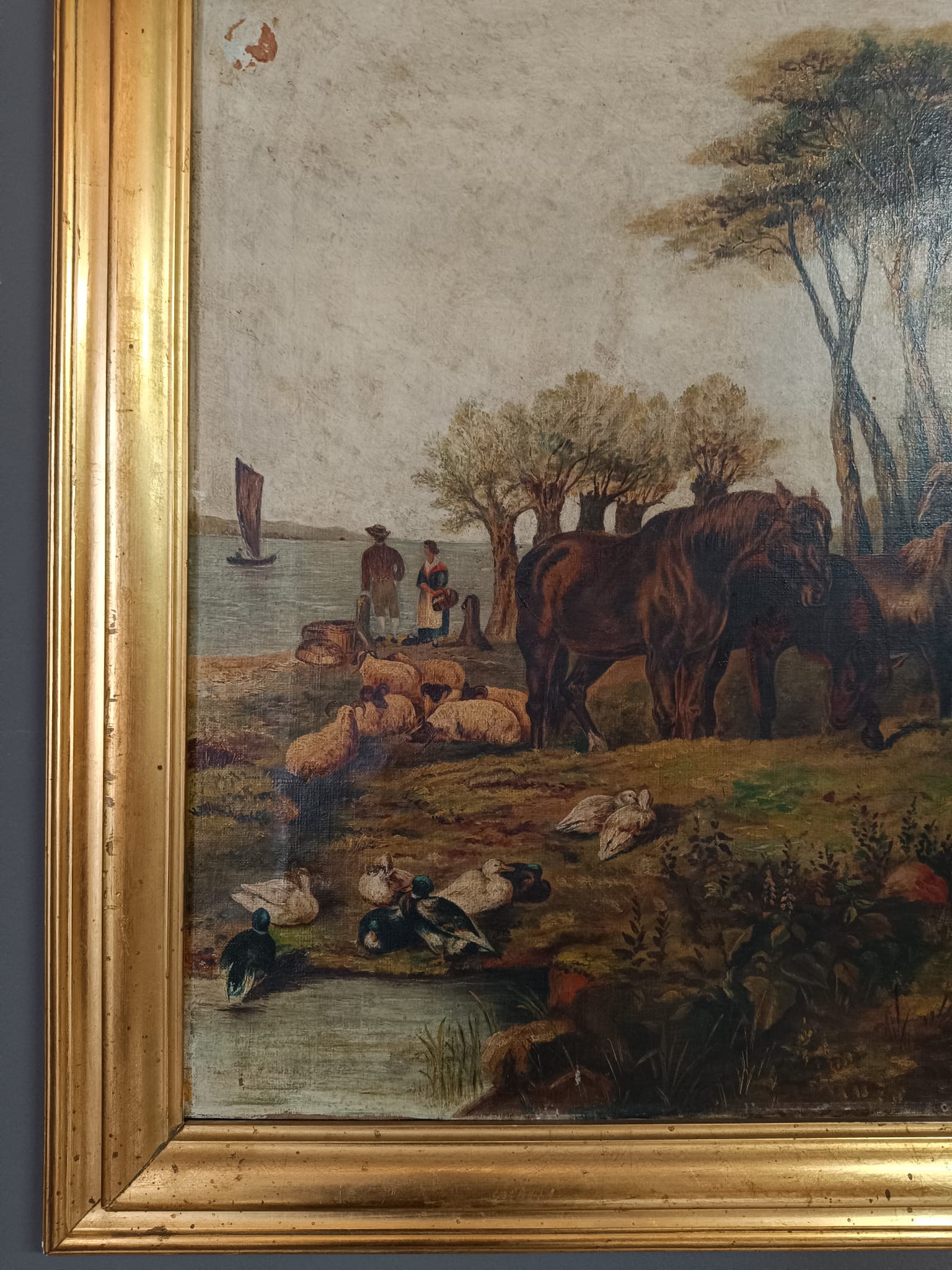 Beautiful oil painting on canvas from the 19th century and of English origin depicting a landscape scene with animals. Contemporary fine gold frame of excellent workmanship in perfect condition.