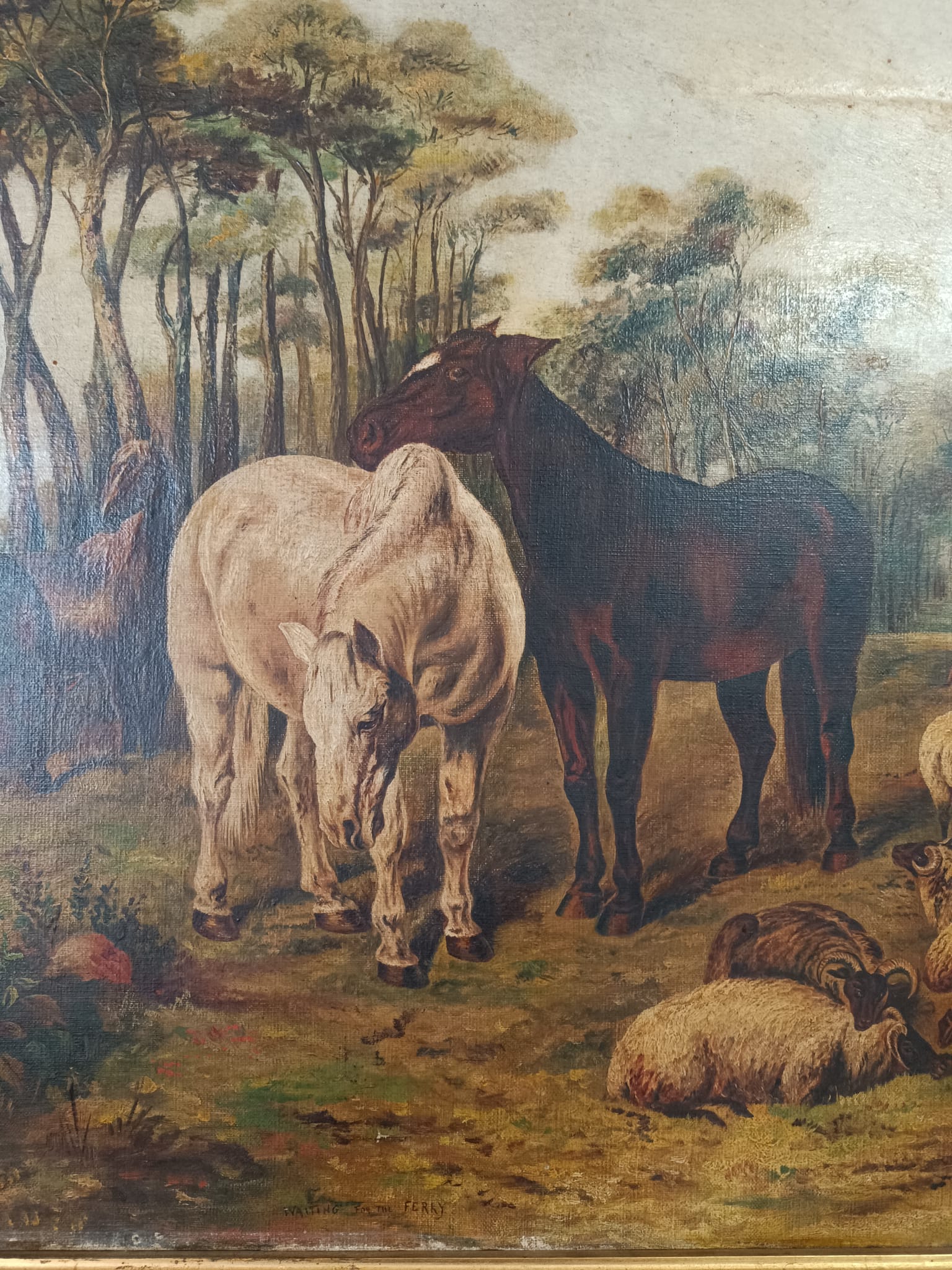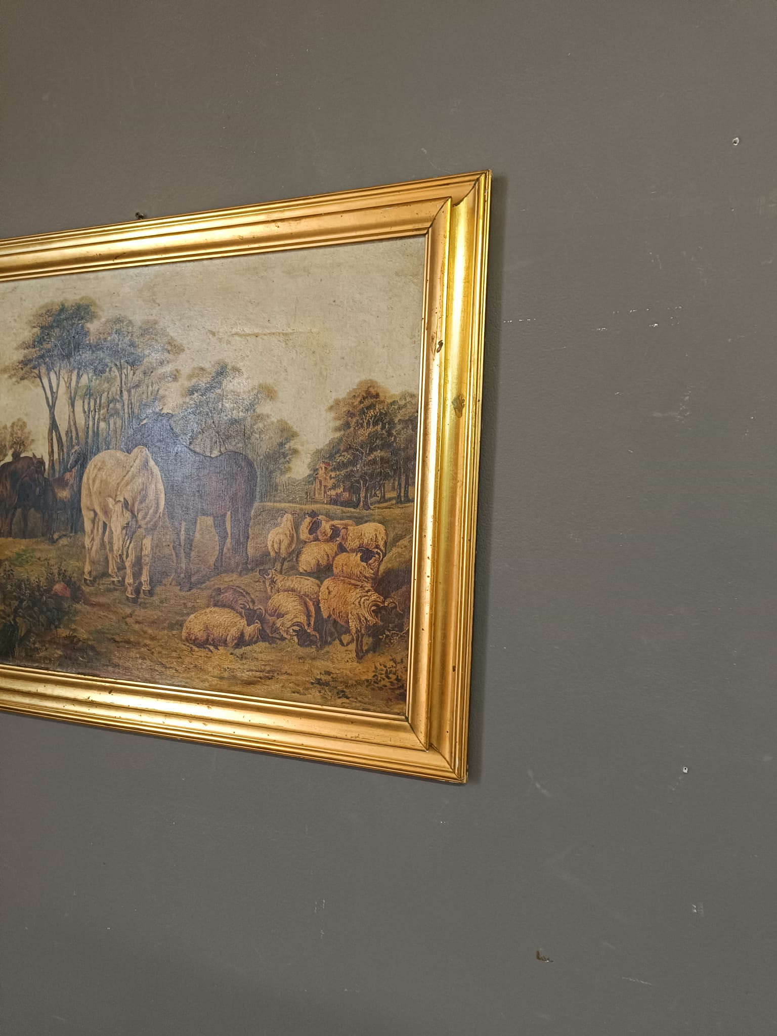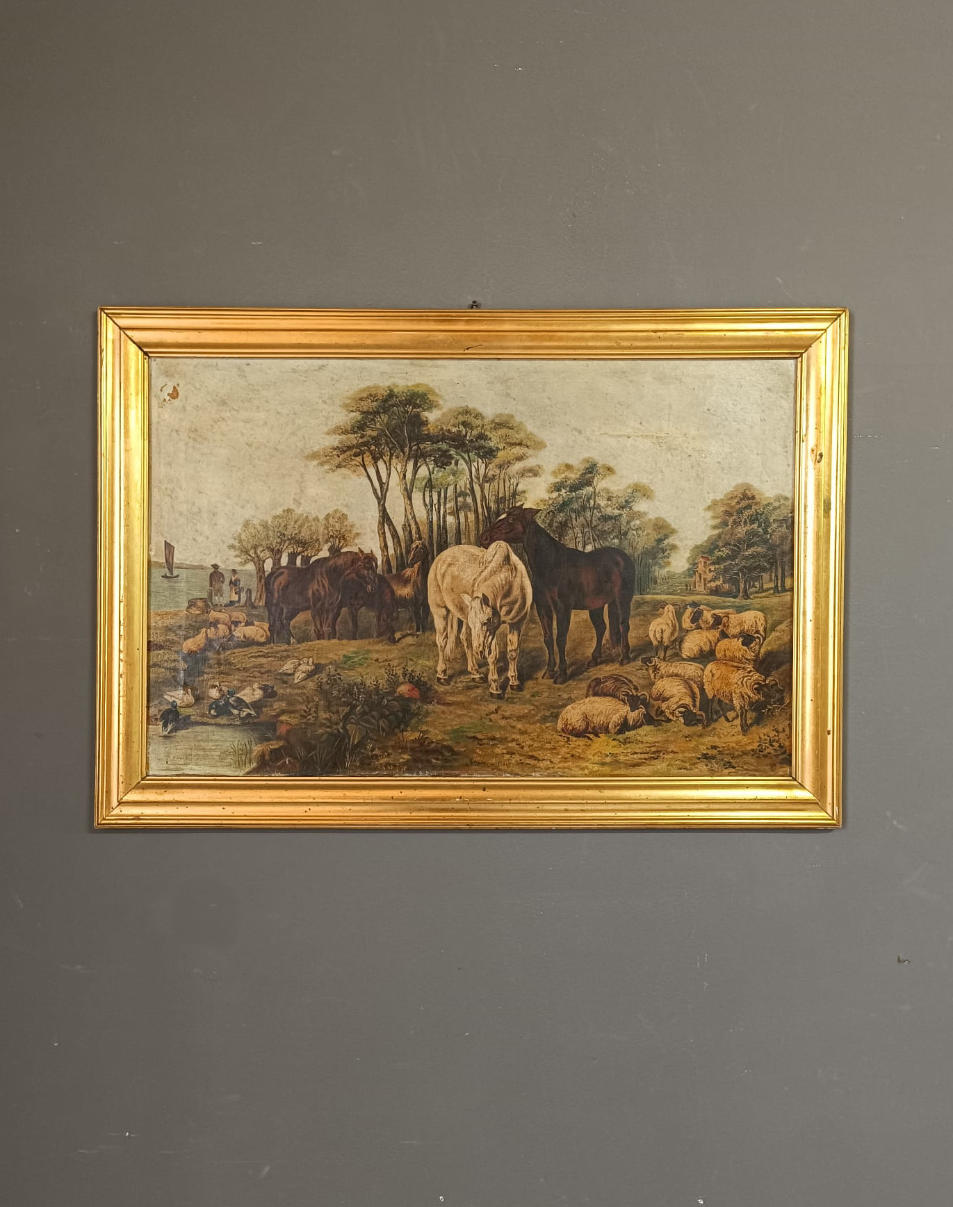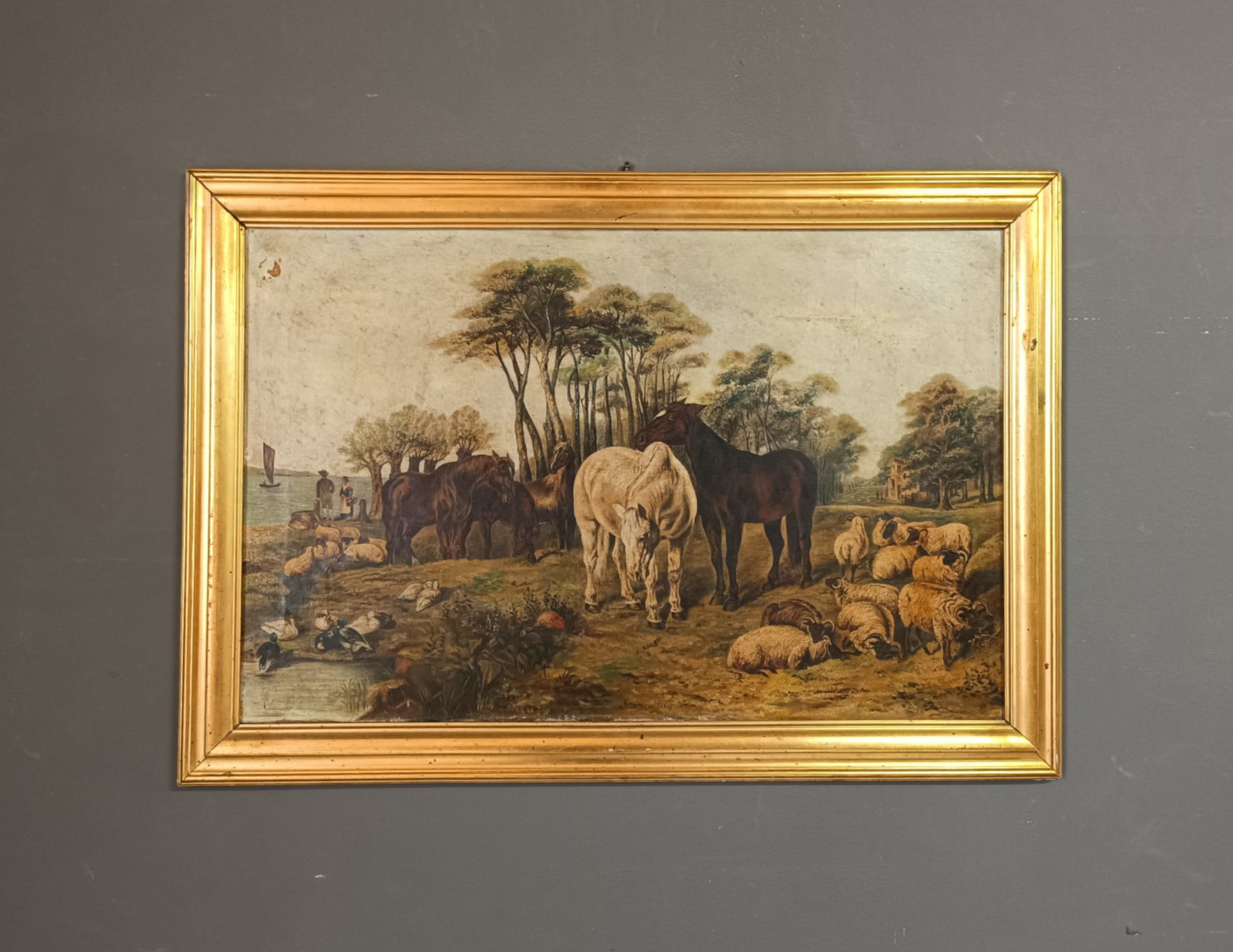Beautiful oil painting on canvas from the 19th century and of English origin depicting a landscape scene with animals. Contemporary fine gold frame of excellent workmanship in perfect condition.