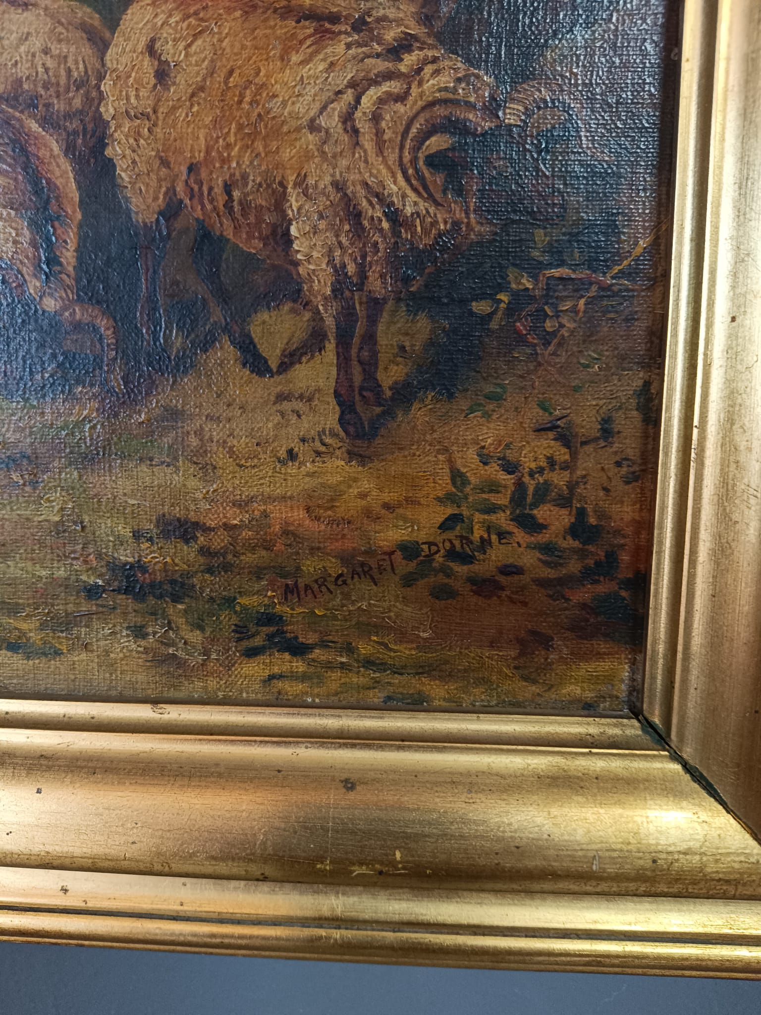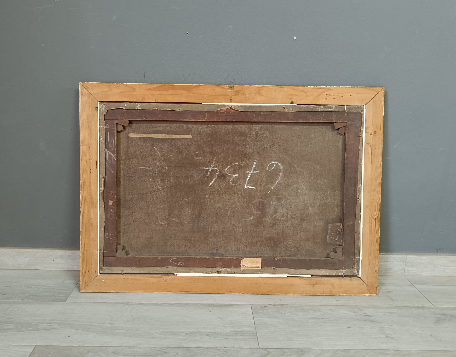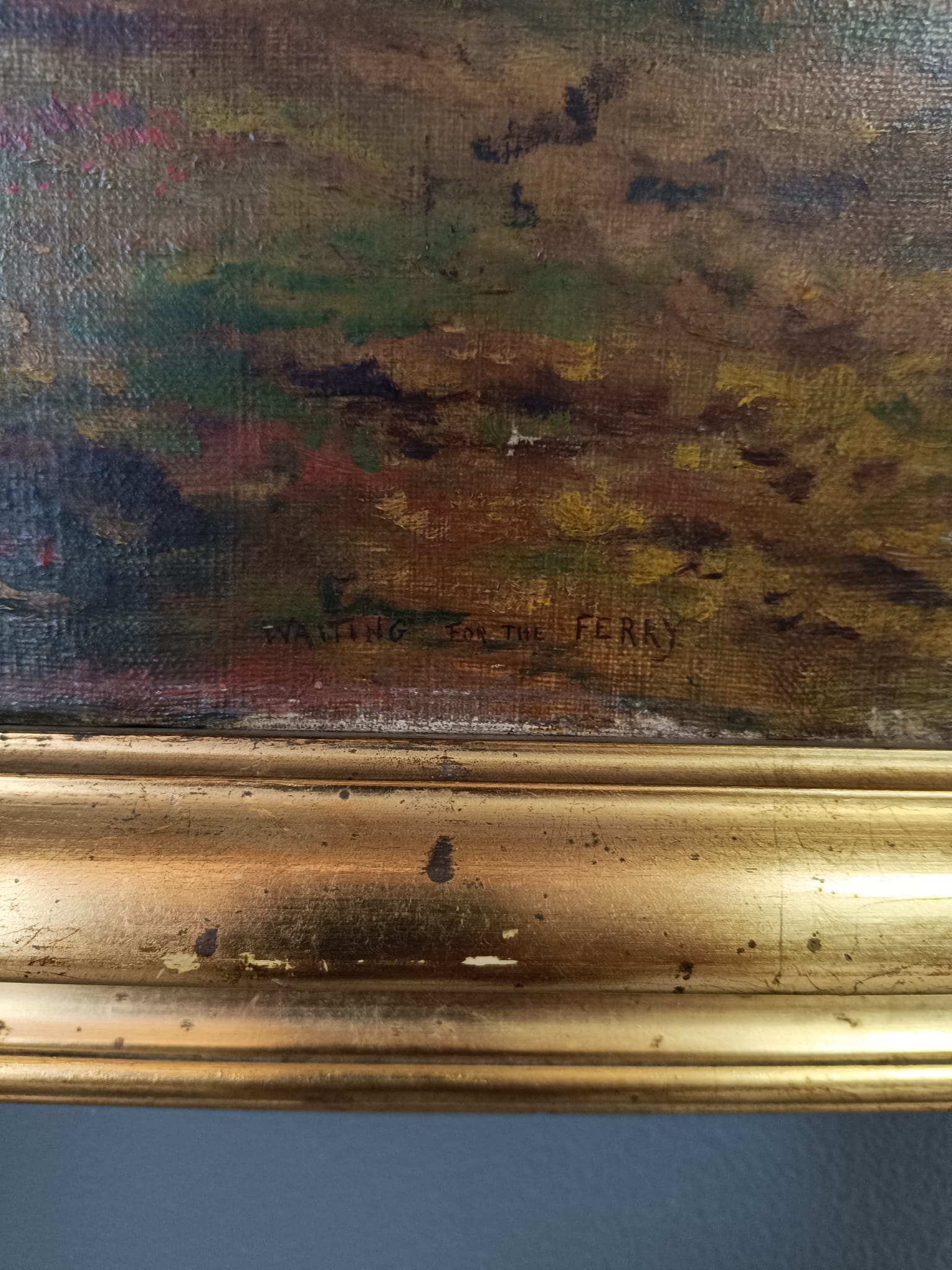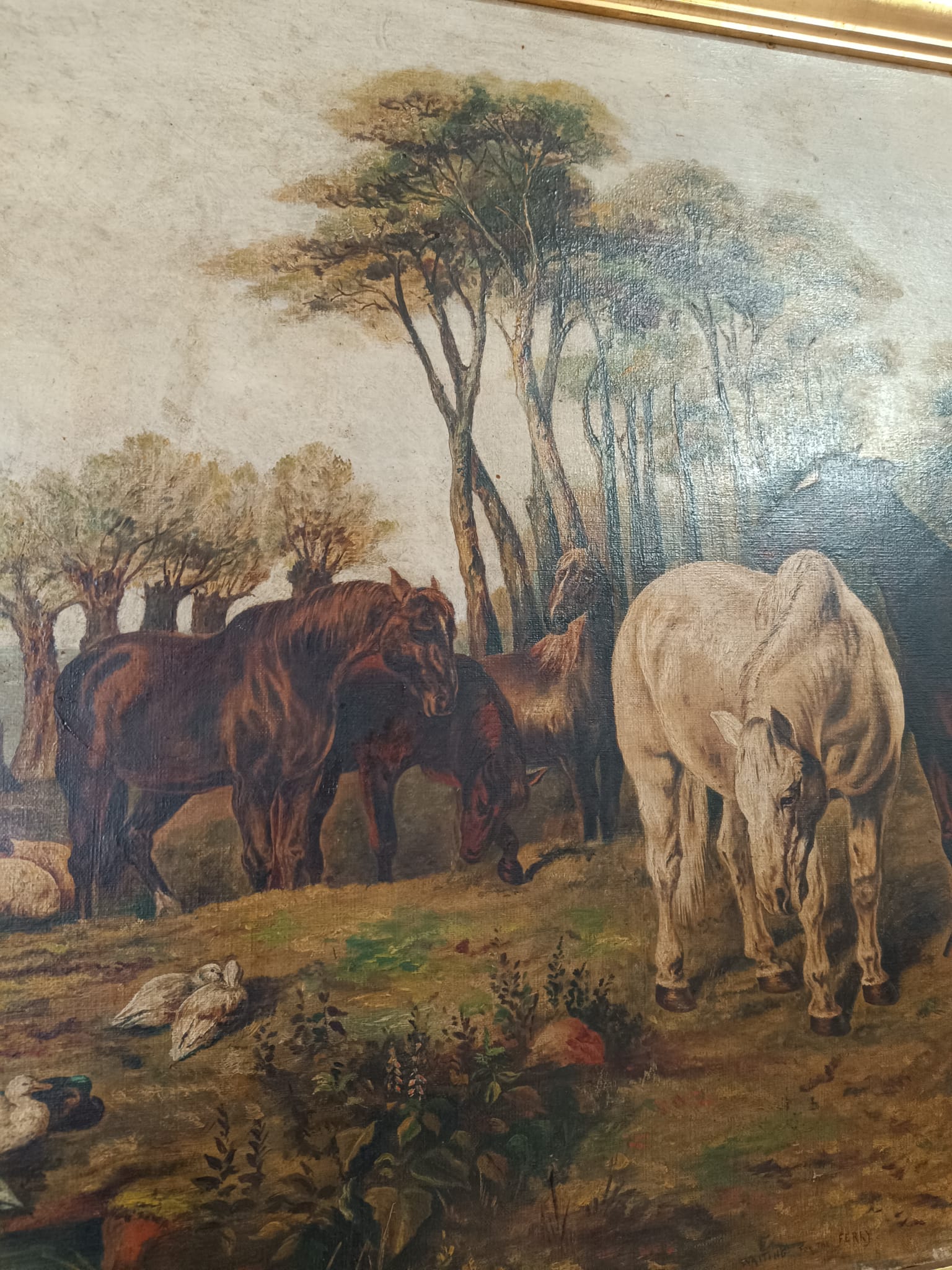 Beautiful oil painting on canvas from the 19th century and of English origin depicting a landscape scene with animals. Contemporary fine gold frame of excellent workmanship in perfect condition.