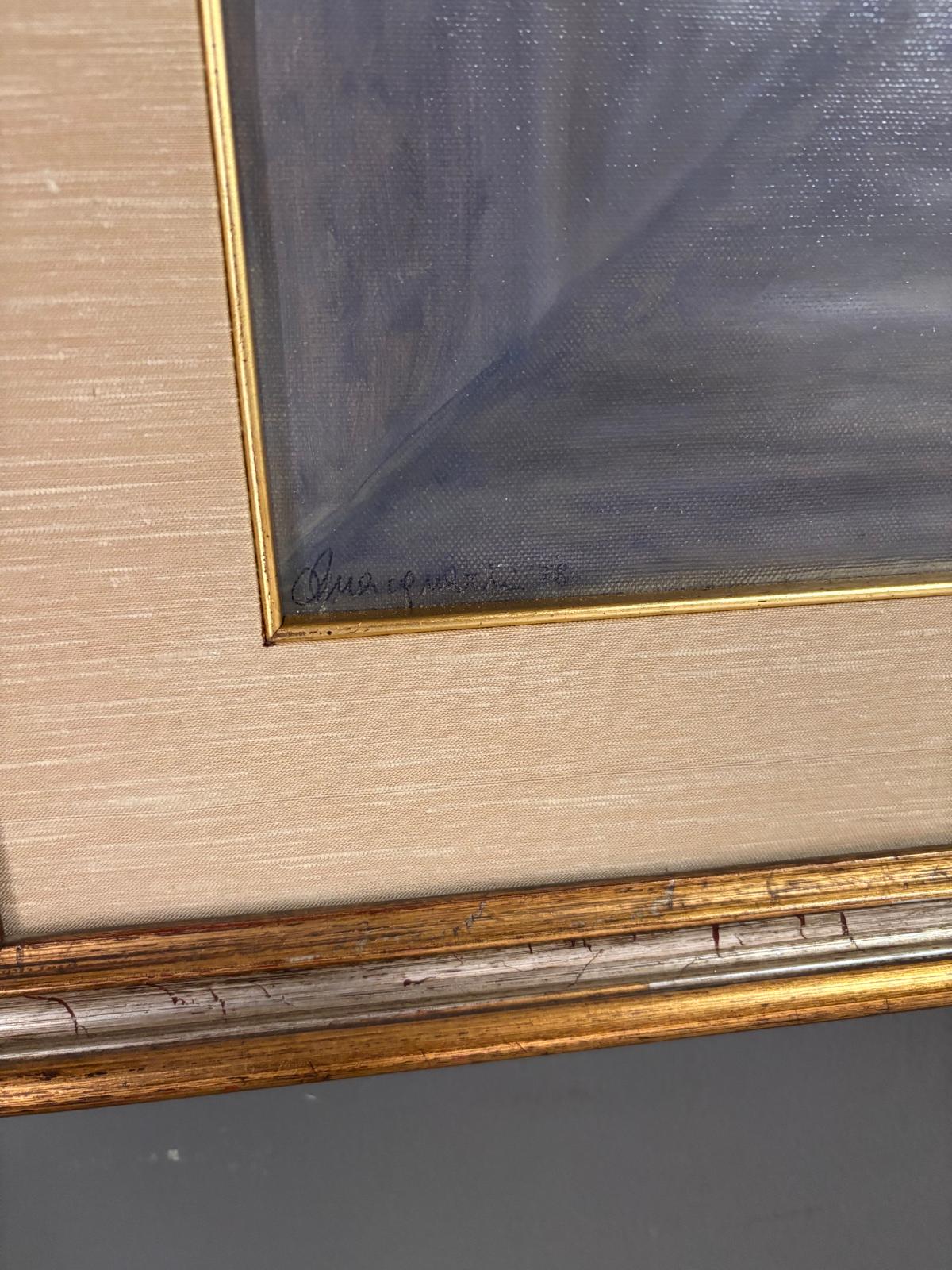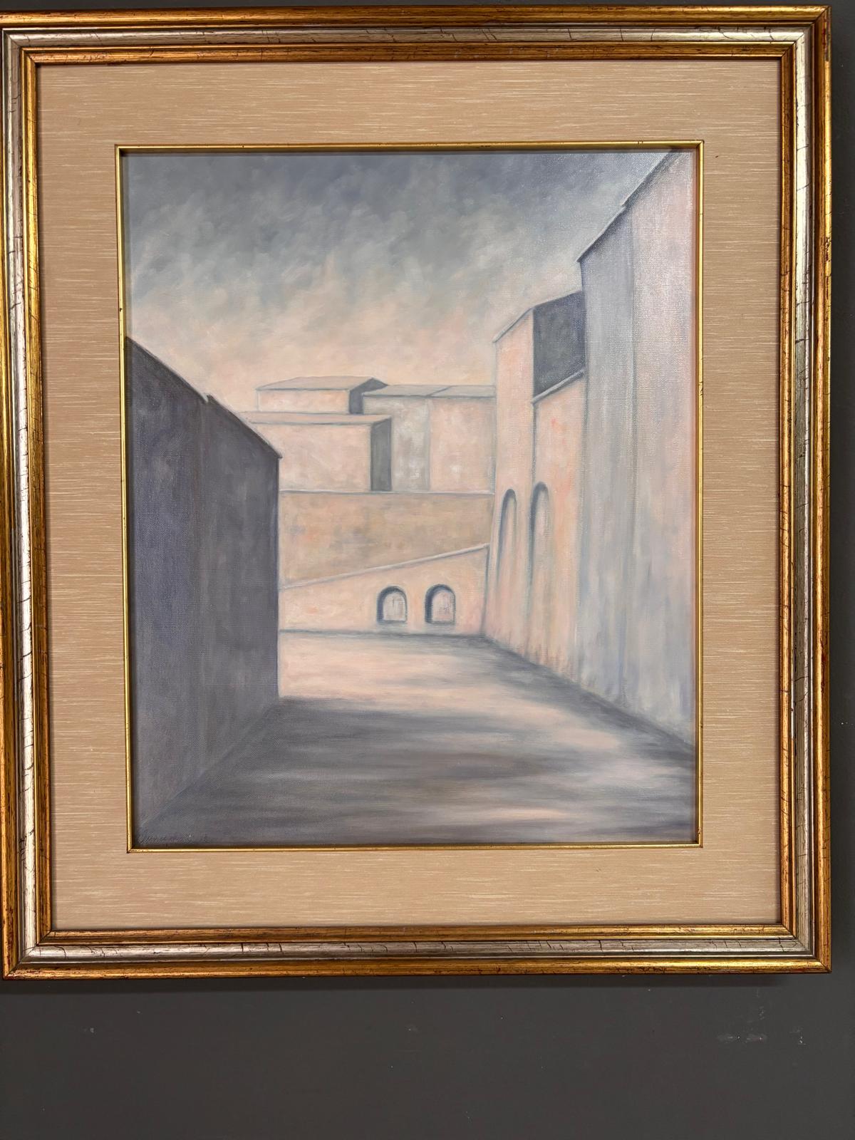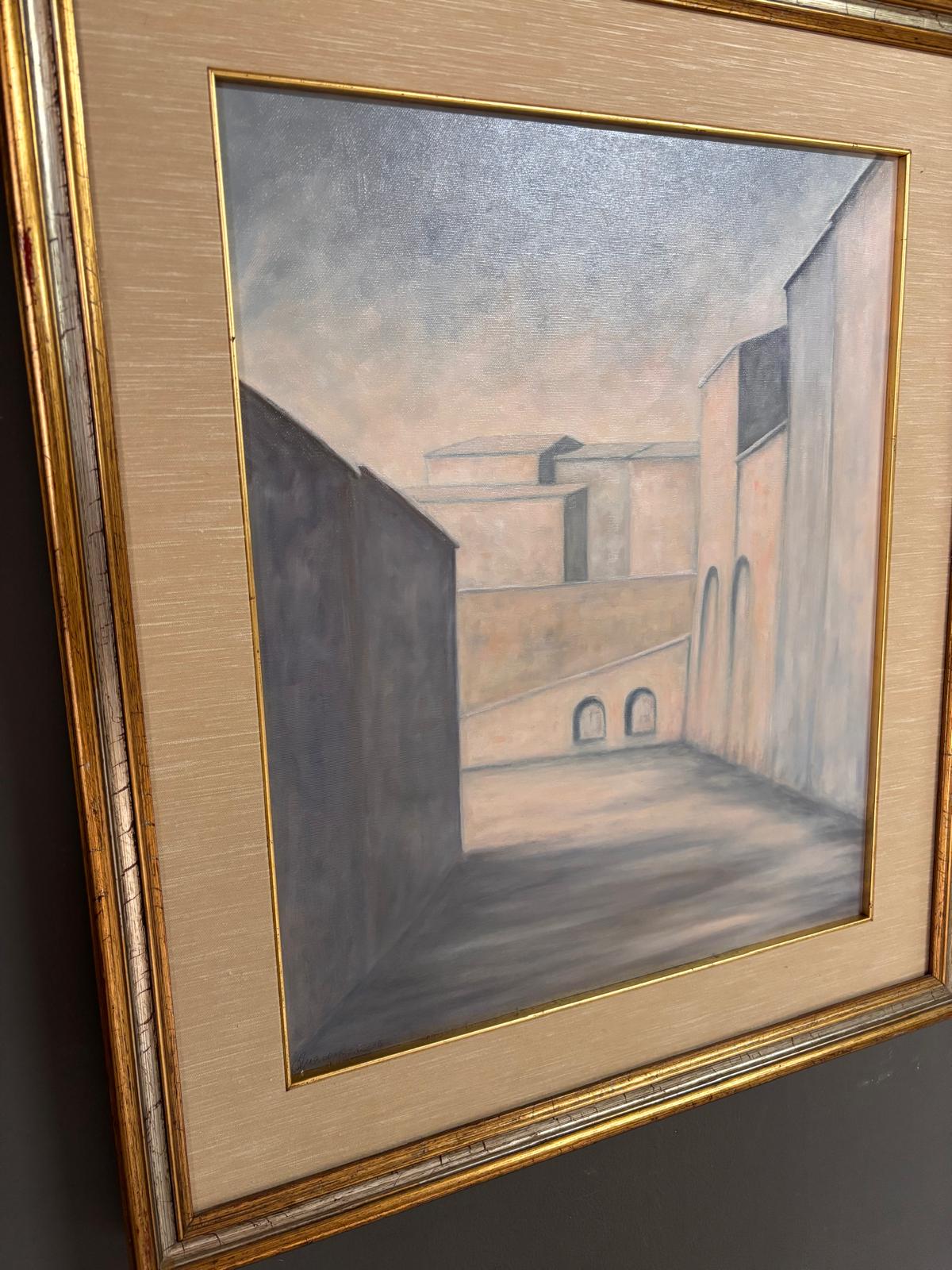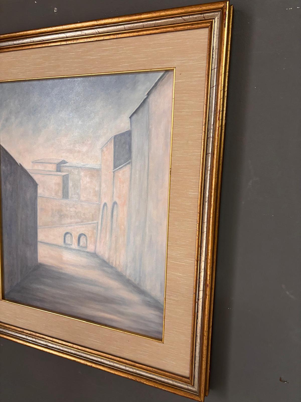 Olio su tela raffigurante delle case in prospettiva dai toni leggermente grigi firmato Quacquarini 78.