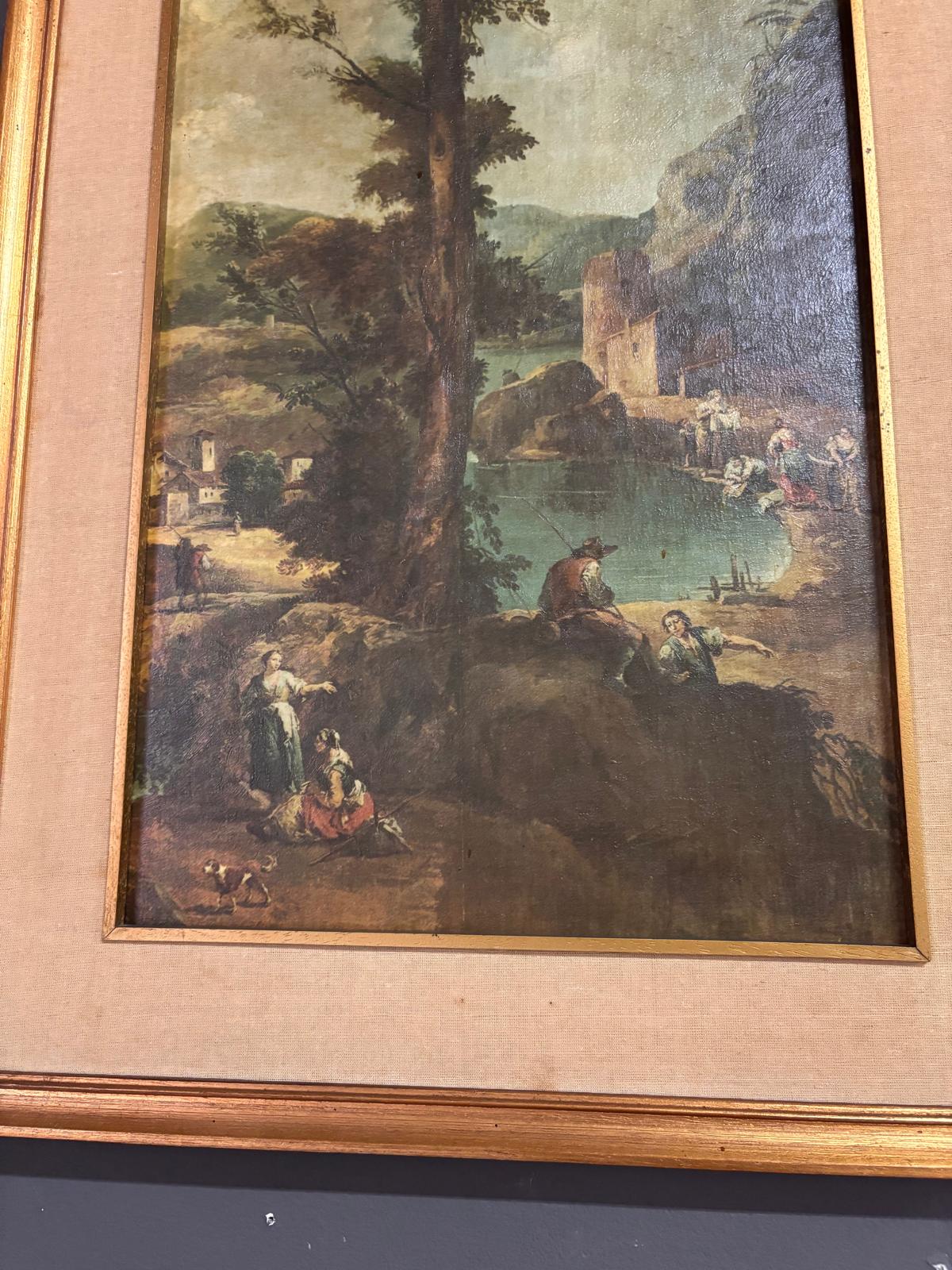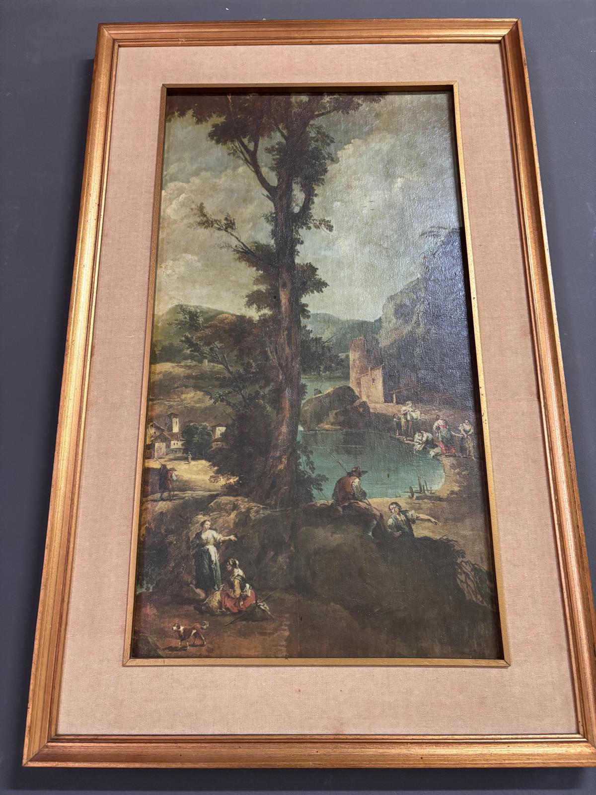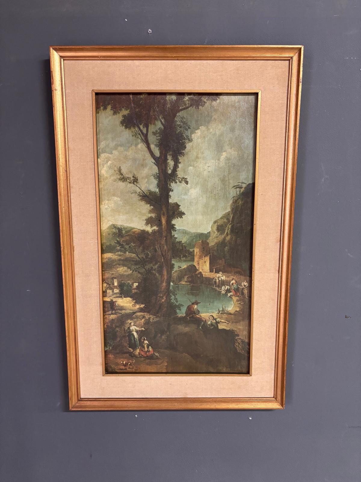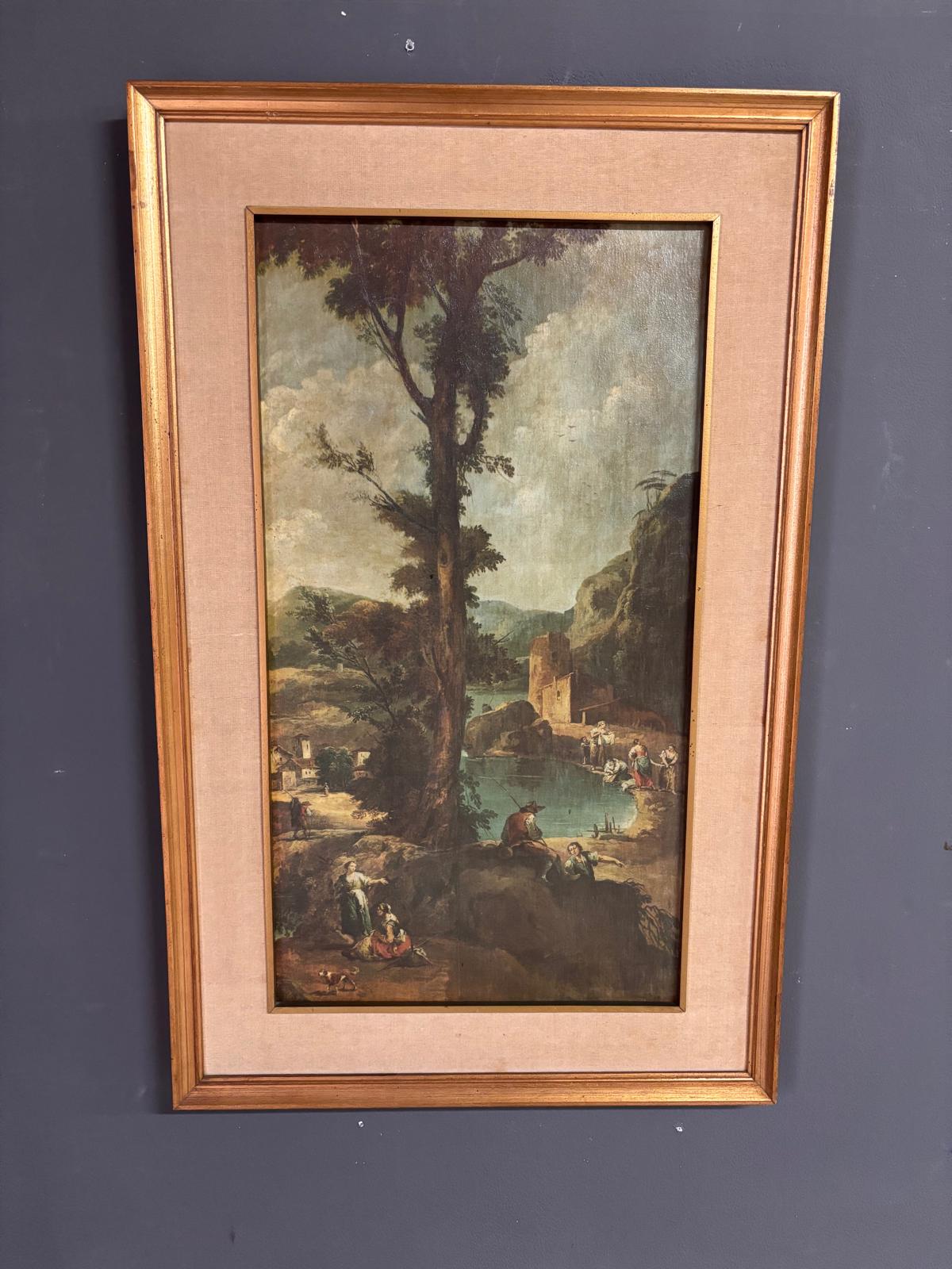 Olio su tela raffigurante un paesaggio con un albero ed un lago in primo piano degli anni 80.
