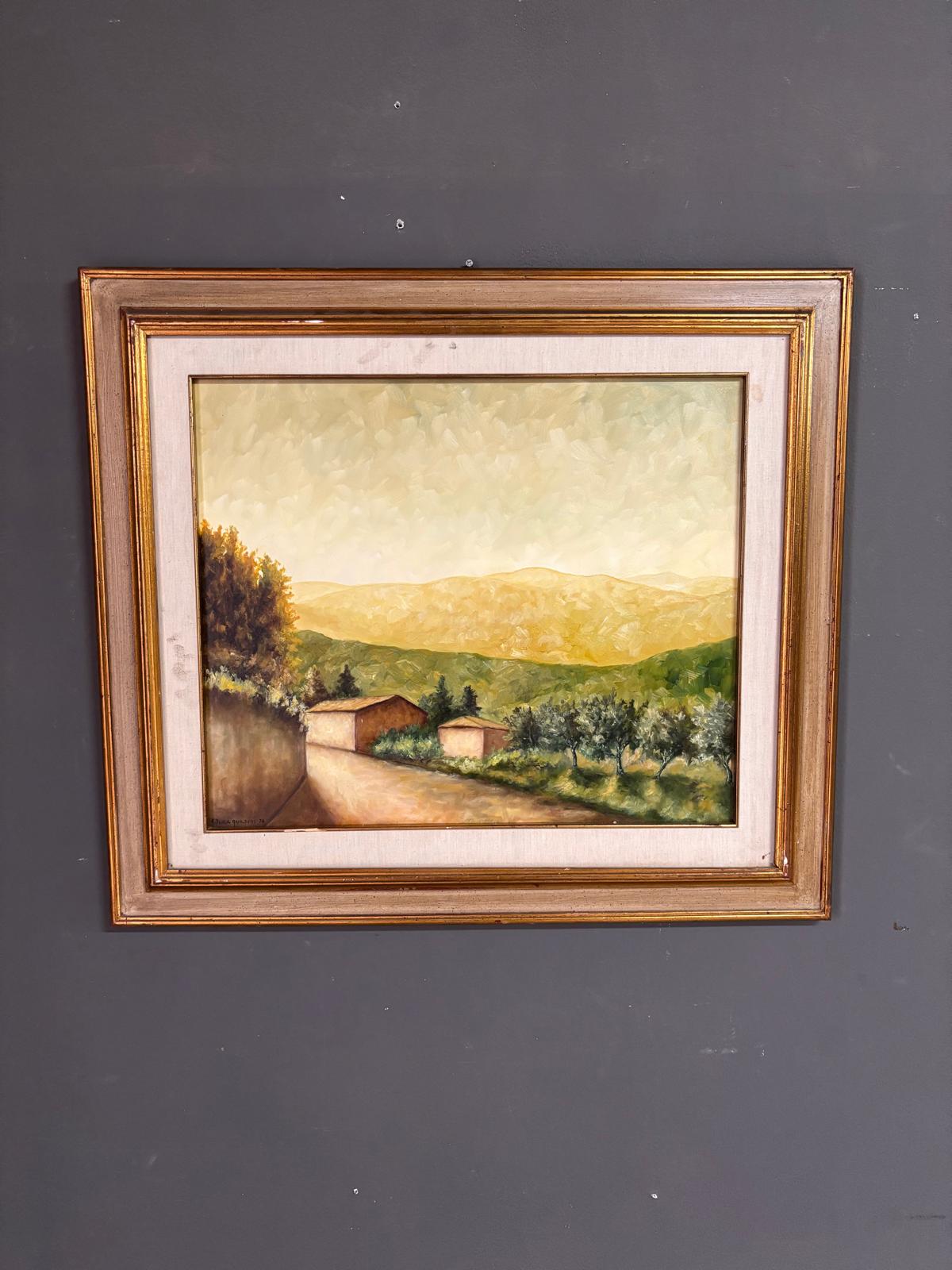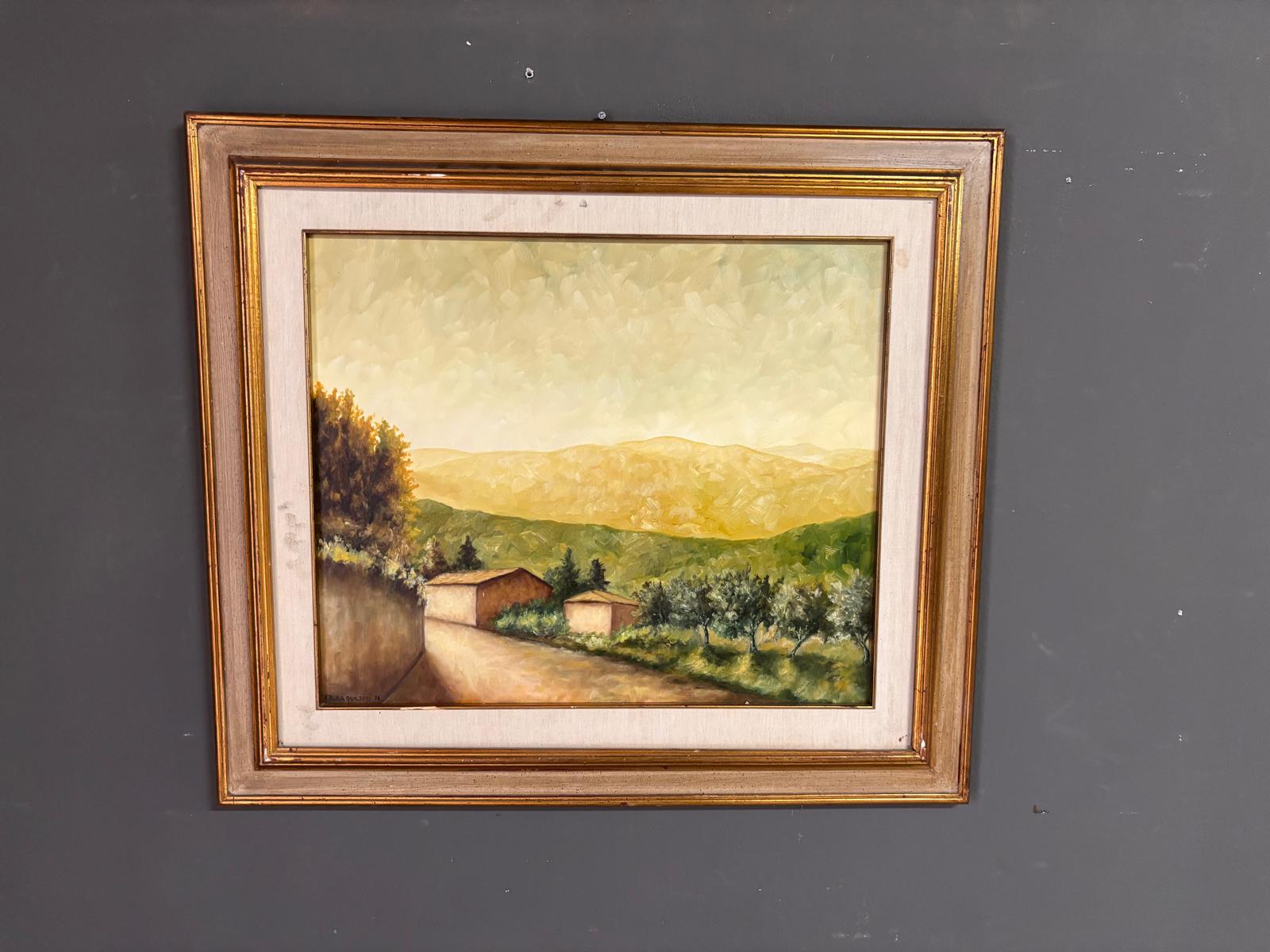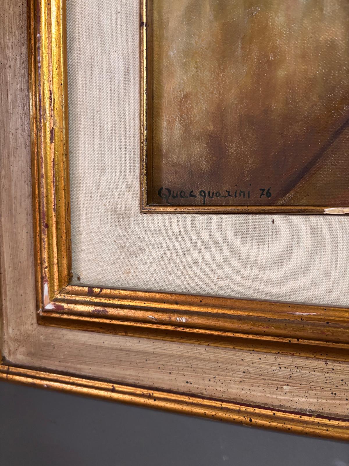Olio su tela raffigurante un paesaggio con viale e case in primo piano firmato Quacquarini 76.