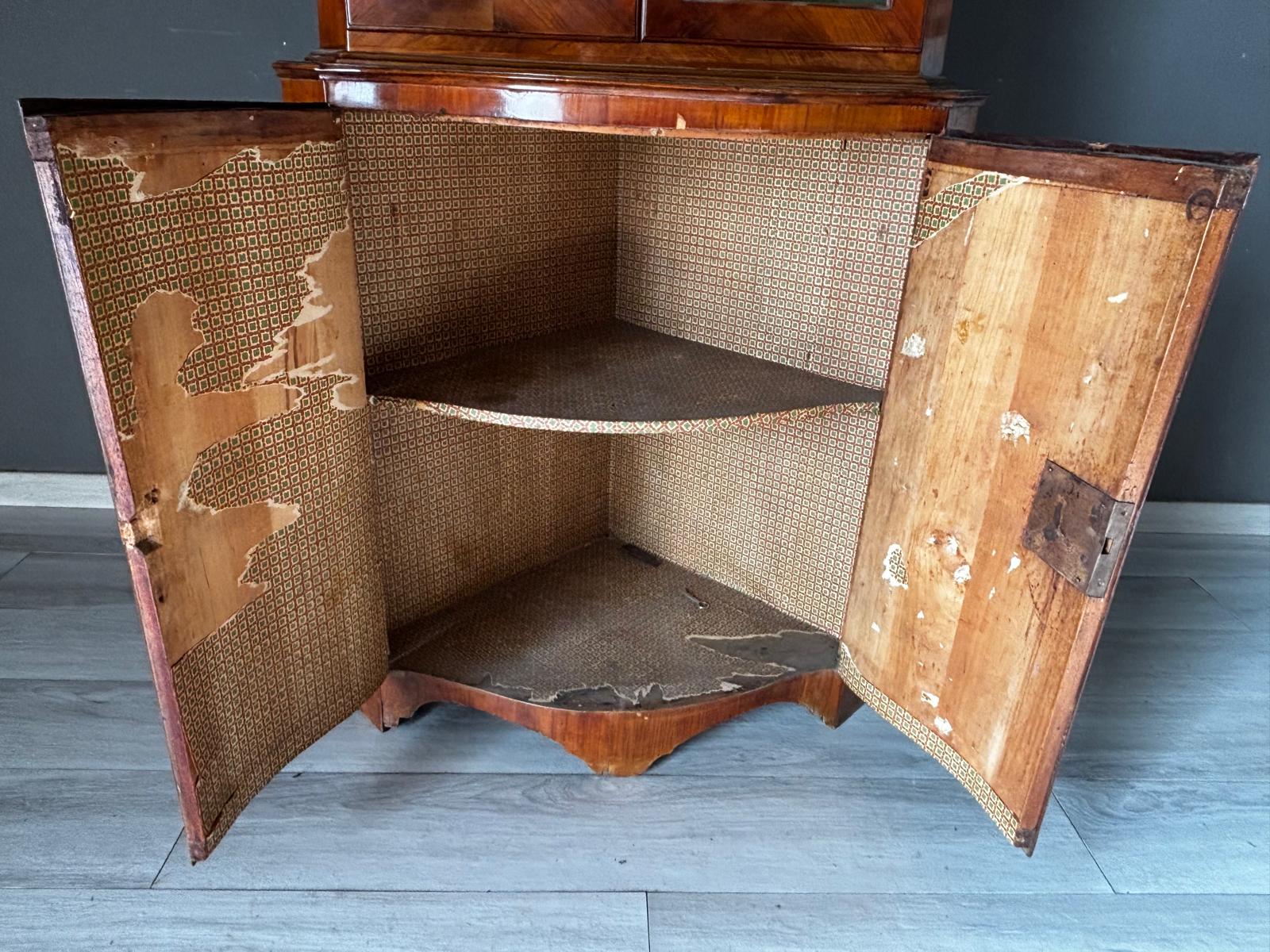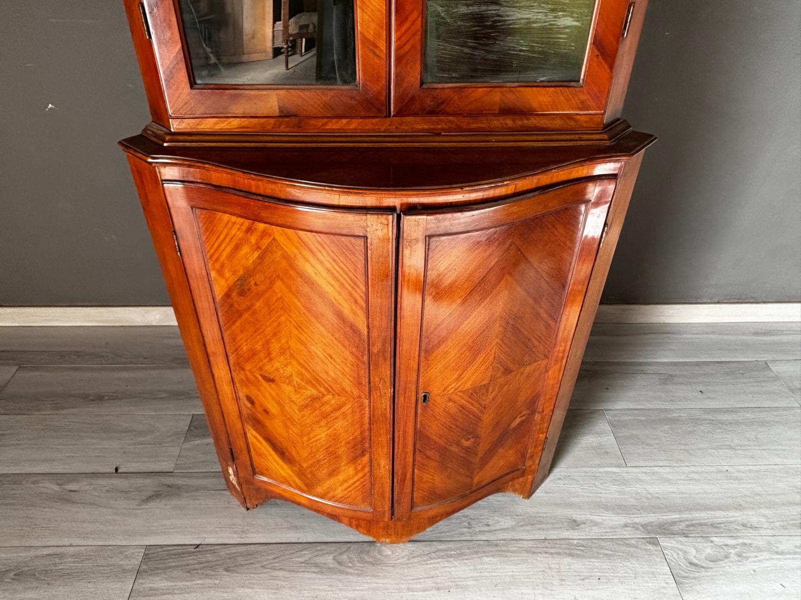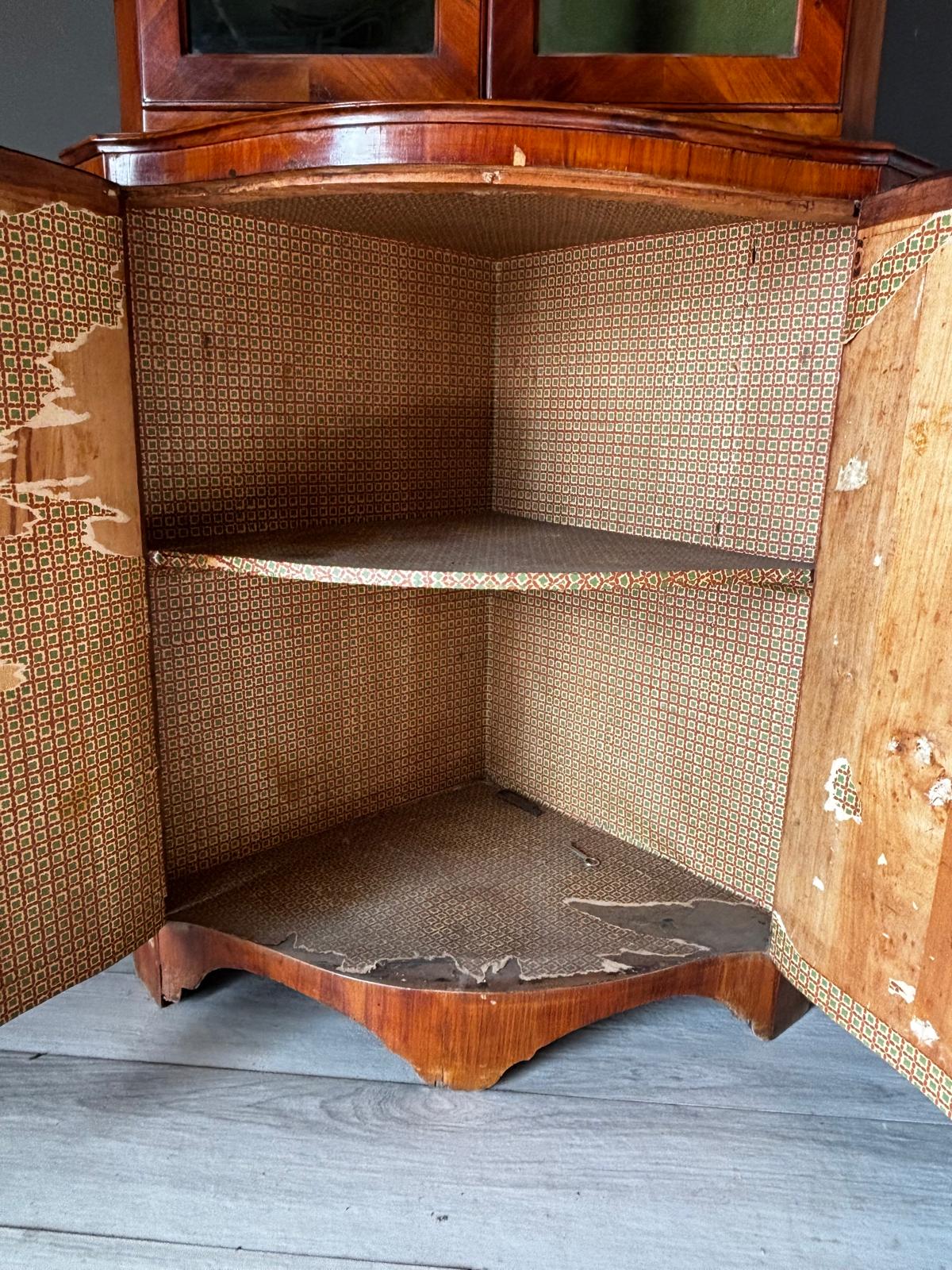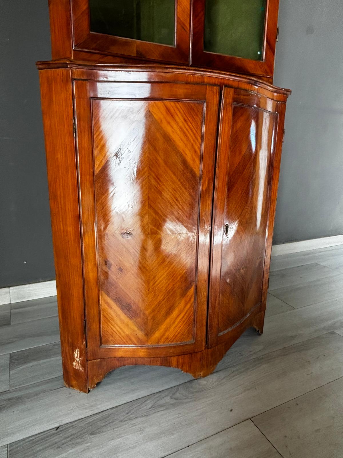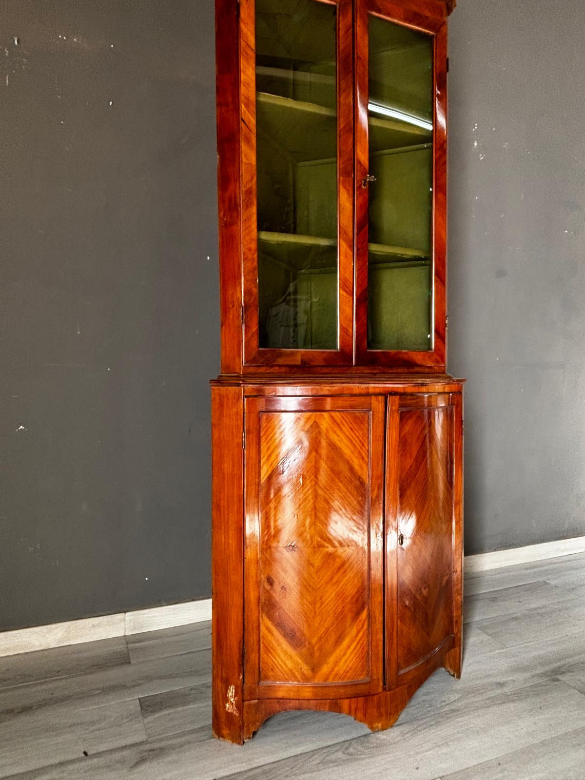 Antica angoliera doppio corpo di gusto settecentesco con la parte superiore a giorno tramite due ante con vetri e la parte inferiore chiusa. Rifinita esternamente con placca di ciliegio a spina pesce. In ottimo stato conservativo.