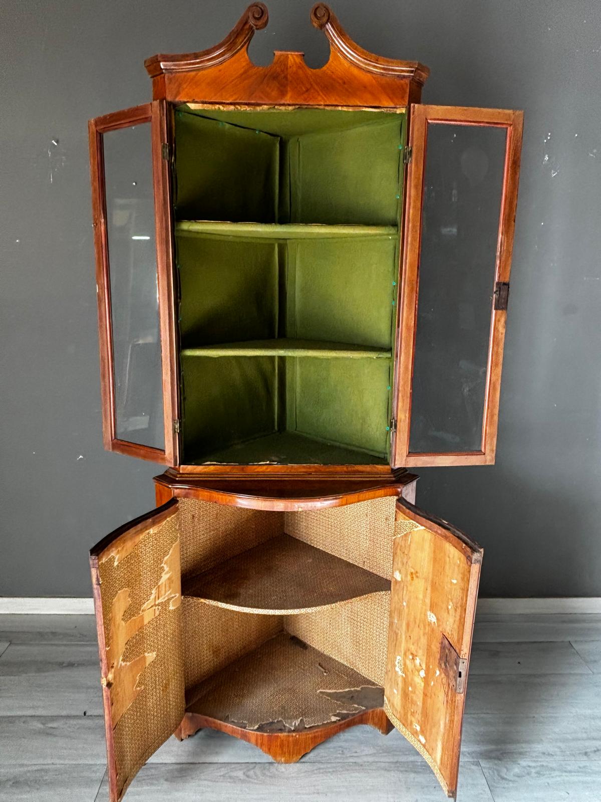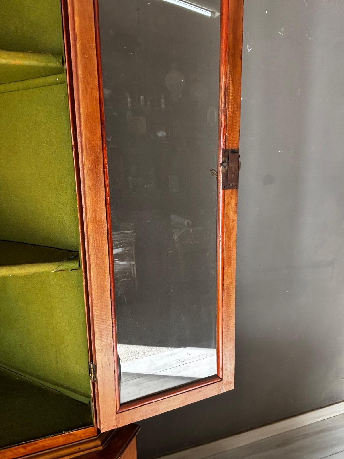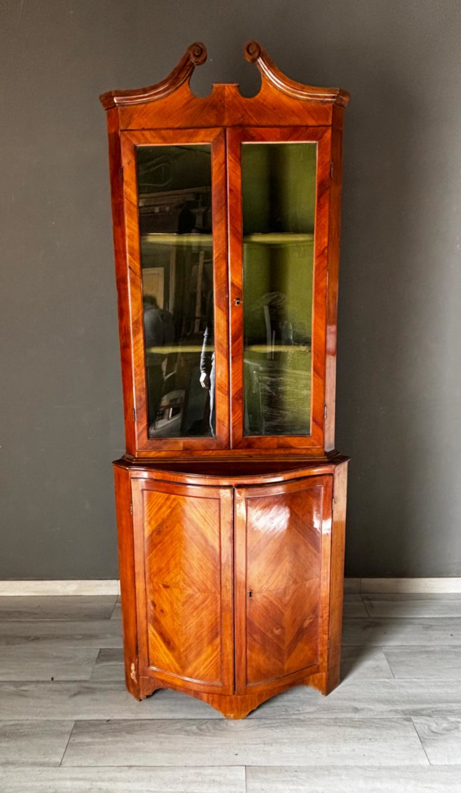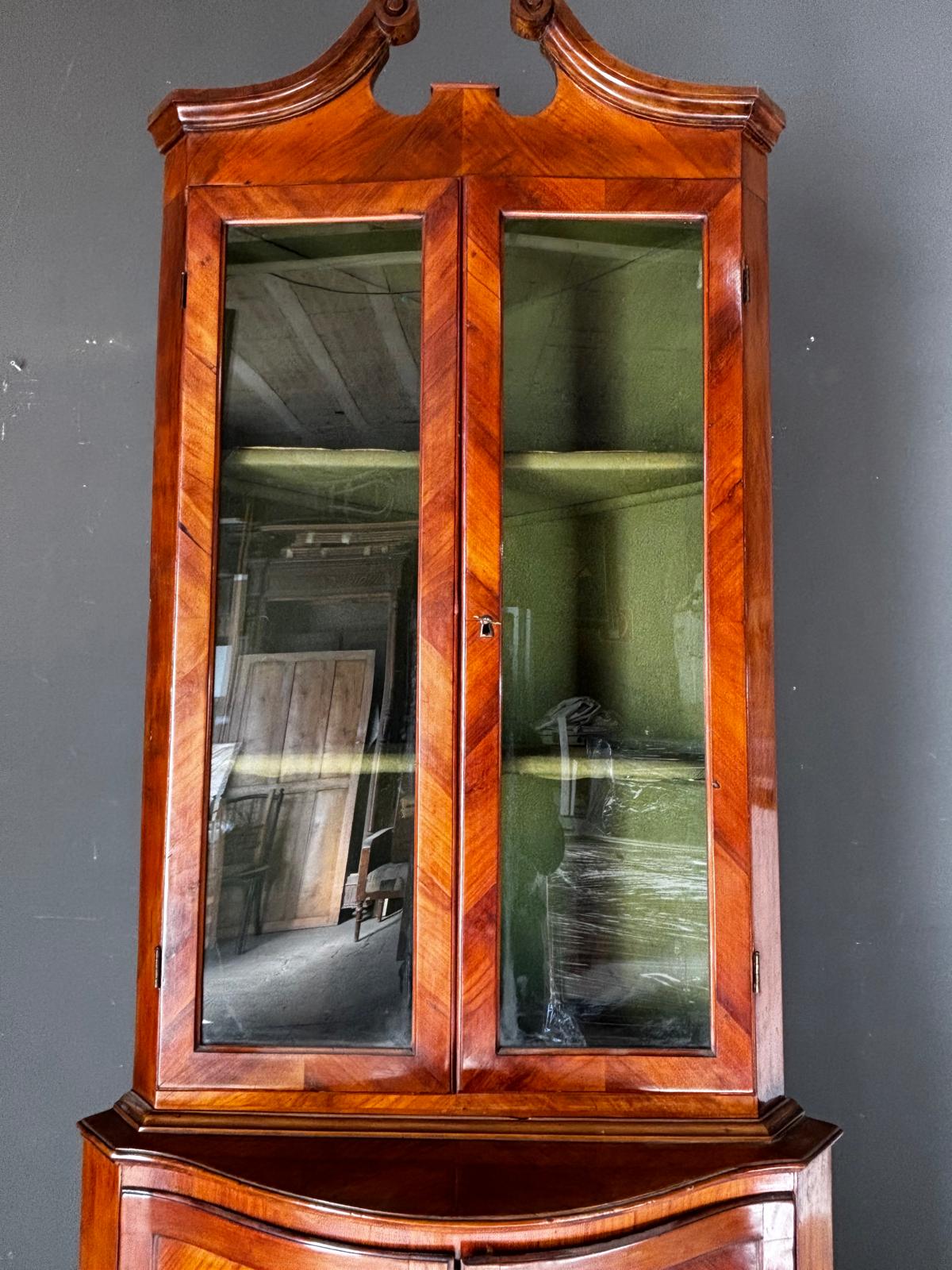 Antica angoliera doppio corpo di gusto settecentesco con la parte superiore a giorno tramite due ante con vetri e la parte inferiore chiusa. Rifinita esternamente con placca di ciliegio a spina pesce. In ottimo stato conservativo.
