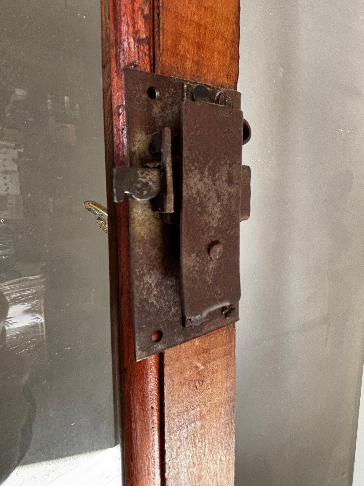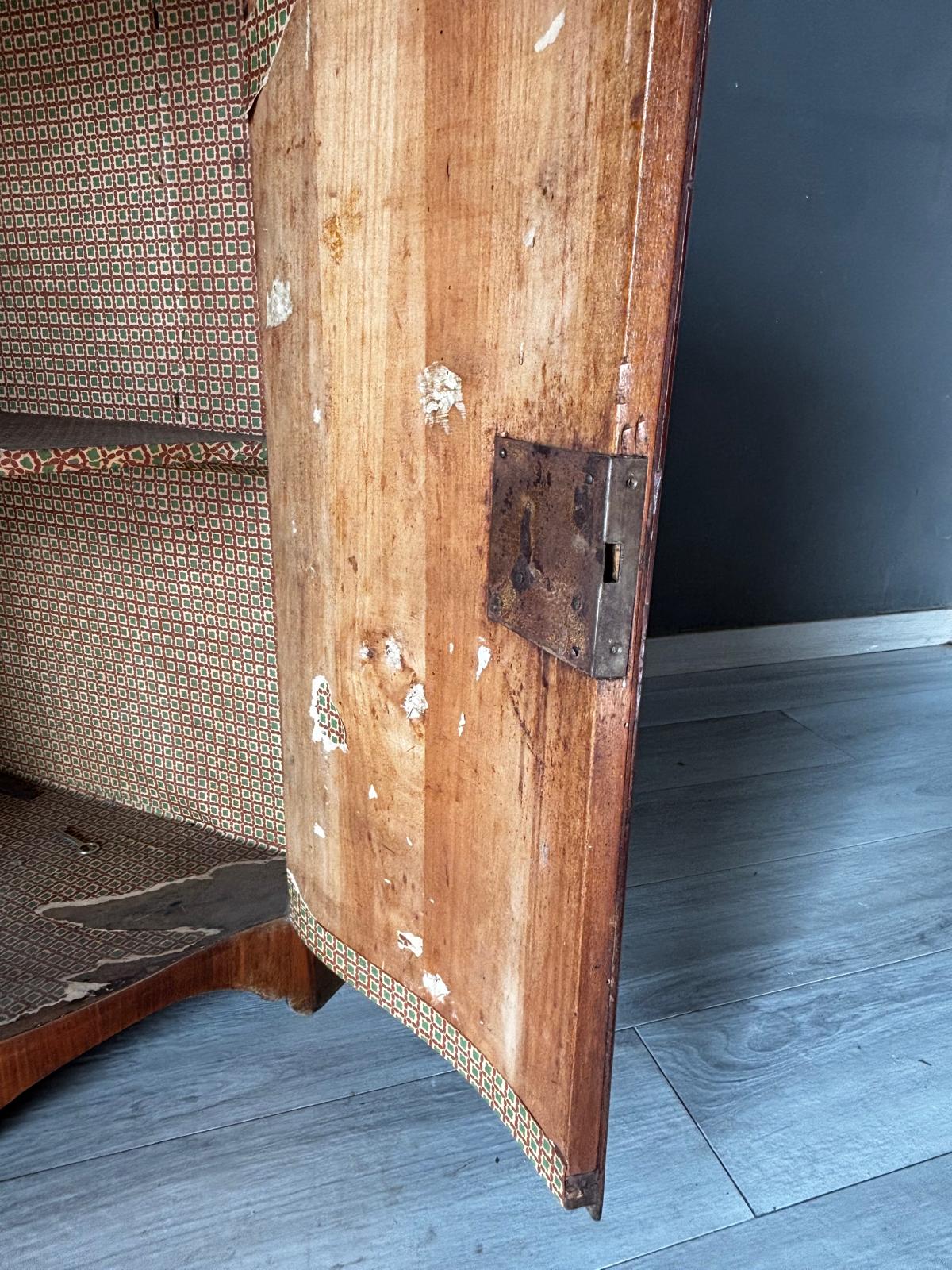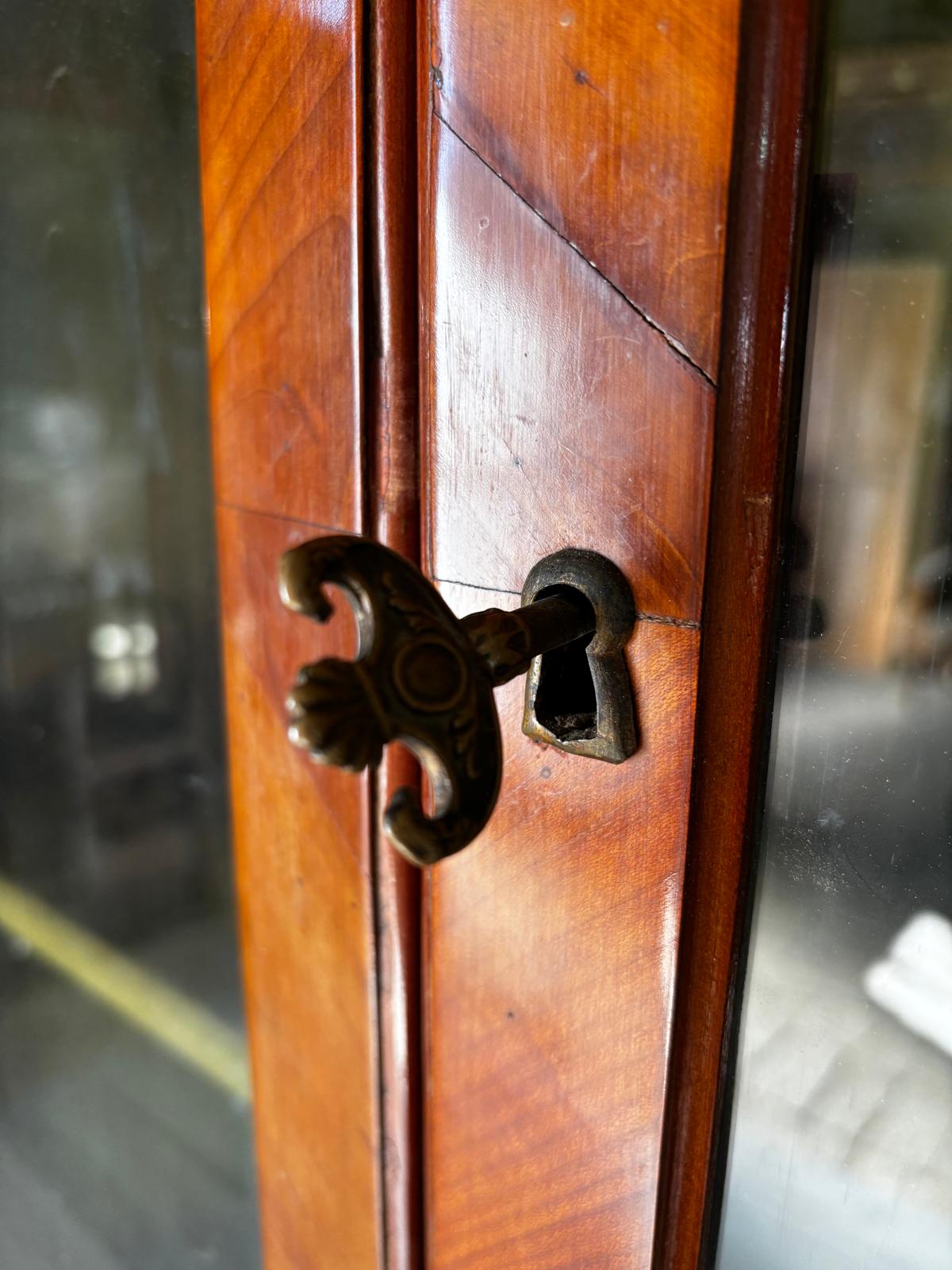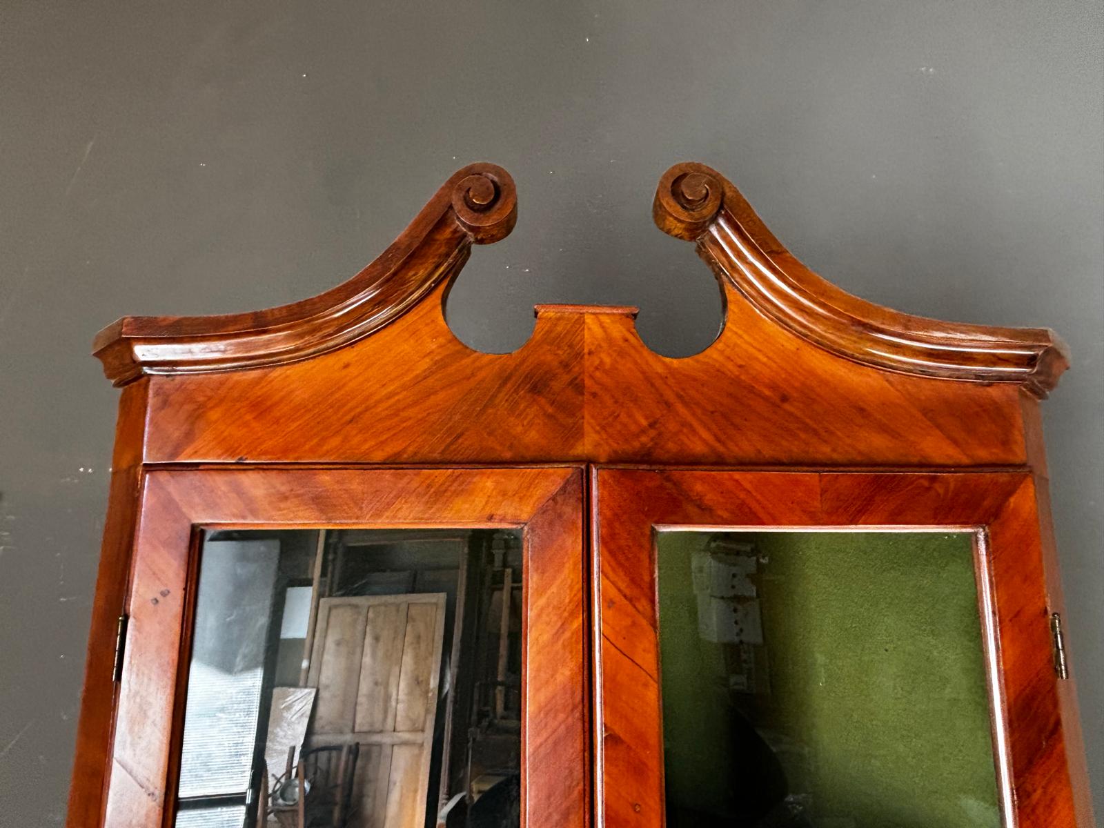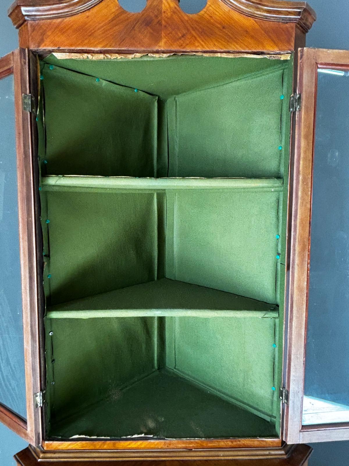 Antica angoliera doppio corpo di gusto settecentesco con la parte superiore a giorno tramite due ante con vetri e la parte inferiore chiusa. Rifinita esternamente con placca di ciliegio a spina pesce. In ottimo stato conservativo.