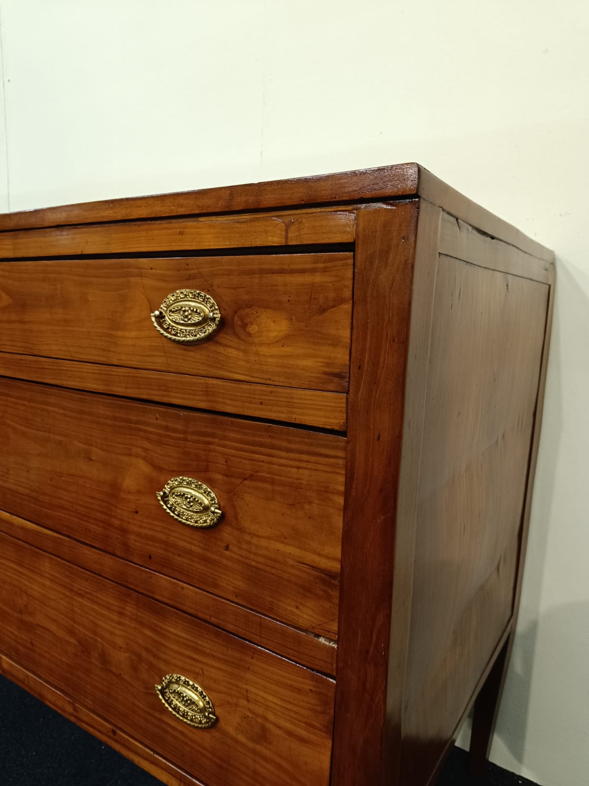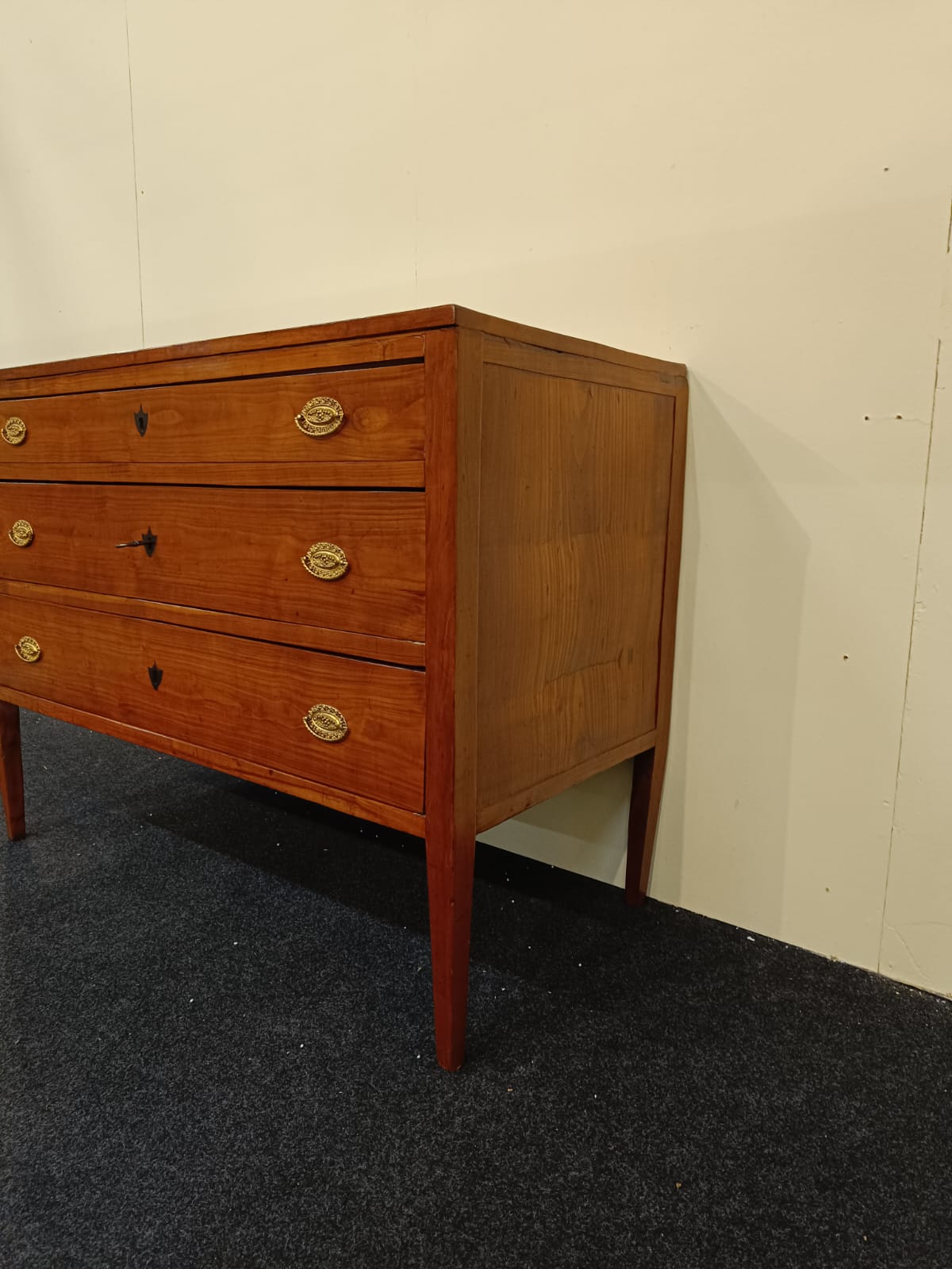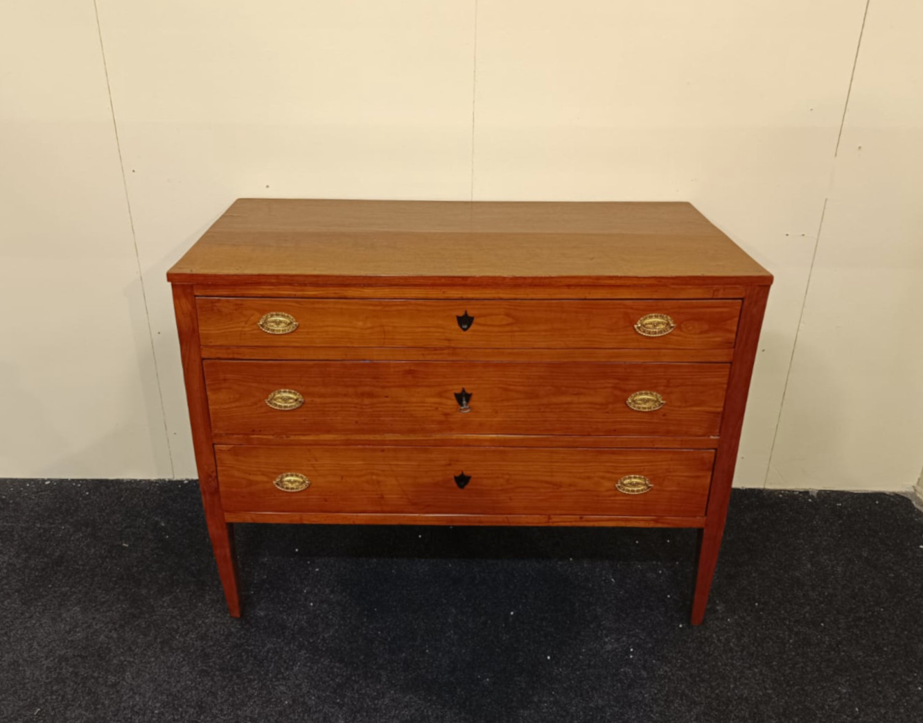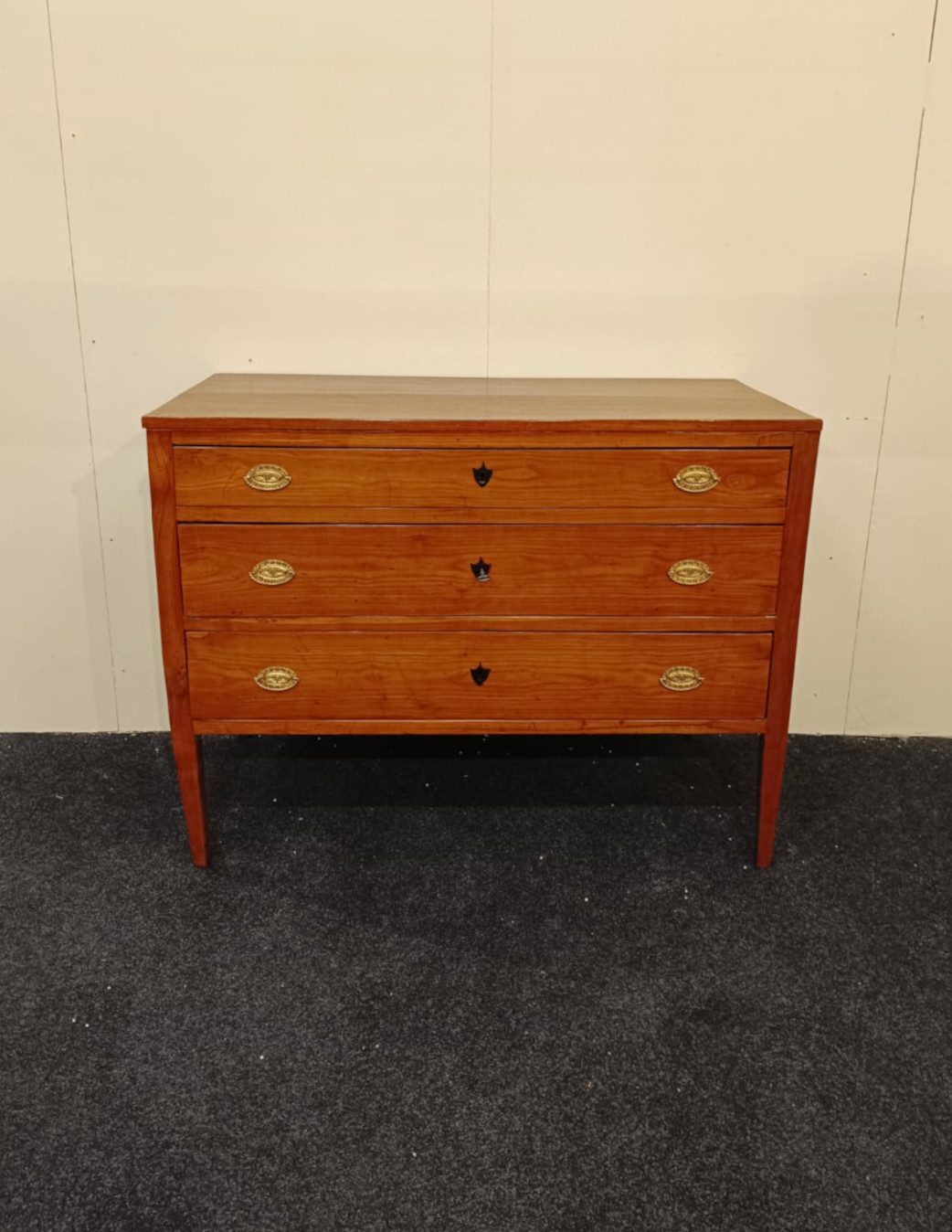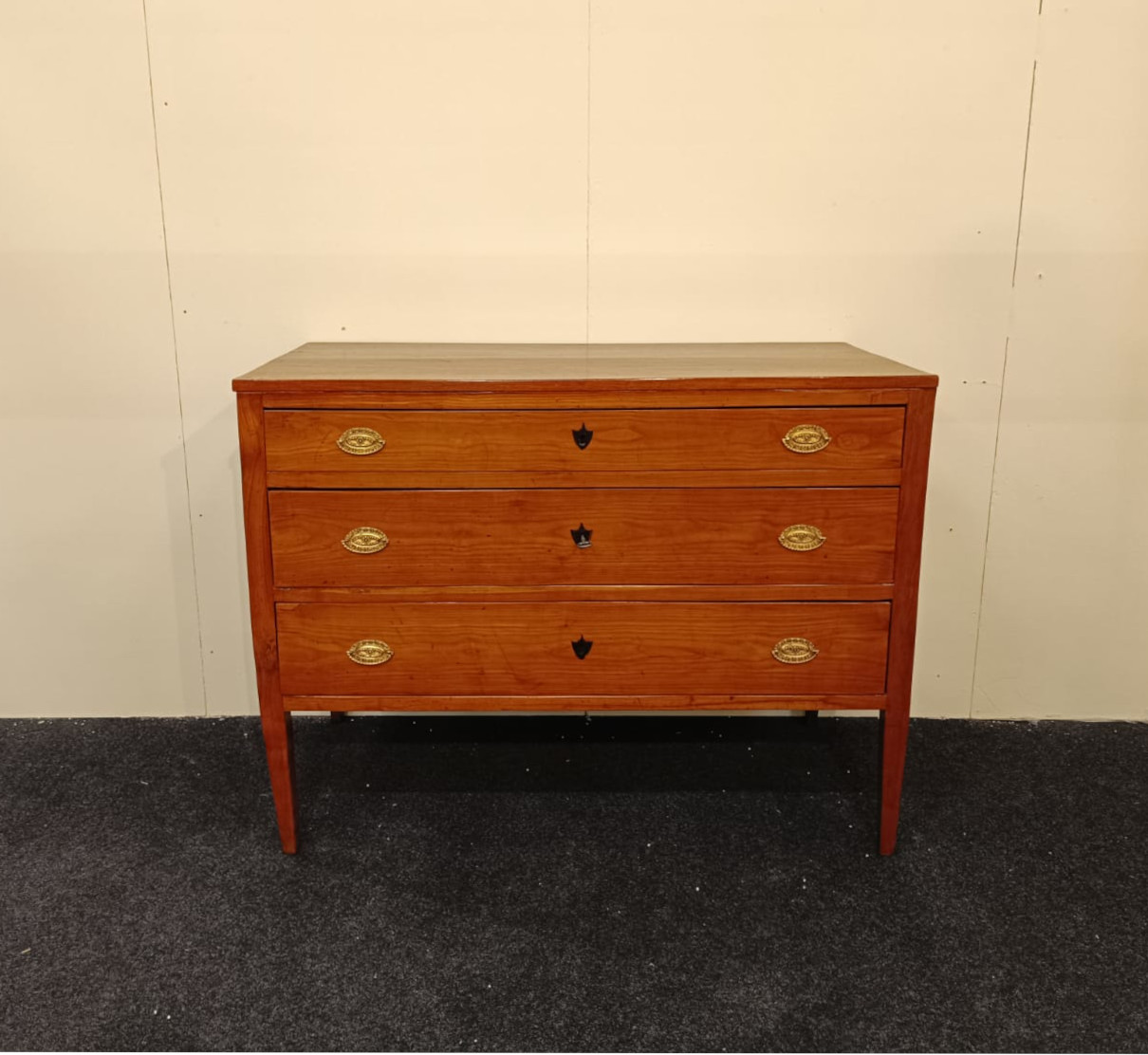 Antico comò a tre cassetti di epoca Luigi XVI già restaurato. Questo cassettone è stato realizzato con legno di ciliegio sull’esterno e pioppo all’interno. Scudetti tipici del periodo in ebano, serrature e ferramenta coevi con il periodo.