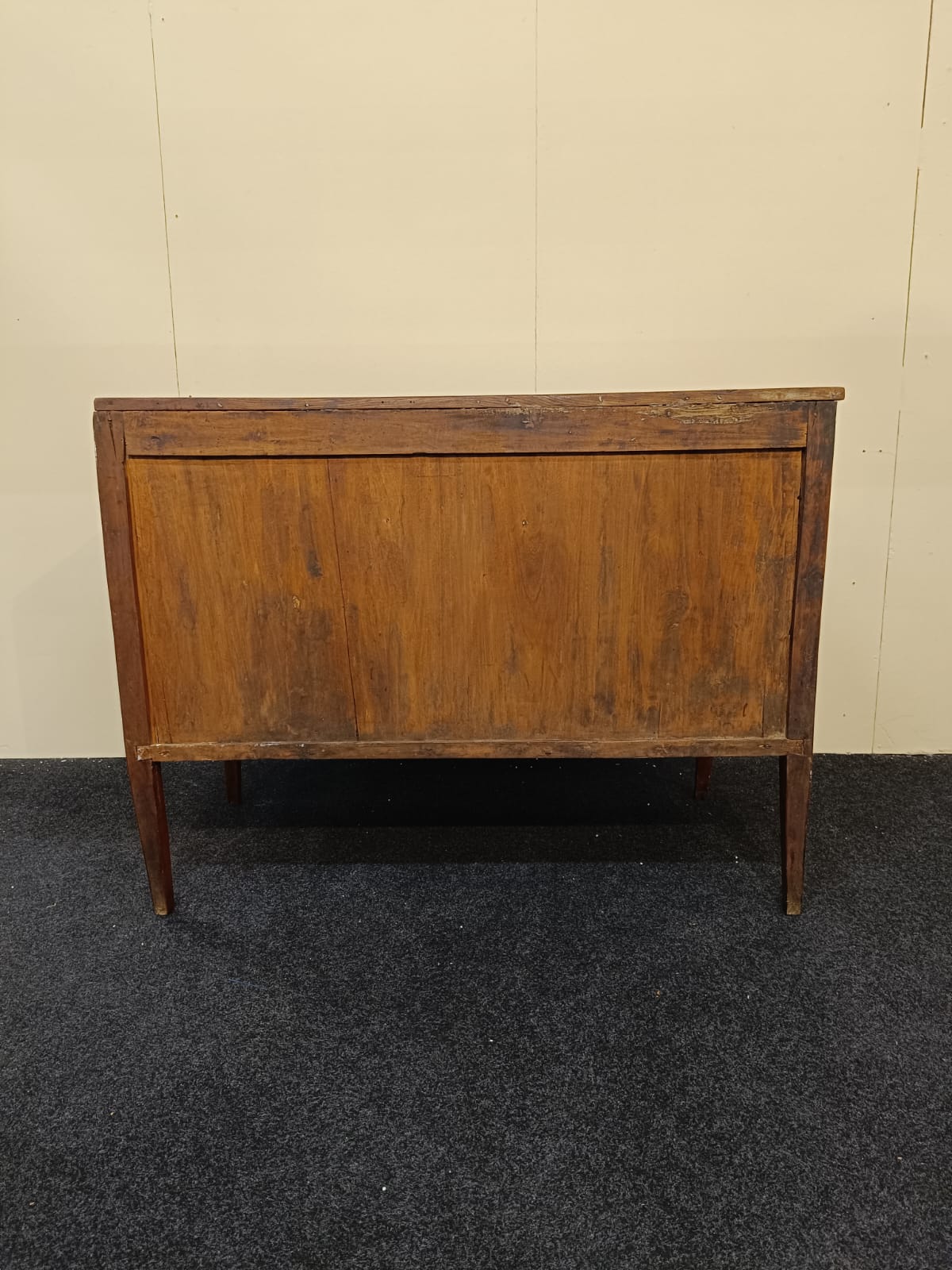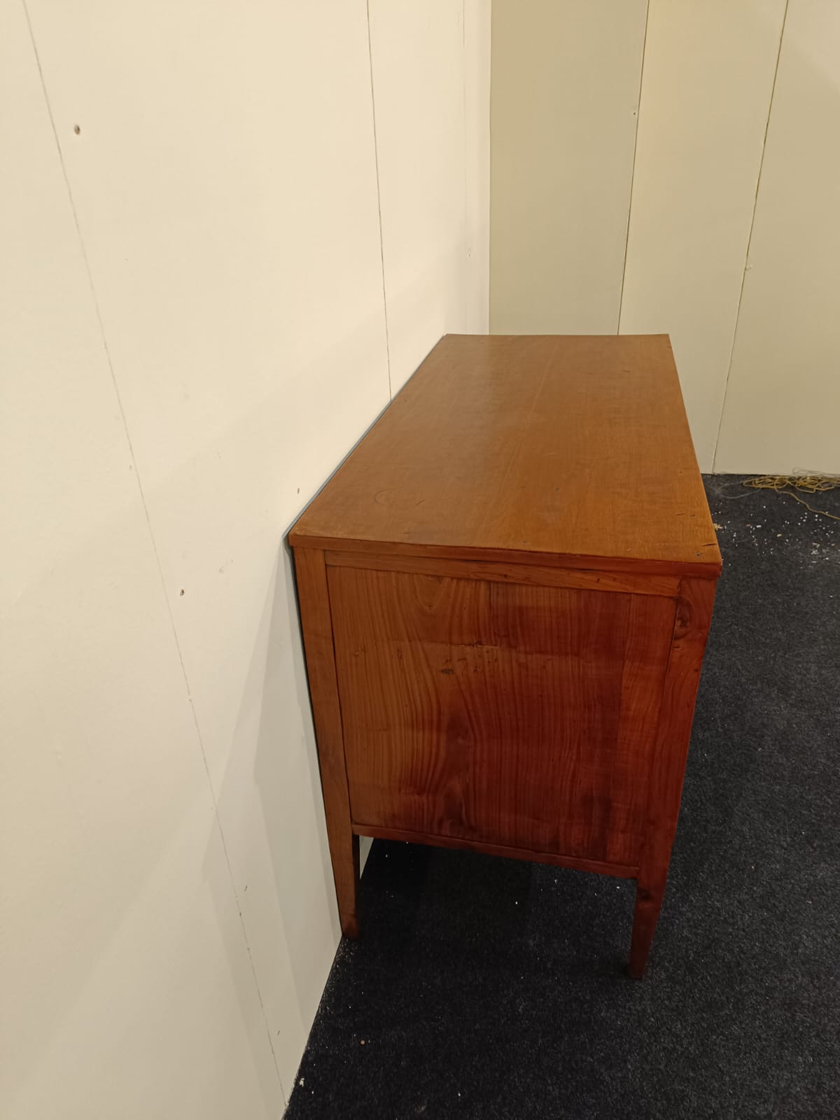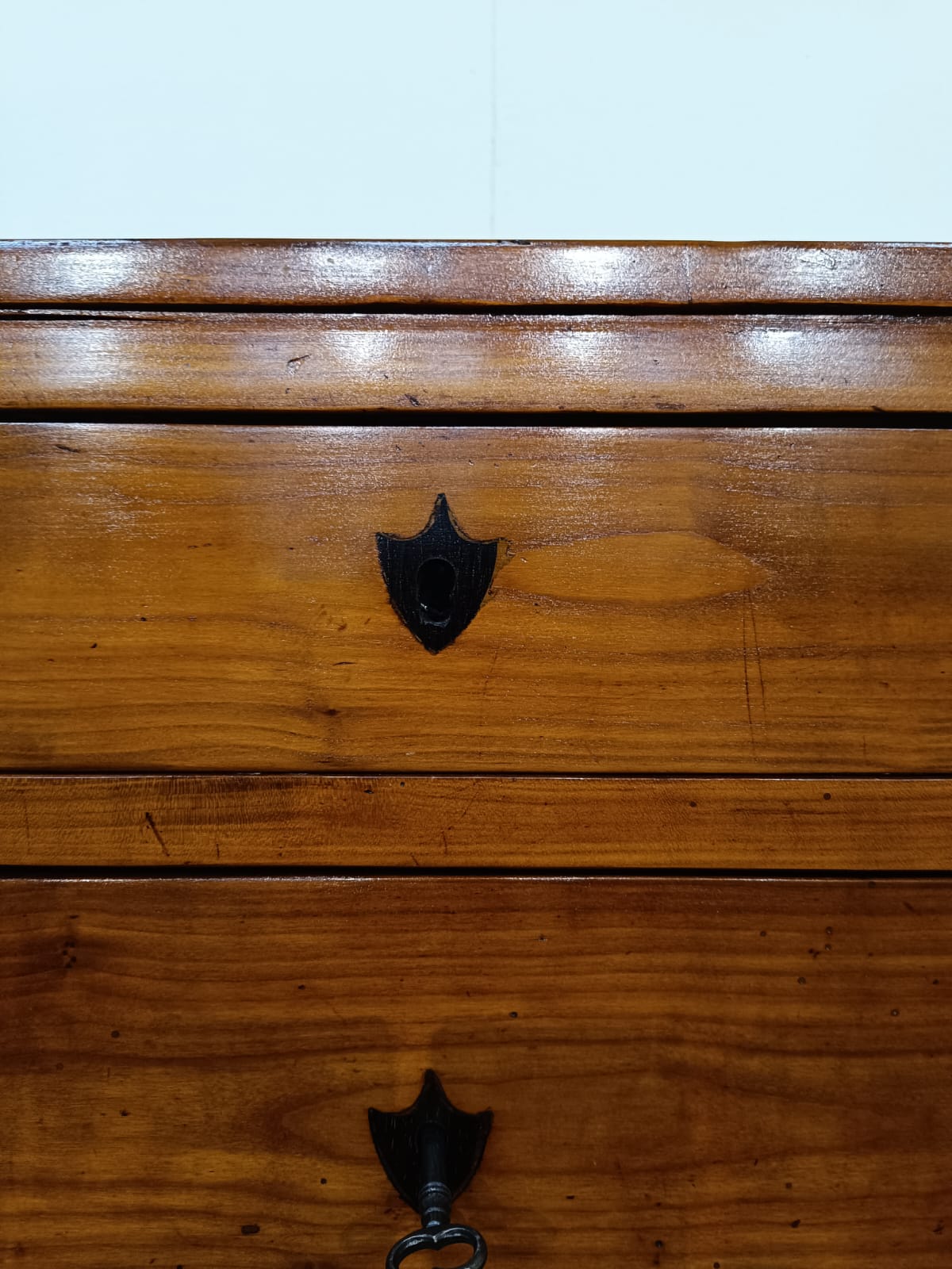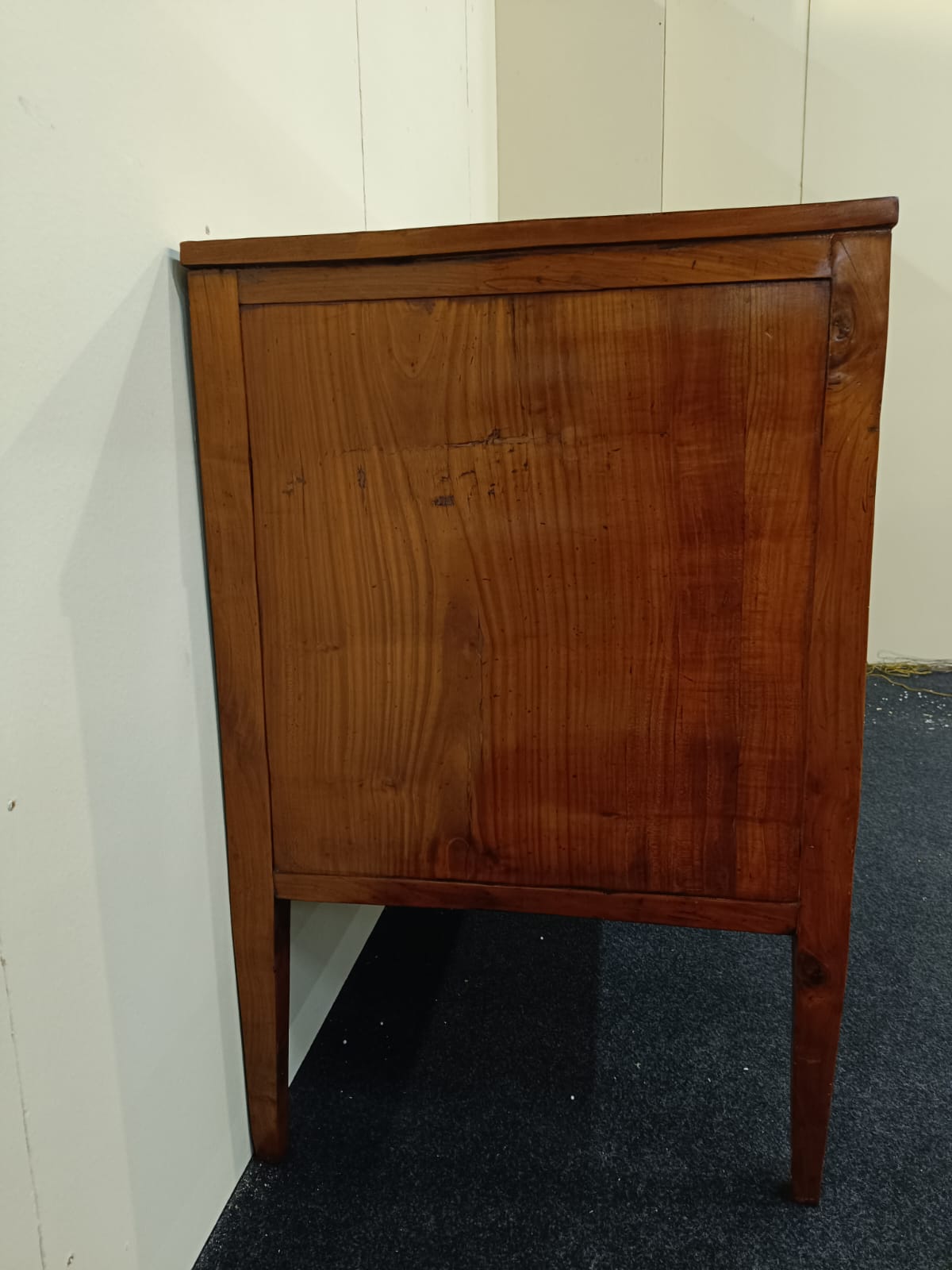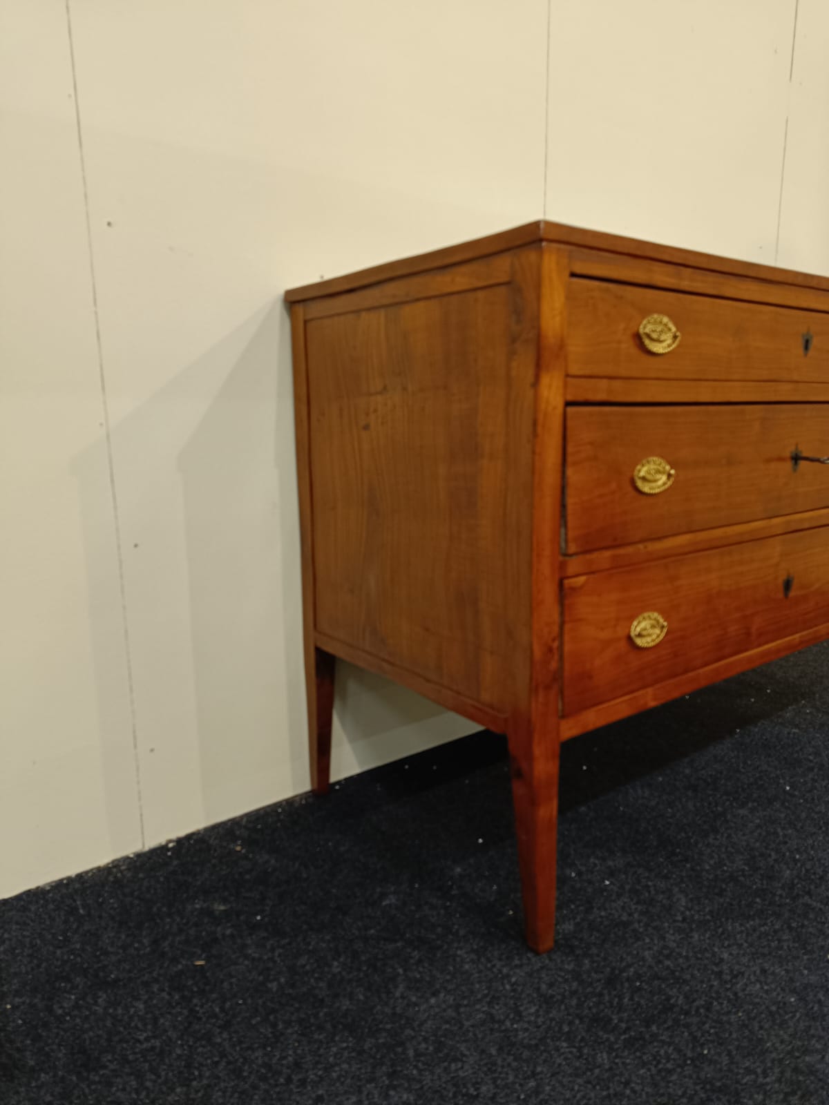 Antico comò a tre cassetti di epoca Luigi XVI già restaurato. Questo cassettone è stato realizzato con legno di ciliegio sull’esterno e pioppo all’interno. Scudetti tipici del periodo in ebano, serrature e ferramenta coevi con il periodo.