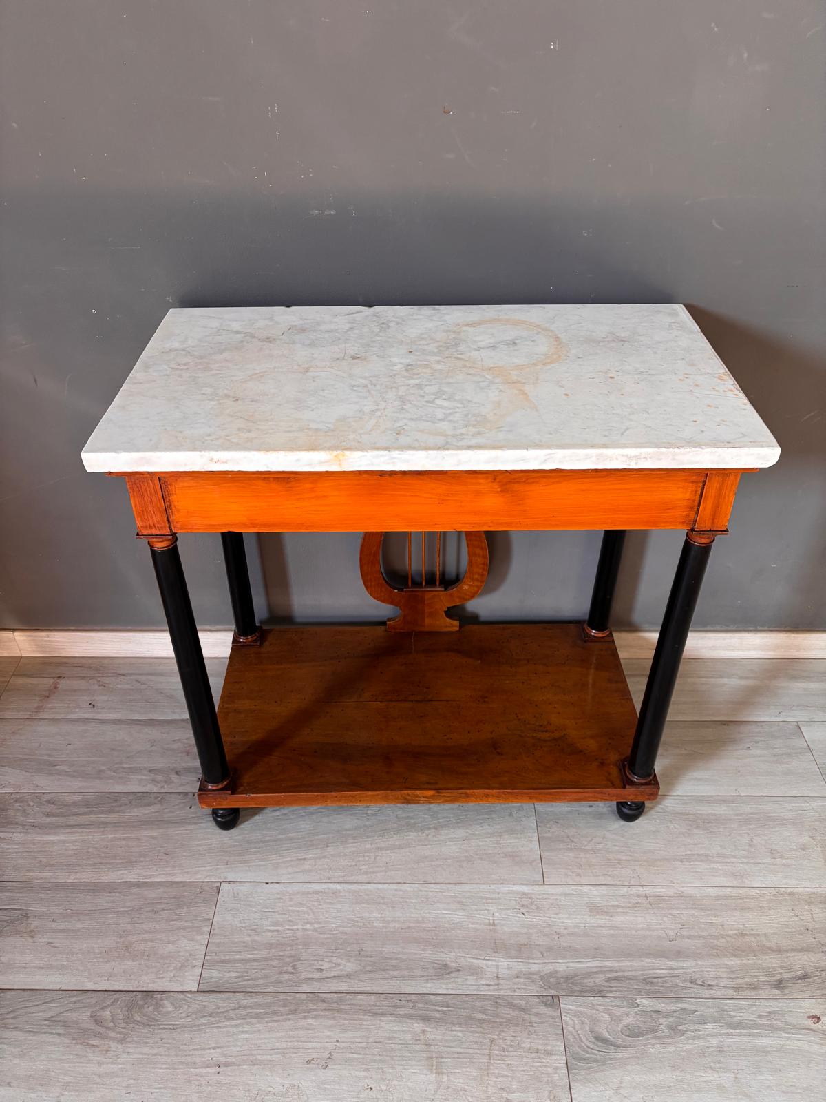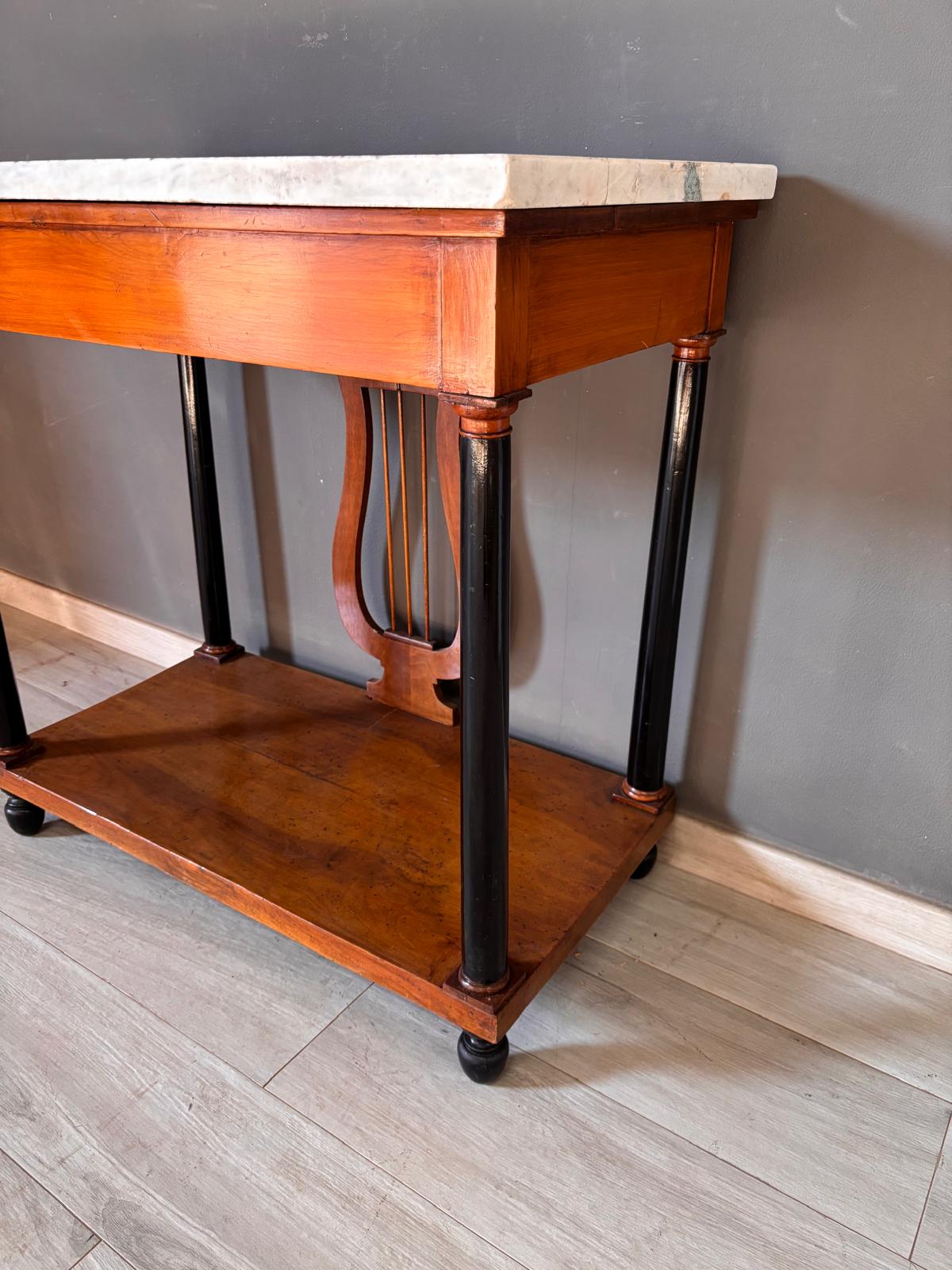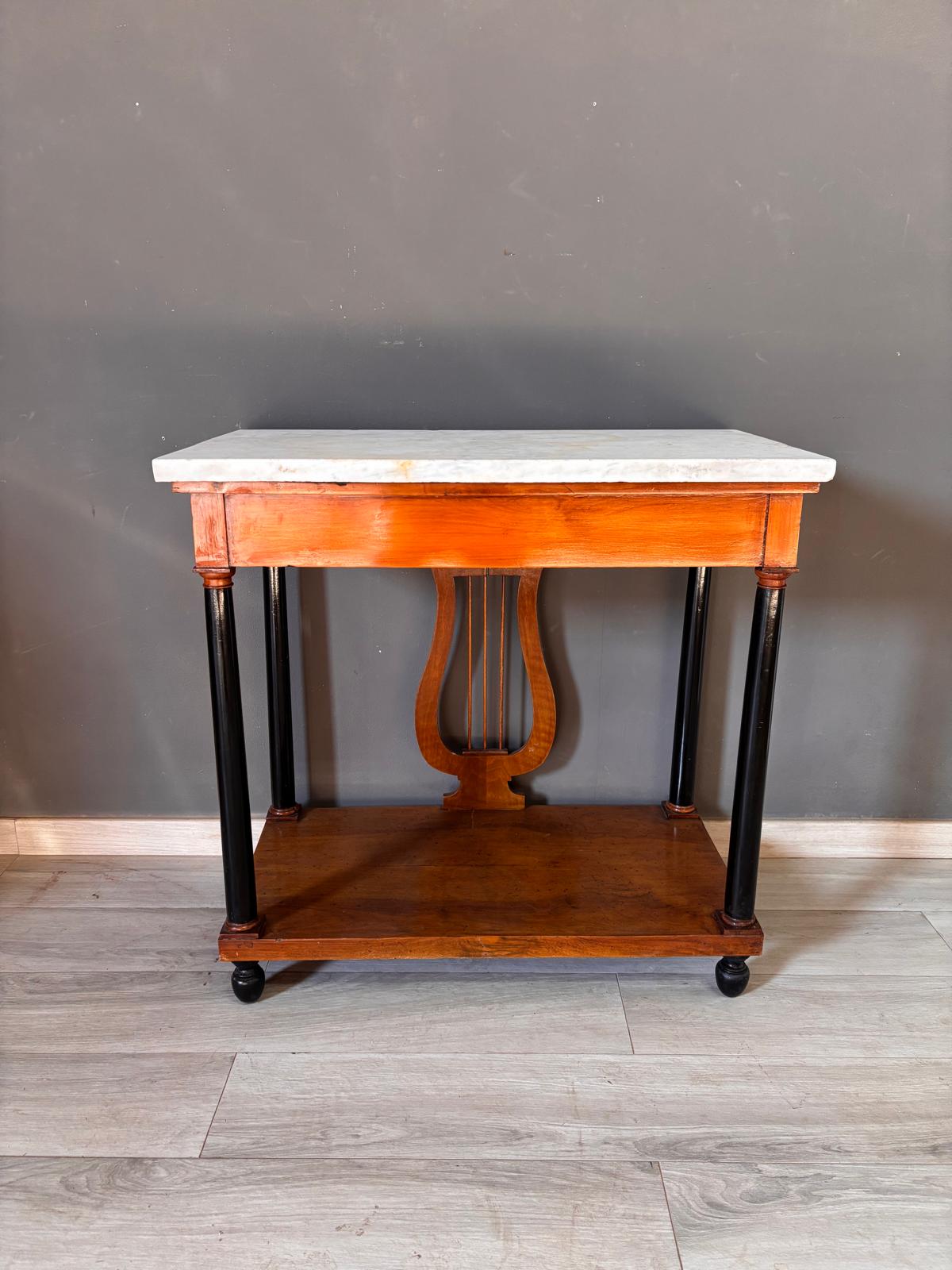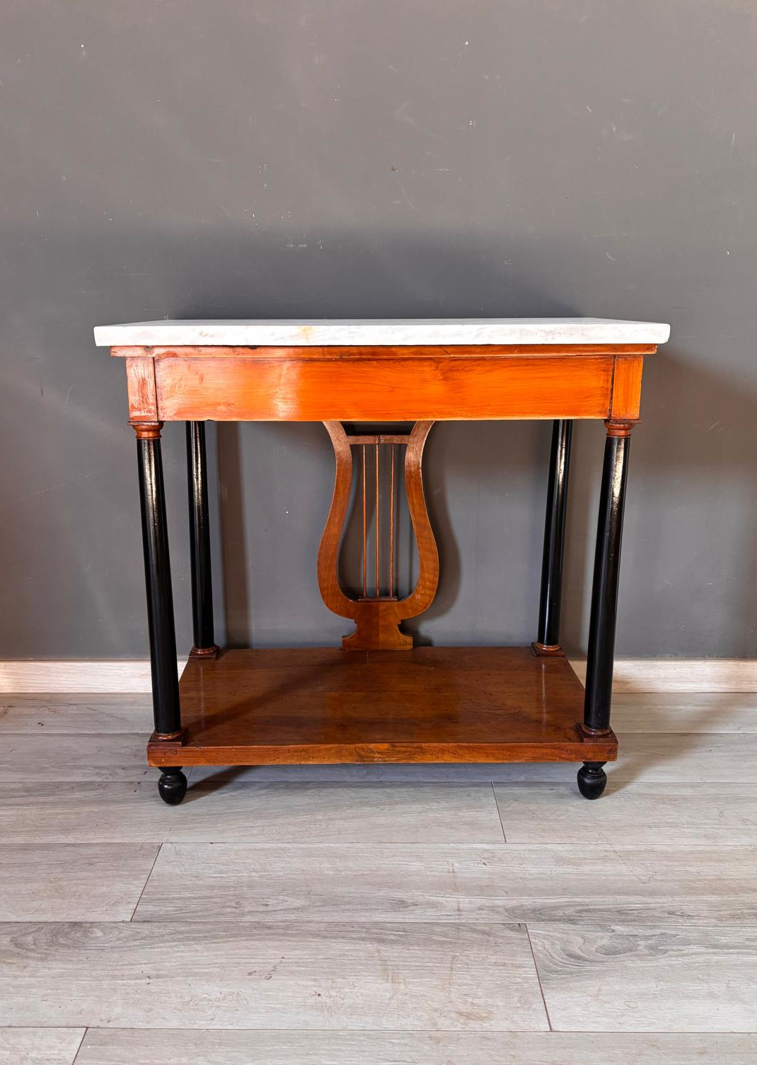 Antica consolle di epoca Impero da ingresso di modeste dimensioni. Realizzata con legno di acero e ciliegio e sorretta da quattro colonne ebanizzate. Il piano in legno è in acero e superiormente troviamo un marmo bianco Carrara.
