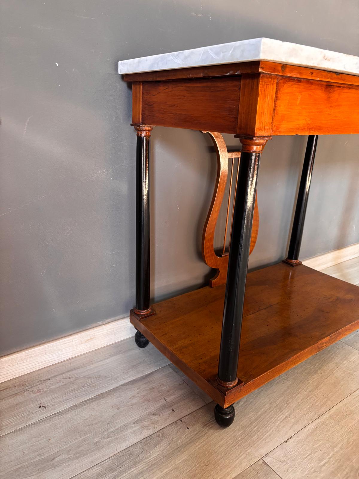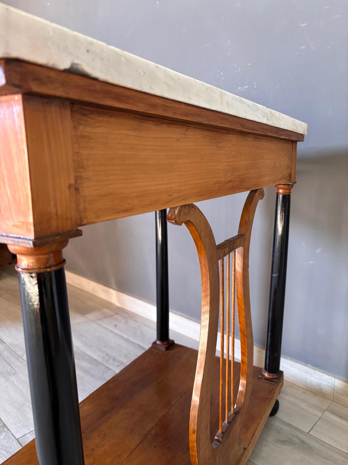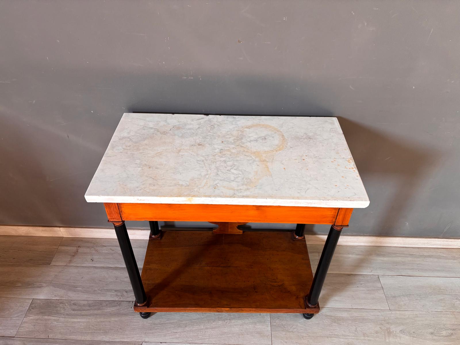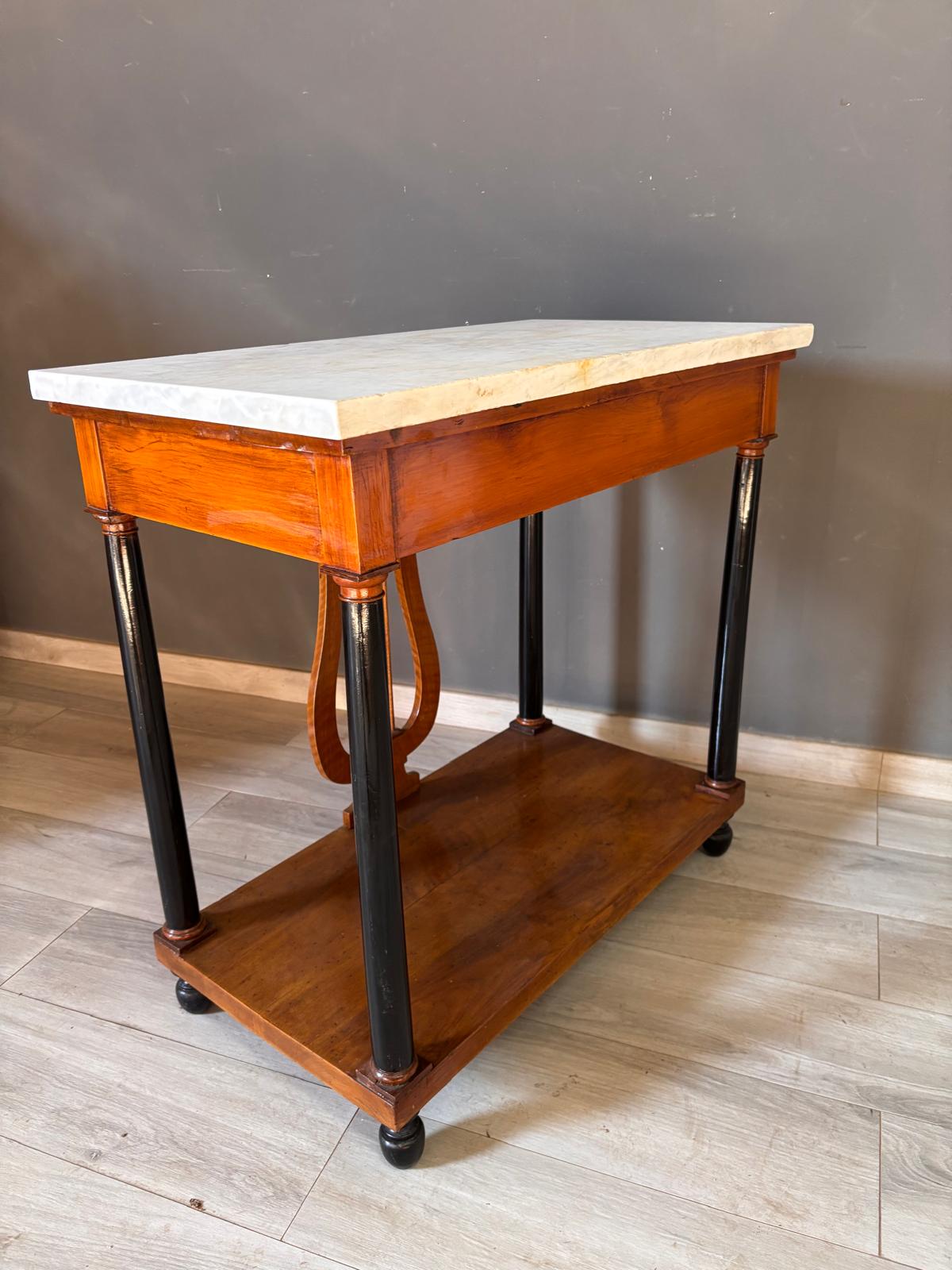 Antica consolle di epoca Impero da ingresso di modeste dimensioni. Realizzata con legno di acero e ciliegio e sorretta da quattro colonne ebanizzate. Il piano in legno è in acero e superiormente troviamo un marmo bianco Carrara.
