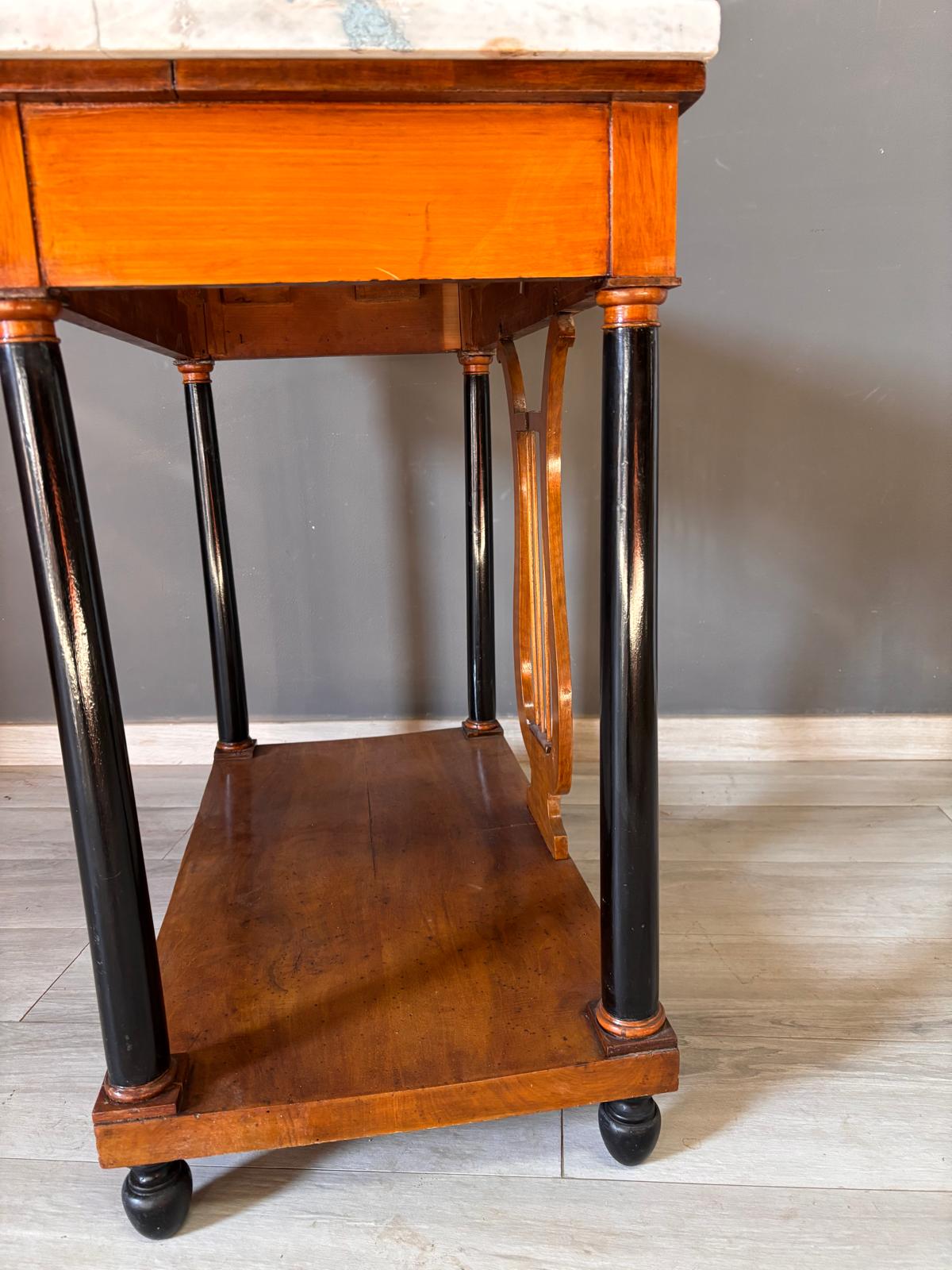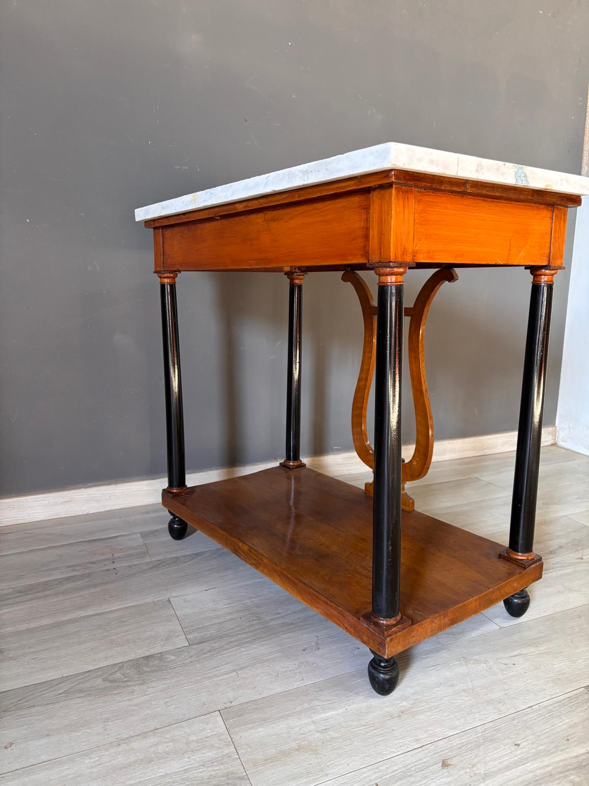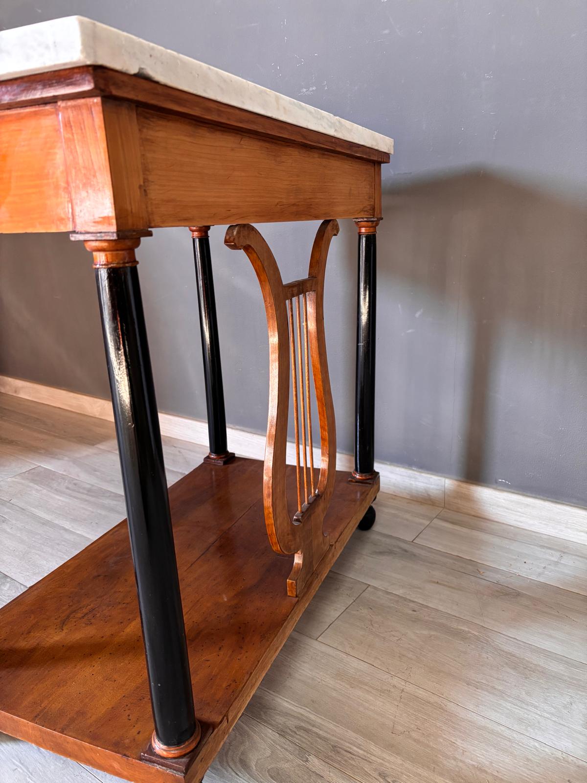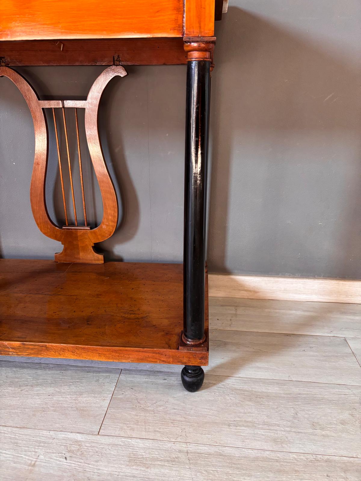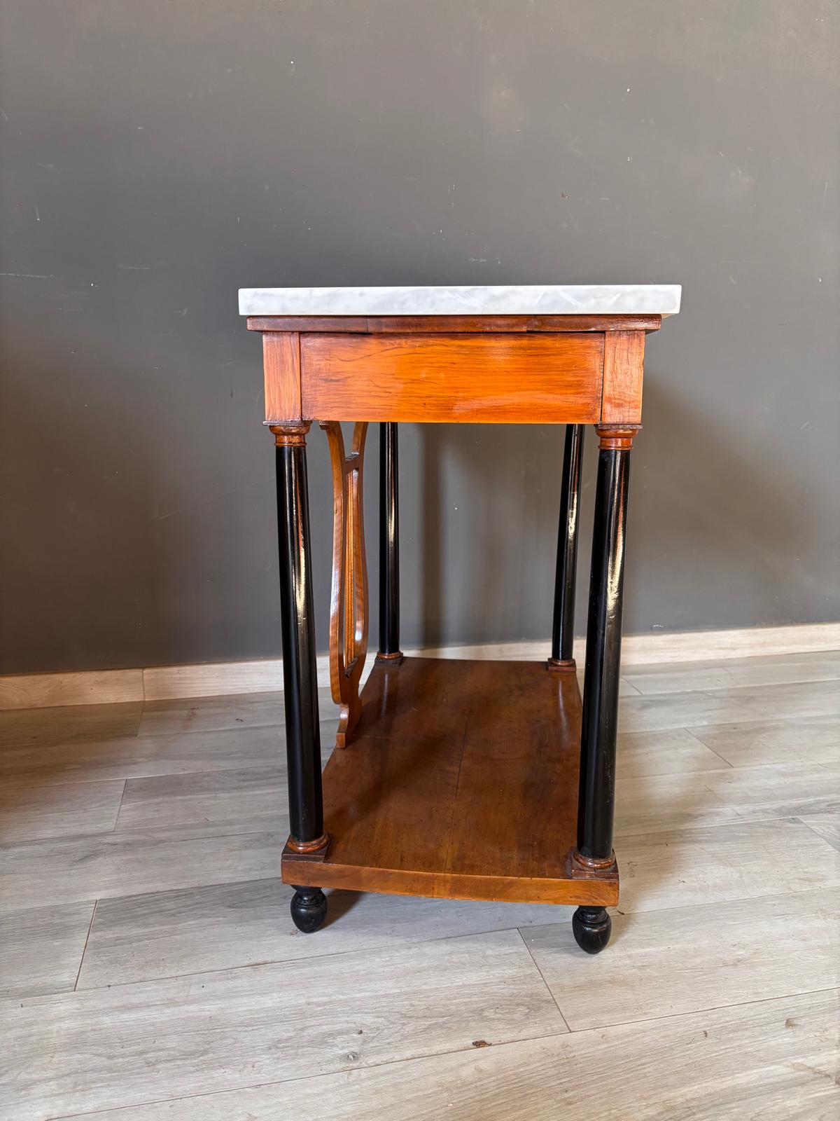 Antica consolle di epoca Impero da ingresso di modeste dimensioni. Realizzata con legno di acero e ciliegio e sorretta da quattro colonne ebanizzate. Il piano in legno è in acero e superiormente troviamo un marmo bianco Carrara.