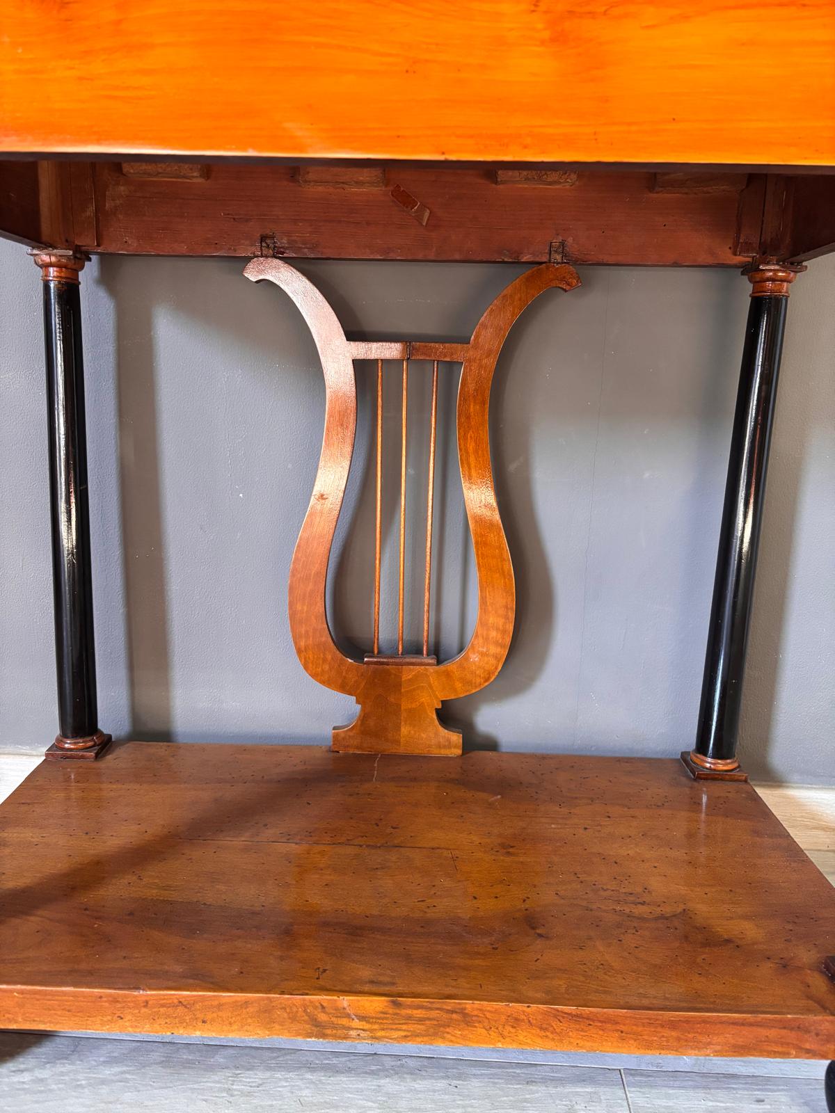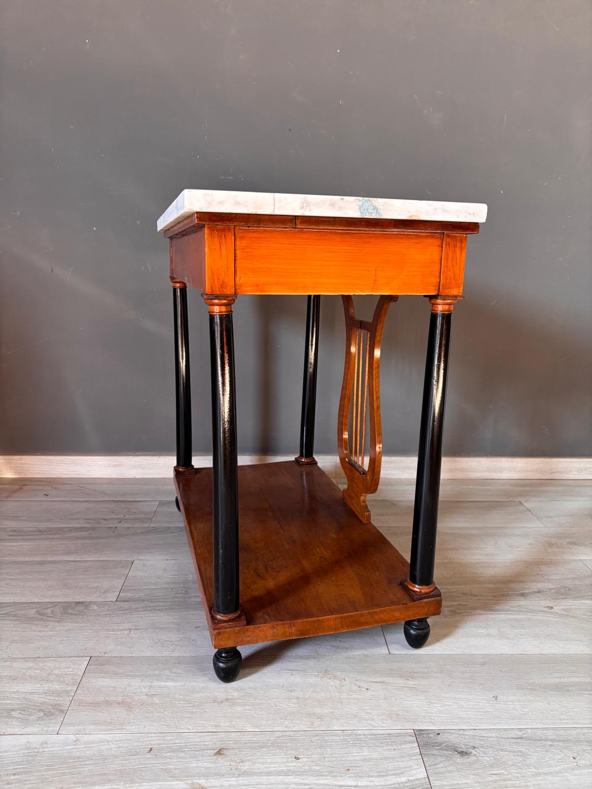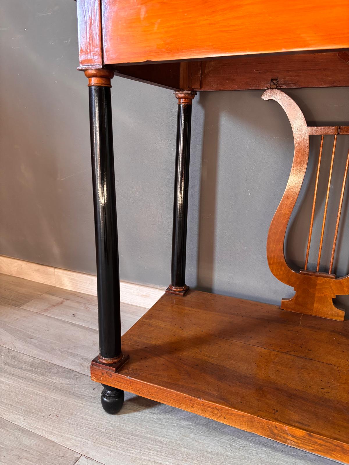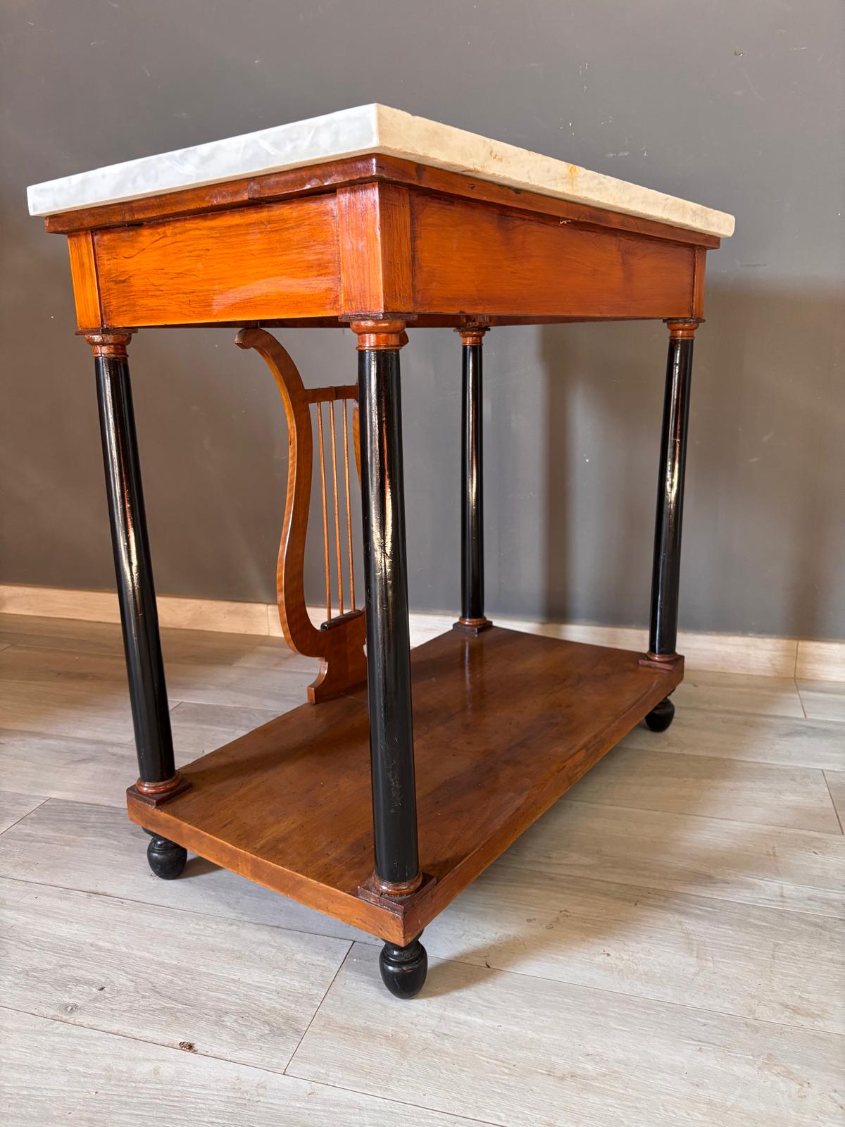 Antica consolle di epoca Impero da ingresso di modeste dimensioni. Realizzata con legno di acero e ciliegio e sorretta da quattro colonne ebanizzate. Il piano in legno è in acero e superiormente troviamo un marmo bianco Carrara.