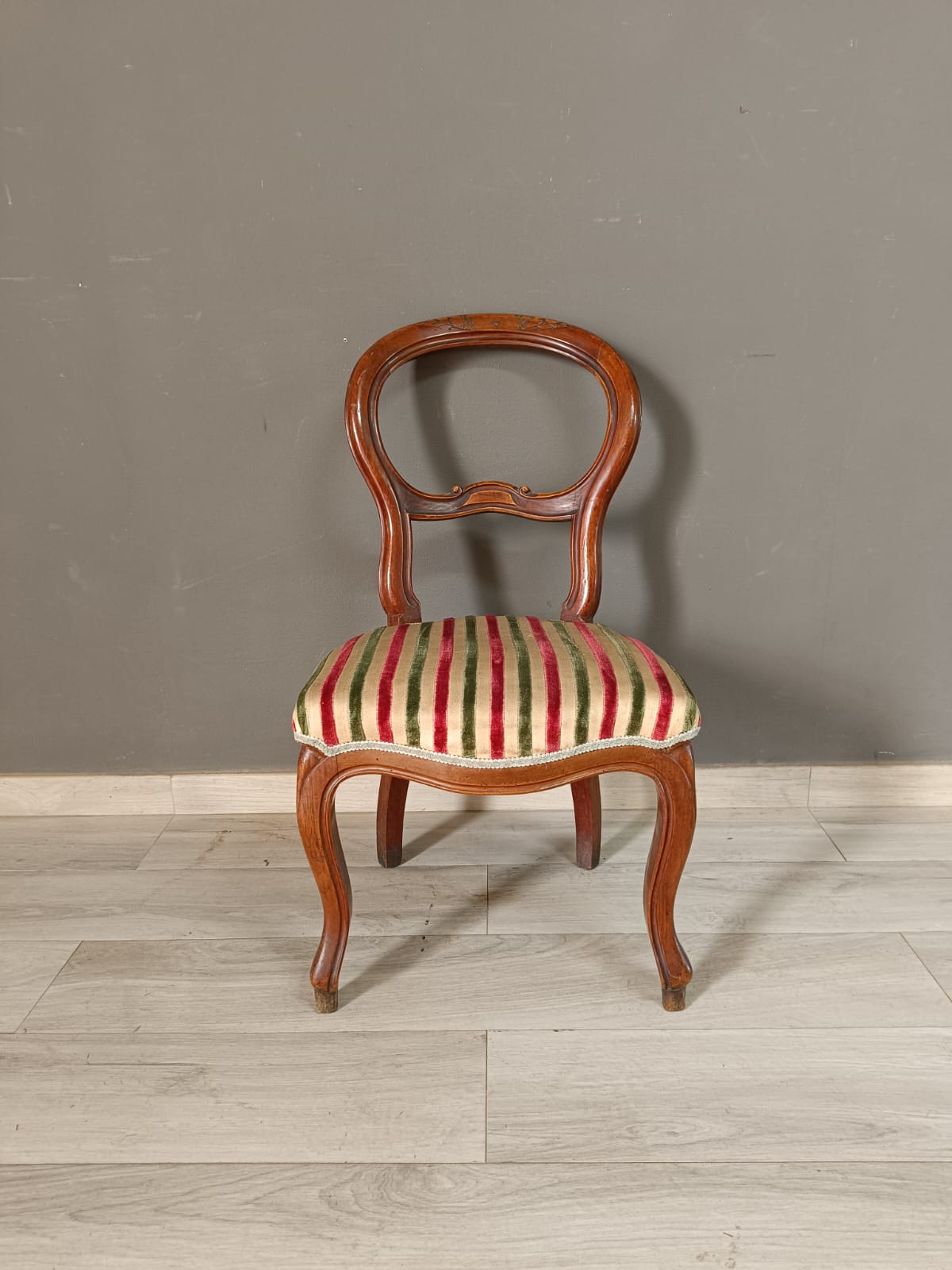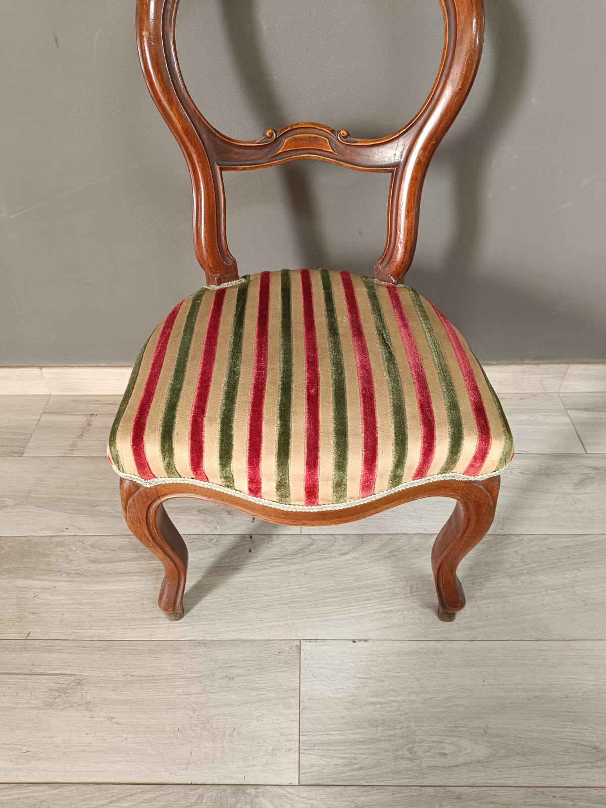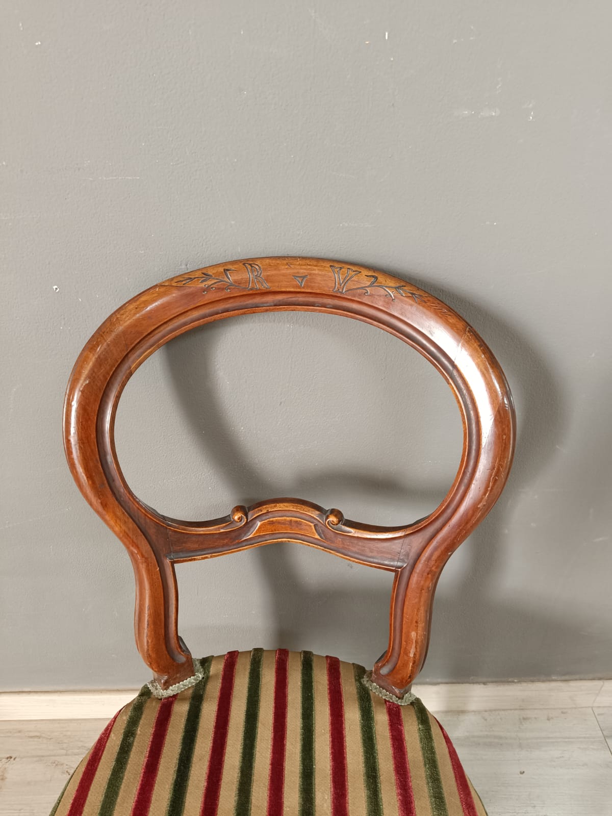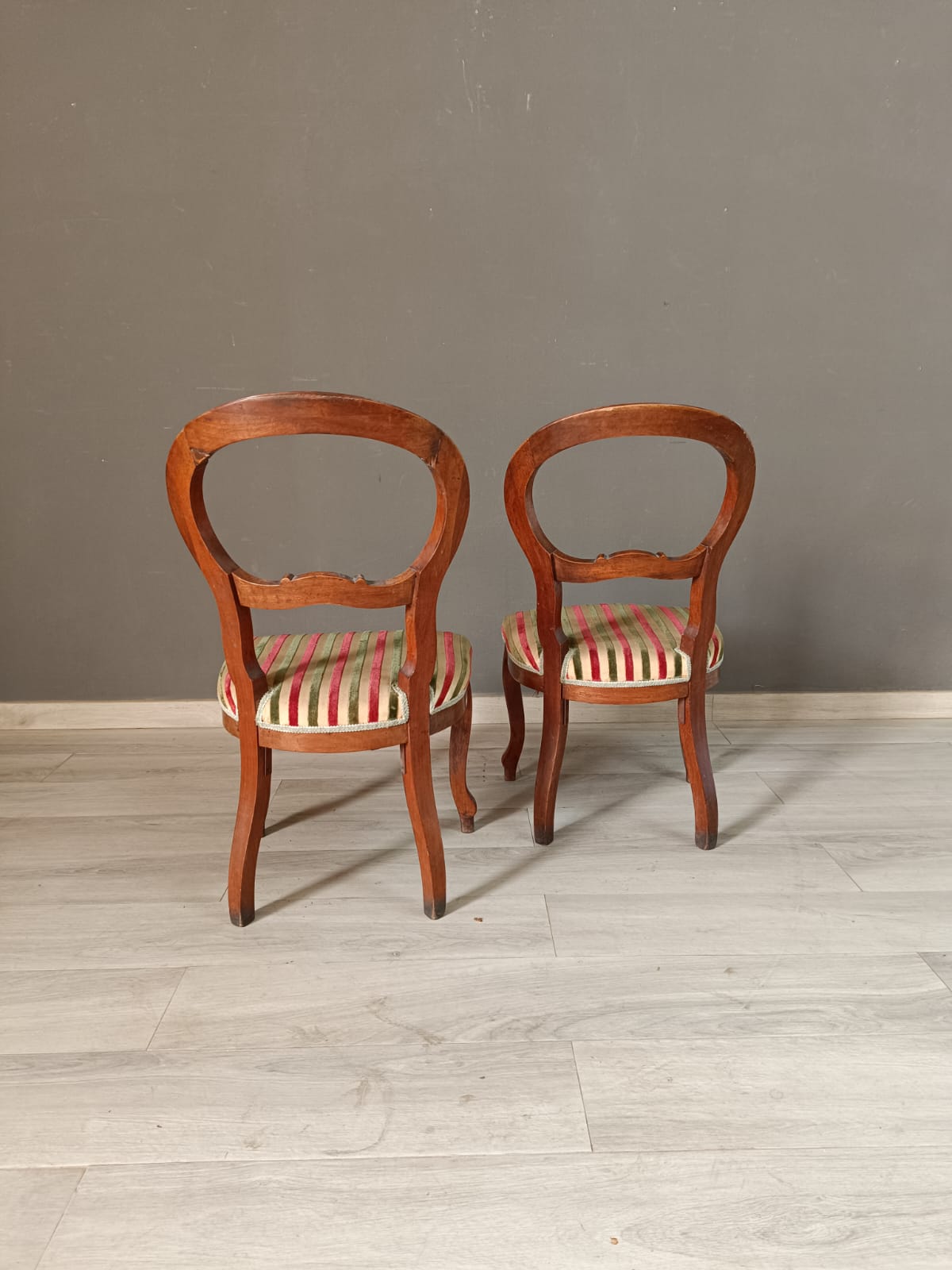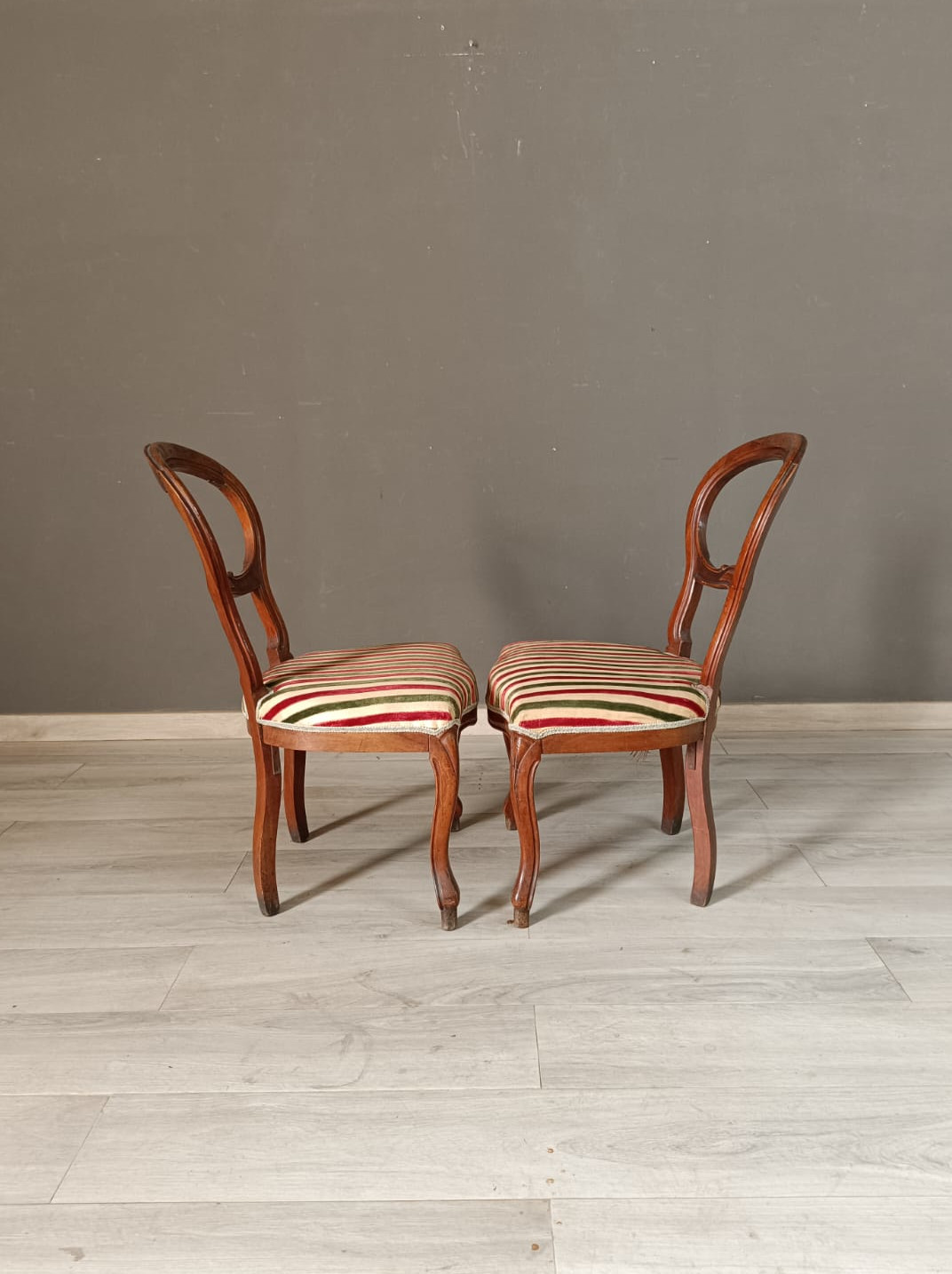 Coppia di sedie a medaglione di epoca Luigi Filippo in massello di noce. Tessuto dell’epoca a fasce vellutato.