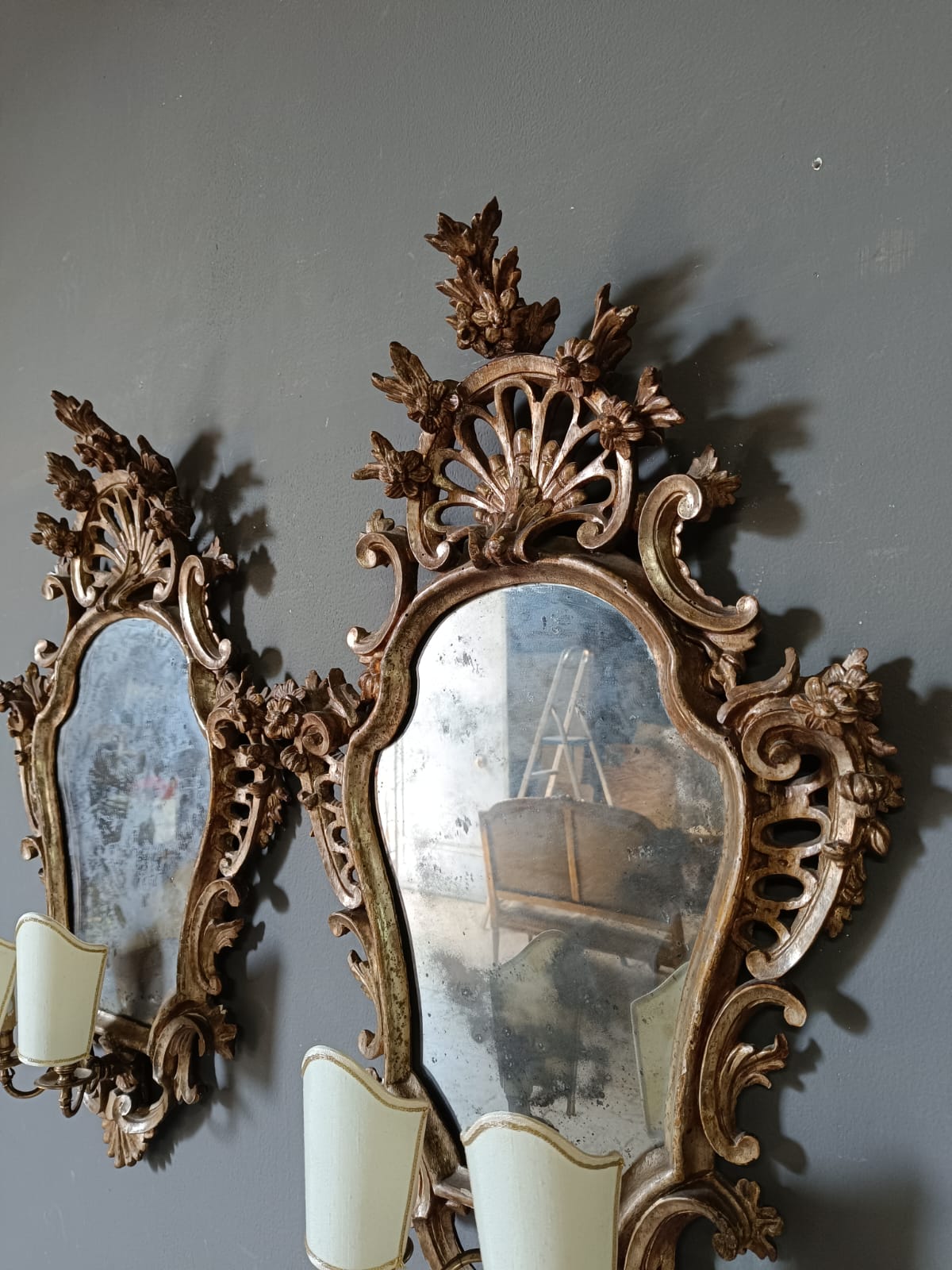 Coppia di specchiere Luigi XIV di piccole dimensioni intagliate e rifinite in argento meccato. Specchio al mercurio dell’epoca. In prima patina.