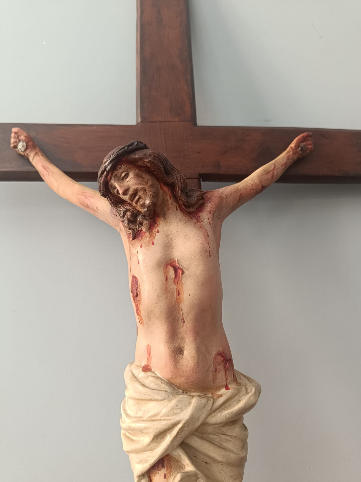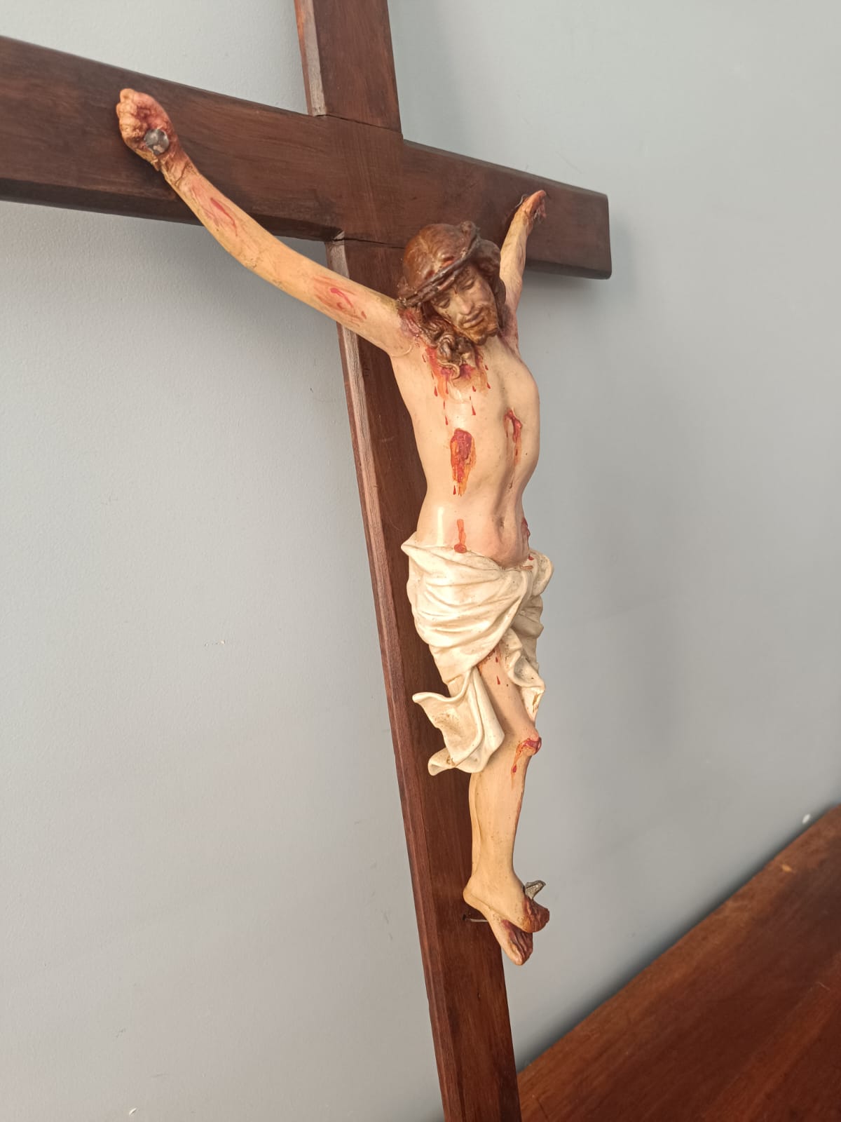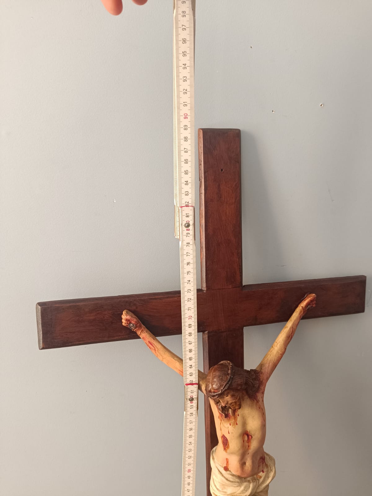 Crocifisso in legno di medie dimensioni con Cristo in cartapesta. La scultura in cartapesta è di ottima manifattura ed ha gli occhi in vetro.