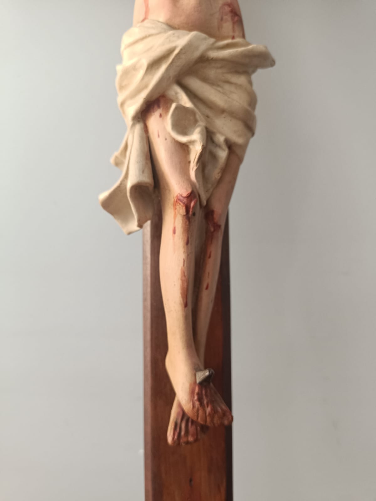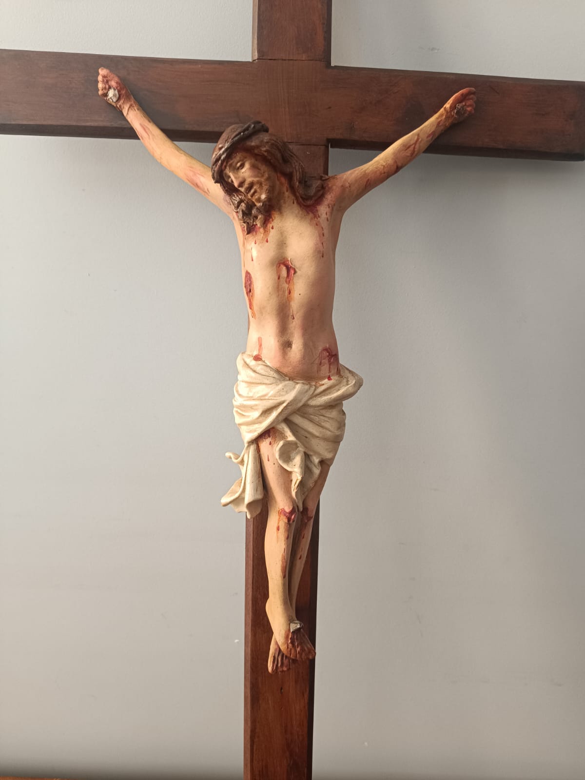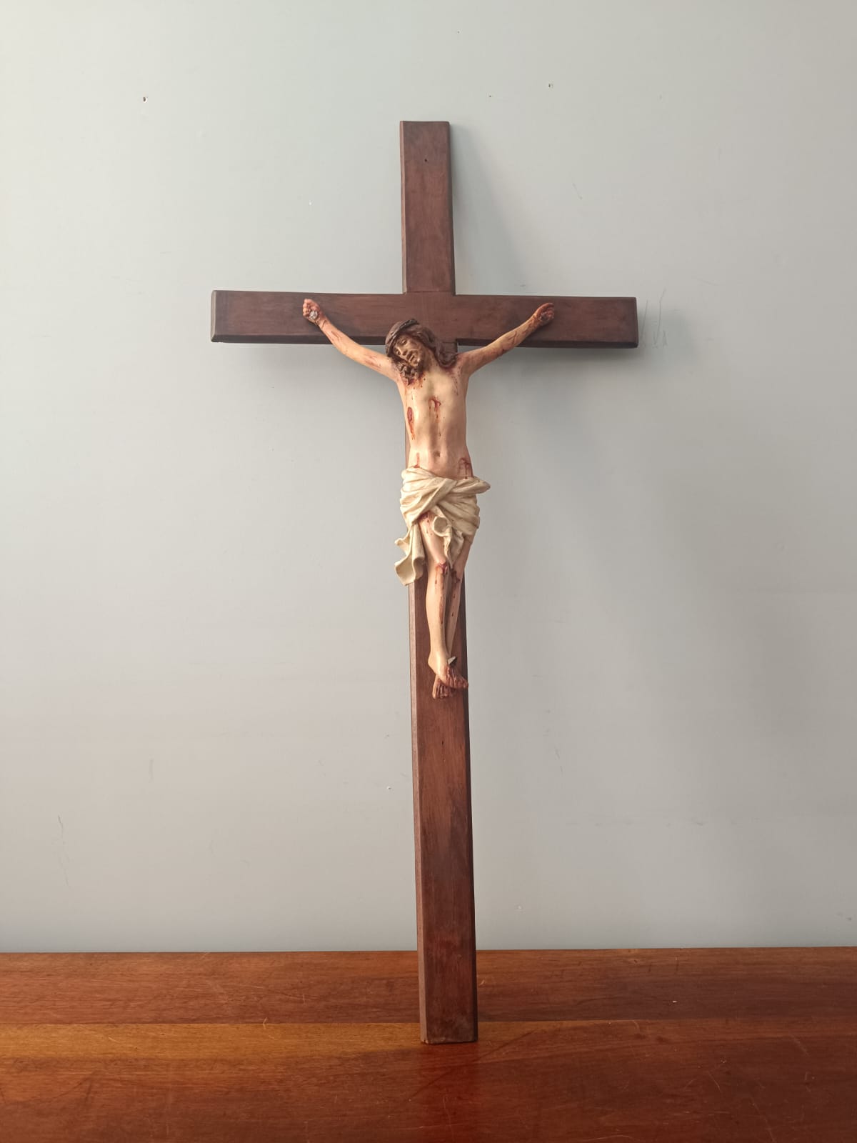 Crocifisso in legno di medie dimensioni con Cristo in cartapesta. La scultura in cartapesta è di ottima manifattura ed ha gli occhi in vetro.