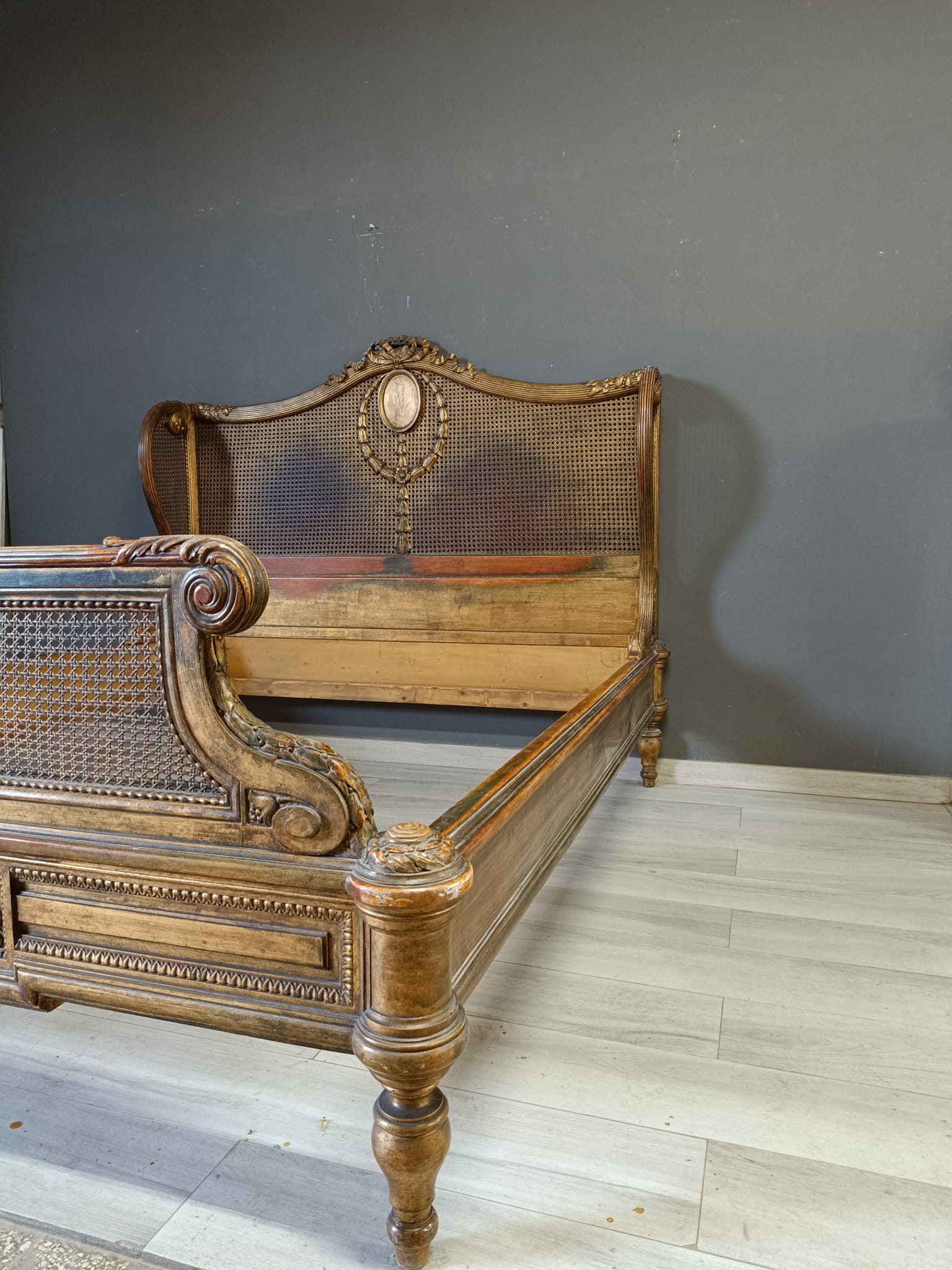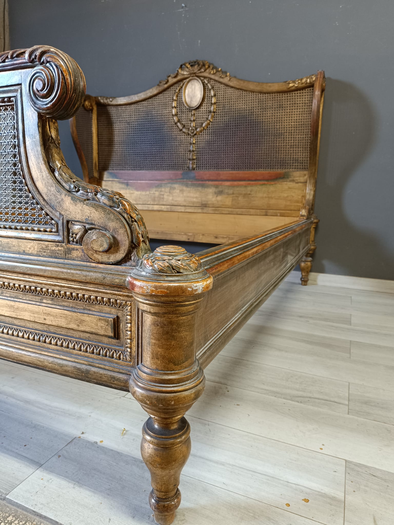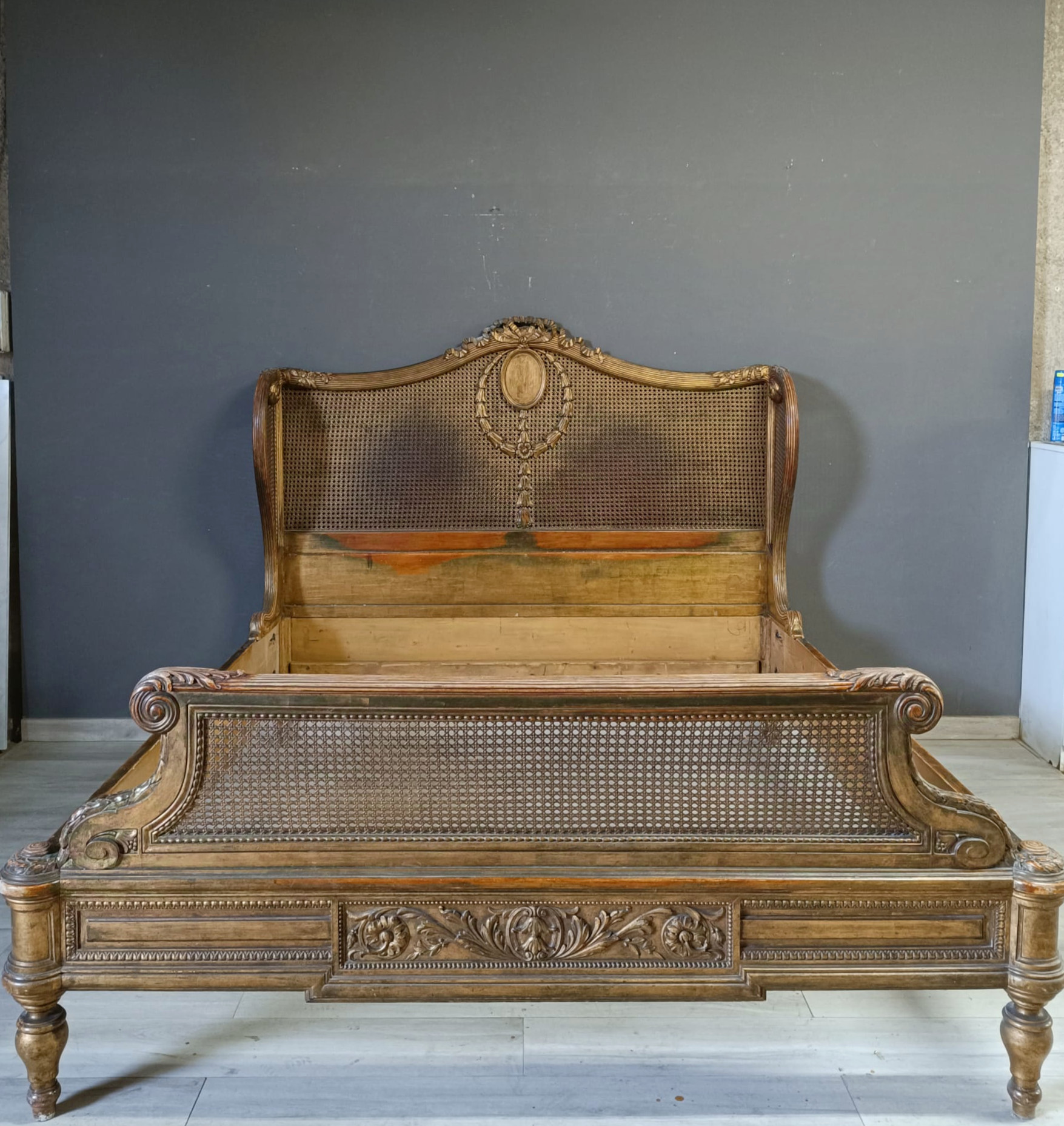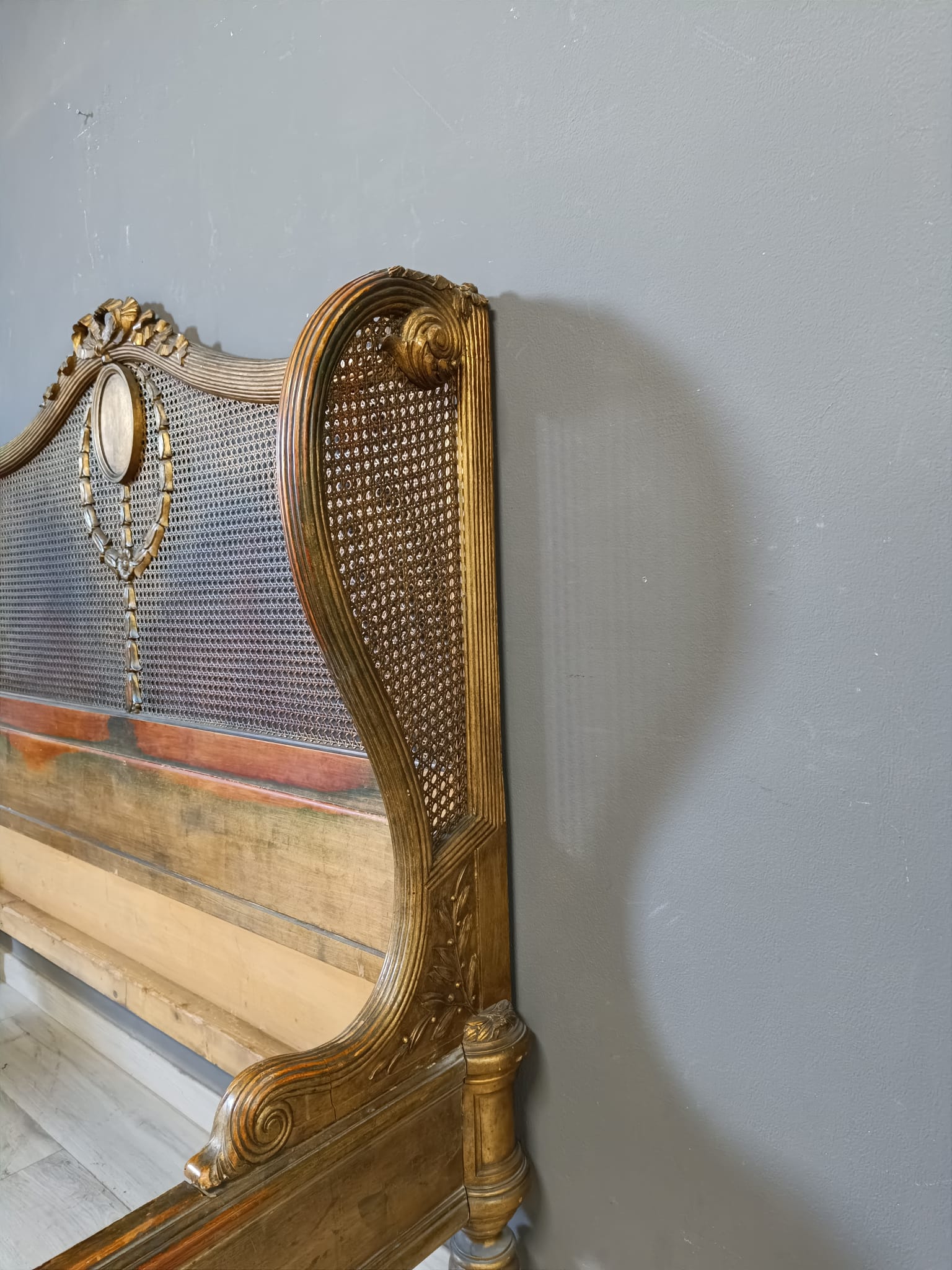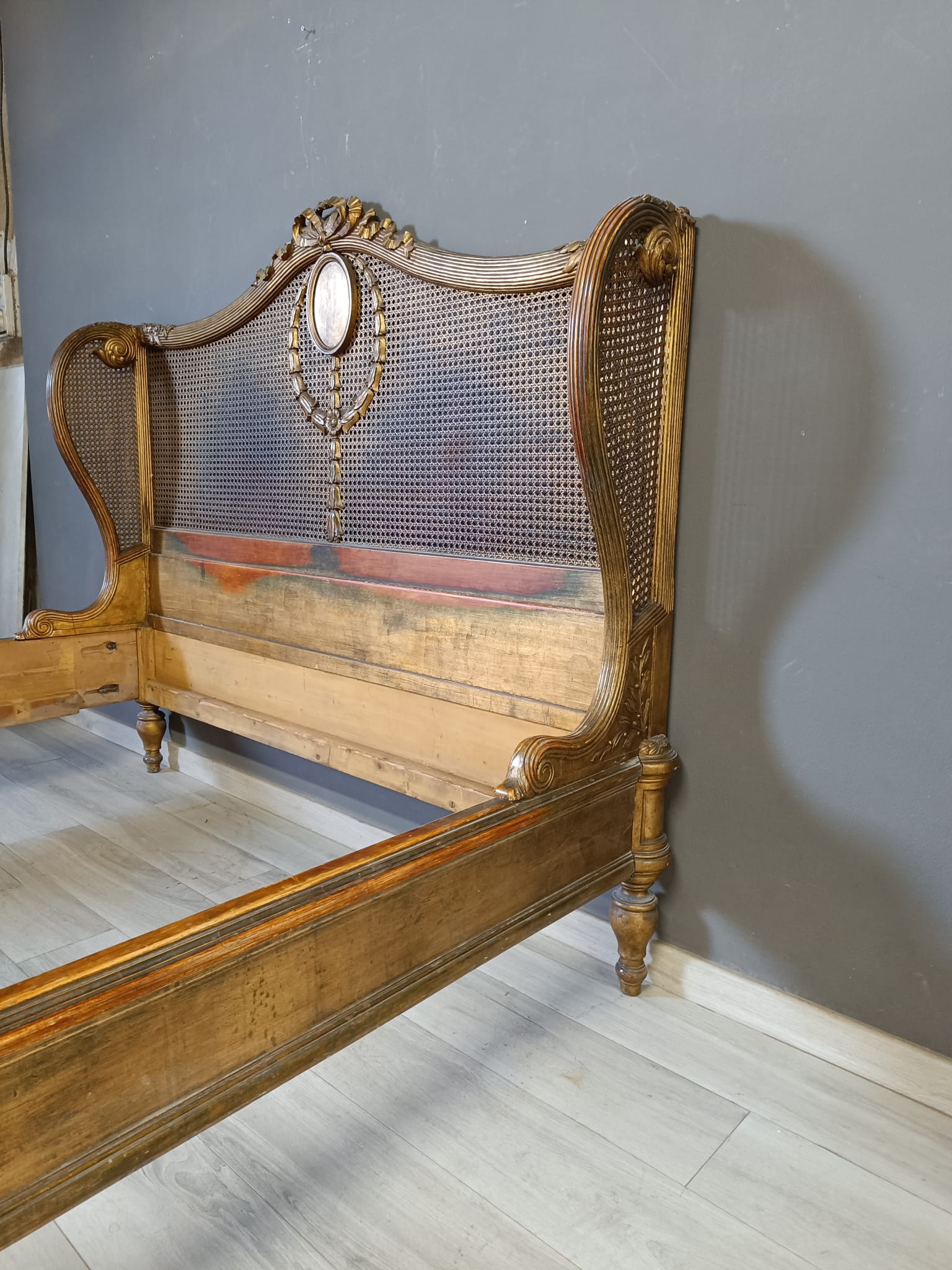 Bellissimo e raro letto matrimoniale nello stile Luigi XVI intagliato a motivi che richiamano il periodo del Re sole con festoni e fiori. Spalliera arricchita con paglia e dorato con tecnica a bolo e oro fino.