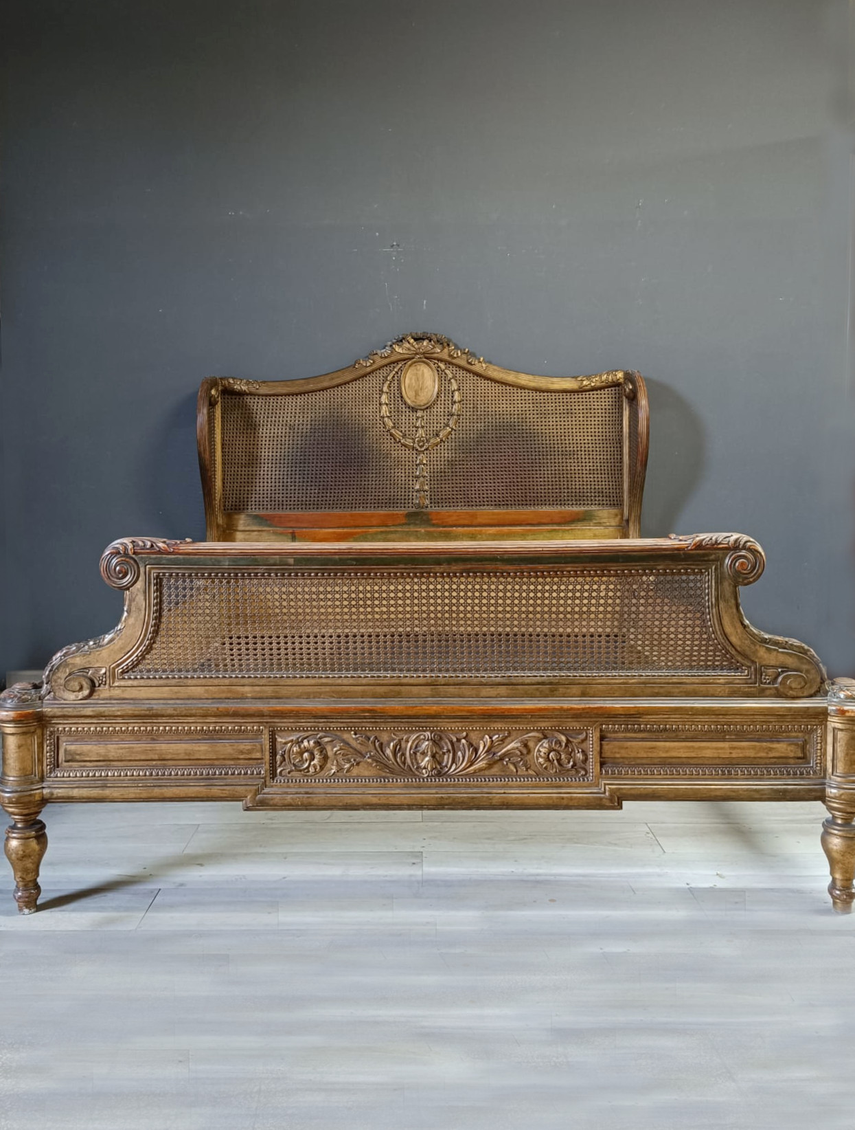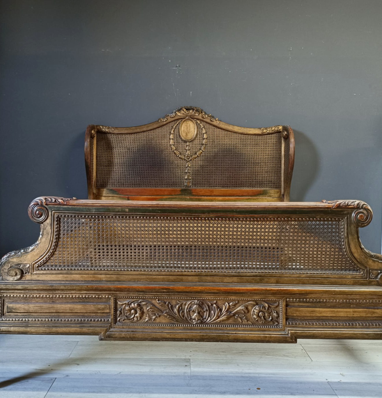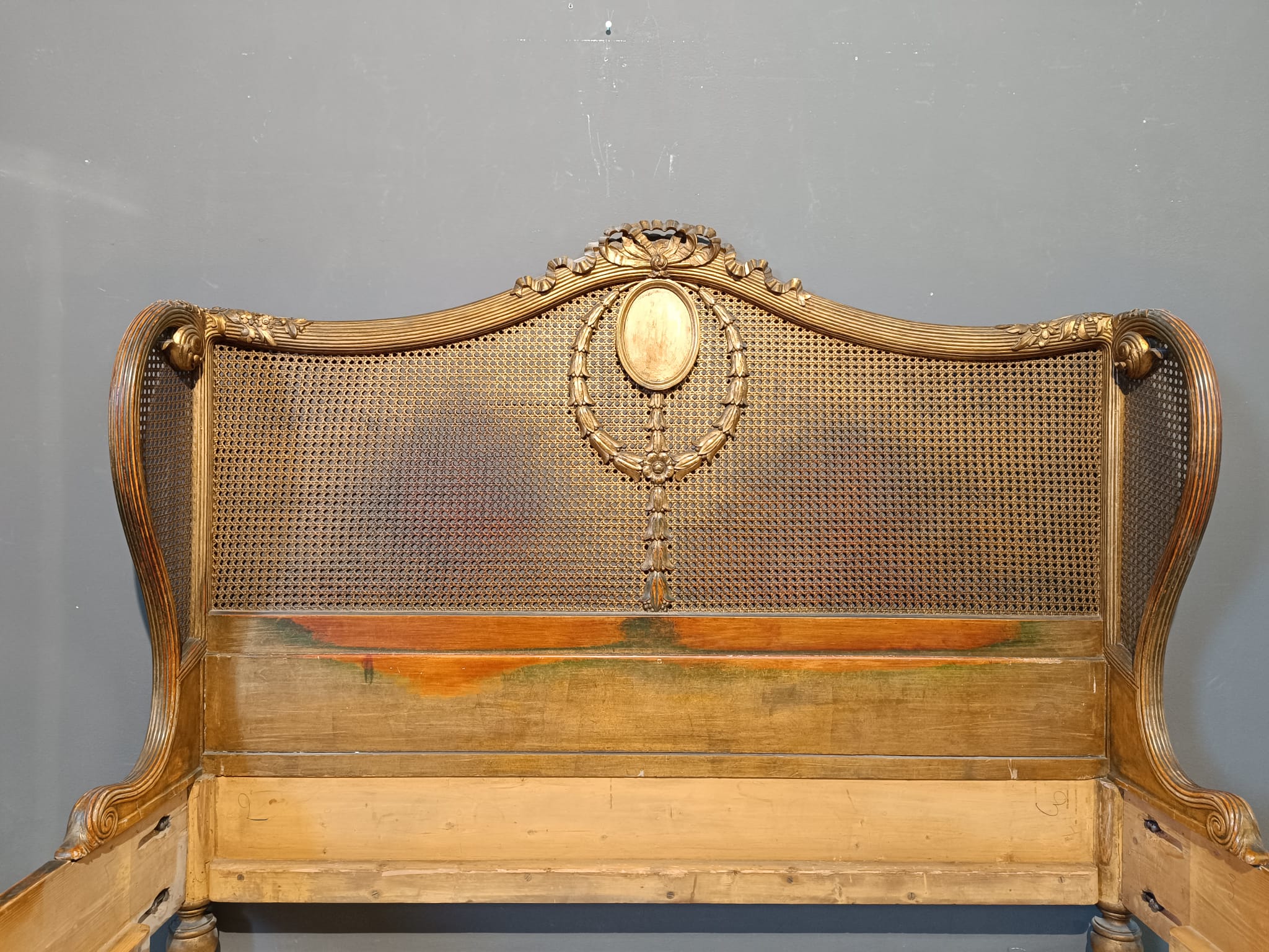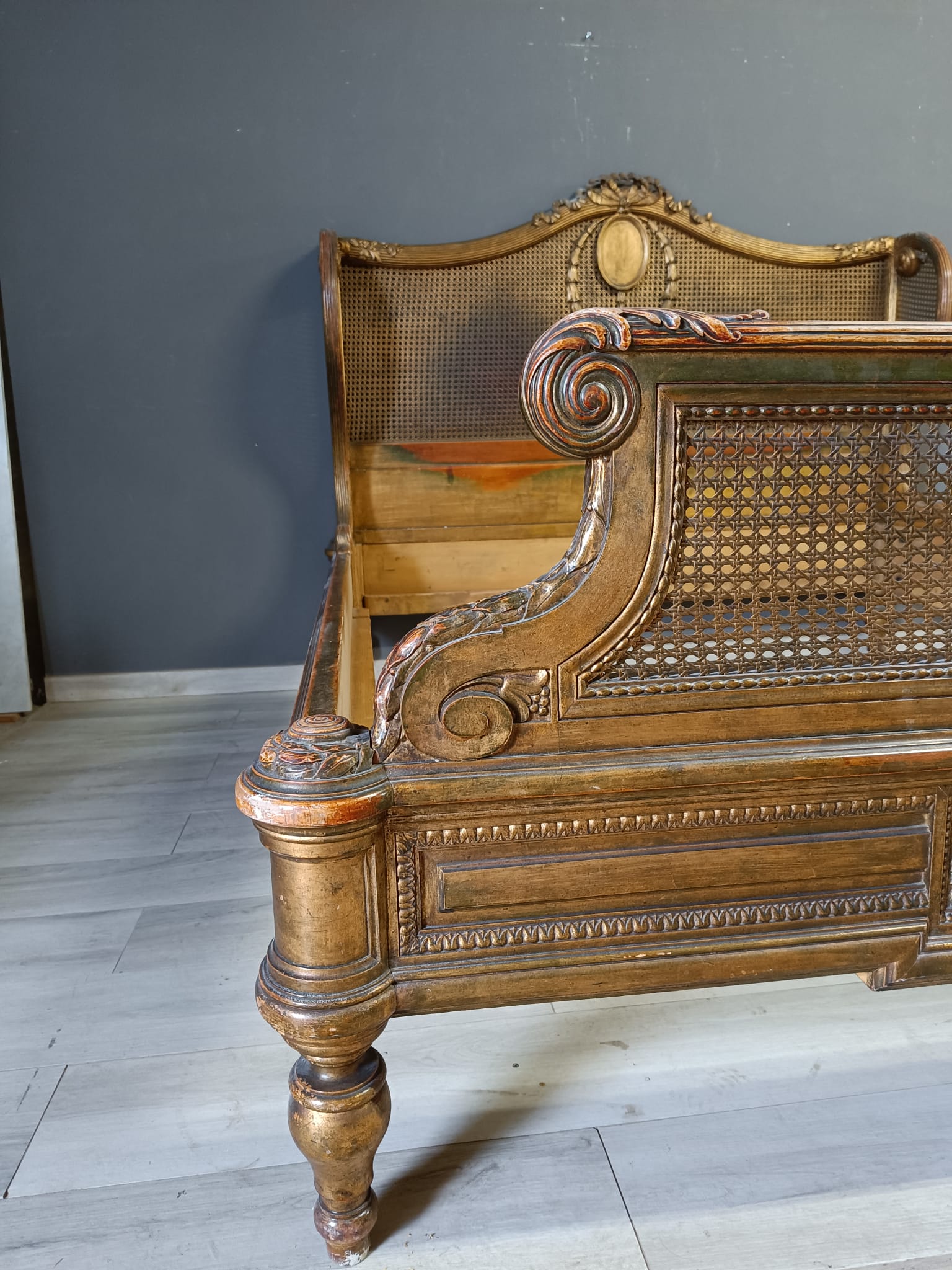 Bellissimo e raro letto matrimoniale nello stile Luigi XVI intagliato a motivi che richiamano il periodo del Re sole con festoni e fiori. Spalliera arricchita con paglia e dorato con tecnica a bolo e oro fino.
