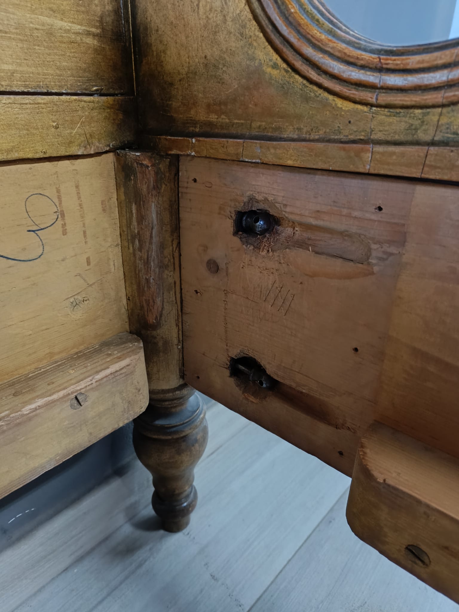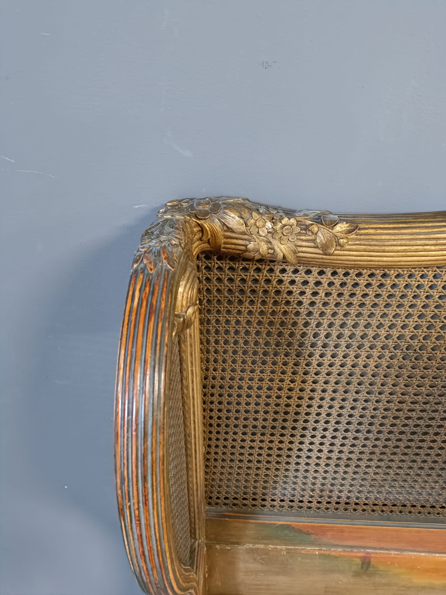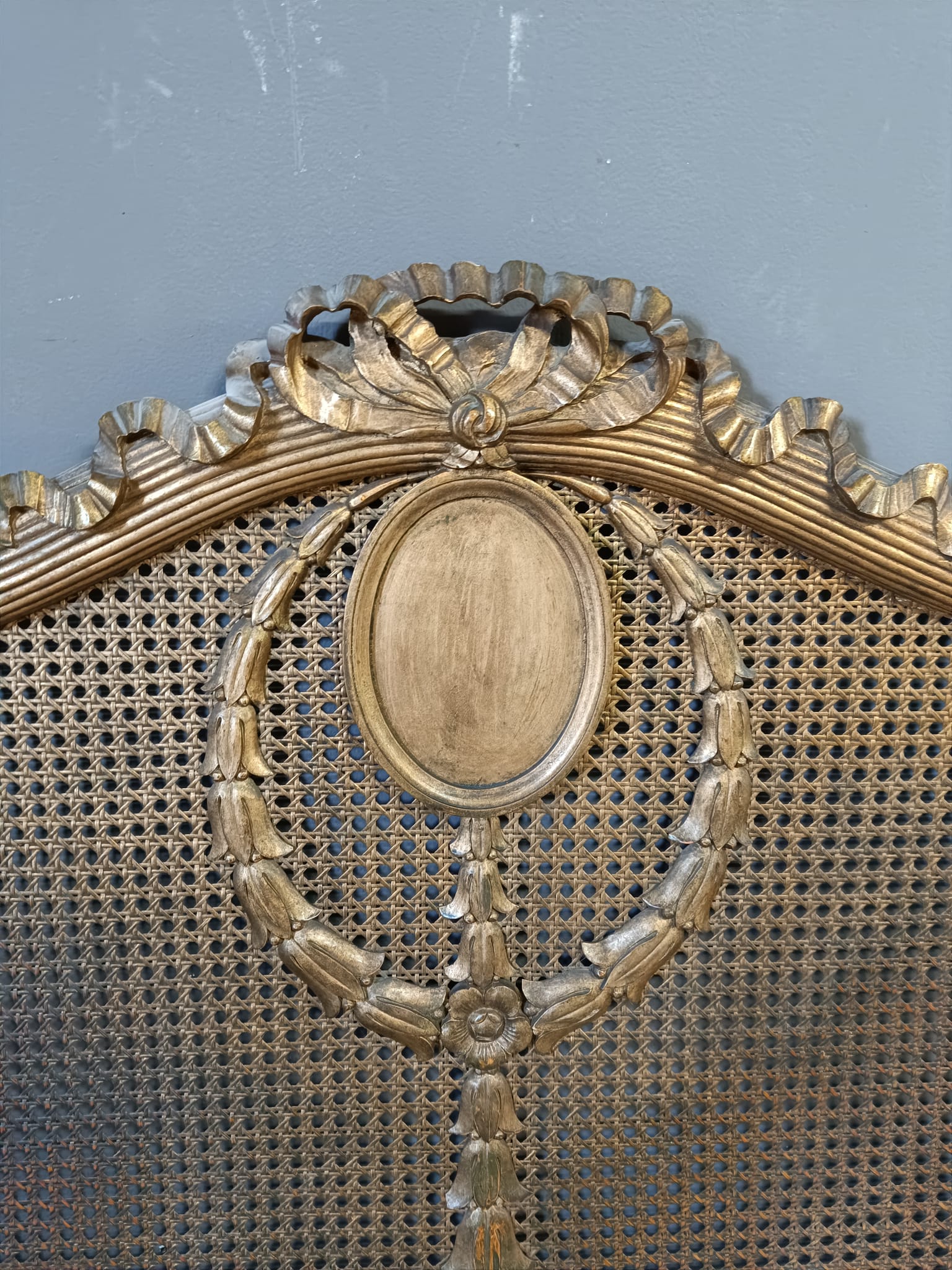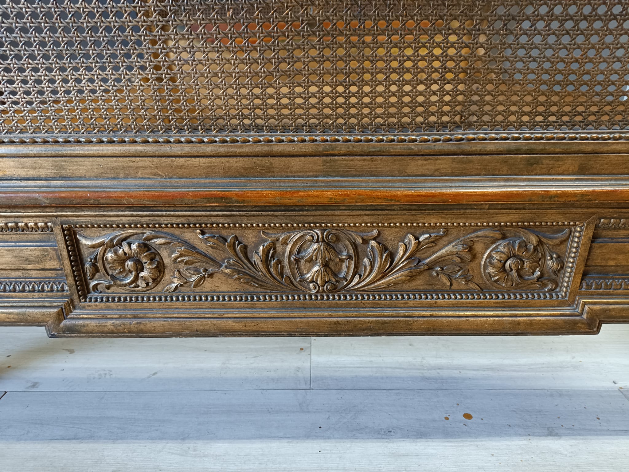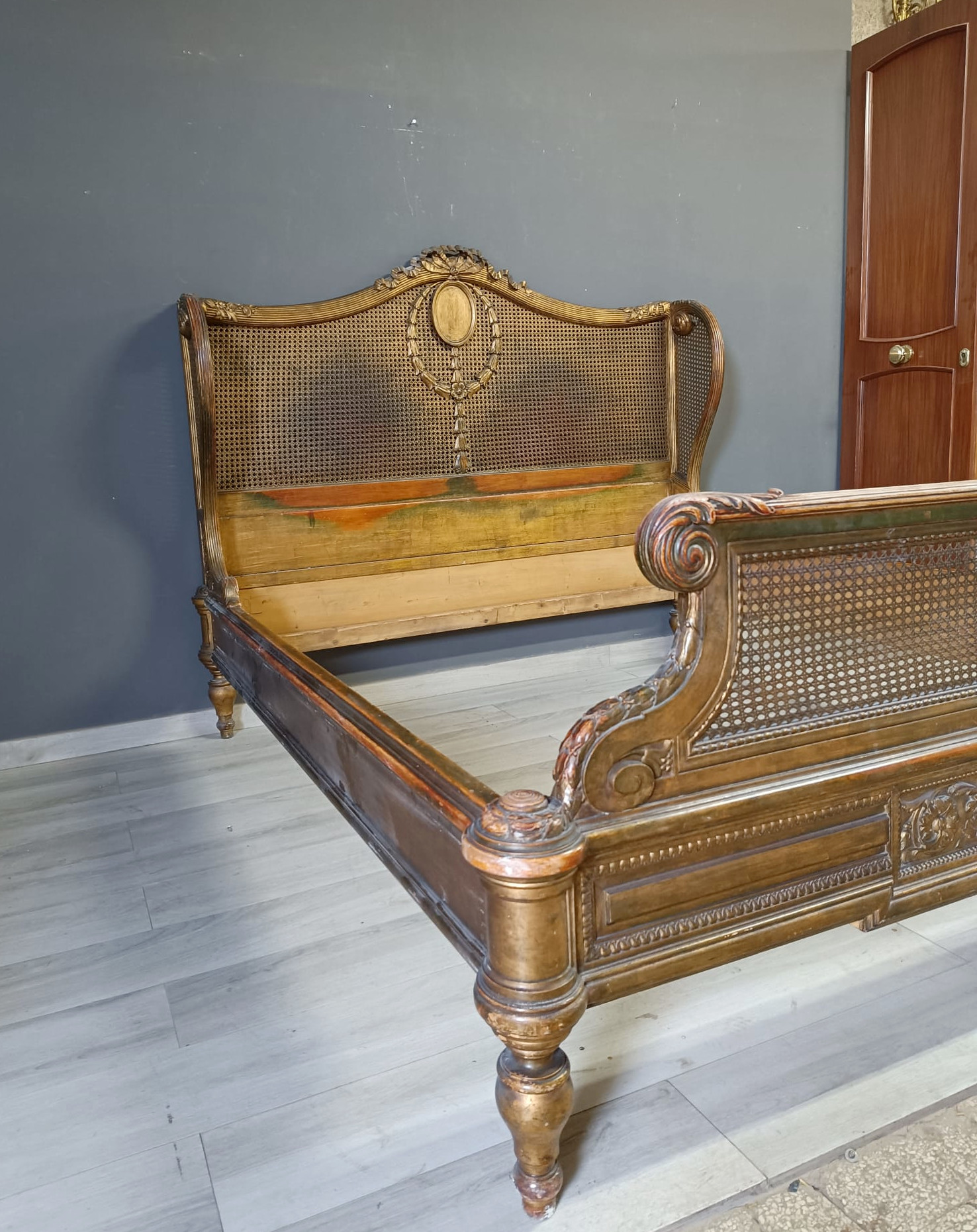 Bellissimo e raro letto matrimoniale nello stile Luigi XVI intagliato a motivi che richiamano il periodo del Re sole con festoni e fiori. Spalliera arricchita con paglia e dorato con tecnica a bolo e oro fino.