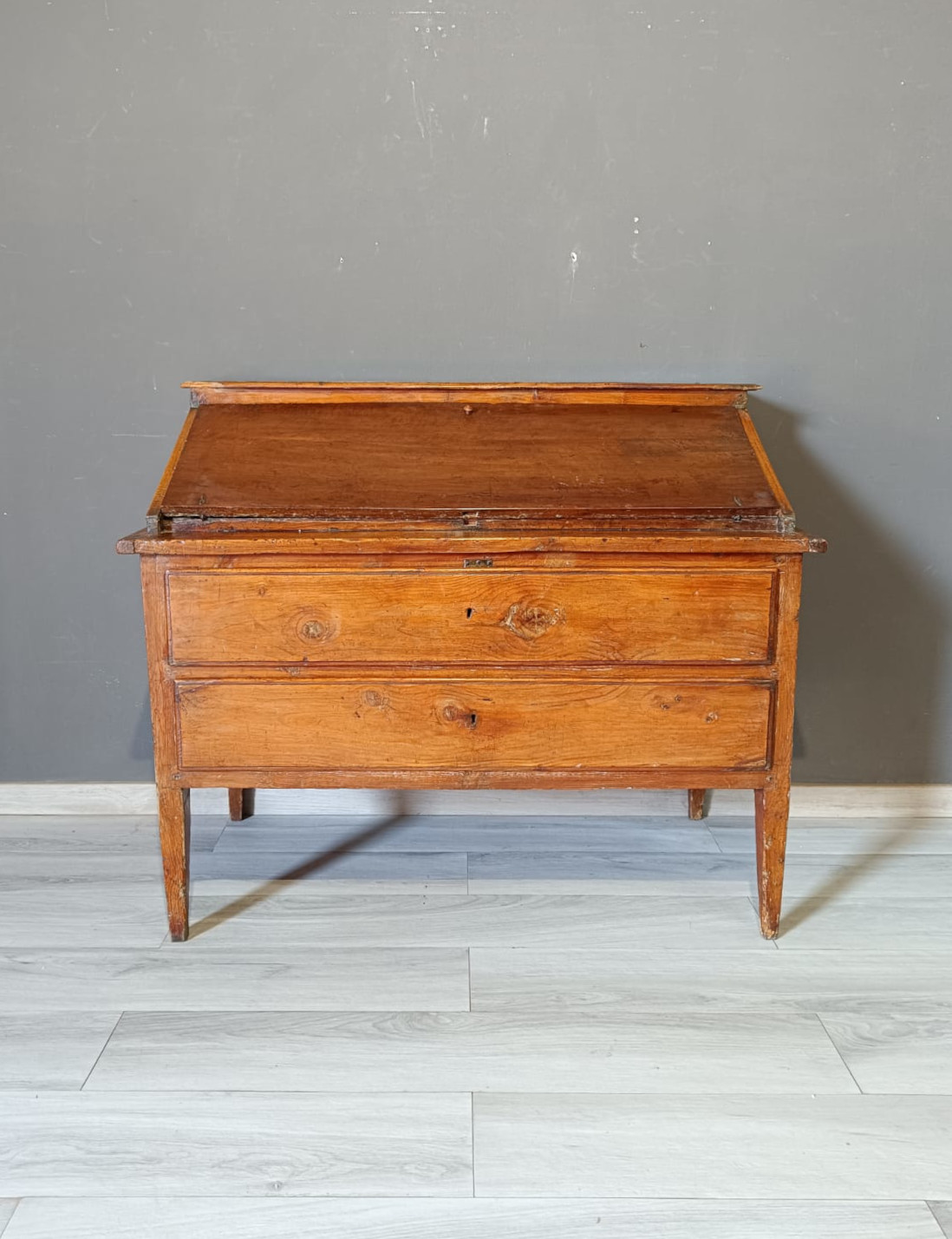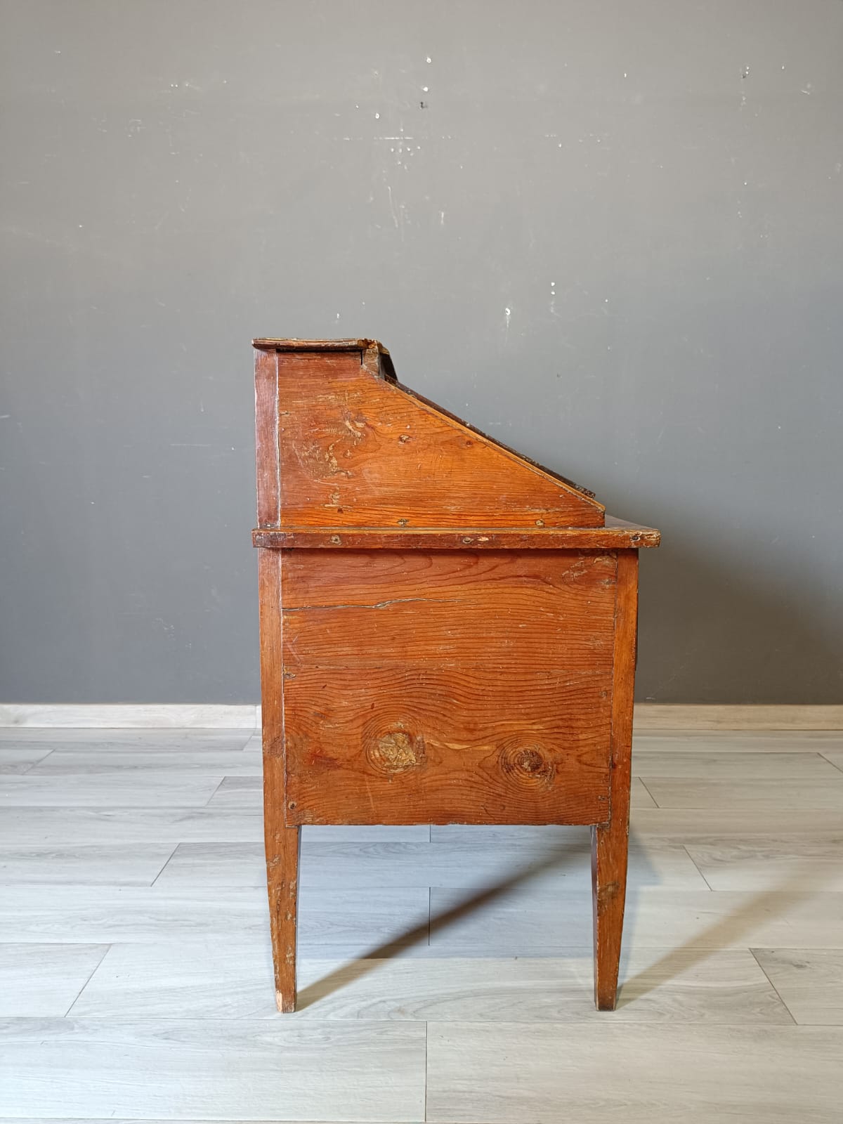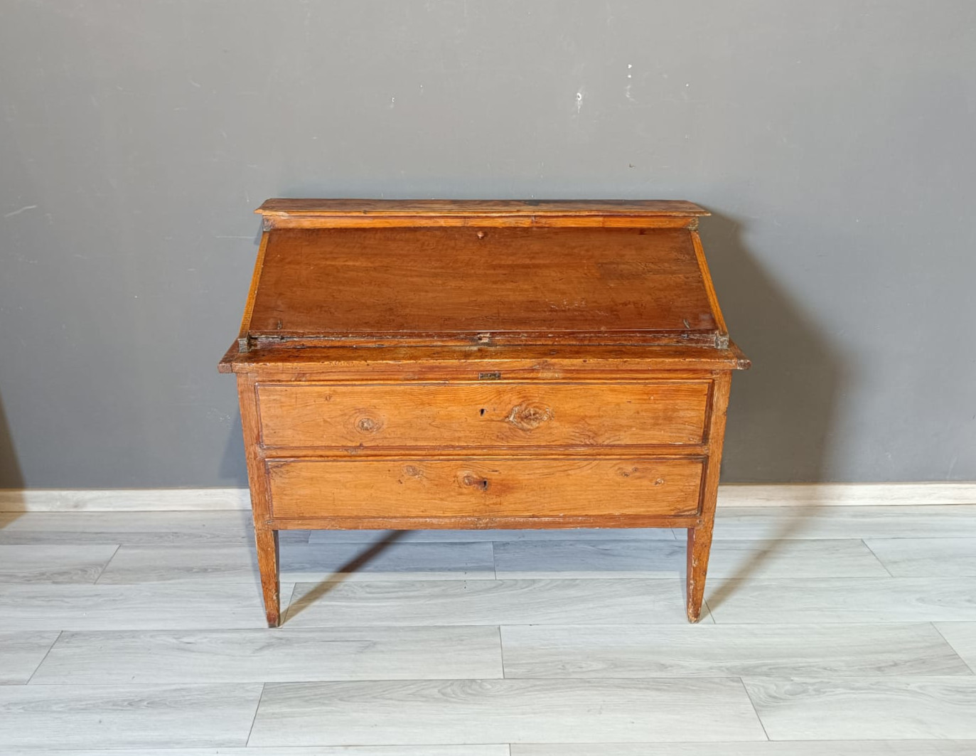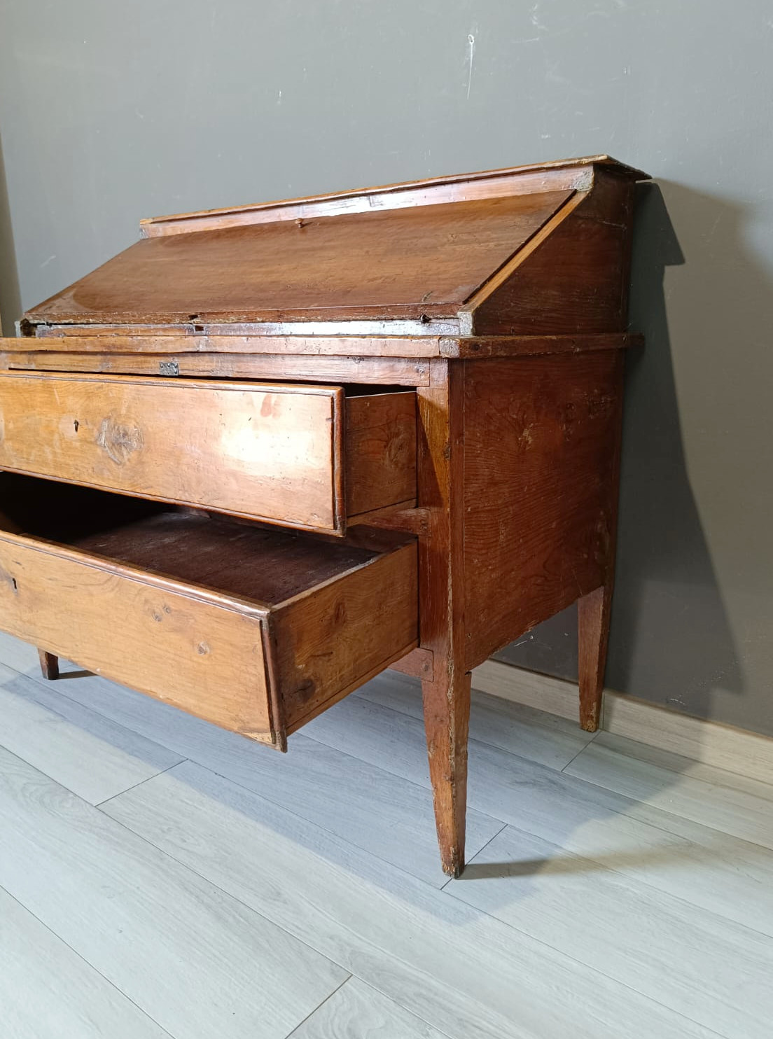 Antica ribalta di epoca Luigi XVI realizzata con castagno e larice. Sulla parte frontale vi sono due cassetti più la ribalta con cassettini interni.