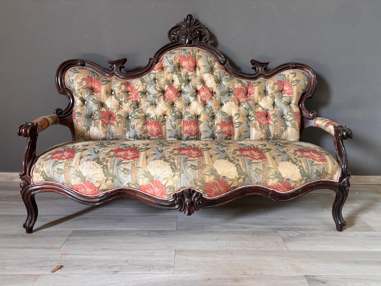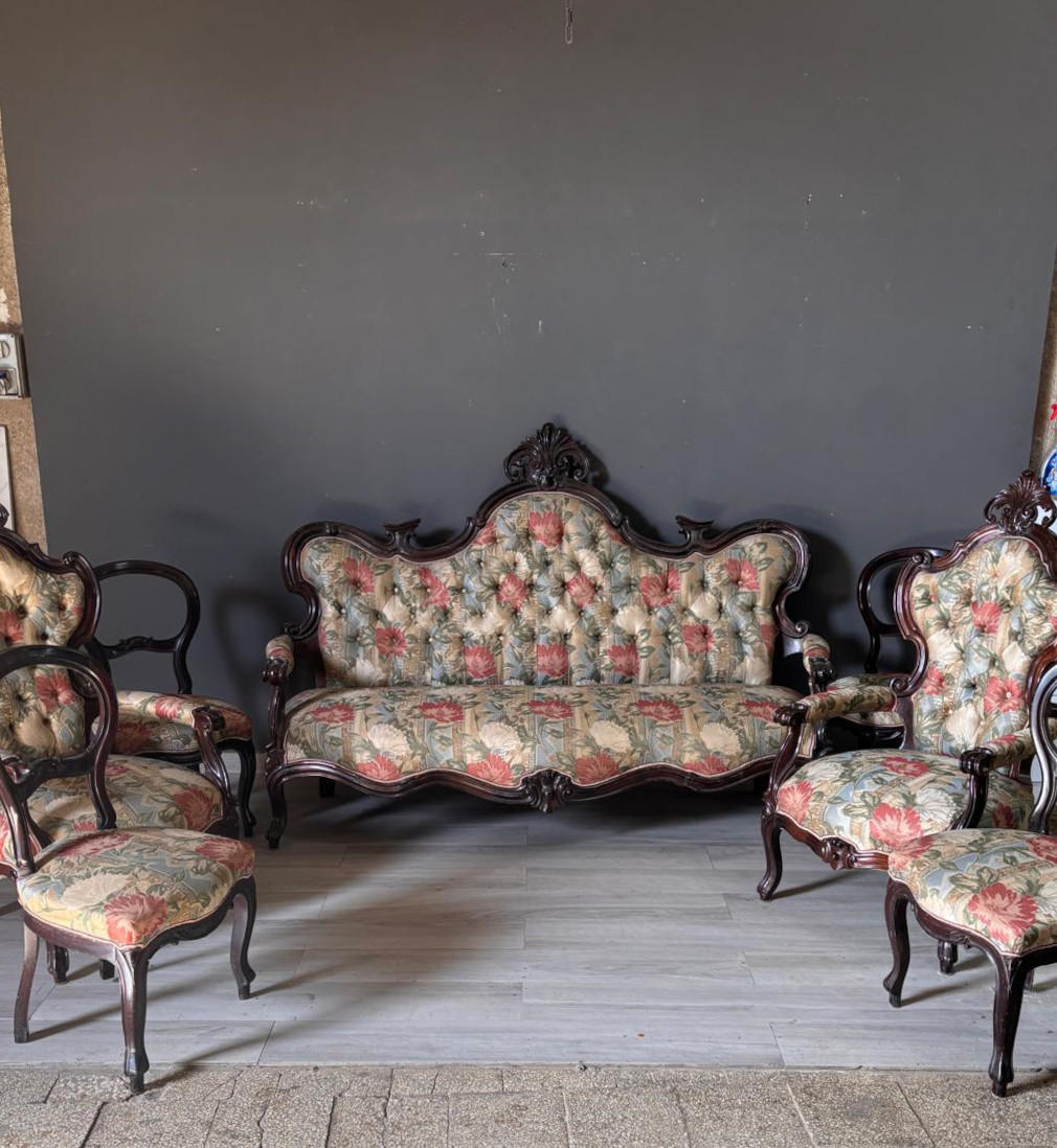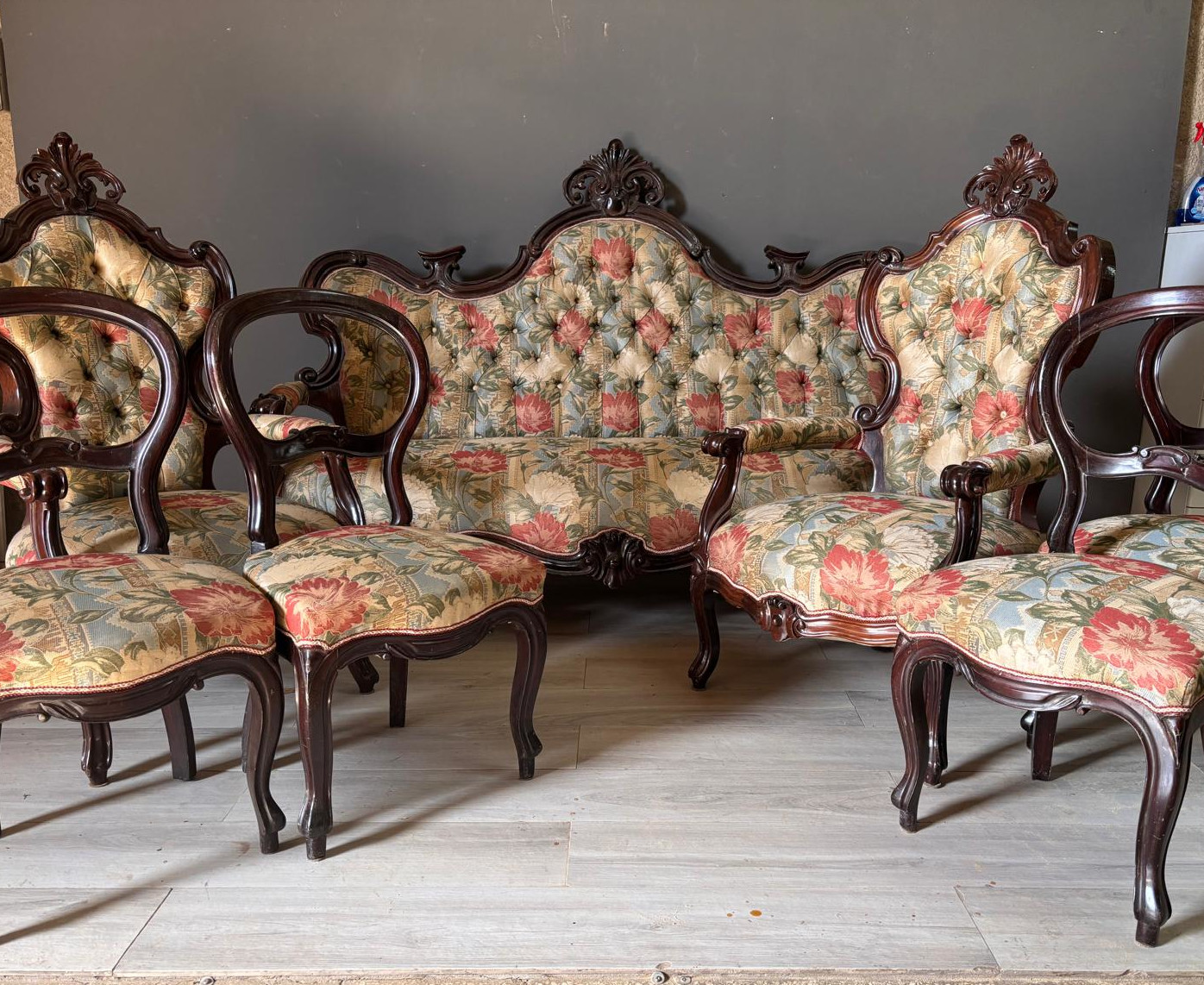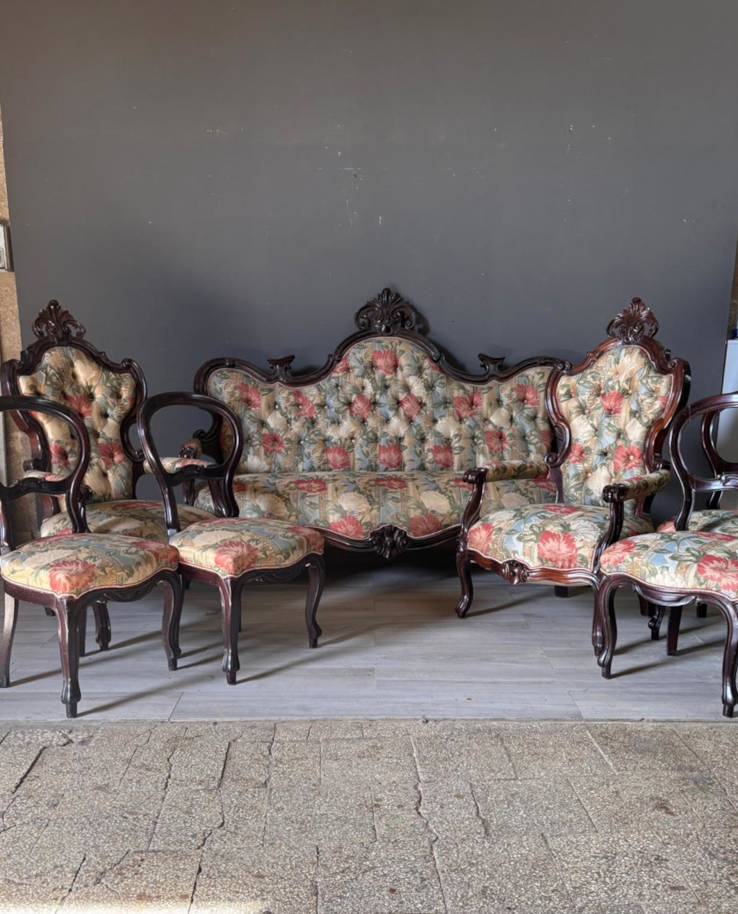 Importante salotto di epoca Luigi Filippo in palissandro finemente intagliato. Questo salotto è composto da n1. Divano, n.2 poltrone e n.4 sedie. La tappezzeria risulta essere completamente ricamata ed in perfetto stato conservativo (come si può notare dalle foto). Manifattura napoletana di grande ebanisteria.