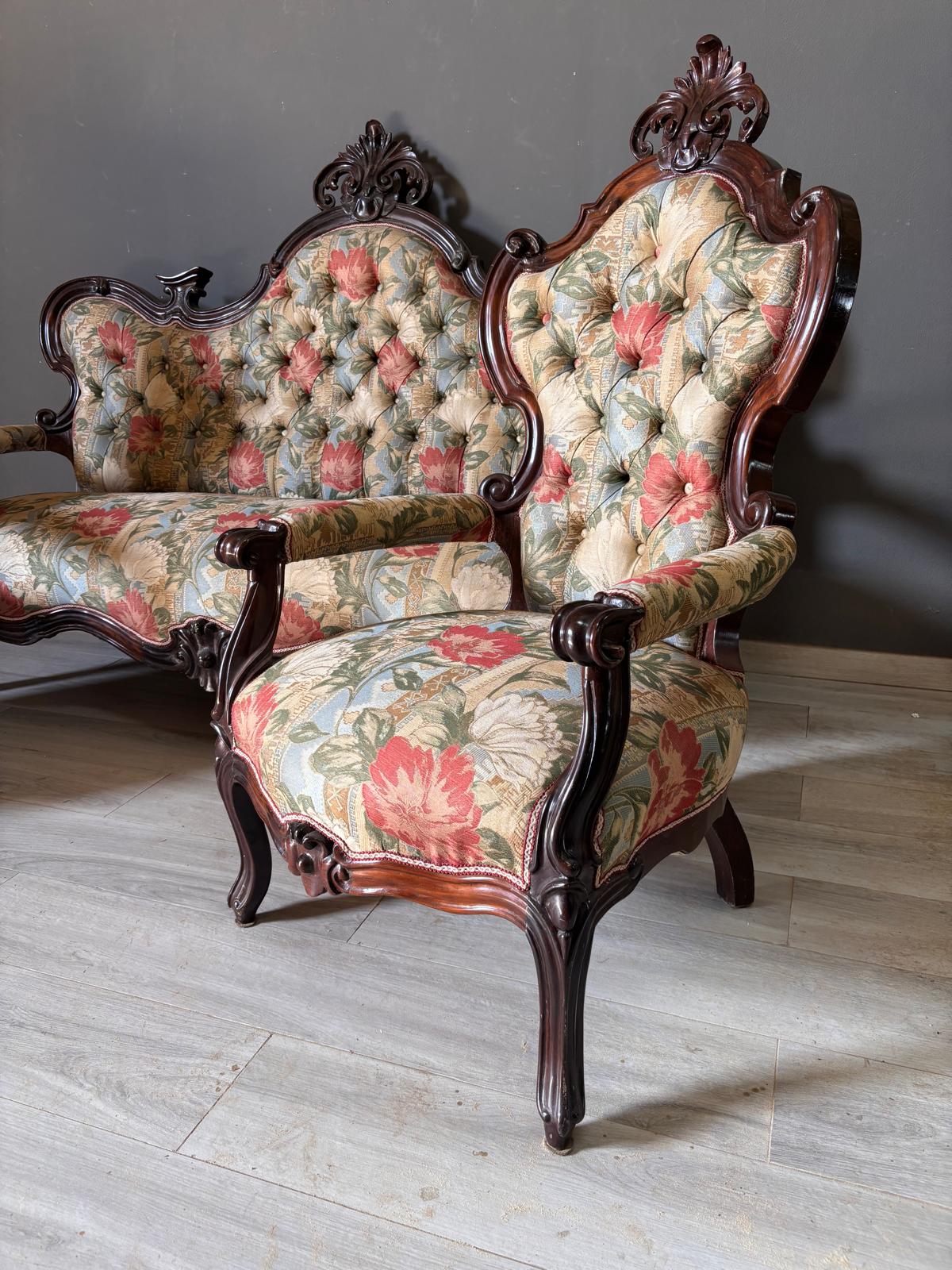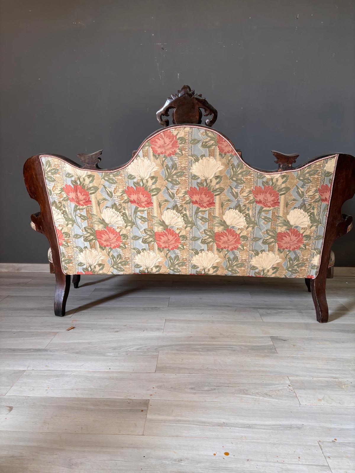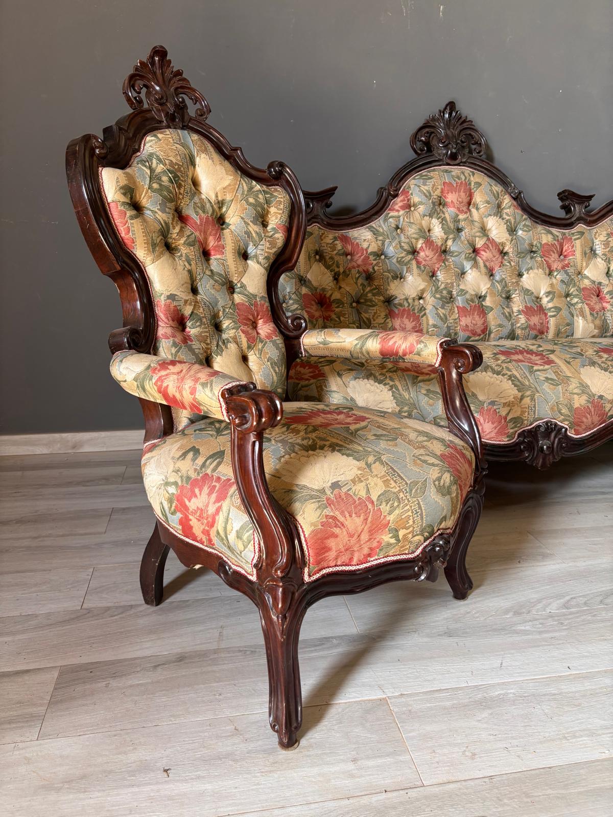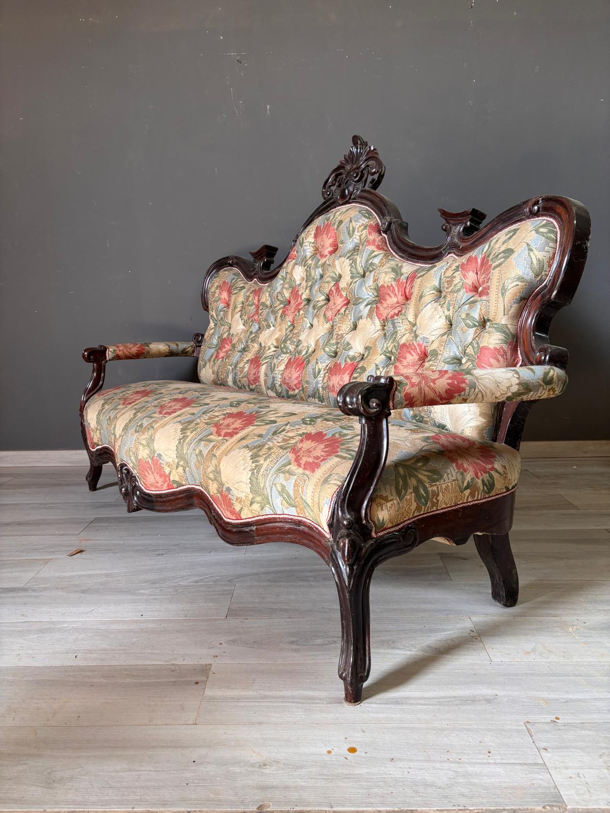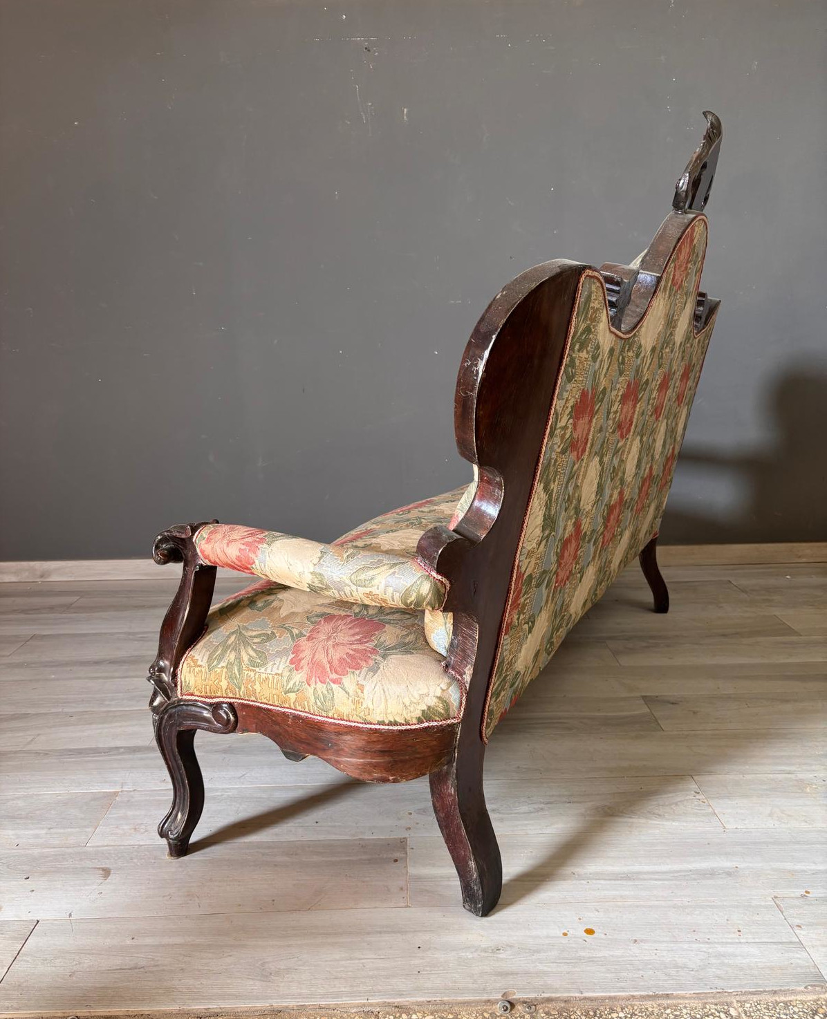 Importante salotto di epoca Luigi Filippo in palissandro finemente intagliato. Questo salotto è composto da n1. Divano, n.2 poltrone e n.4 sedie. La tappezzeria risulta essere completamente ricamata ed in perfetto stato conservativo (come si può notare dalle foto). Manifattura napoletana di grande ebanisteria.
