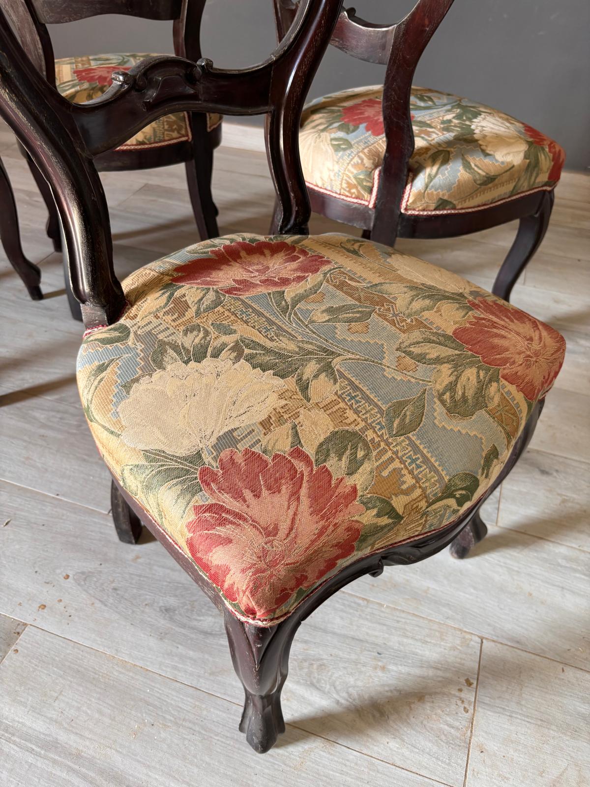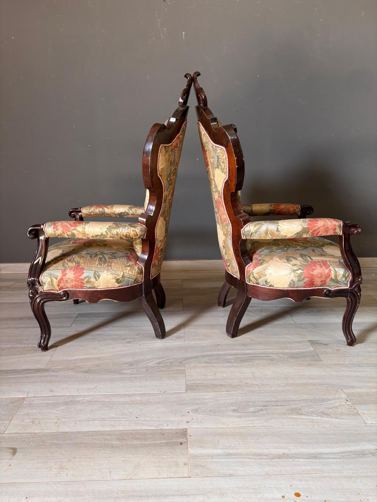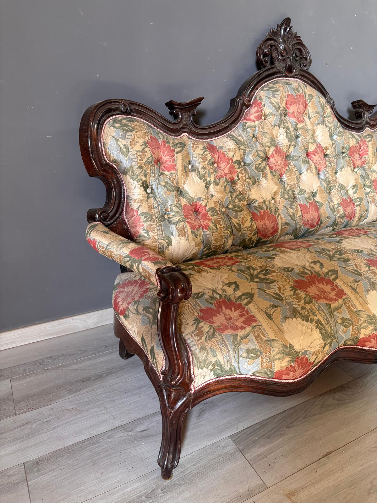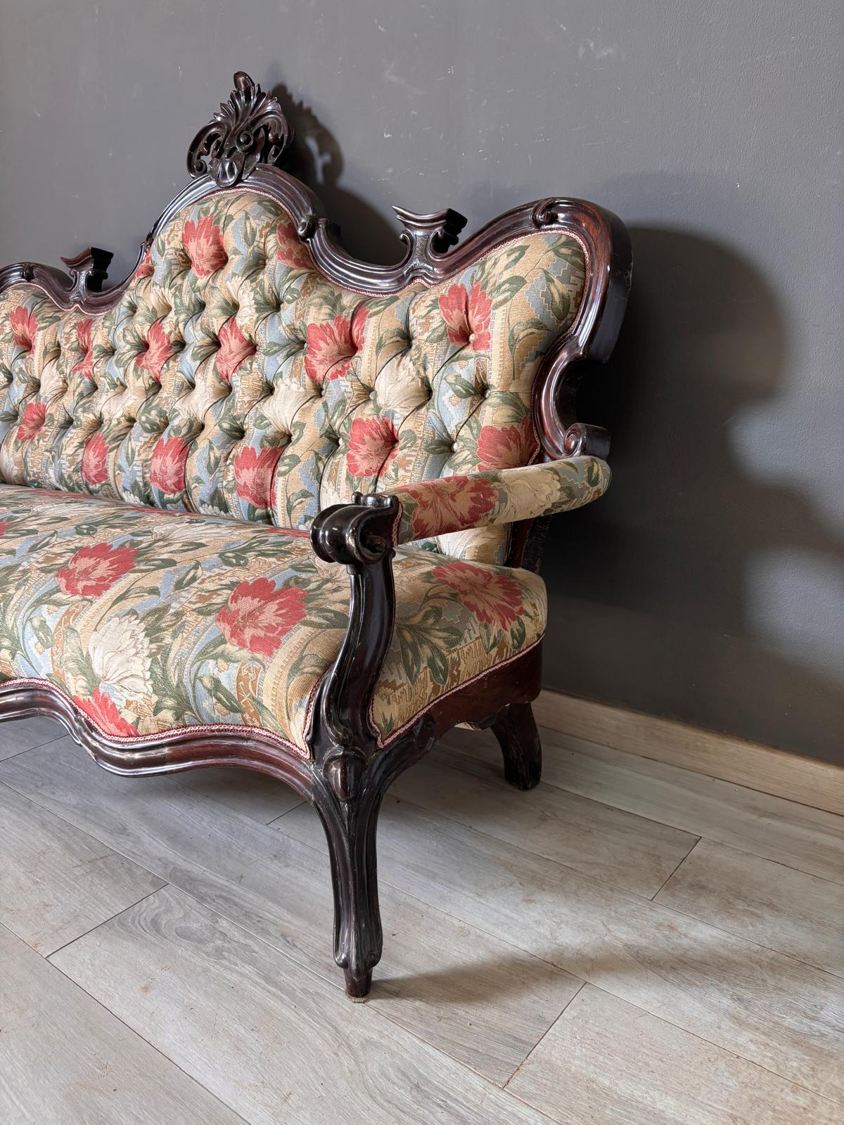 Importante salotto di epoca Luigi Filippo in palissandro finemente intagliato. Questo salotto è composto da n1. Divano, n.2 poltrone e n.4 sedie. La tappezzeria risulta essere completamente ricamata ed in perfetto stato conservativo (come si può notare dalle foto). Manifattura napoletana di grande ebanisteria.