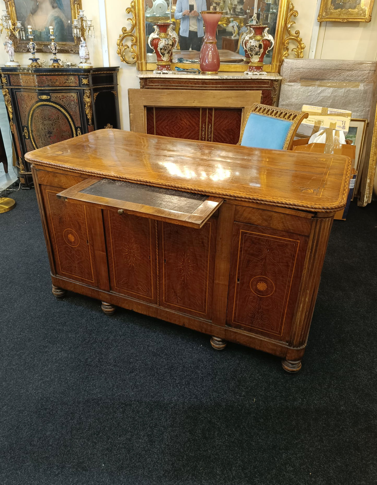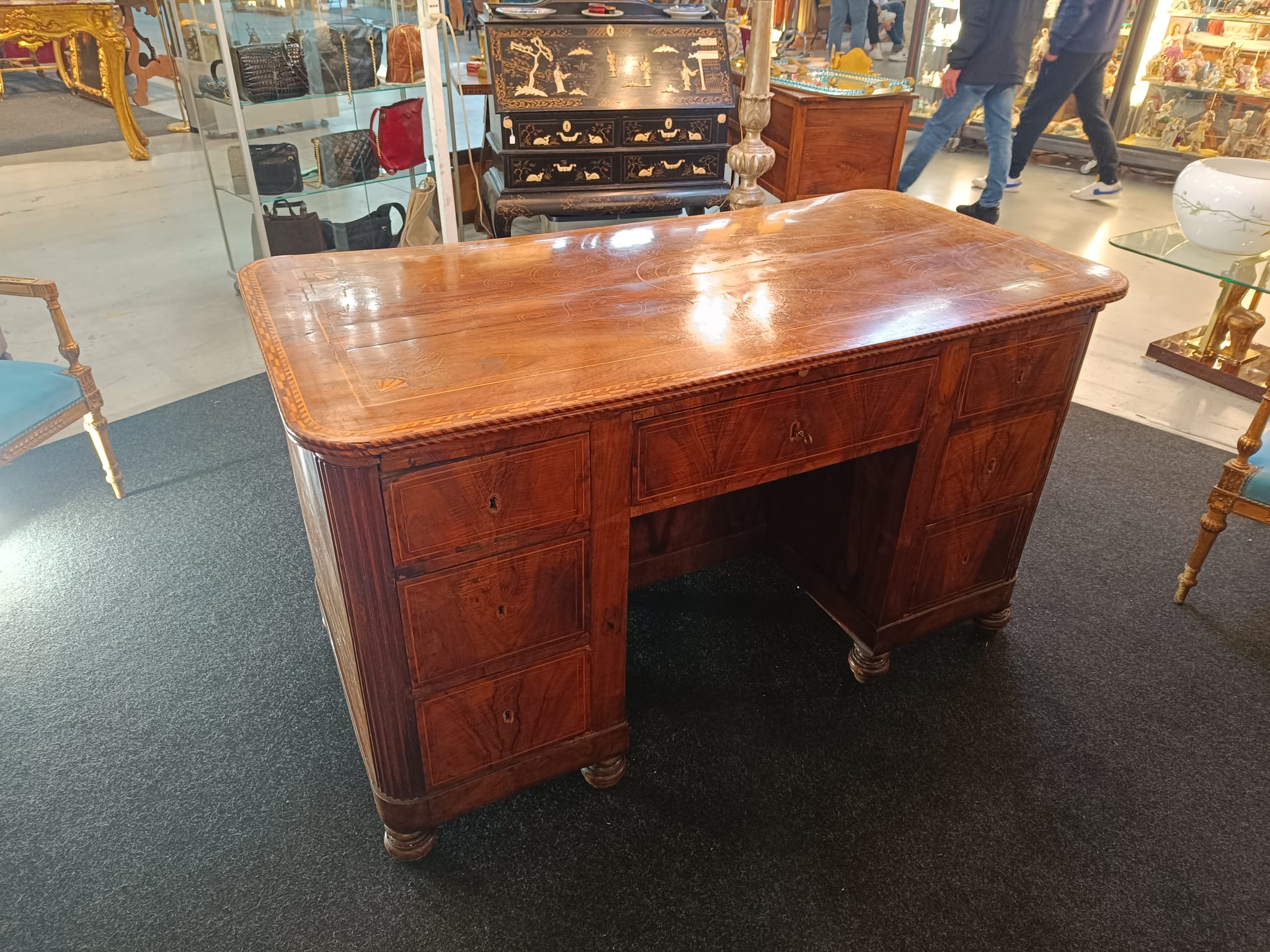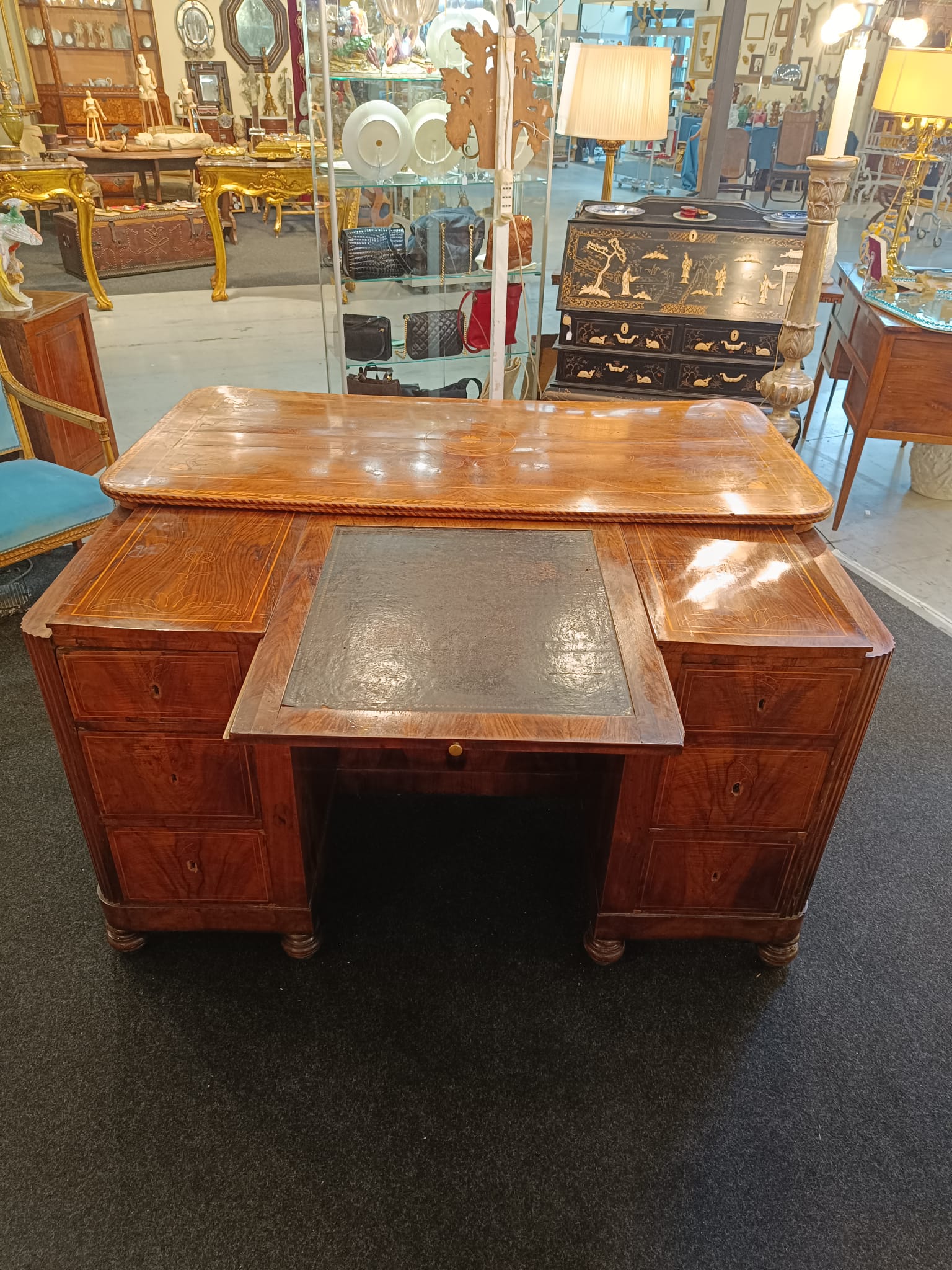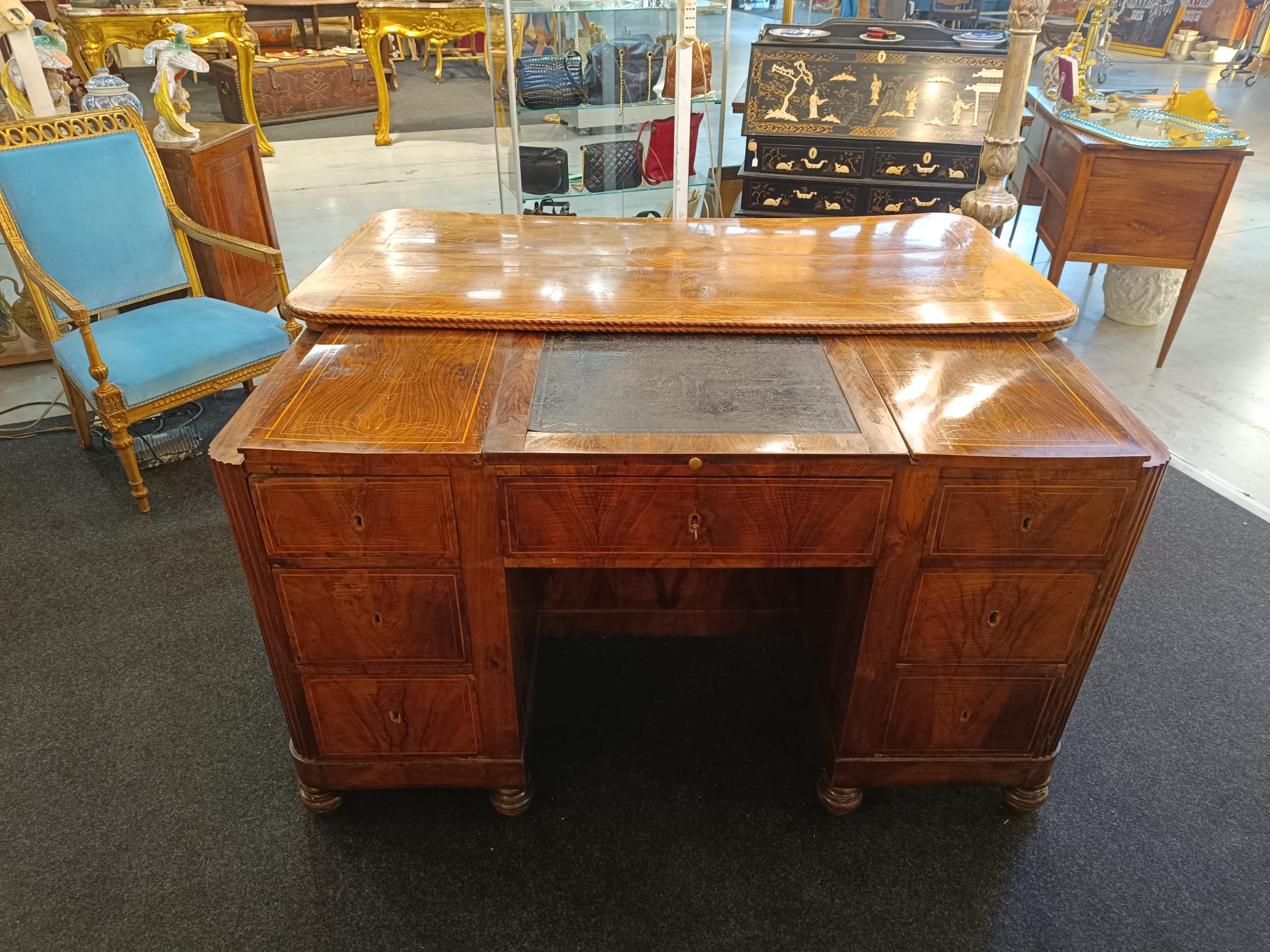 Importante e rara scrivania da centro di epoca Carlo X in massello di noce bionda filettata ed intarsiata su tutte le superfici. La particolarità di questo pezzo è il doppio piano scorrevole. La parte principale che può essere fatta scorrere sia in avanti che indietro più lo scrittoio piccolo centrale. Un’ulteriore particolarità è il fatto che sulla parte davanti presenta dei pannelli chiusi (tipo servante) mentre dall’altro lato presenta dei cassetti.