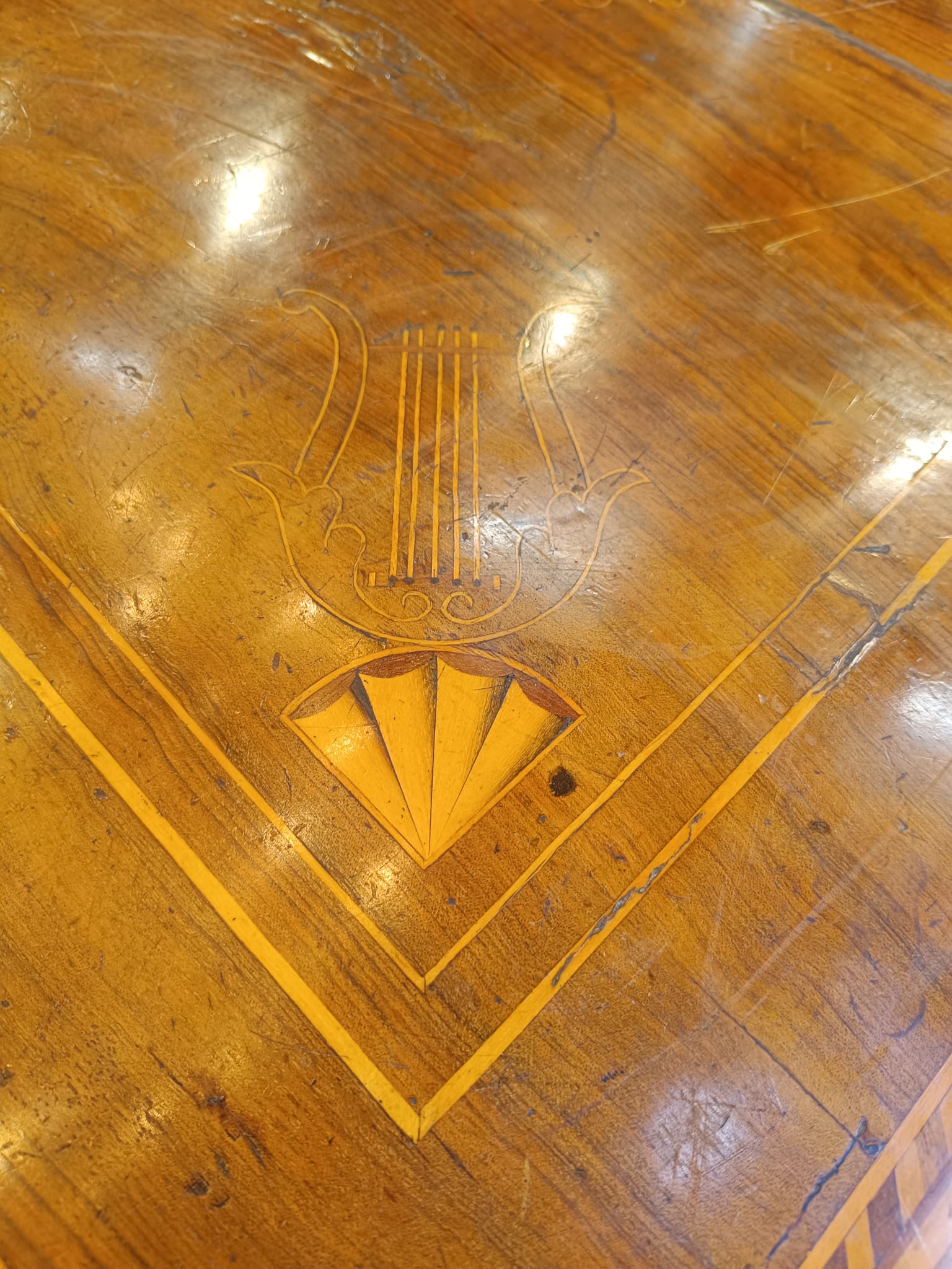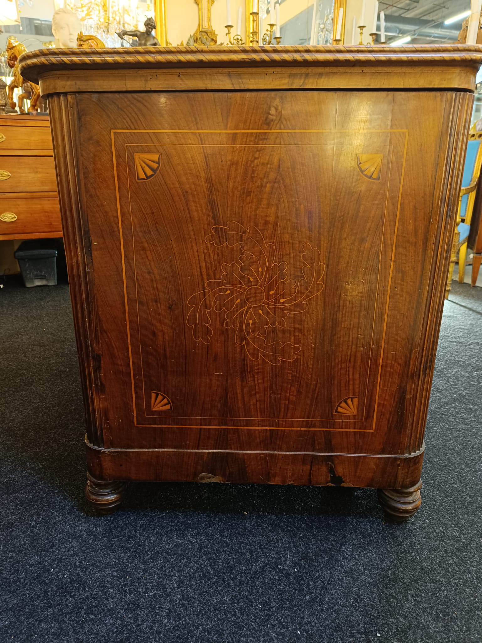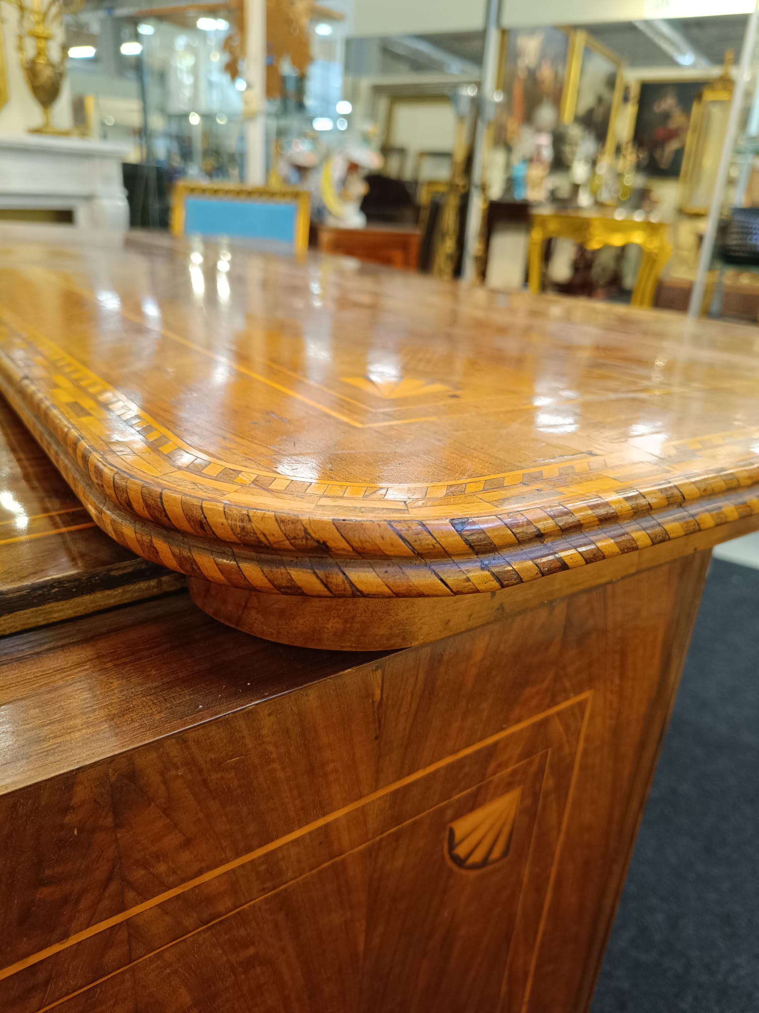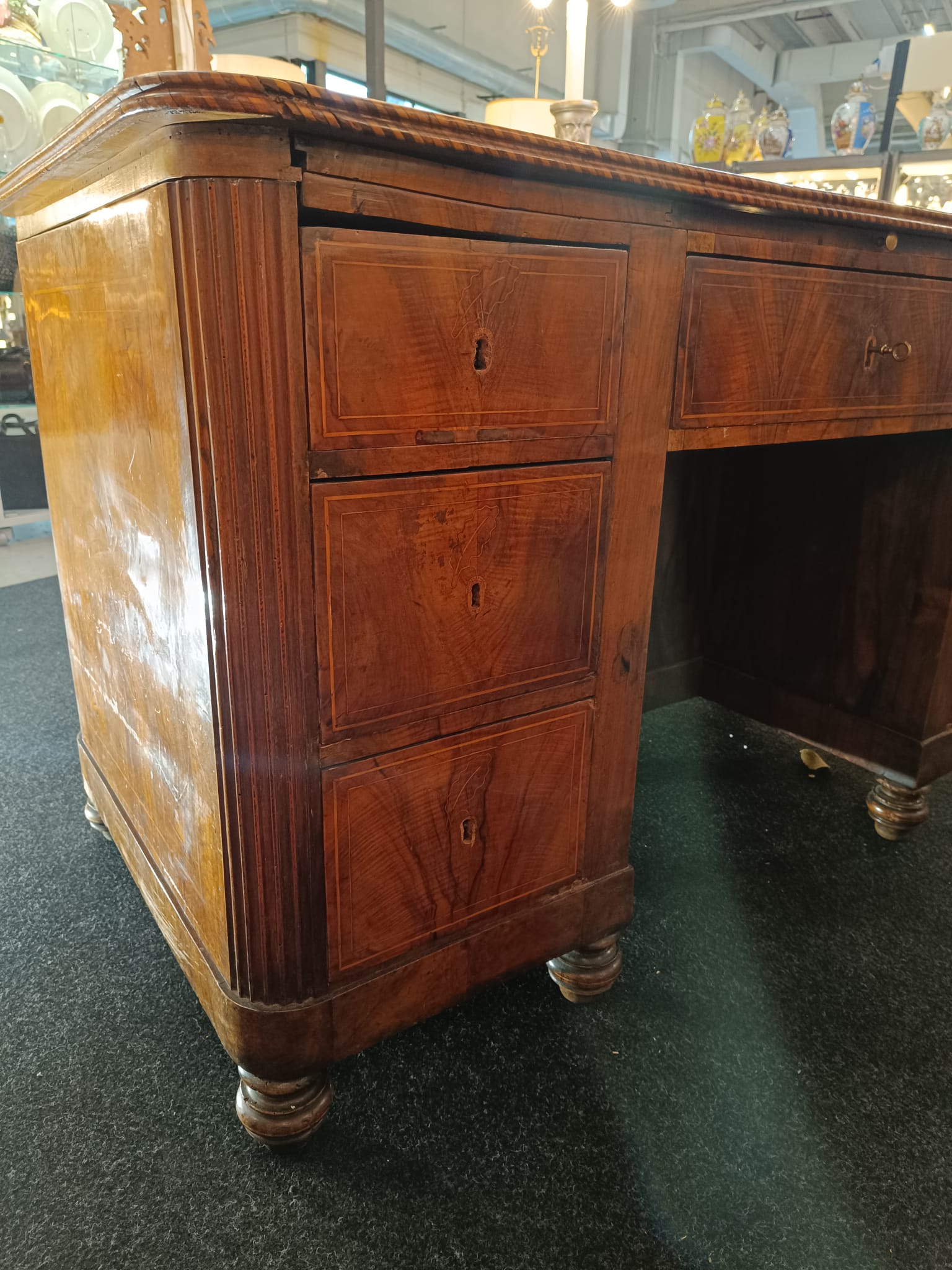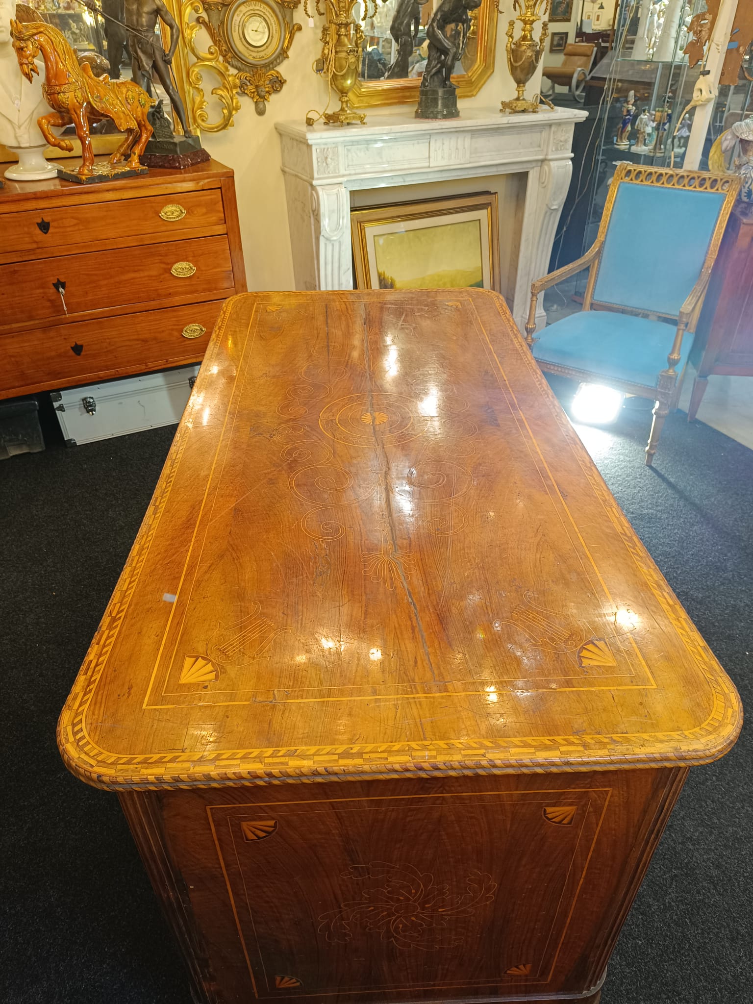 Importante e rara scrivania da centro di epoca Carlo X in massello di noce bionda filettata ed intarsiata su tutte le superfici. La particolarità di questo pezzo è il doppio piano scorrevole. La parte principale che può essere fatta scorrere sia in avanti che indietro più lo scrittoio piccolo centrale. Un’ulteriore particolarità è il fatto che sulla parte davanti presenta dei pannelli chiusi (tipo servante) mentre dall’altro lato presenta dei cassetti.