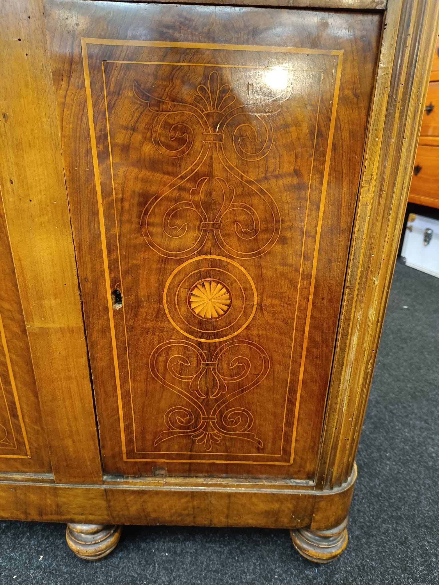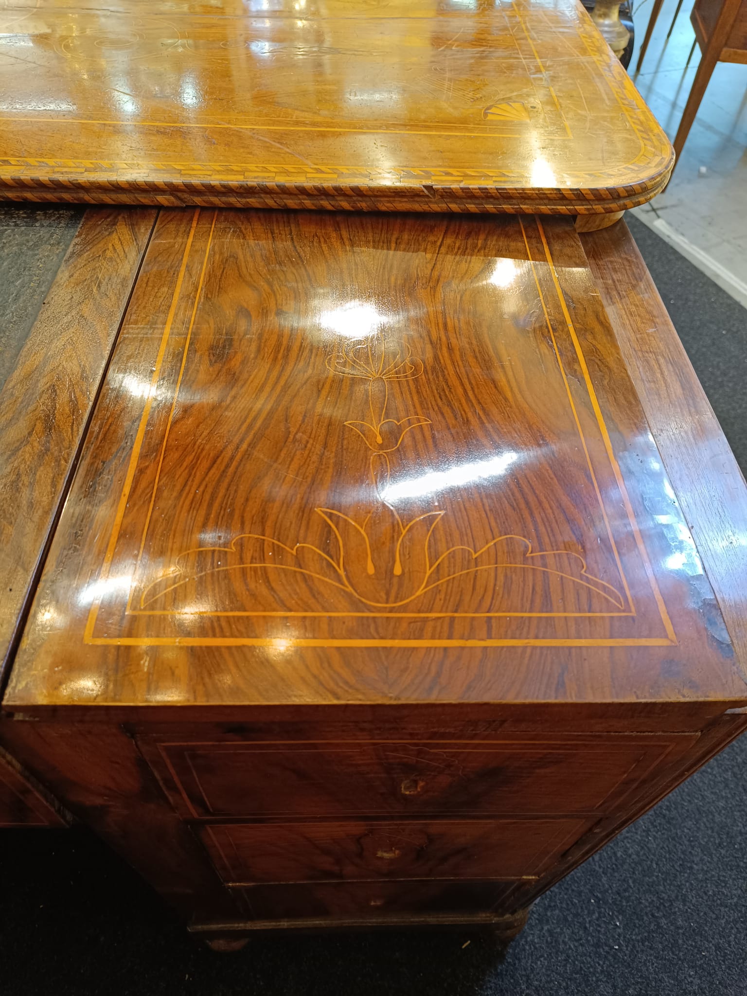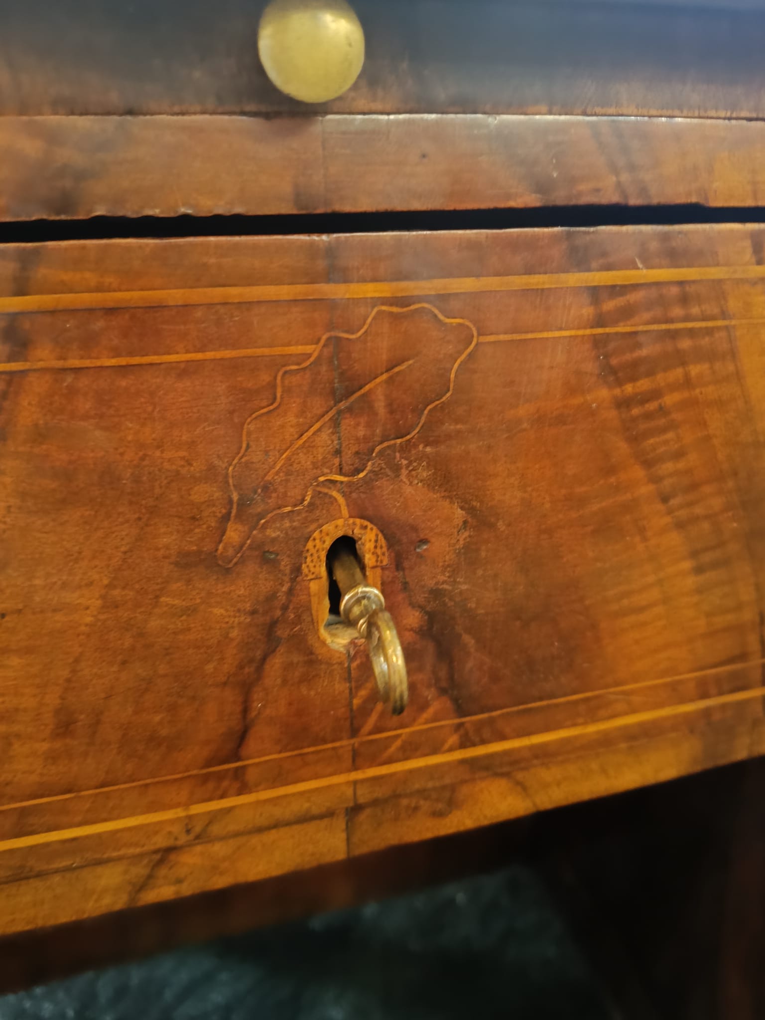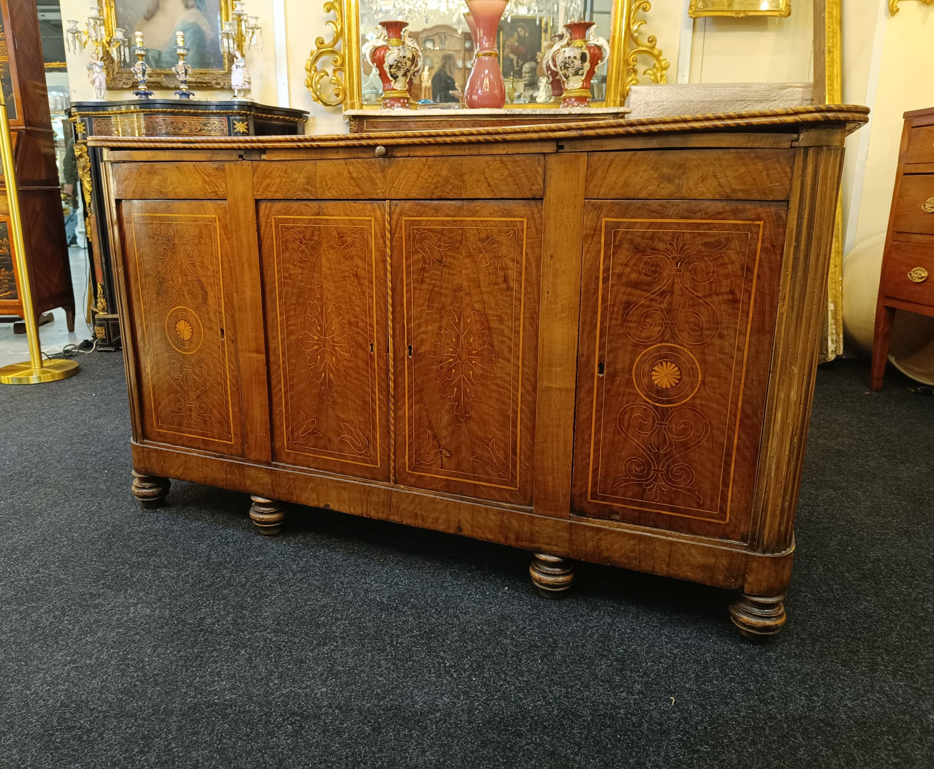 Importante e rara scrivania da centro di epoca Carlo X in massello di noce bionda filettata ed intarsiata su tutte le superfici. La particolarità di questo pezzo è il doppio piano scorrevole. La parte principale che può essere fatta scorrere sia in avanti che indietro più lo scrittoio piccolo centrale. Un’ulteriore particolarità è il fatto che sulla parte davanti presenta dei pannelli chiusi (tipo servante) mentre dall’altro lato presenta dei cassetti.