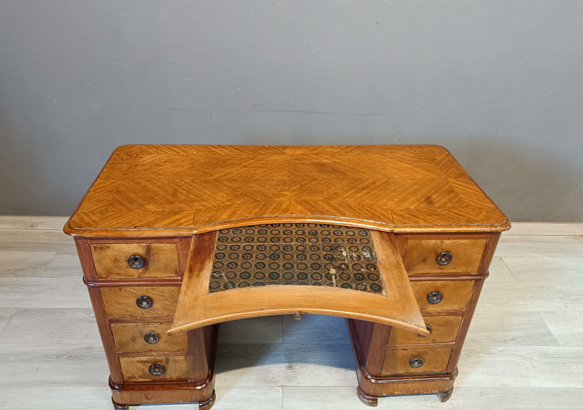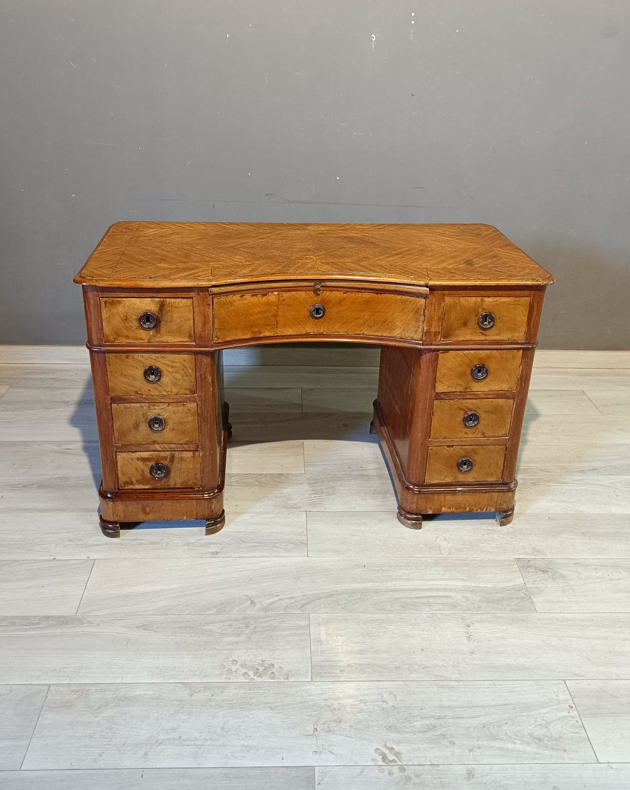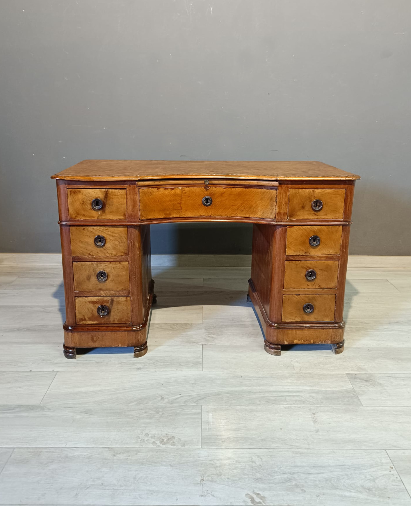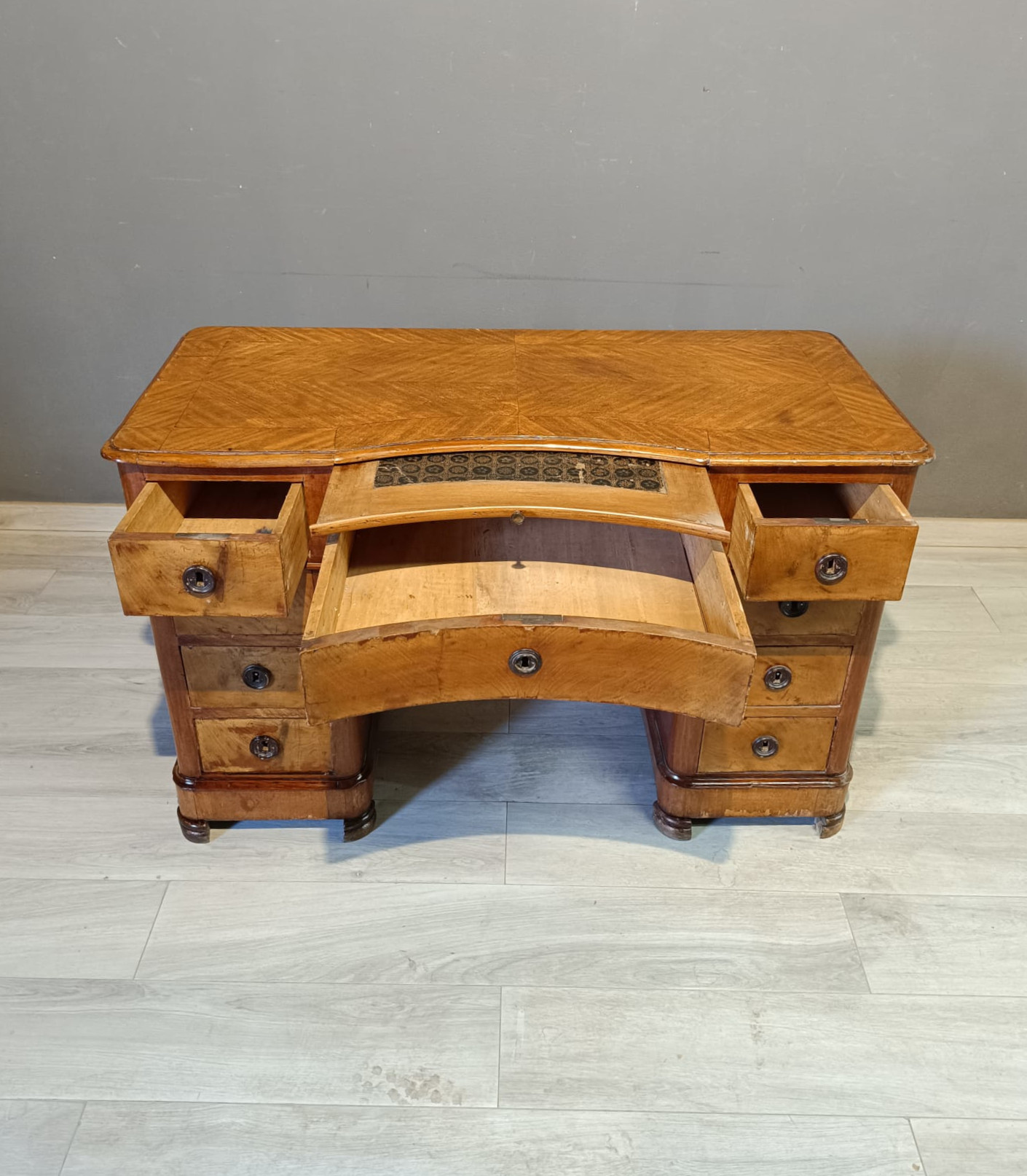 Antica scrivania da centro di epoca Luigi Filippo realizzata in massello di pioppo ed impiallacciata in piuma di mogano. Si presenta con quattro cassetto ambo i lati più quello centrale più ampio ed uno scrittoio scorrevole soprastante il cassetto centrale. La scrivania è completa di chiavi e serrature originali.