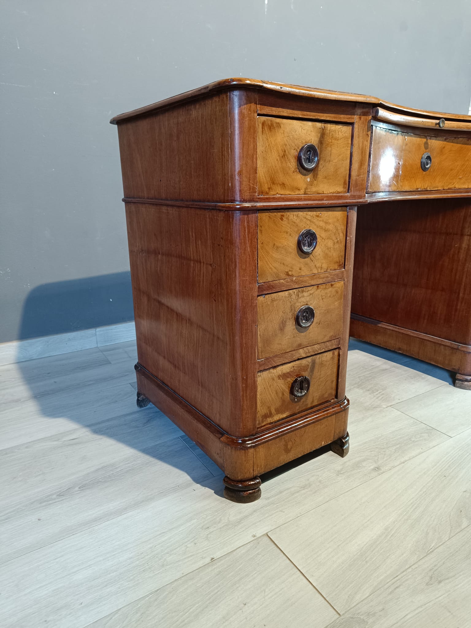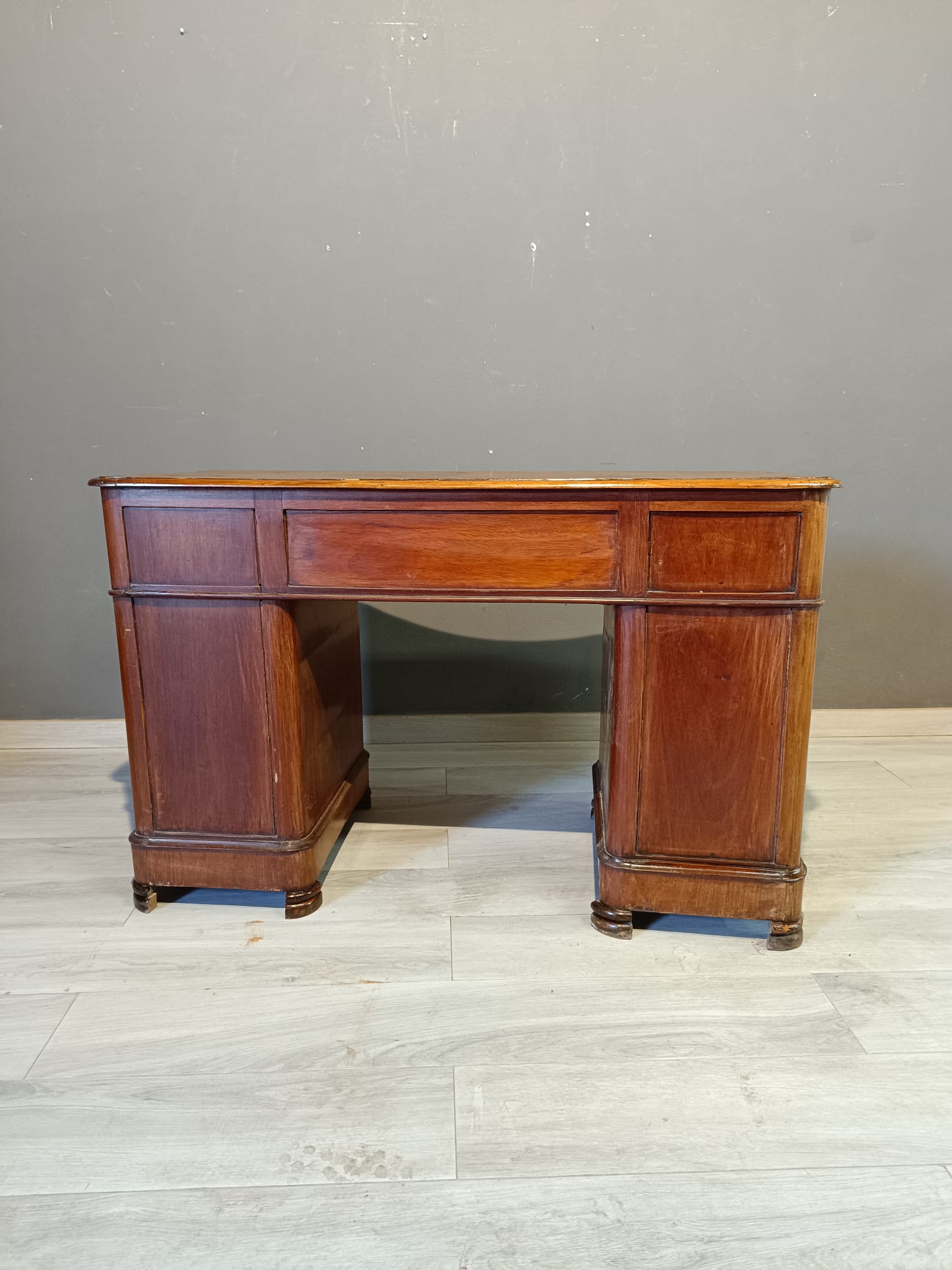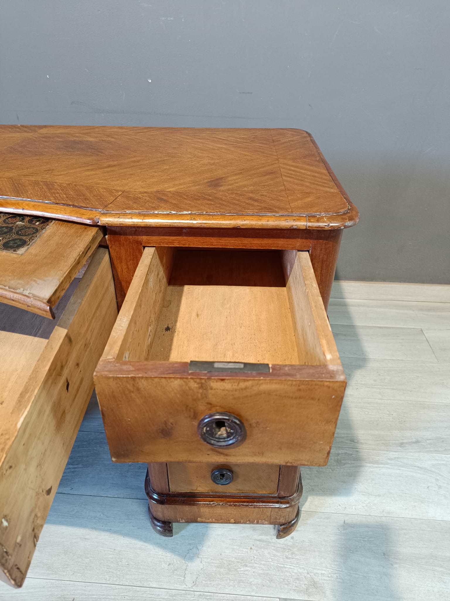 Antica scrivania da centro di epoca Luigi Filippo realizzata in massello di pioppo ed impiallacciata in piuma di mogano. Si presenta con quattro cassetto ambo i lati più quello centrale più ampio ed uno scrittoio scorrevole soprastante il cassetto centrale. La scrivania è completa di chiavi e serrature originali.