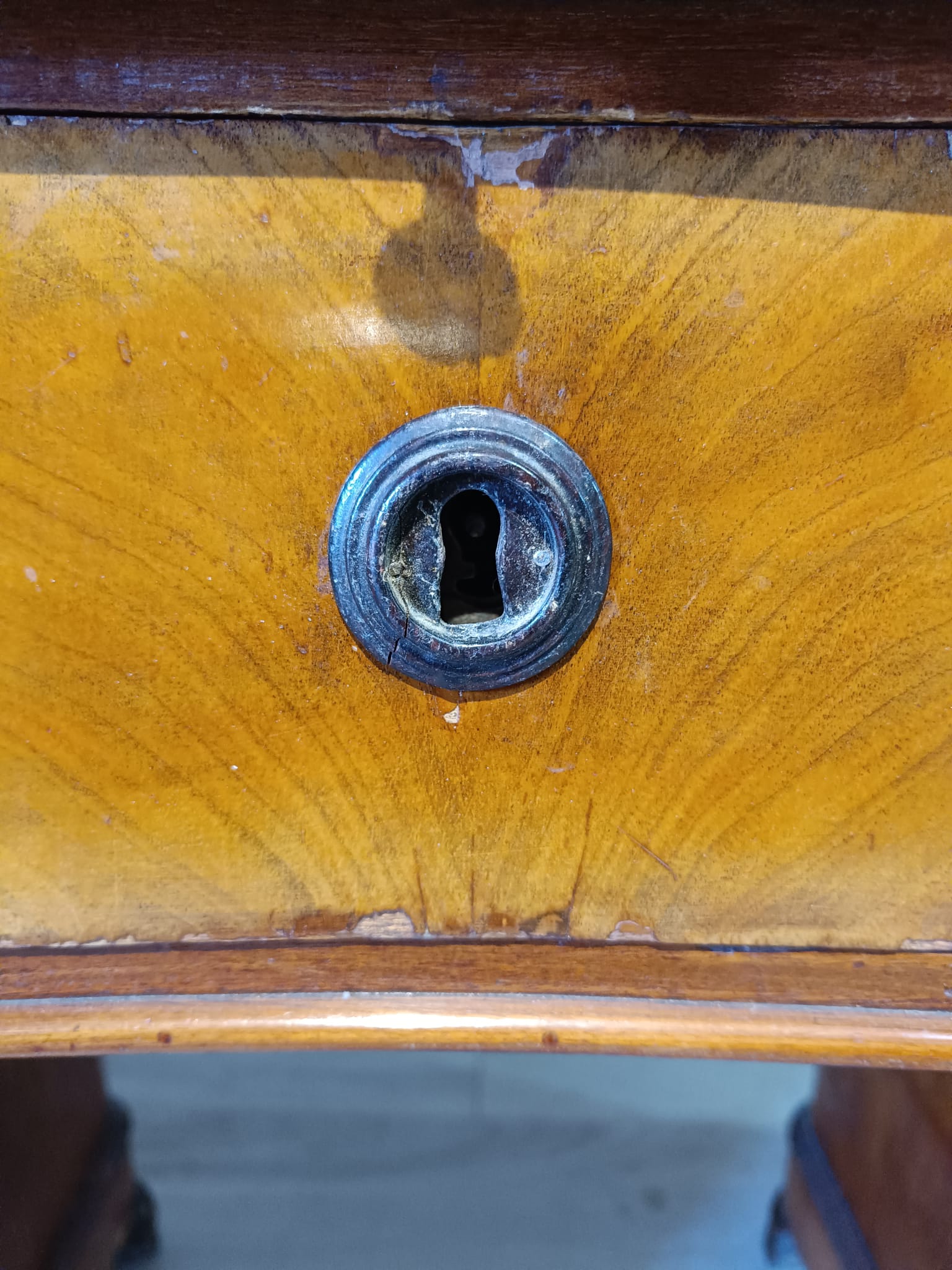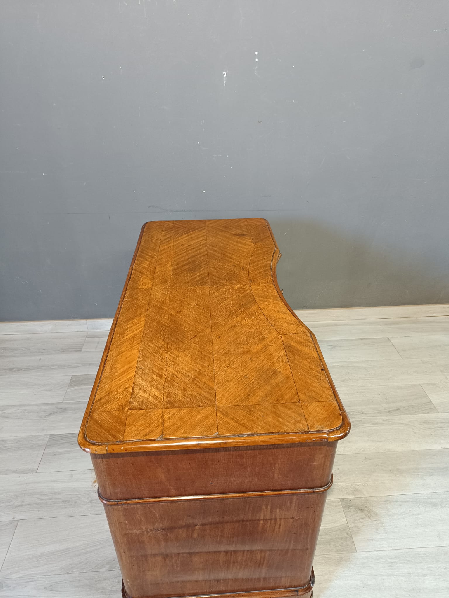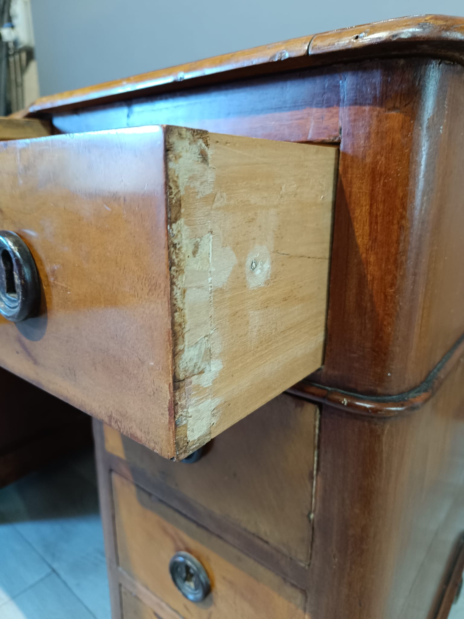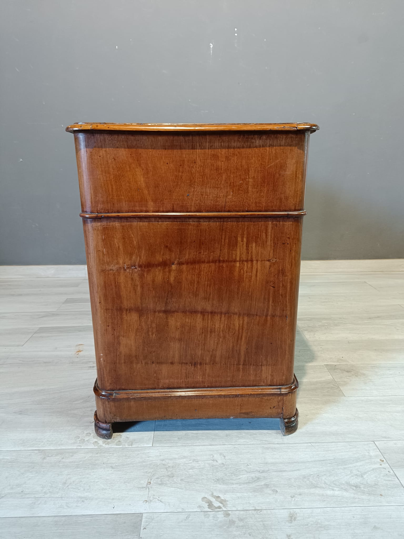 Antica scrivania da centro di epoca Luigi Filippo realizzata in massello di pioppo ed impiallacciata in piuma di mogano. Si presenta con quattro cassetto ambo i lati più quello centrale più ampio ed uno scrittoio scorrevole soprastante il cassetto centrale. La scrivania è completa di chiavi e serrature originali.