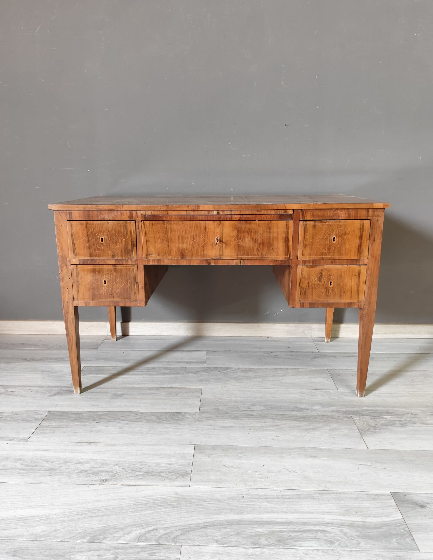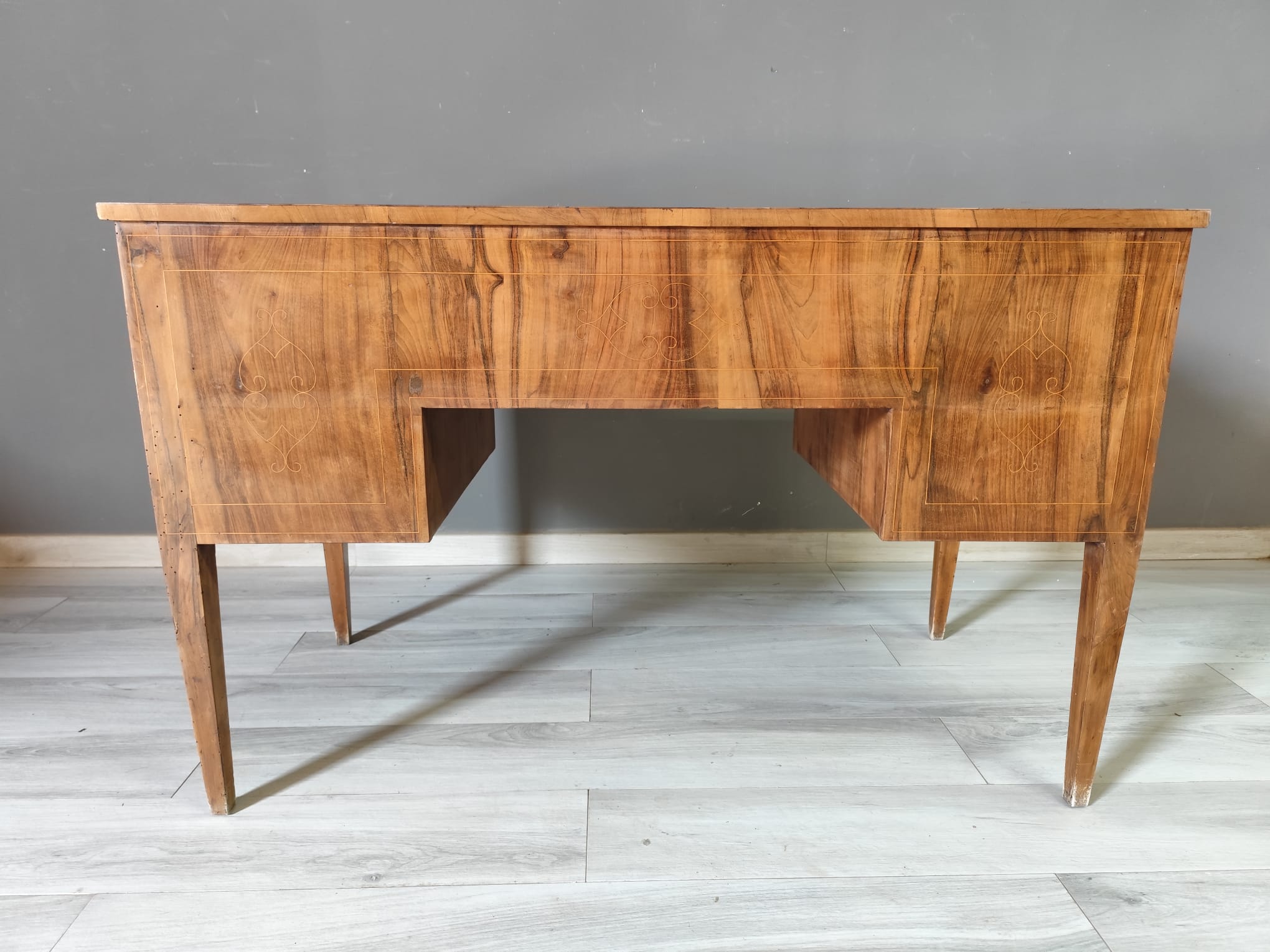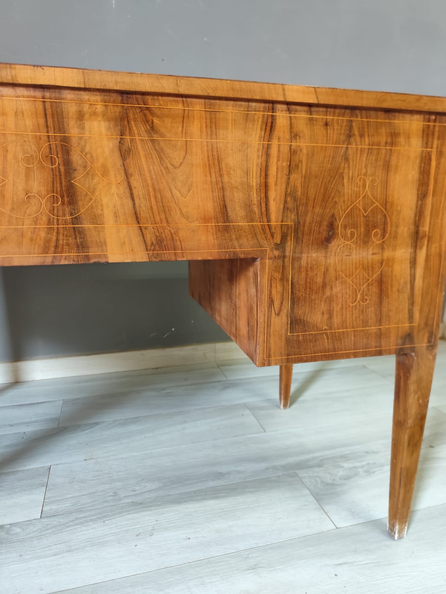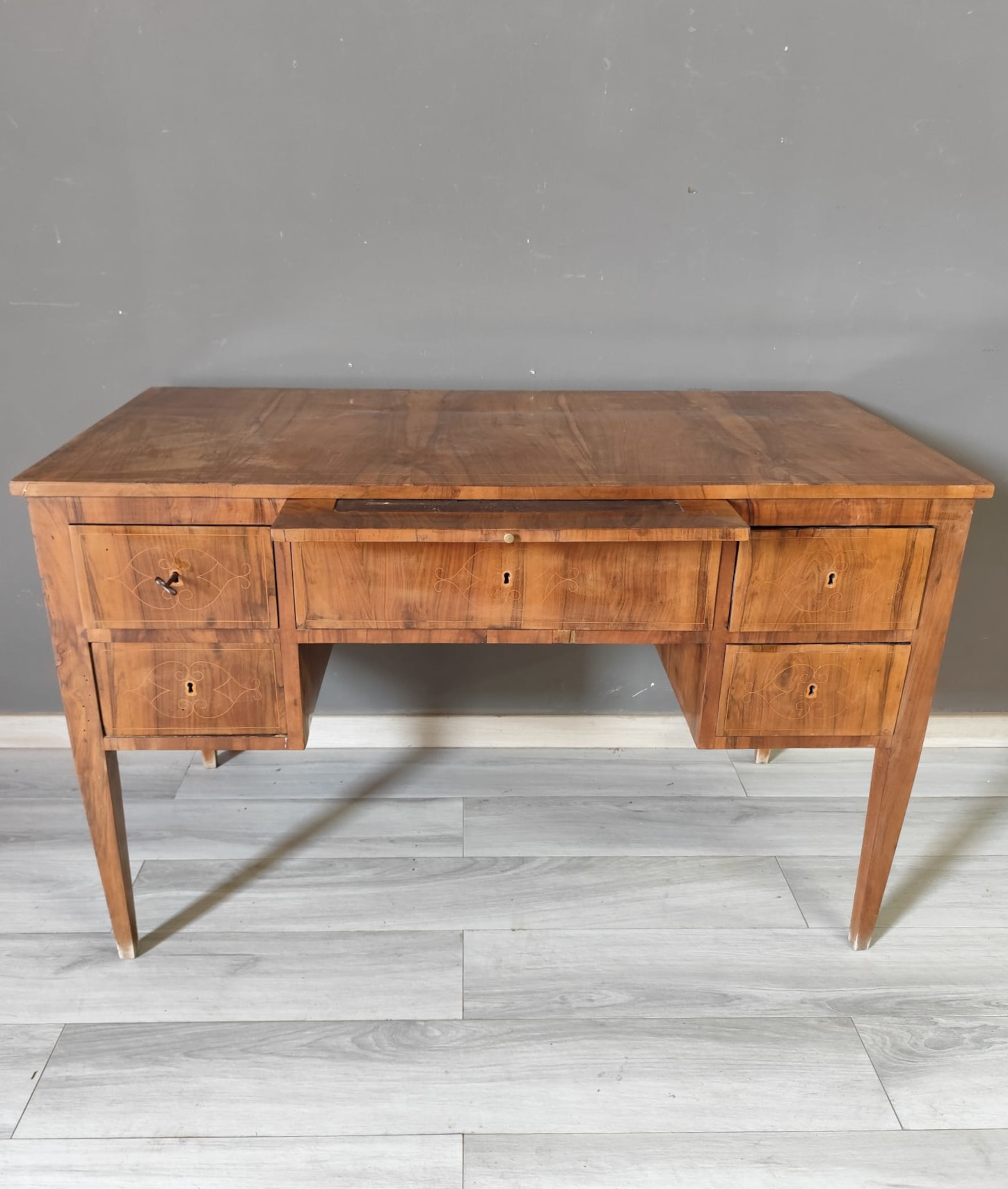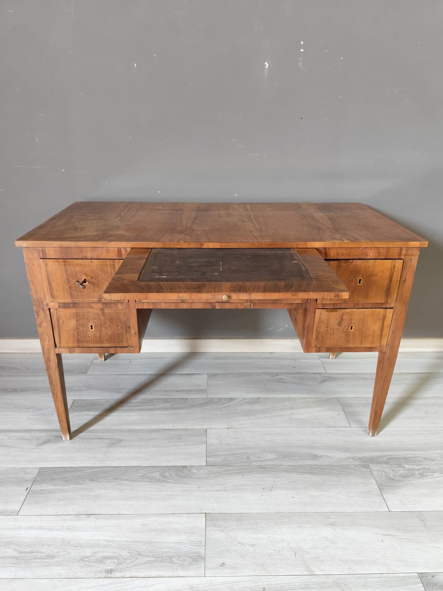 Antica ed elegante scrivania da centro di epoca Luigi XVI a cinque cassetti. Finemente lastronata in noce con delicati intarsi in acero su tutte le superfici. Sul fronte troviamo cinque cassetti di cui uno centrale più grande con piano scorrevole sovrastante. I cassetti presentano dei segreti realizzati con doppi schienali. Conservata in buono stato.
