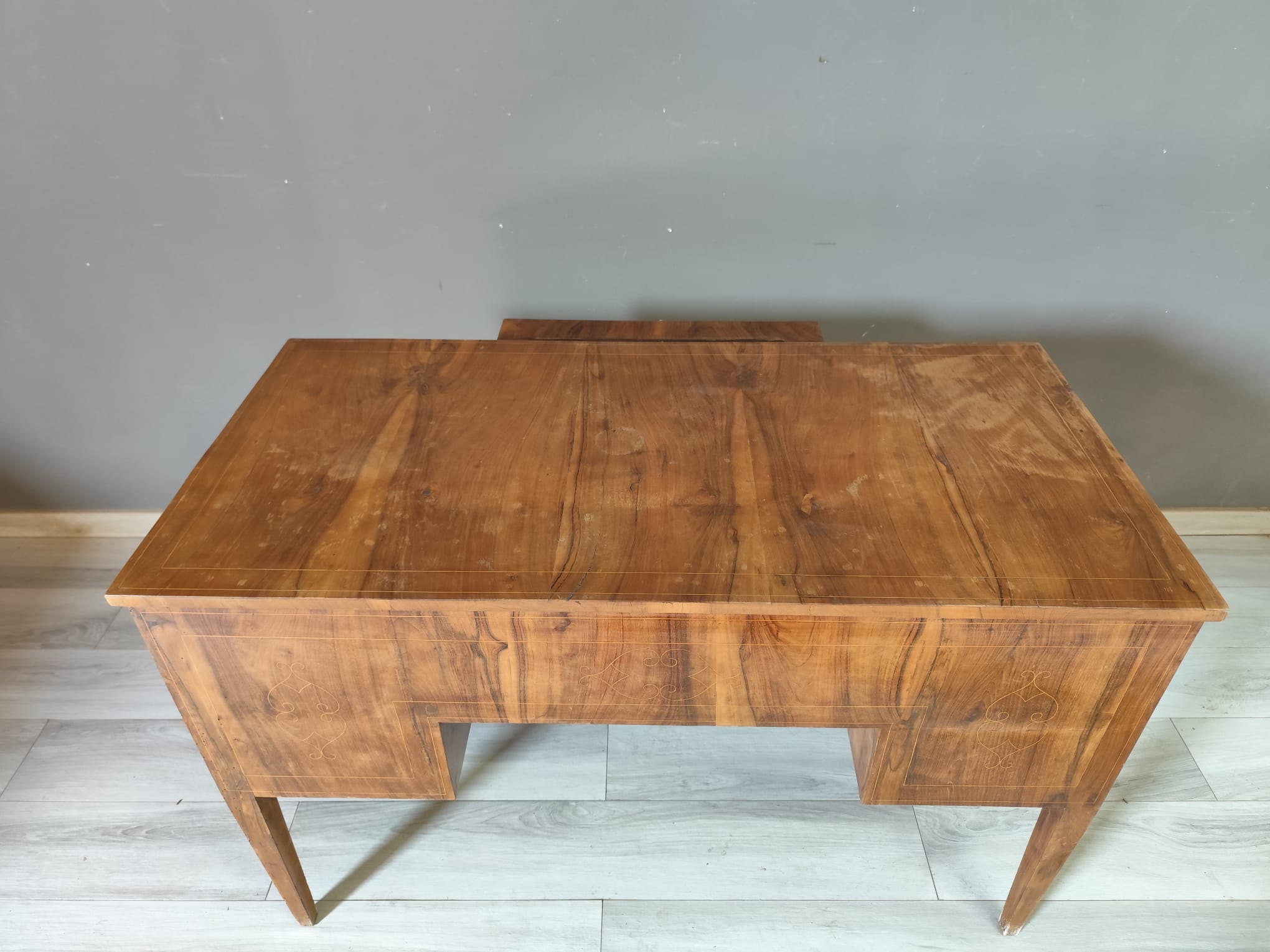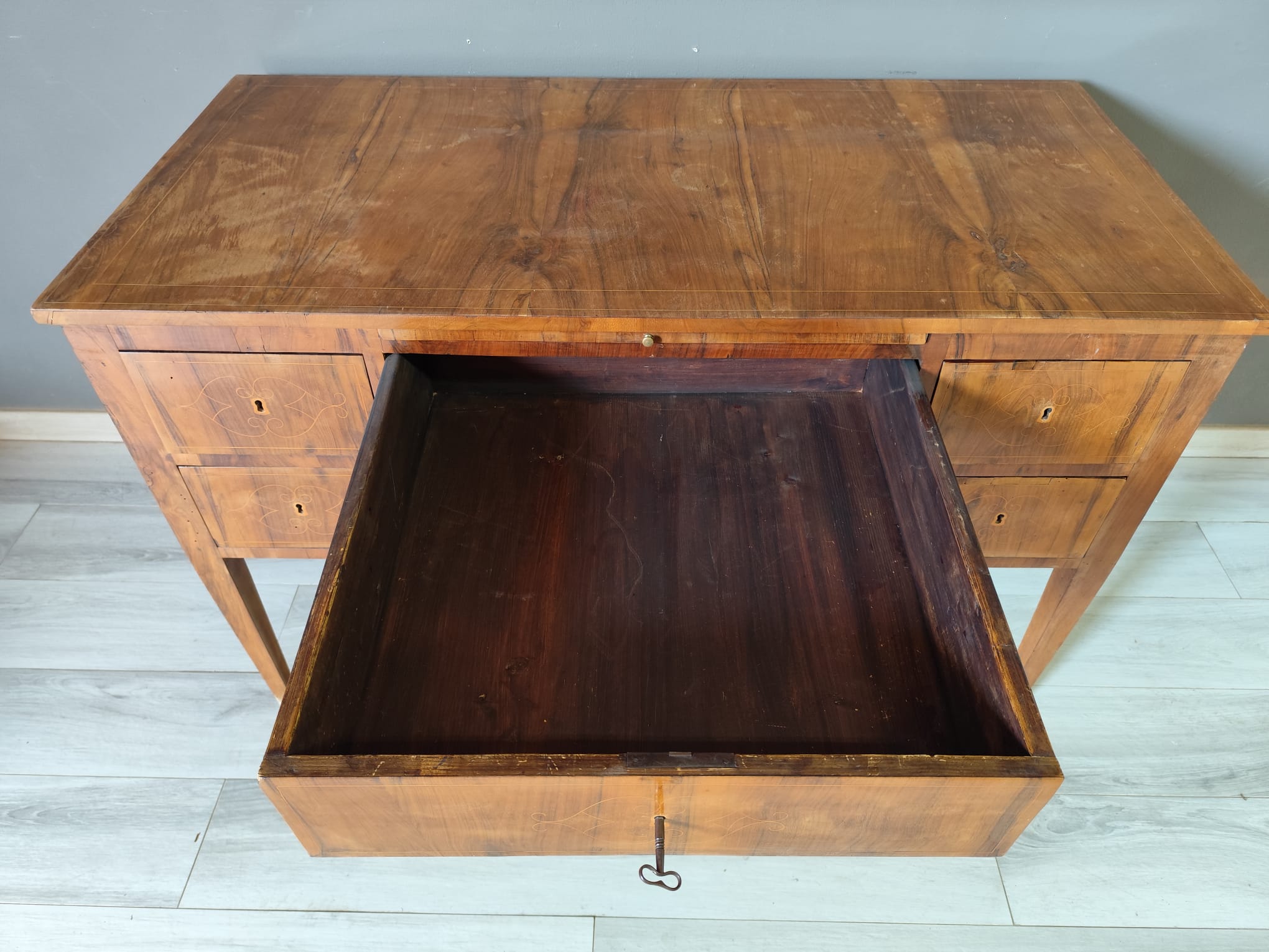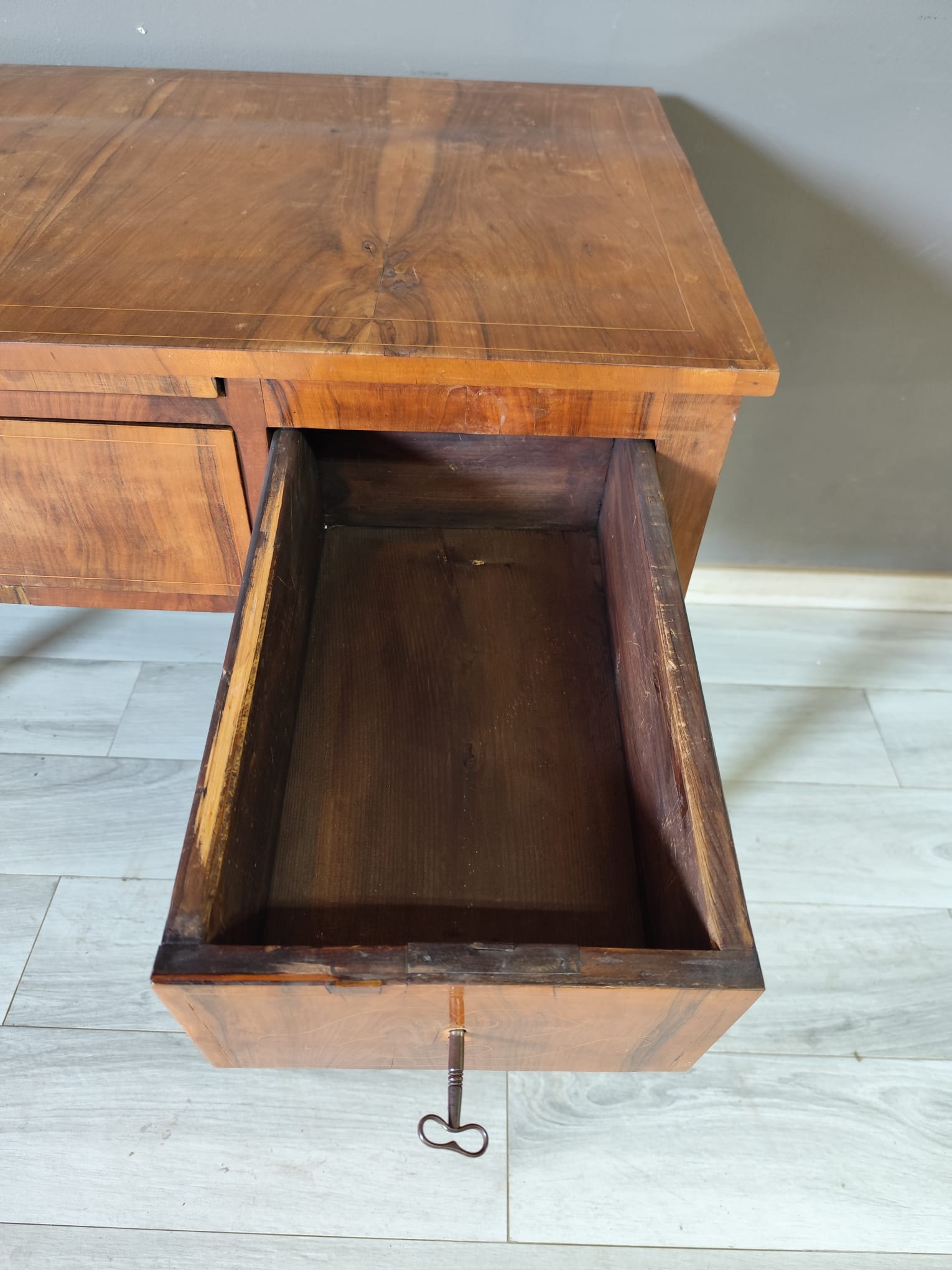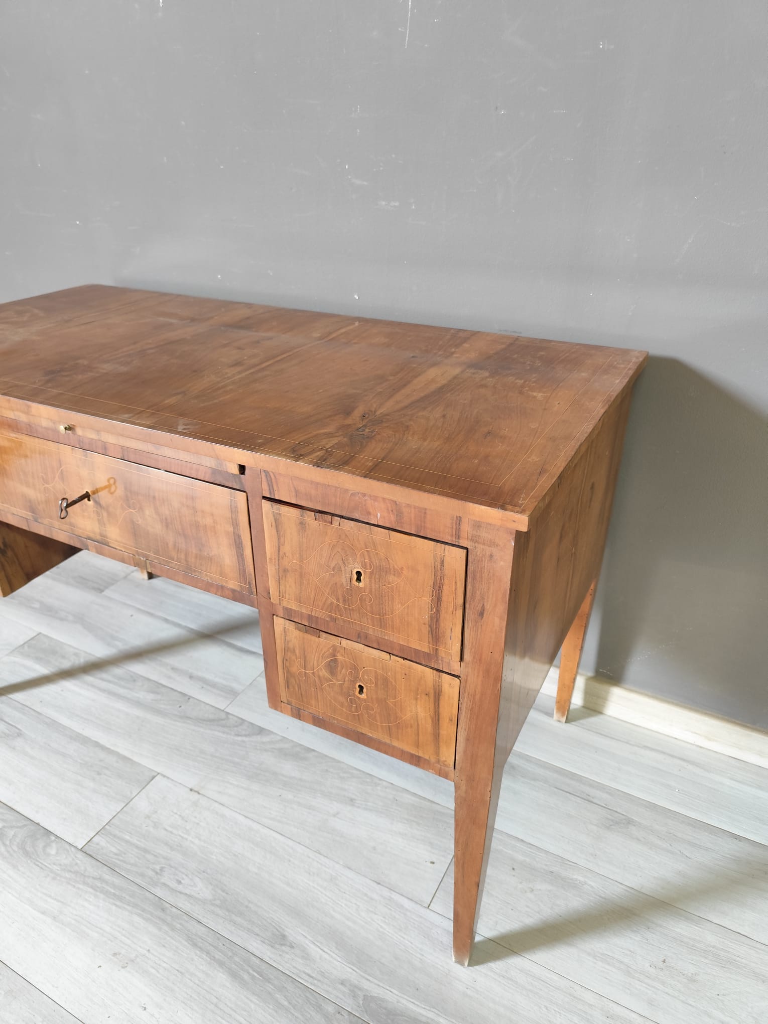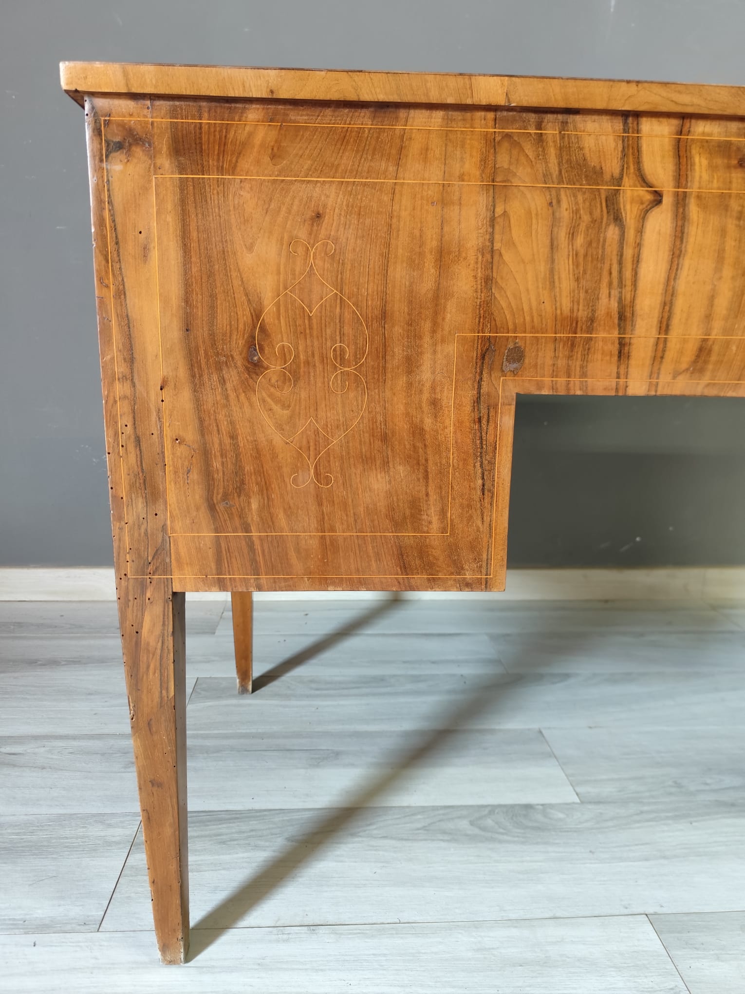 Antica ed elegante scrivania da centro di epoca Luigi XVI a cinque cassetti. Finemente lastronata in noce con delicati intarsi in acero su tutte le superfici. Sul fronte troviamo cinque cassetti di cui uno centrale più grande con piano scorrevole sovrastante. I cassetti presentano dei segreti realizzati con doppi schienali. Conservata in buono stato.
