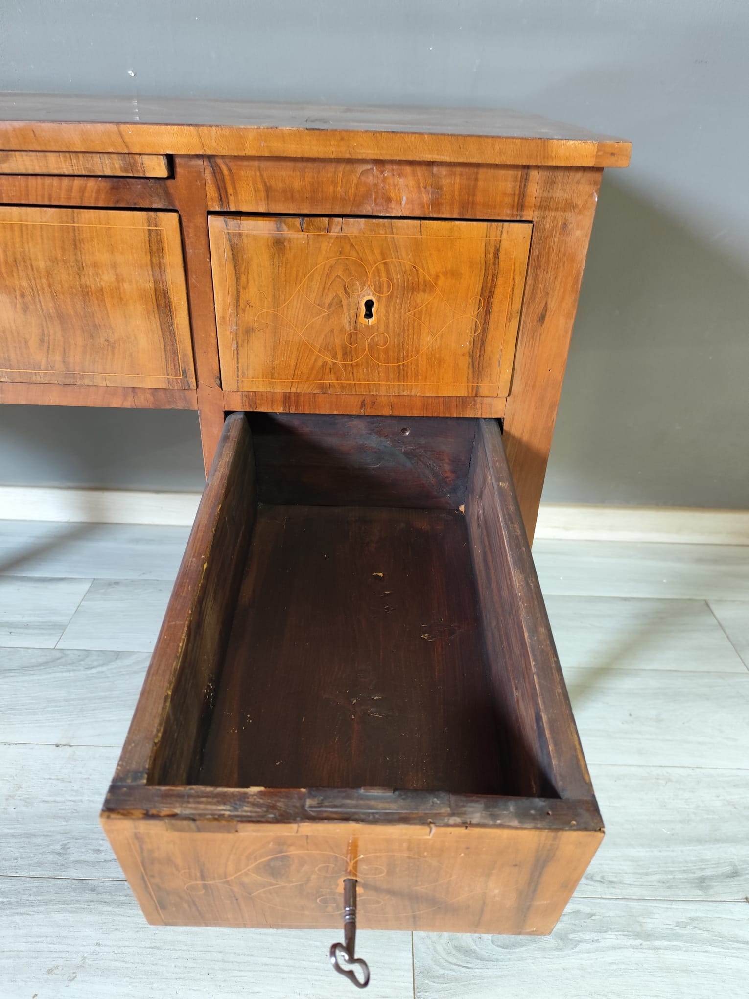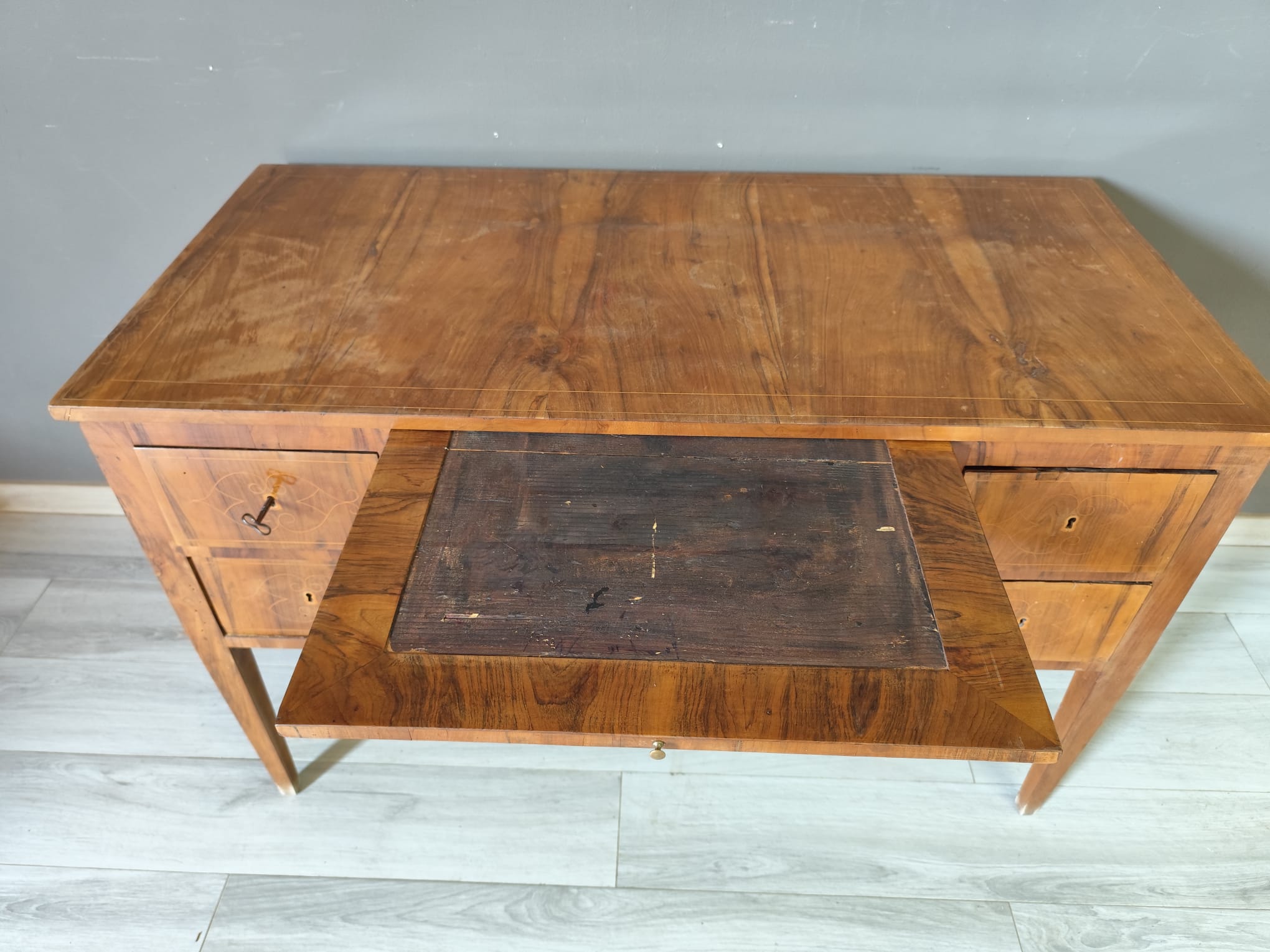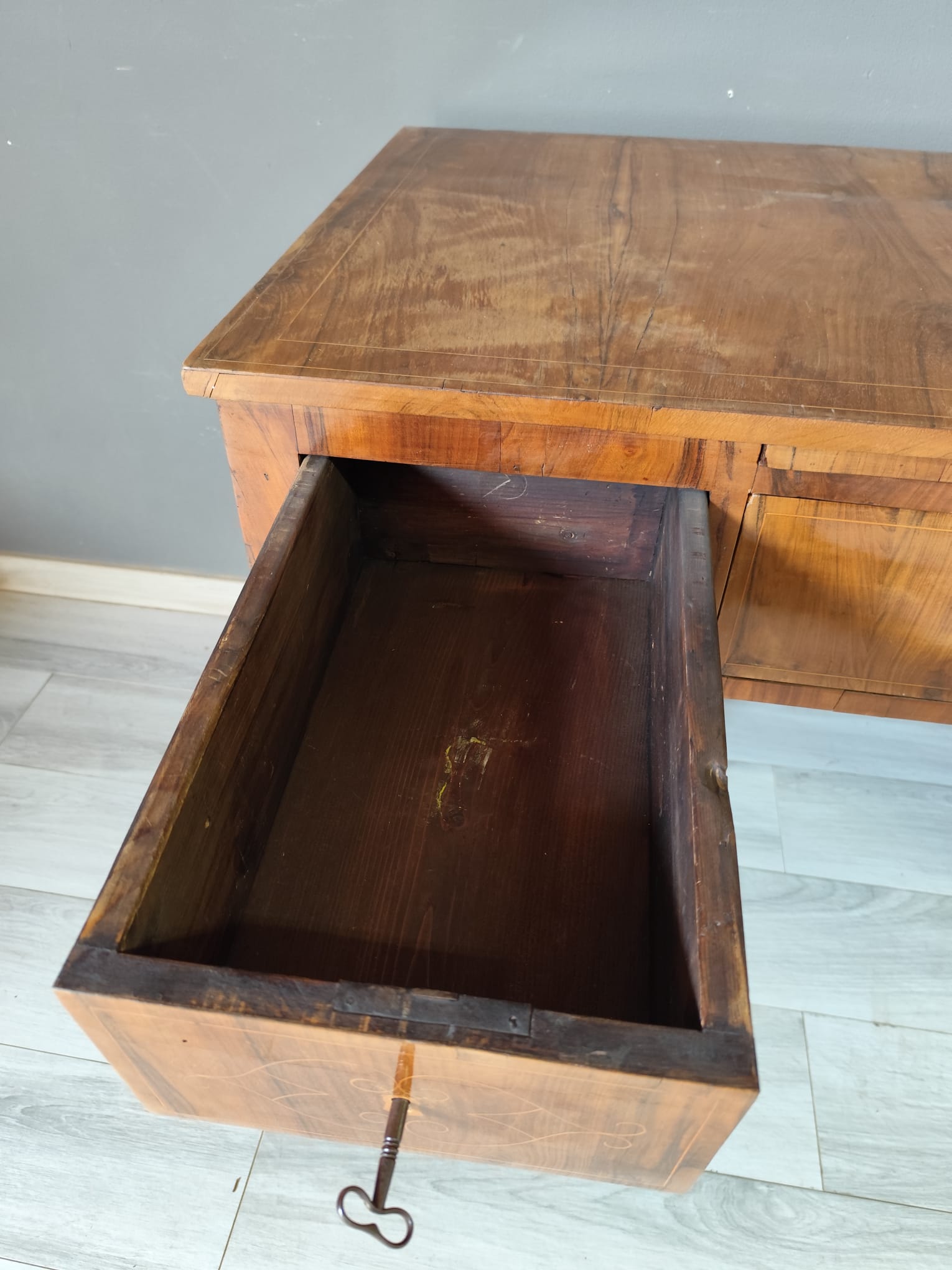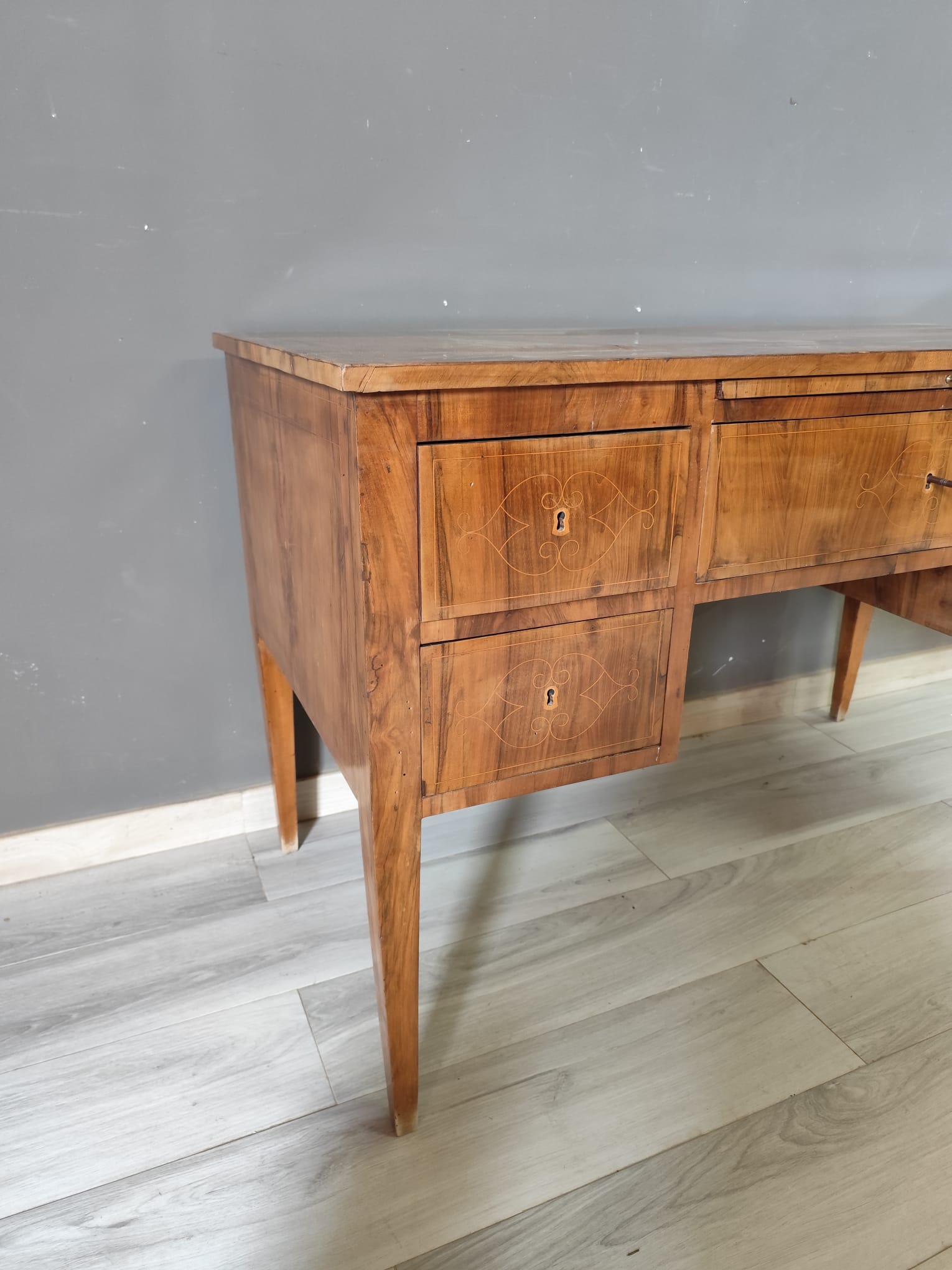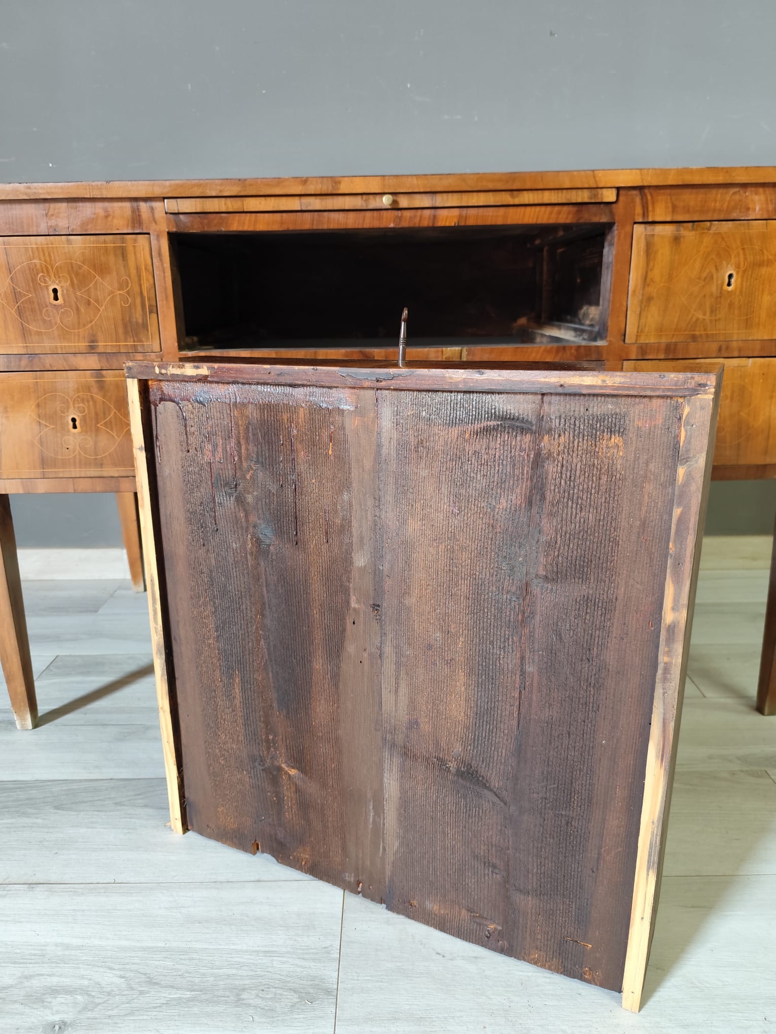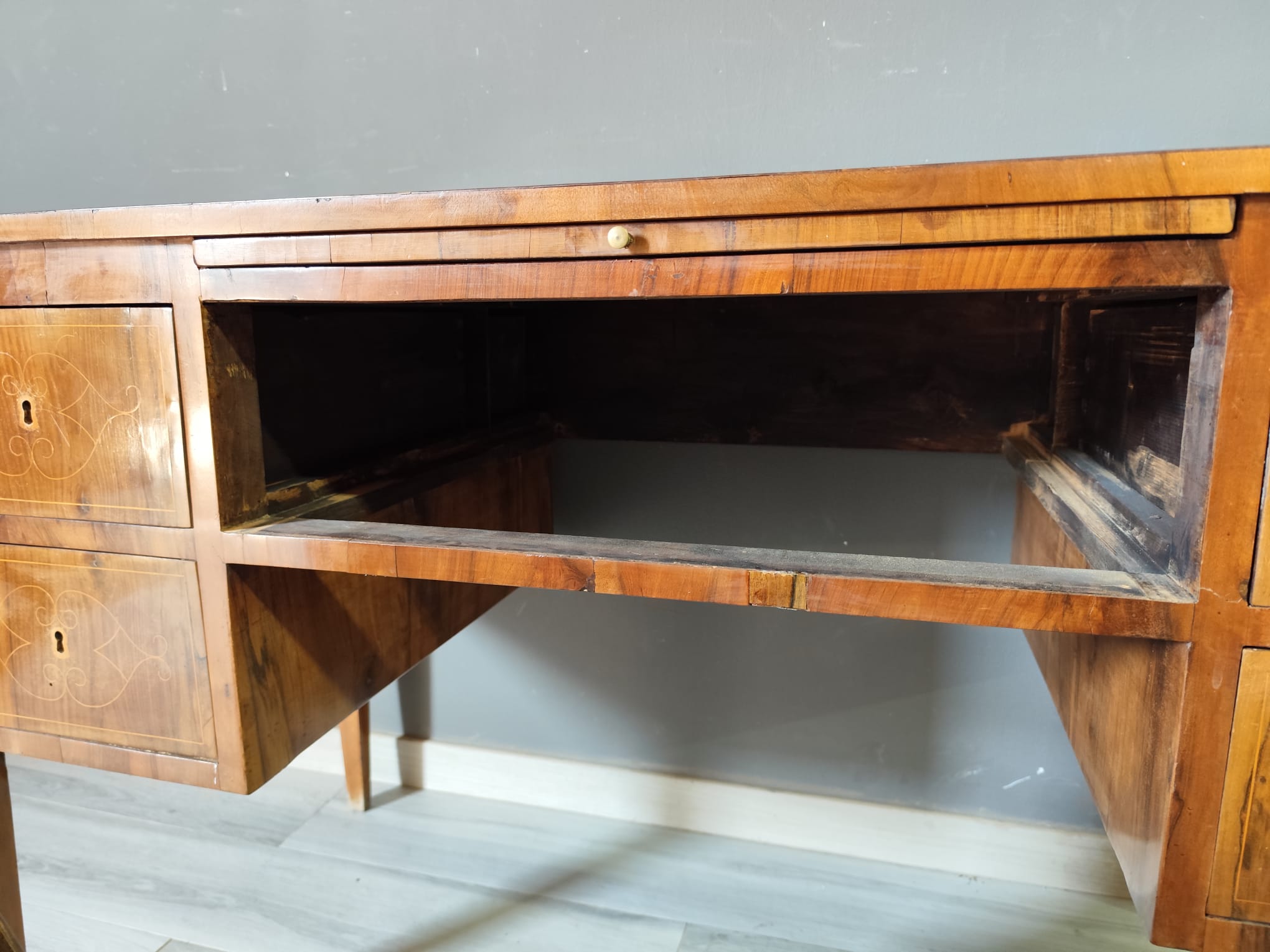 Antica ed elegante scrivania da centro di epoca Luigi XVI a cinque cassetti. Finemente lastronata in noce con delicati intarsi in acero su tutte le superfici. Sul fronte troviamo cinque cassetti di cui uno centrale più grande con piano scorrevole sovrastante. I cassetti presentano dei segreti realizzati con doppi schienali. Conservata in buono stato.