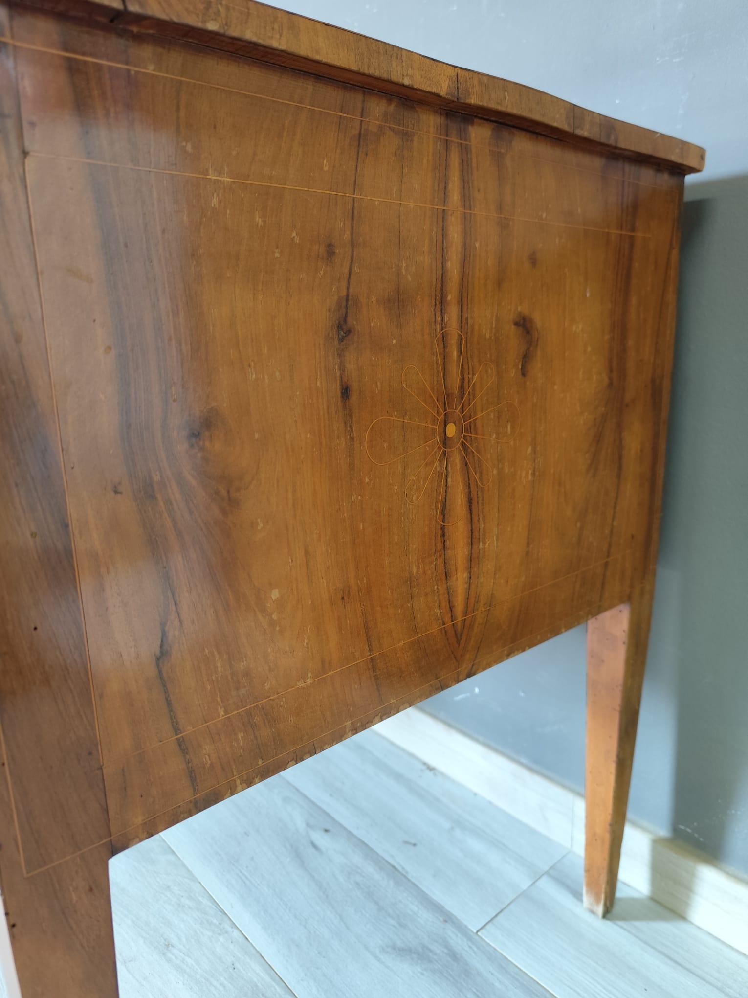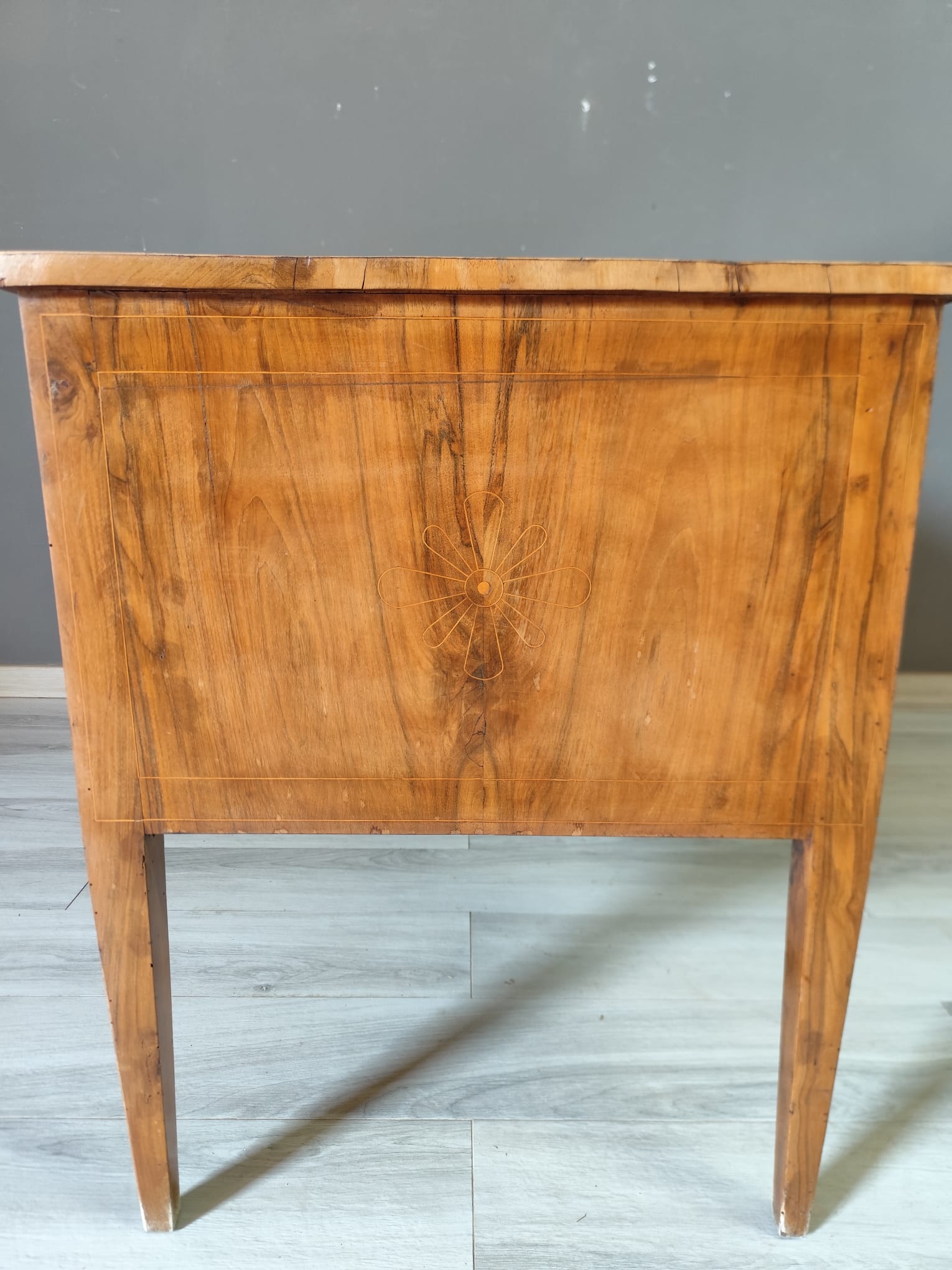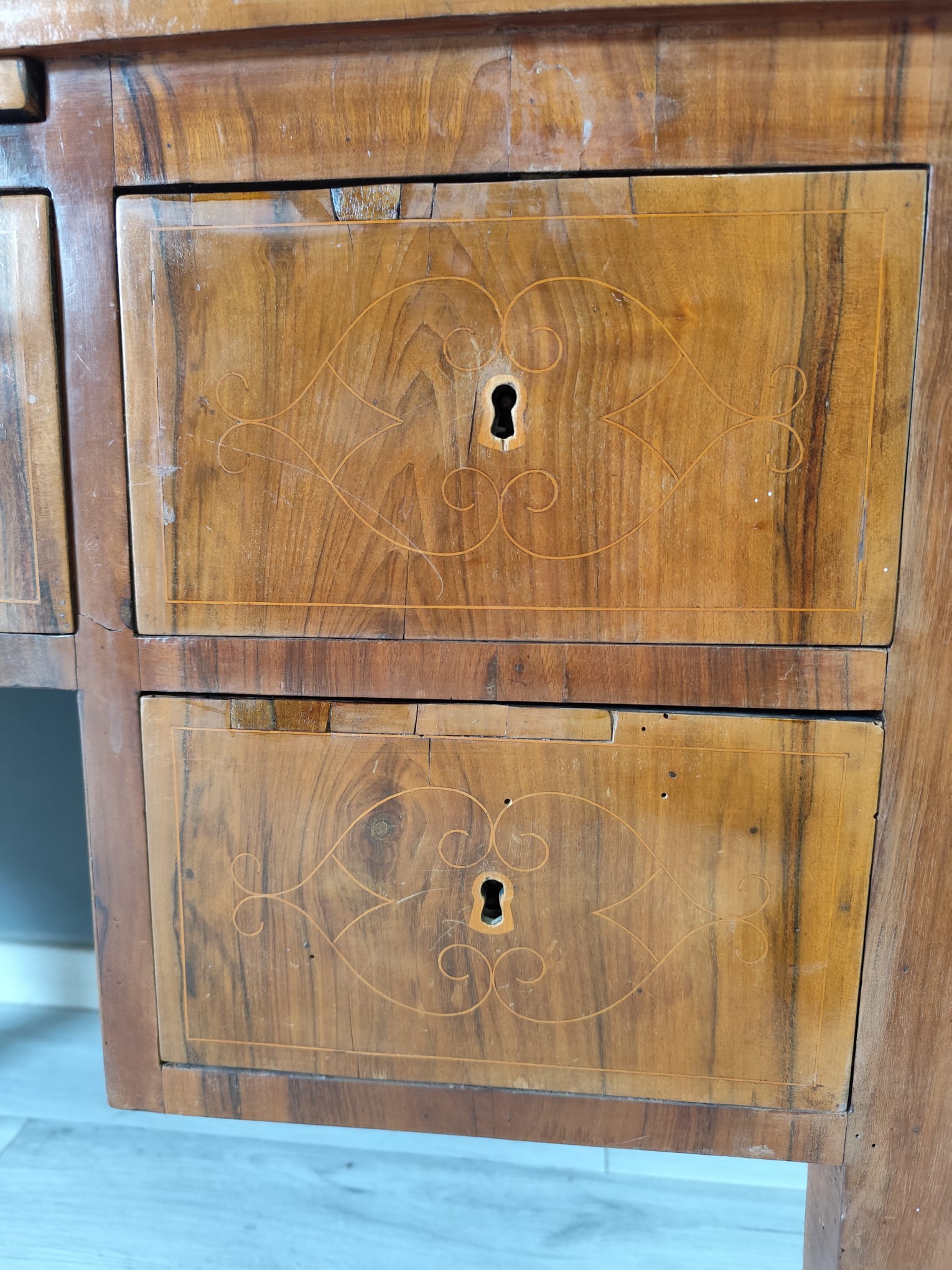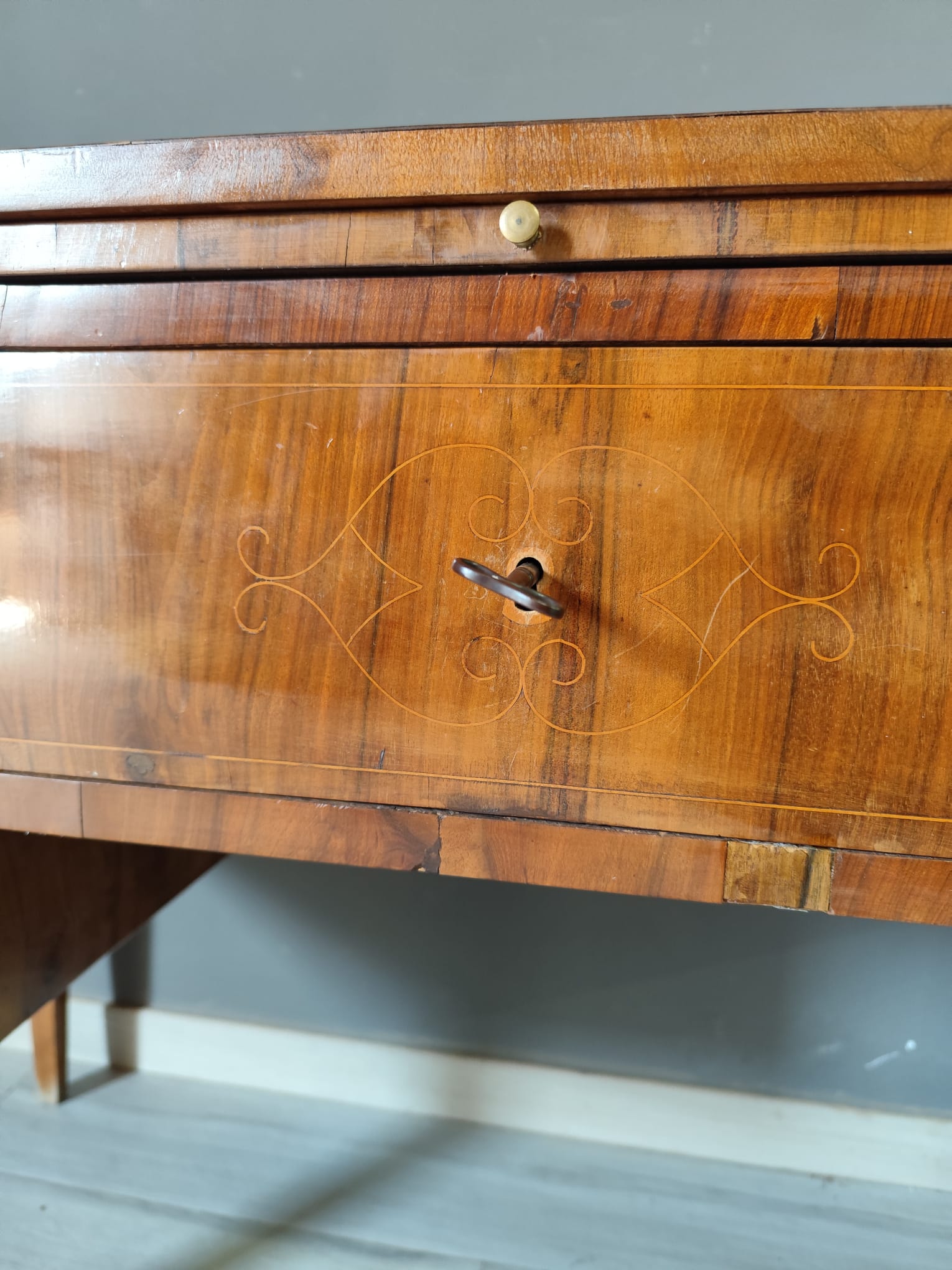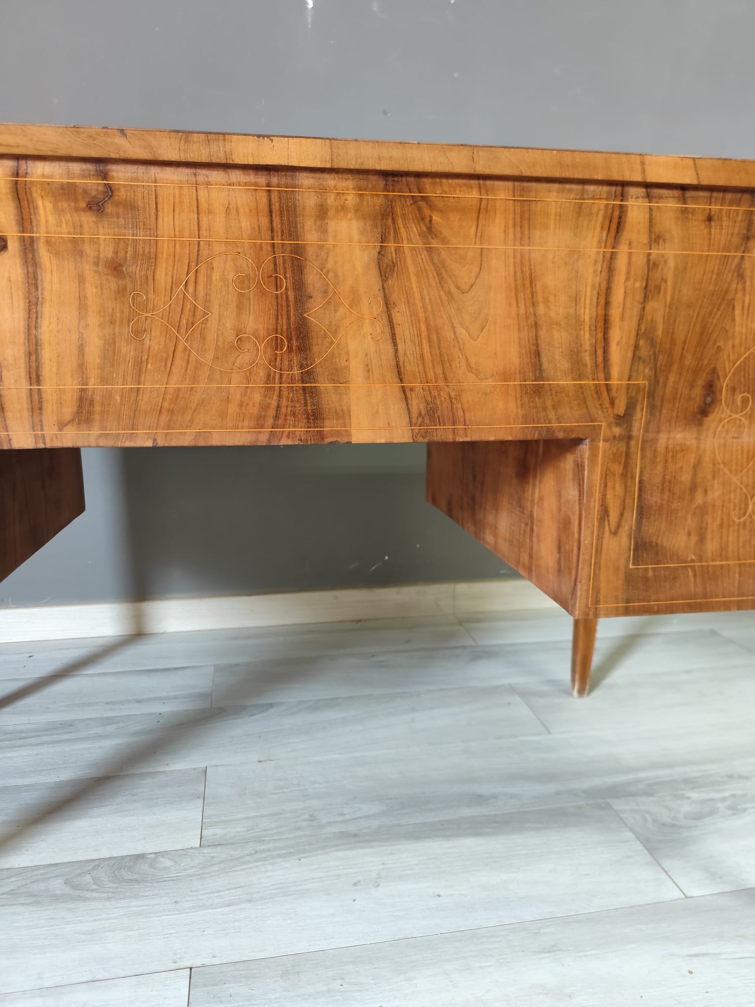 Antica ed elegante scrivania da centro di epoca Luigi XVI a cinque cassetti. Finemente lastronata in noce con delicati intarsi in acero su tutte le superfici. Sul fronte troviamo cinque cassetti di cui uno centrale più grande con piano scorrevole sovrastante. I cassetti presentano dei segreti realizzati con doppi schienali. Conservata in buono stato.