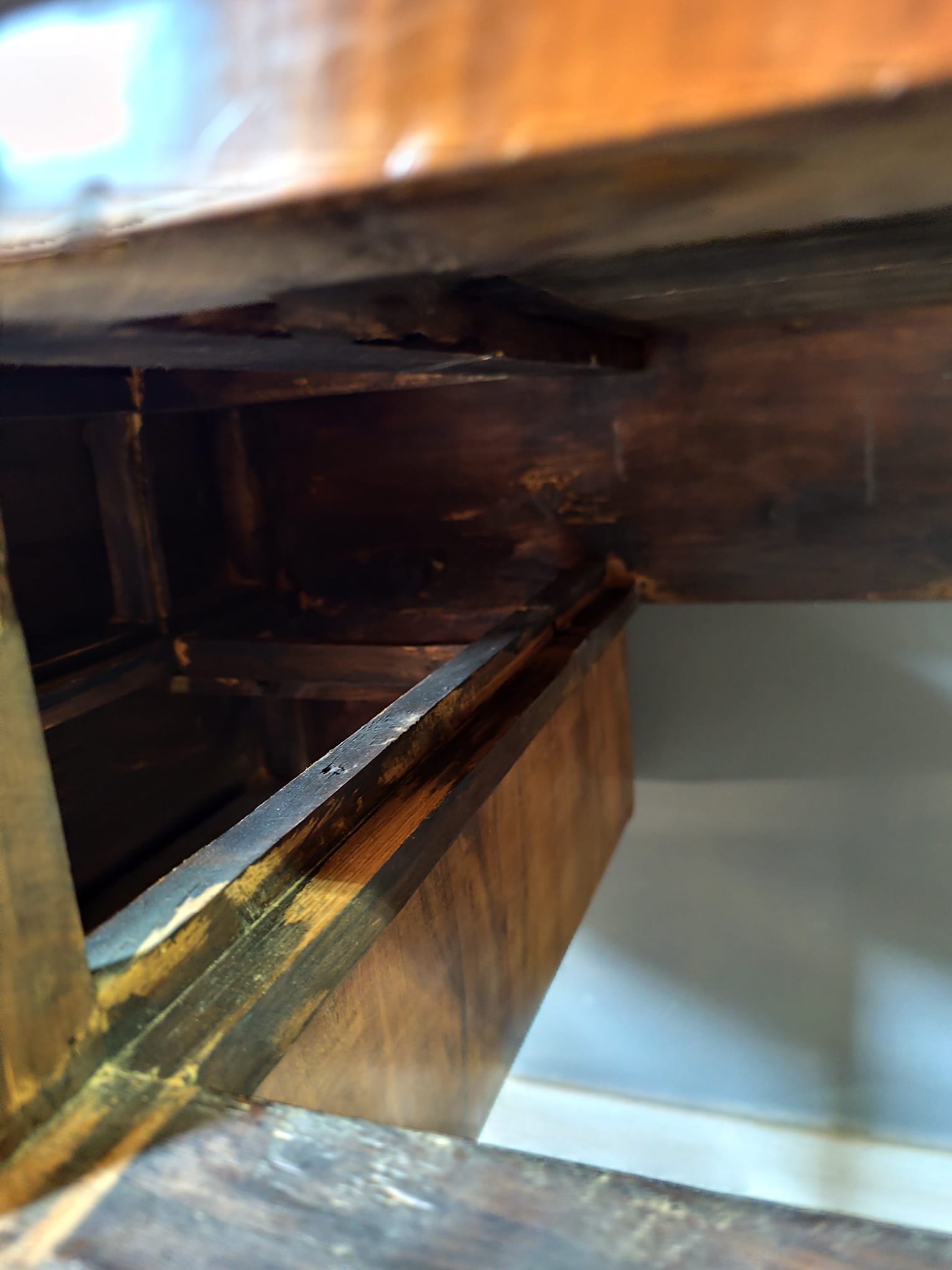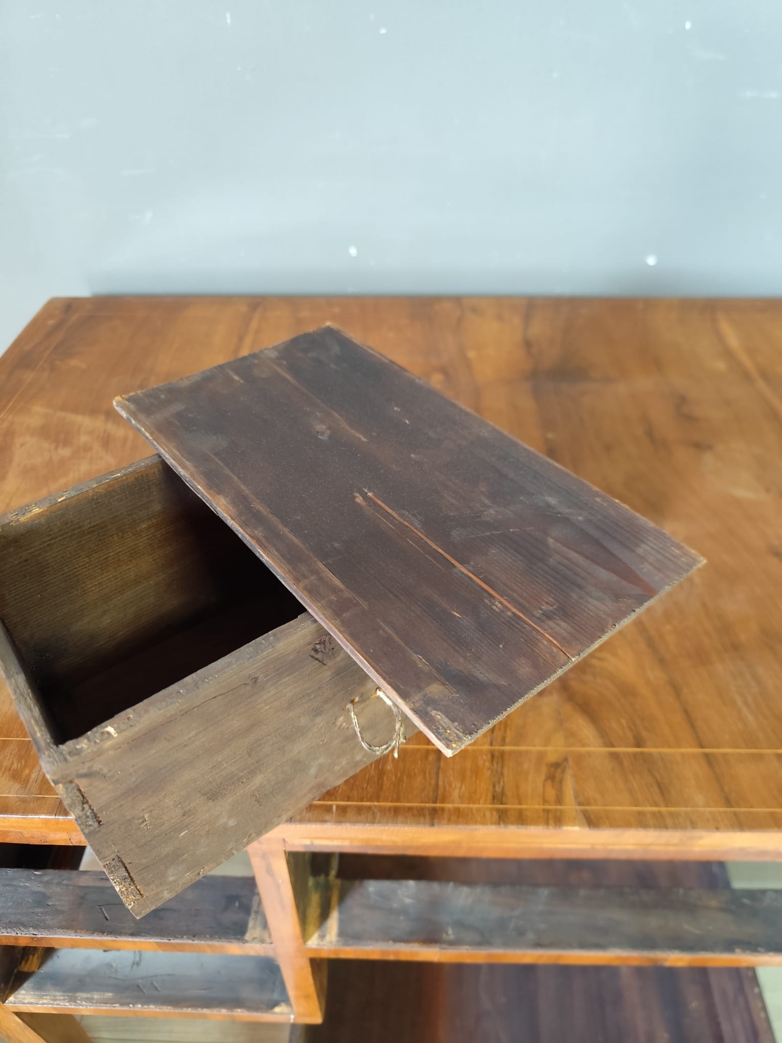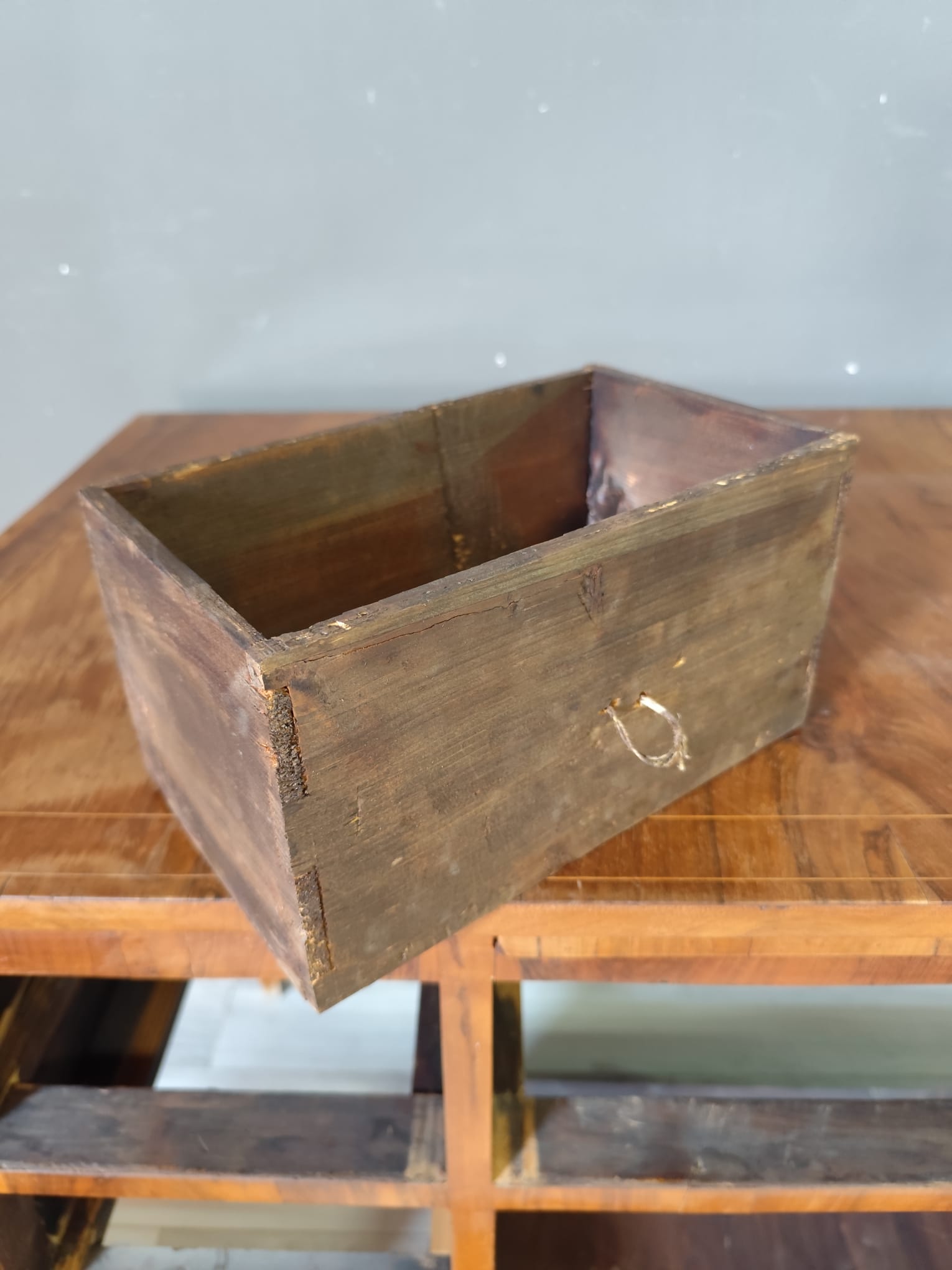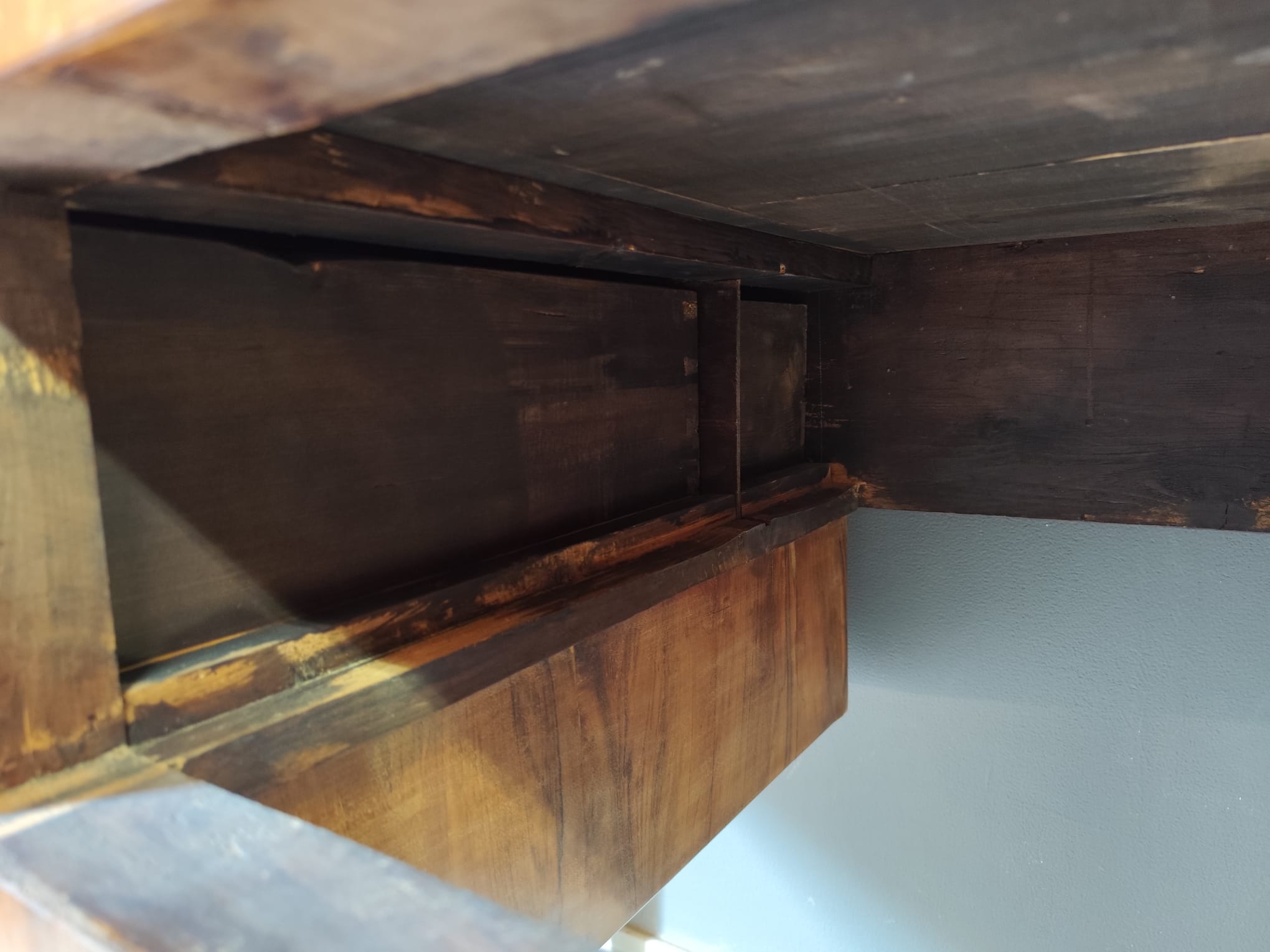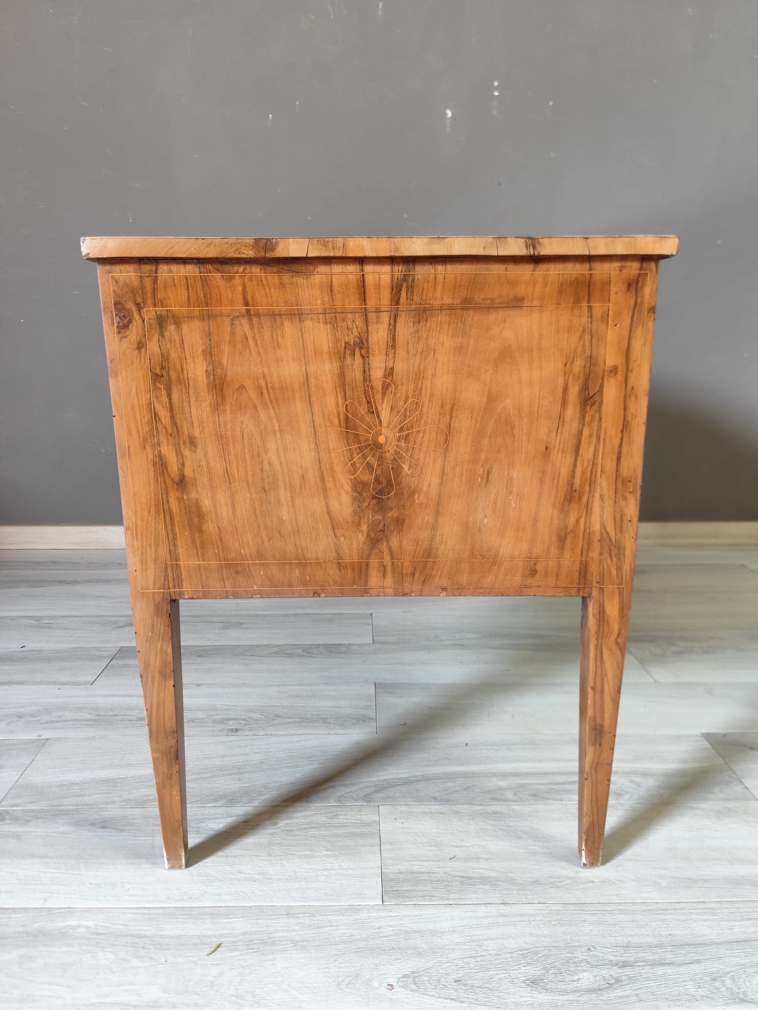 Antica ed elegante scrivania da centro di epoca Luigi XVI a cinque cassetti. Finemente lastronata in noce con delicati intarsi in acero su tutte le superfici. Sul fronte troviamo cinque cassetti di cui uno centrale più grande con piano scorrevole sovrastante. I cassetti presentano dei segreti realizzati con doppi schienali. Conservata in buono stato.