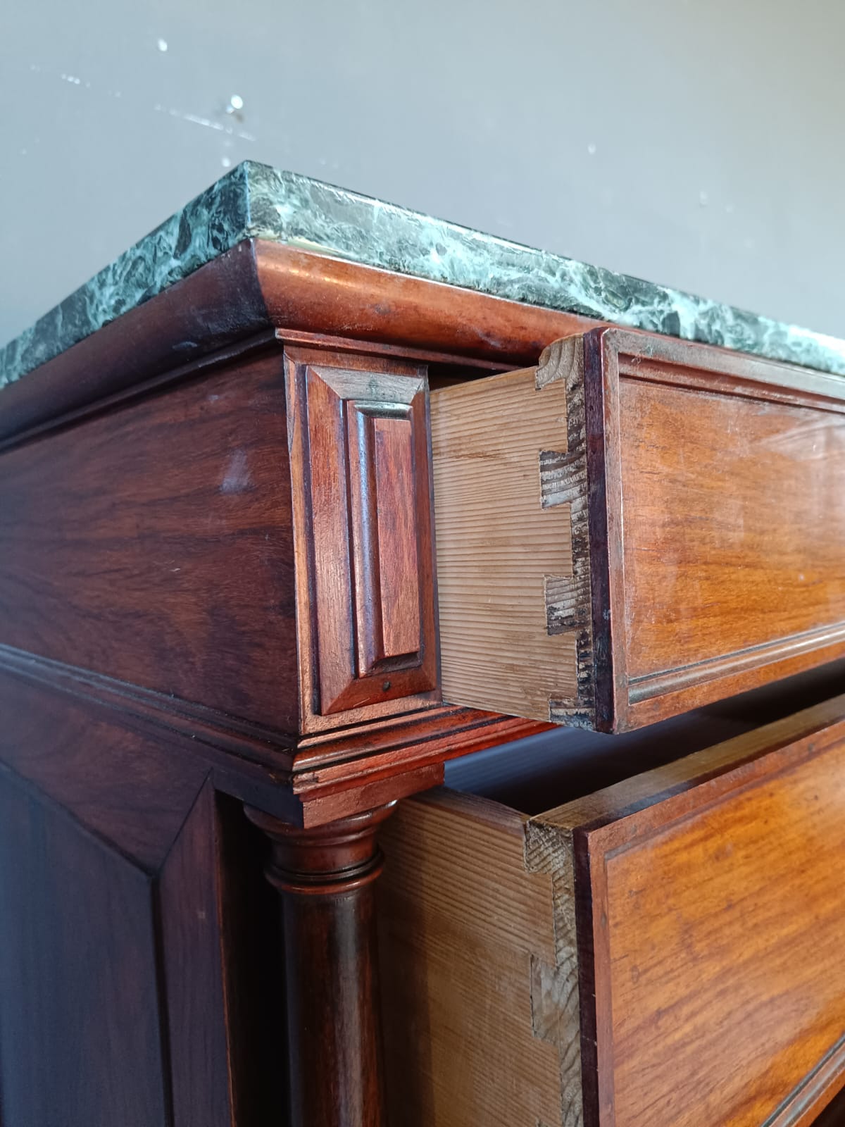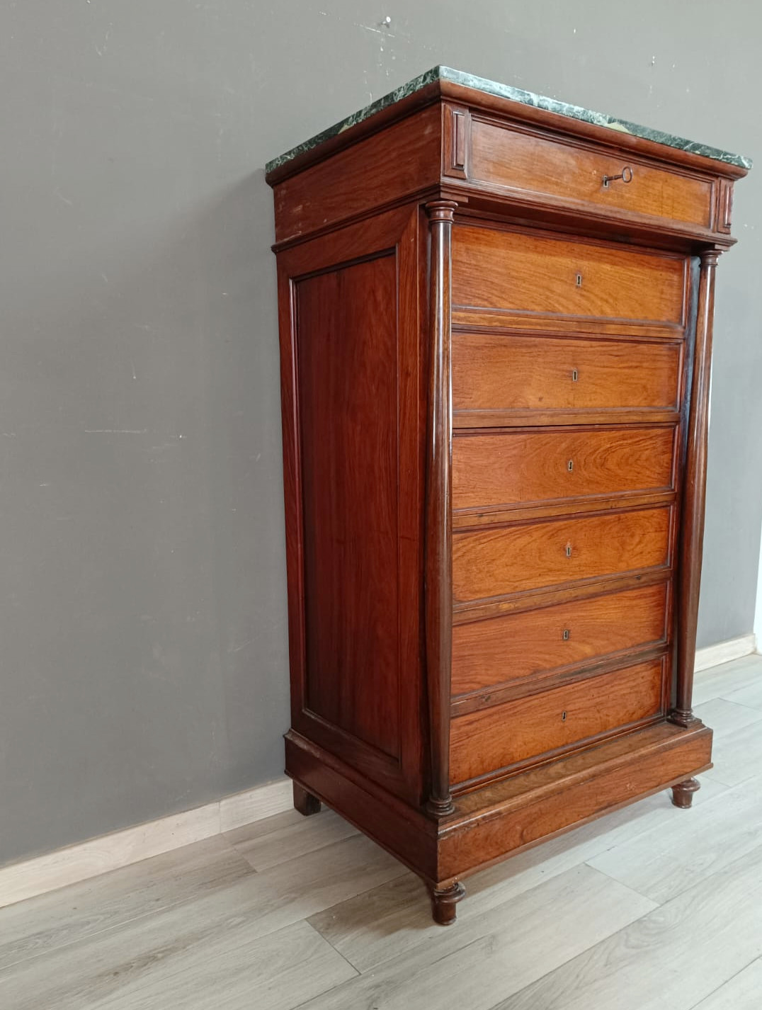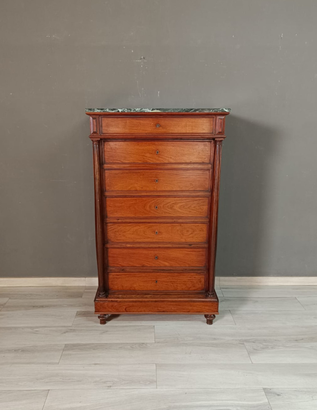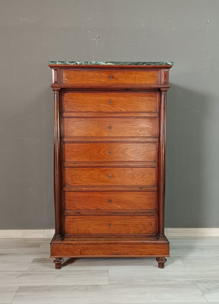 Antico settimino/cassettone a sette cassetti della fine del ‘800 dalle forme molte delicate in mogano. Piano in marmo verde alpi e struttura interna del mobile in massello di abete. Gli interni dei cassetti sono stati restaurati e pertanto si trovano in perfette condizioni. In generale, in ottimo stato conservativo.