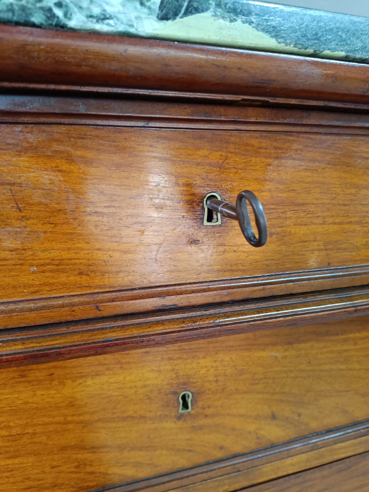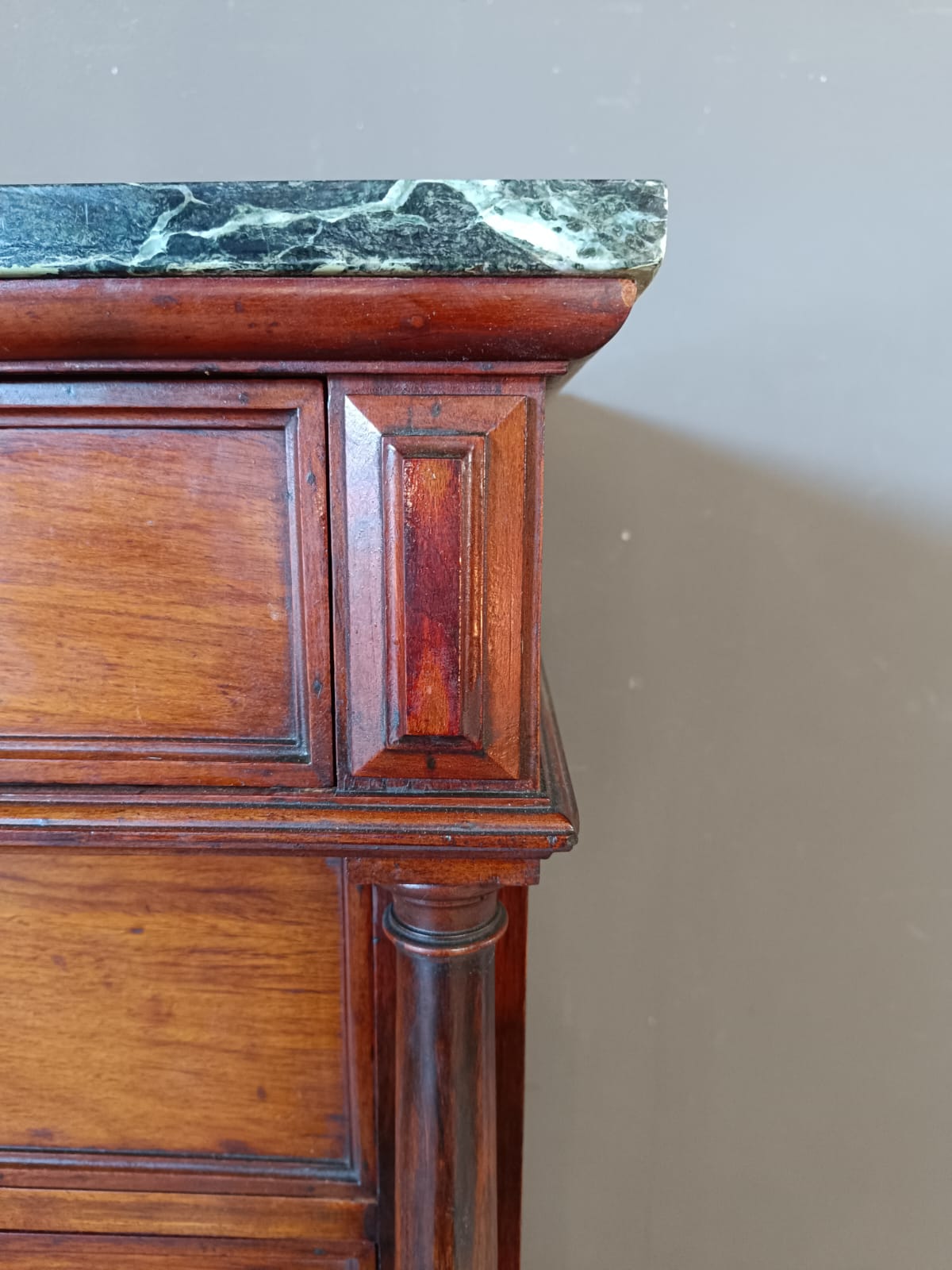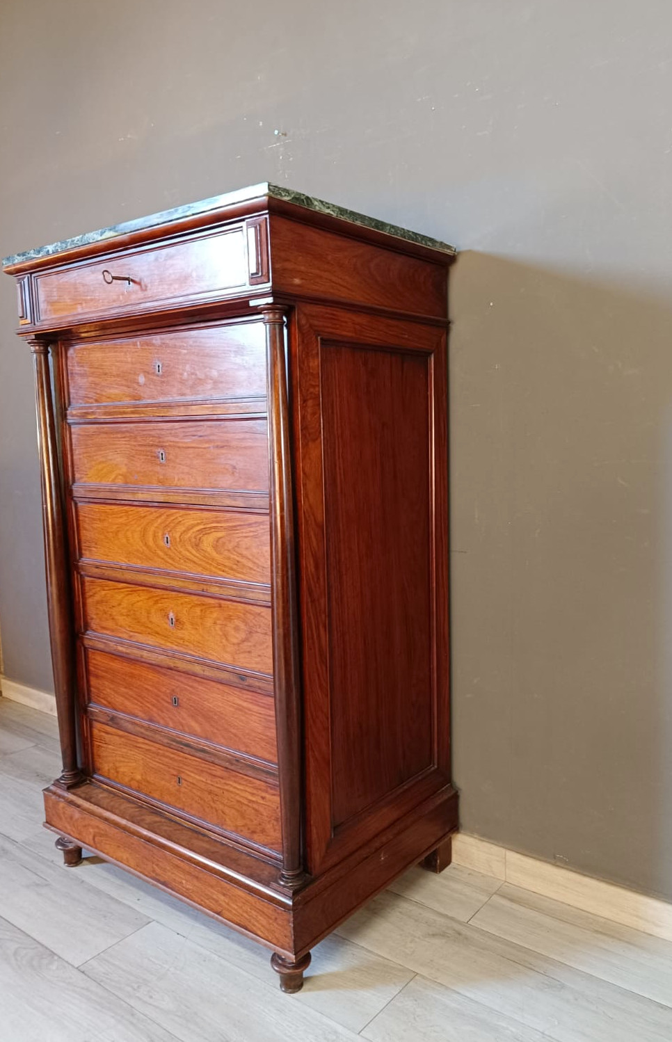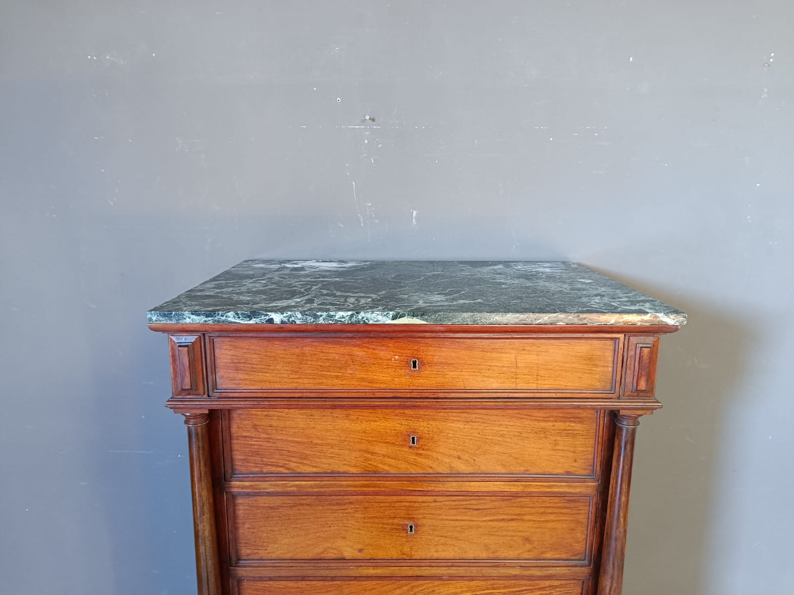 Antico settimino/cassettone a sette cassetti della fine del ‘800 dalle forme molte delicate in mogano. Piano in marmo verde alpi e struttura interna del mobile in massello di abete. Gli interni dei cassetti sono stati restaurati e pertanto si trovano in perfette condizioni. In generale, in ottimo stato conservativo.