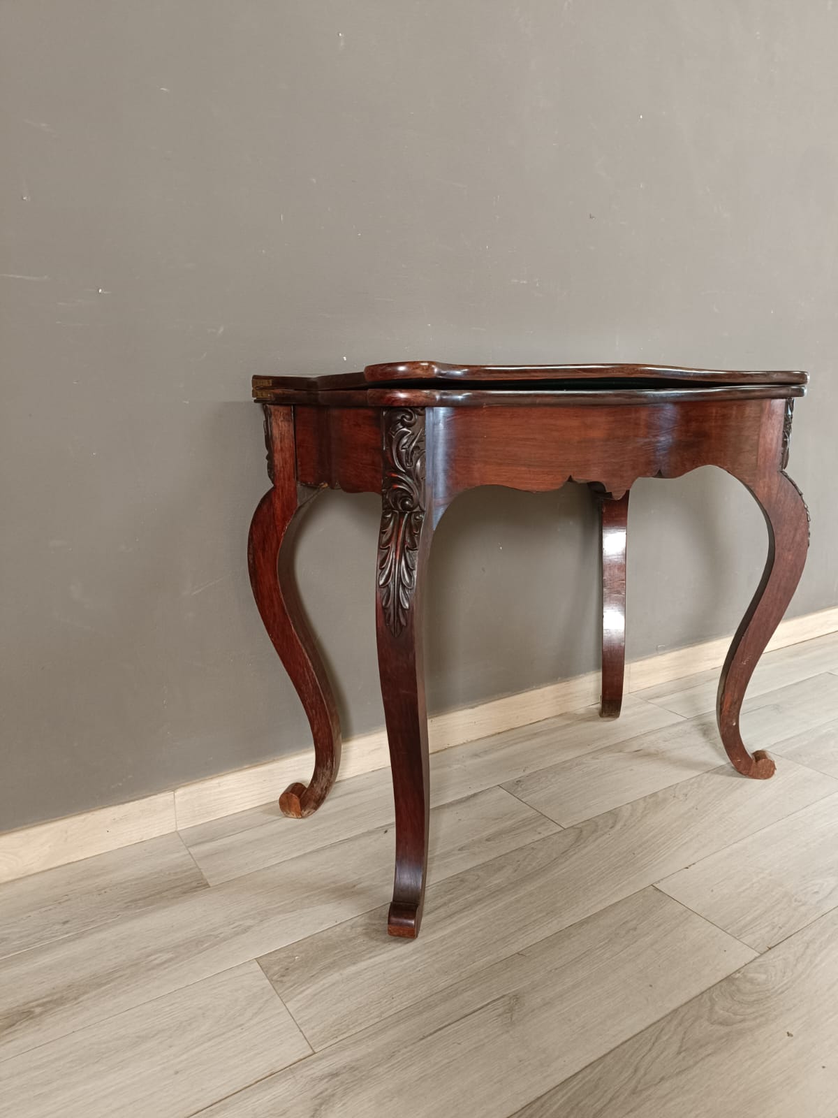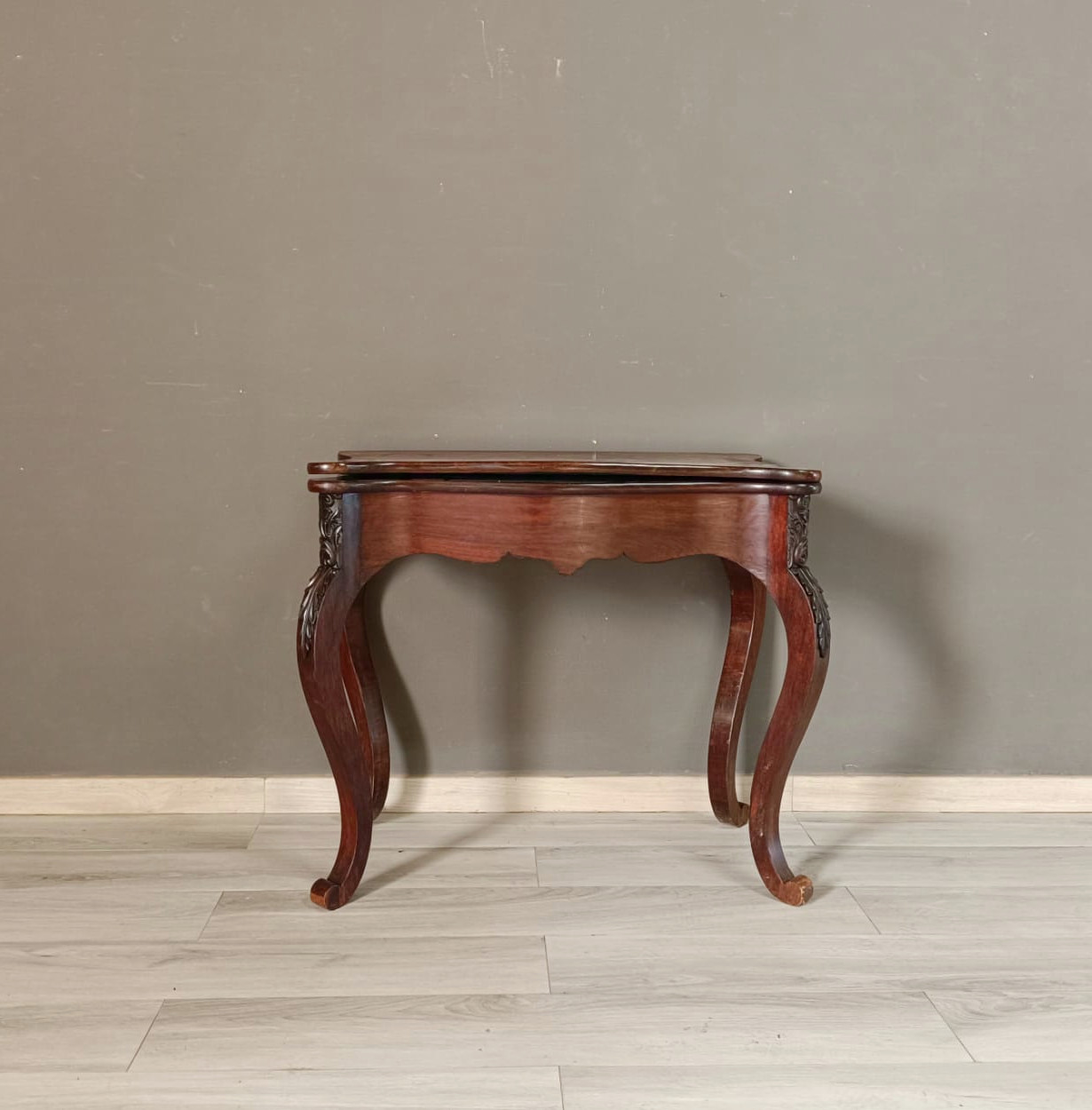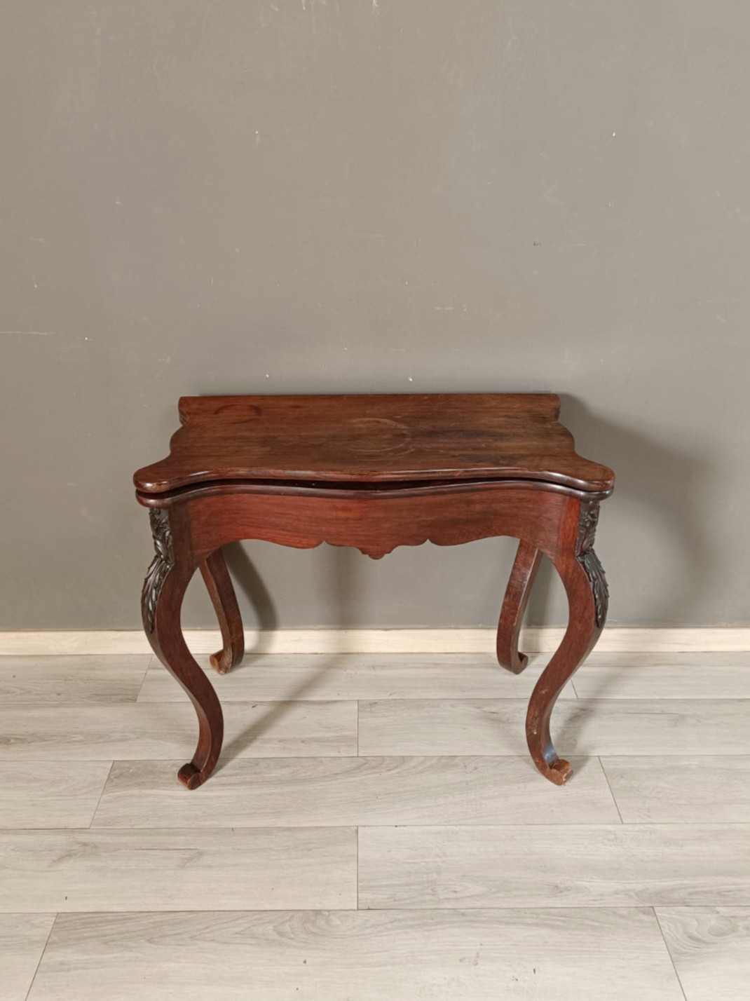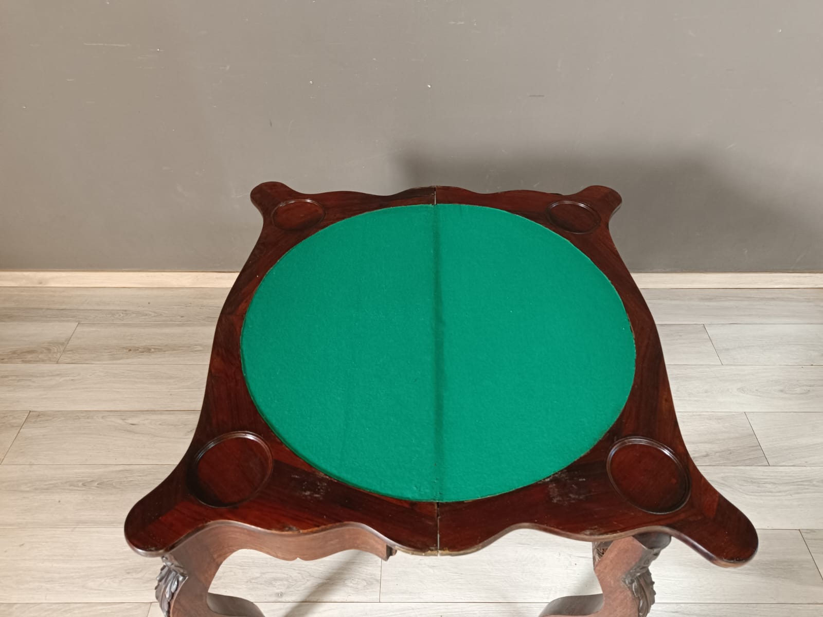 Consolle/tavolino da gioco da poter posizionare a parte o al centro quando aperto in palissandro. Intagli a motivi floreali sulle gambe. In buono stato conservativo. Panno in perfette condizioni.