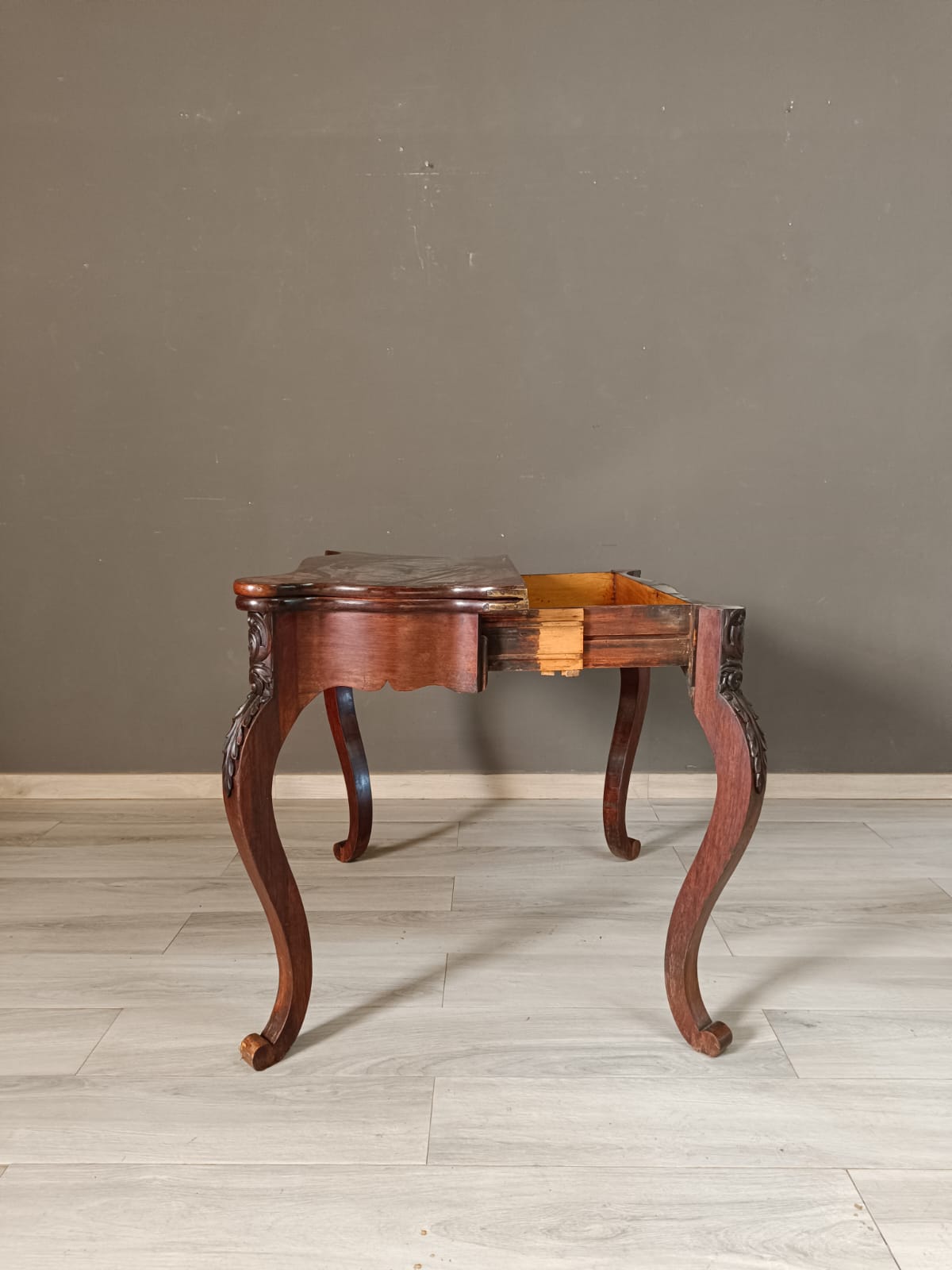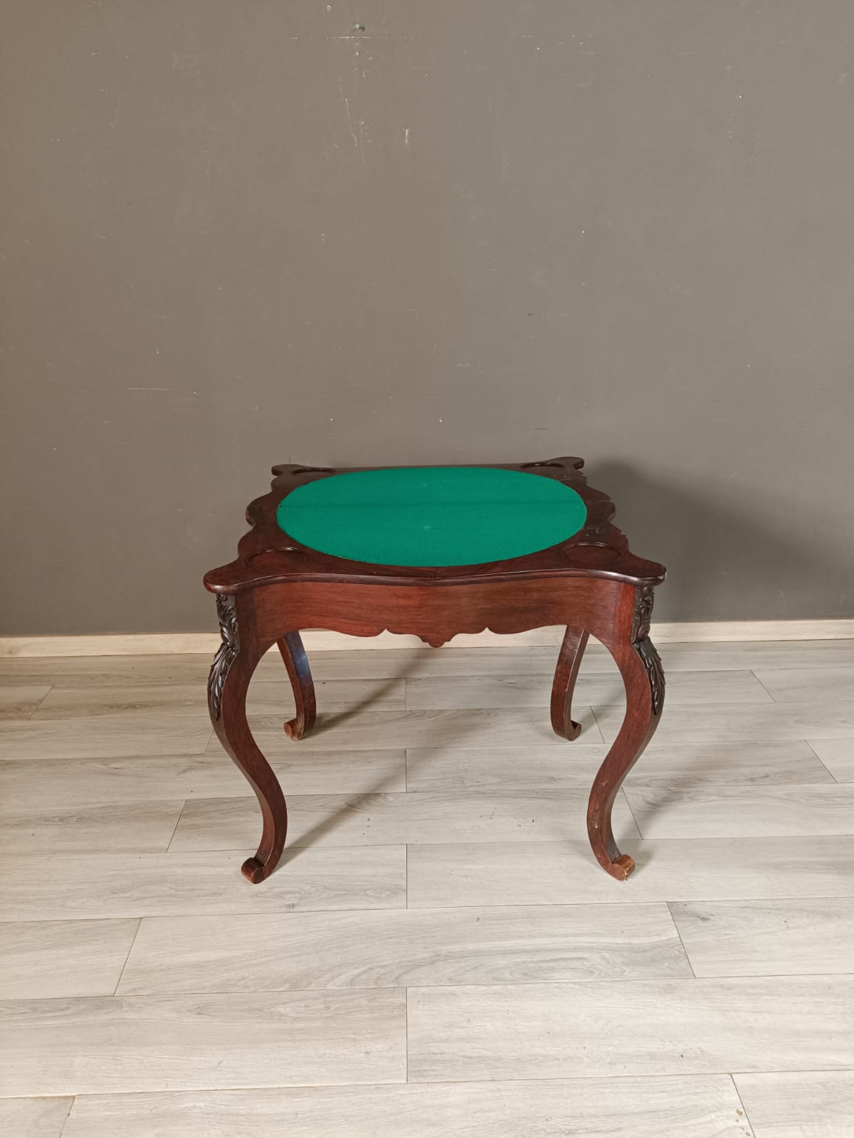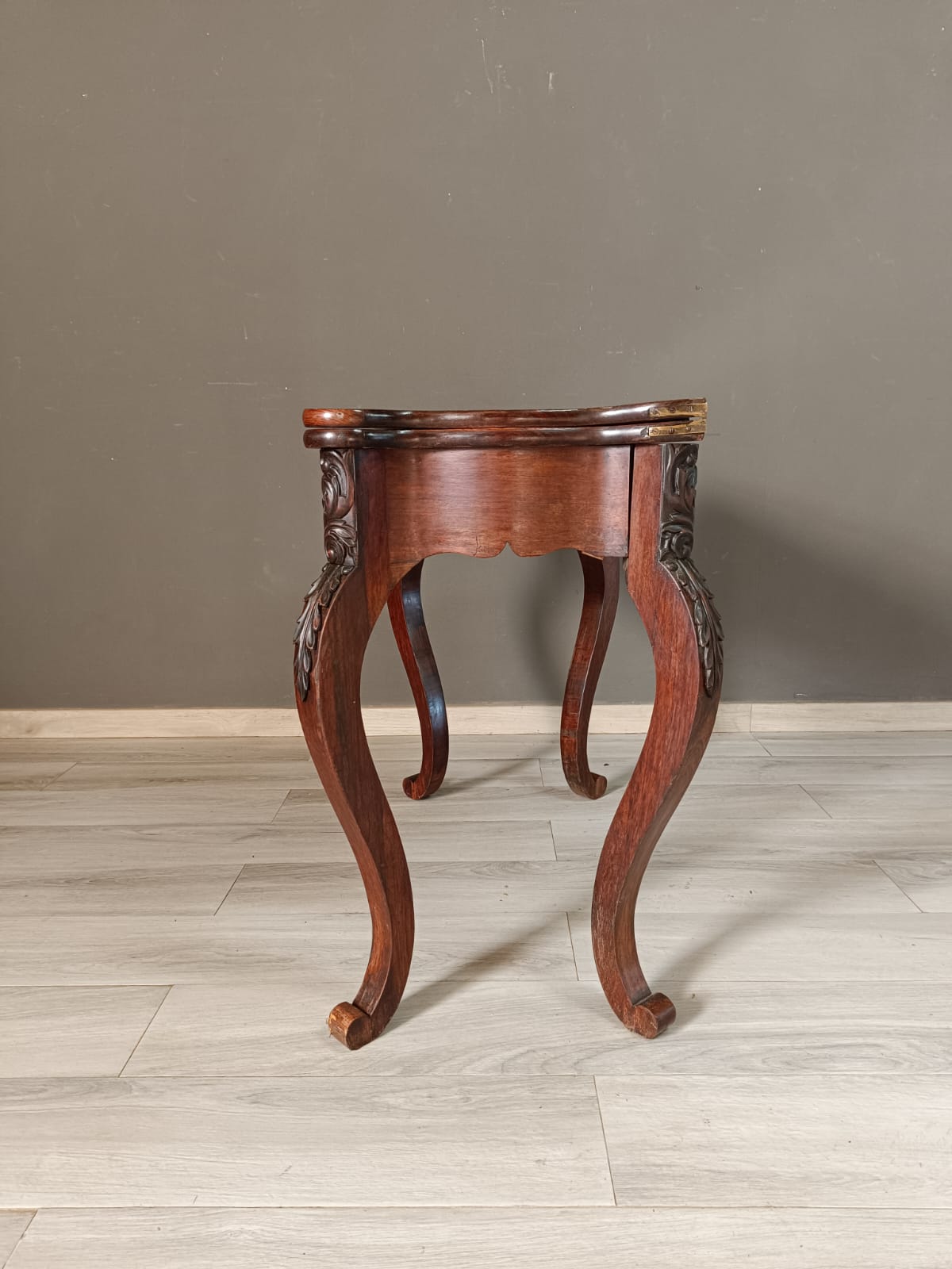 Consolle/tavolino da gioco da poter posizionare a parte o al centro quando aperto in palissandro. Intagli a motivi floreali sulle gambe. In buono stato conservativo. Panno in perfette condizioni.