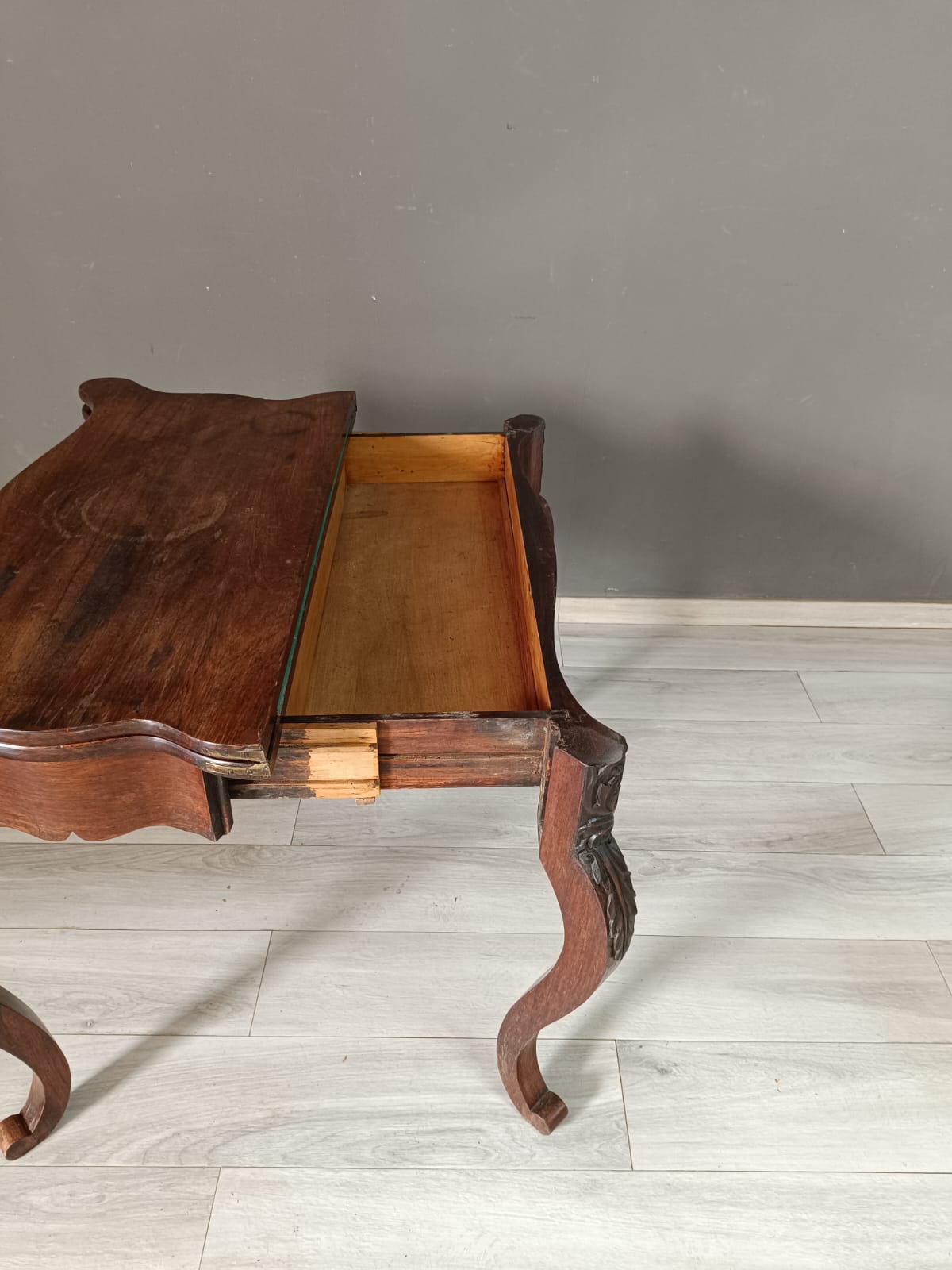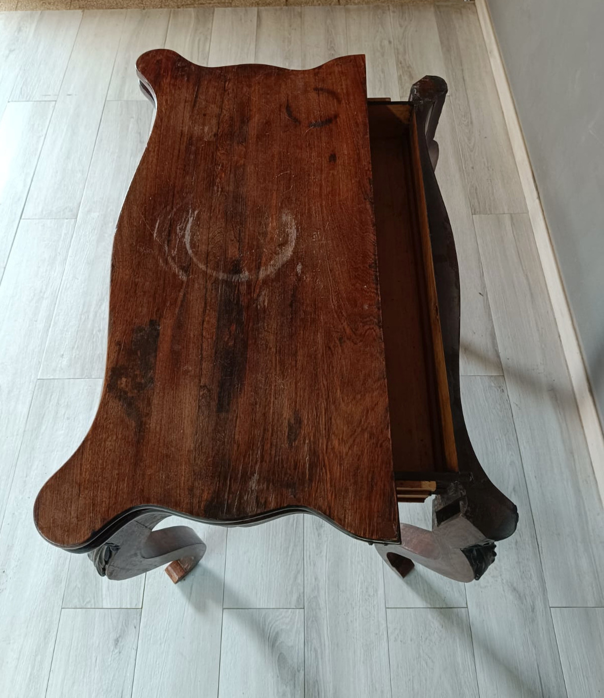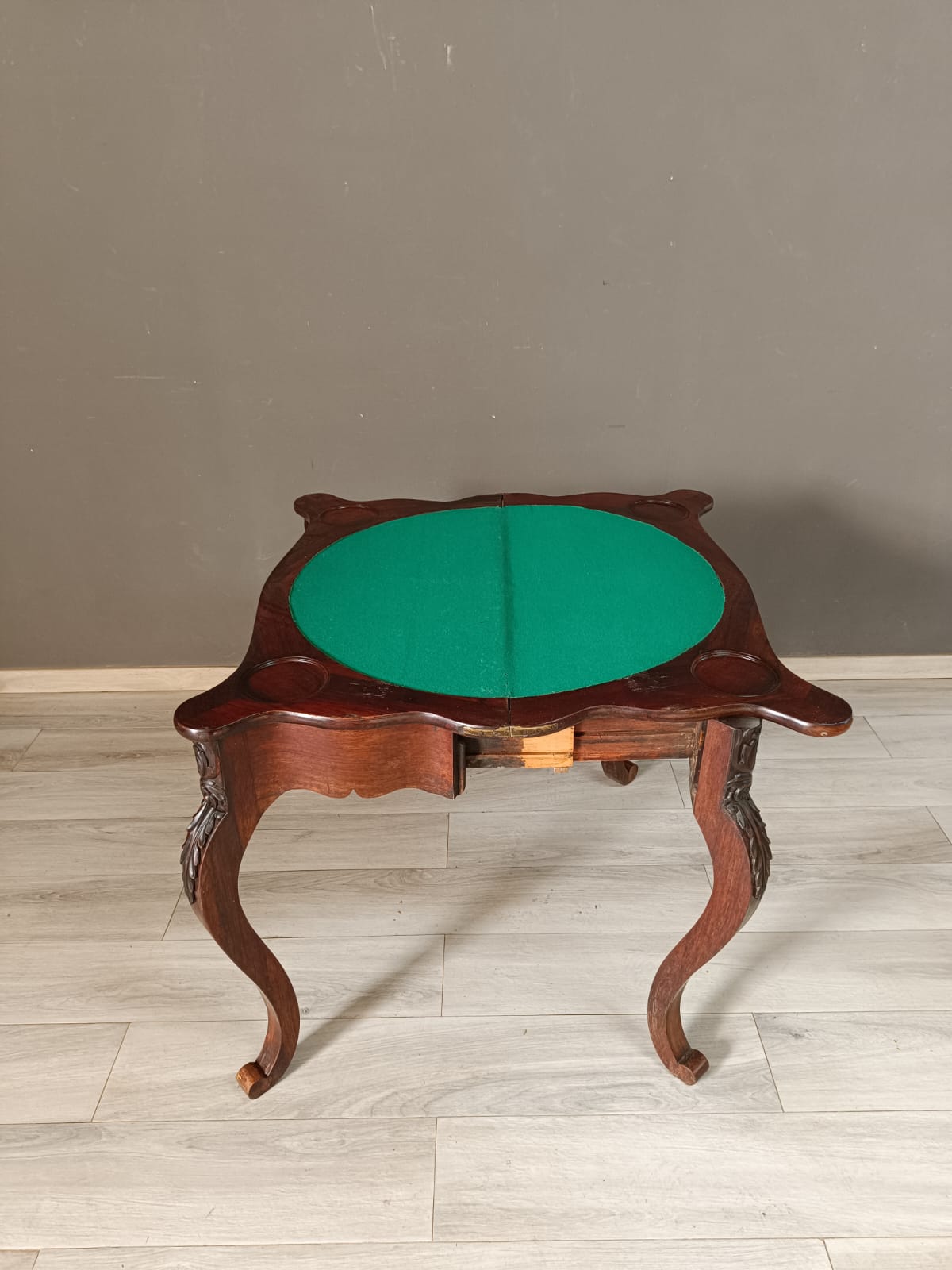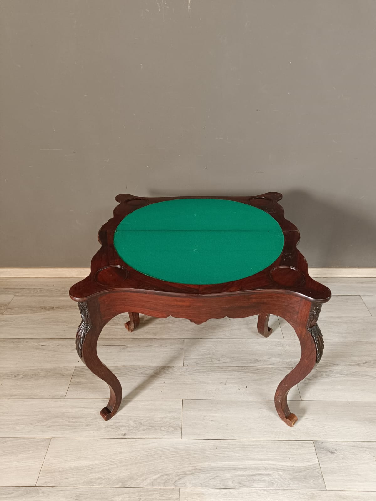 Consolle/tavolino da gioco da poter posizionare a parte o al centro quando aperto in palissandro. Intagli a motivi floreali sulle gambe. In buono stato conservativo. Panno in perfette condizioni.
