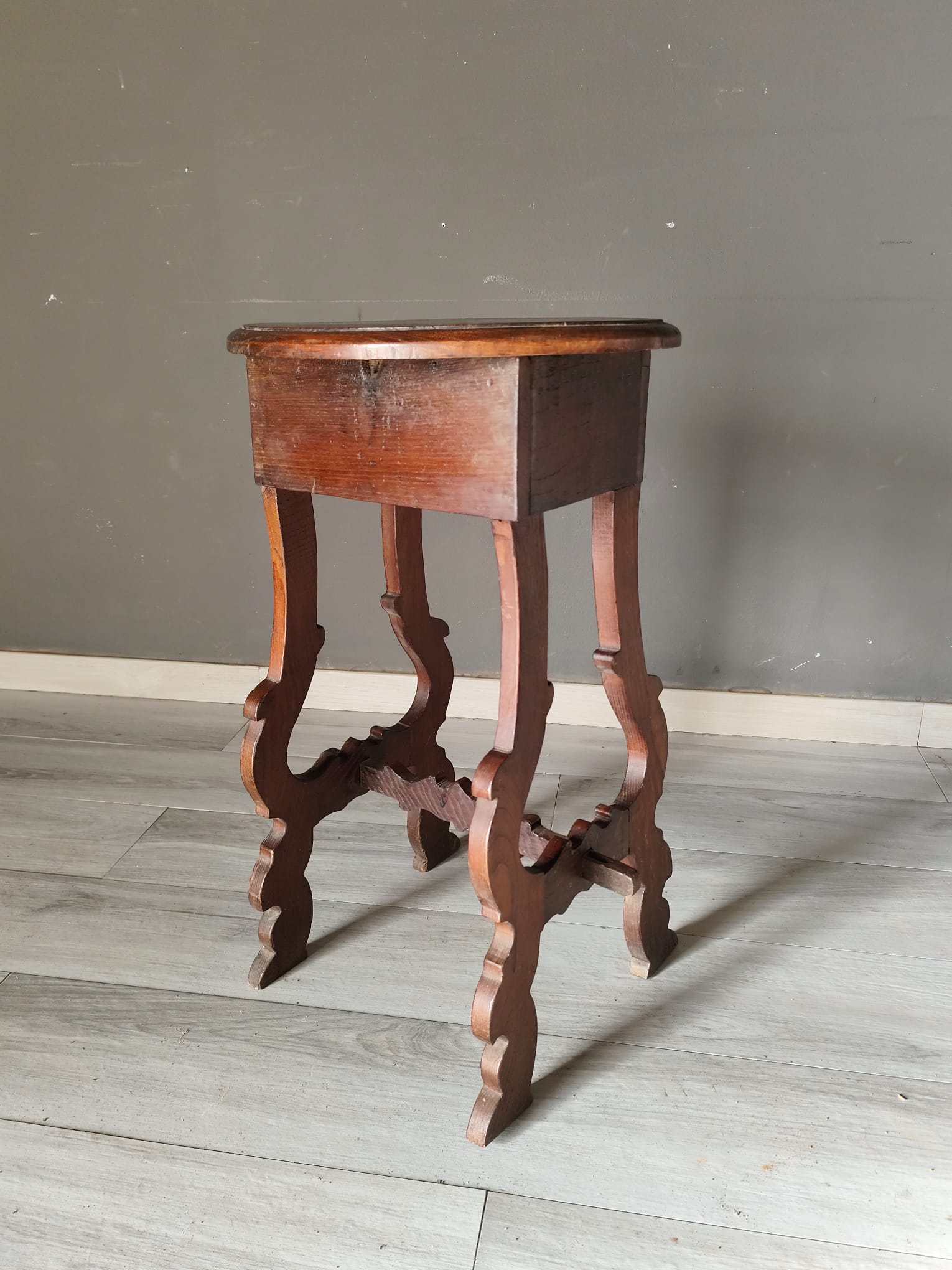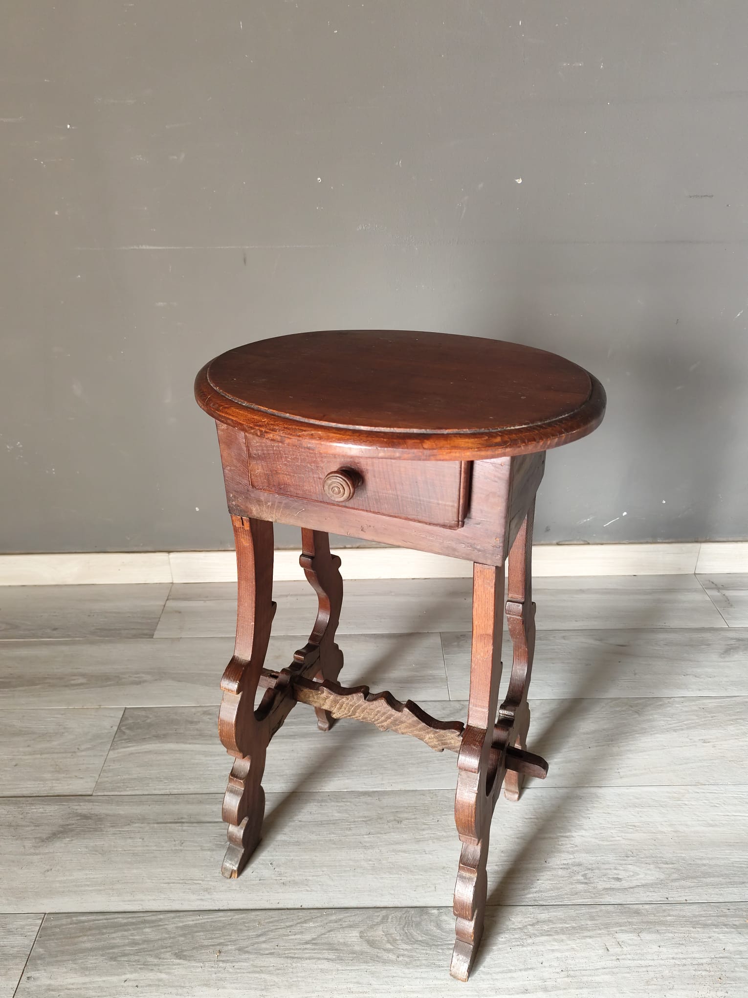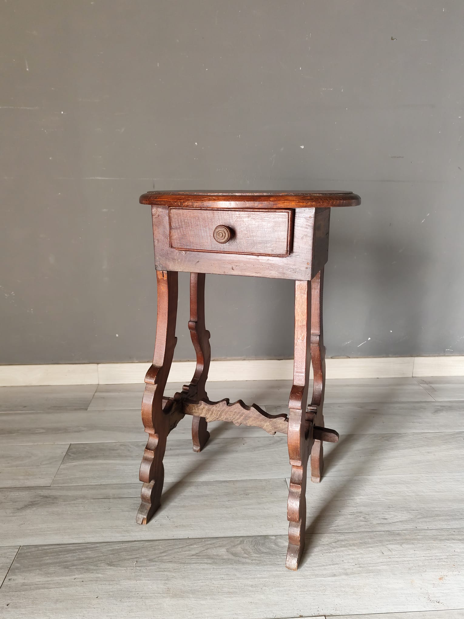 Tavolino di piccole dimensioni di gusto fiorentino nello stile fratino di epoca ‘700. Realizzato interamente con legno di castagno, presenta un piccolo cassetto frontale ed il piano di forma ovale. In ottimo stato conservativo.