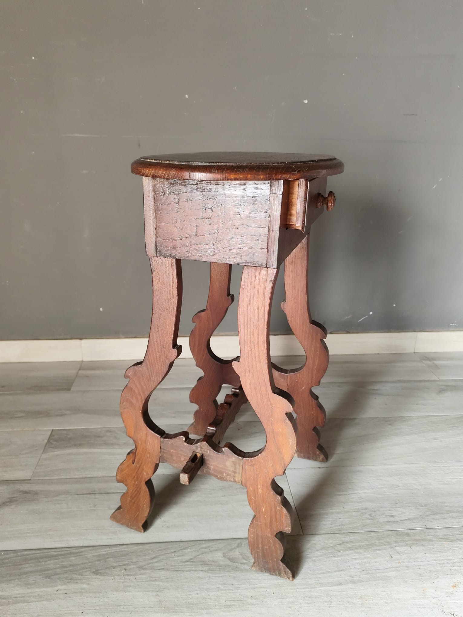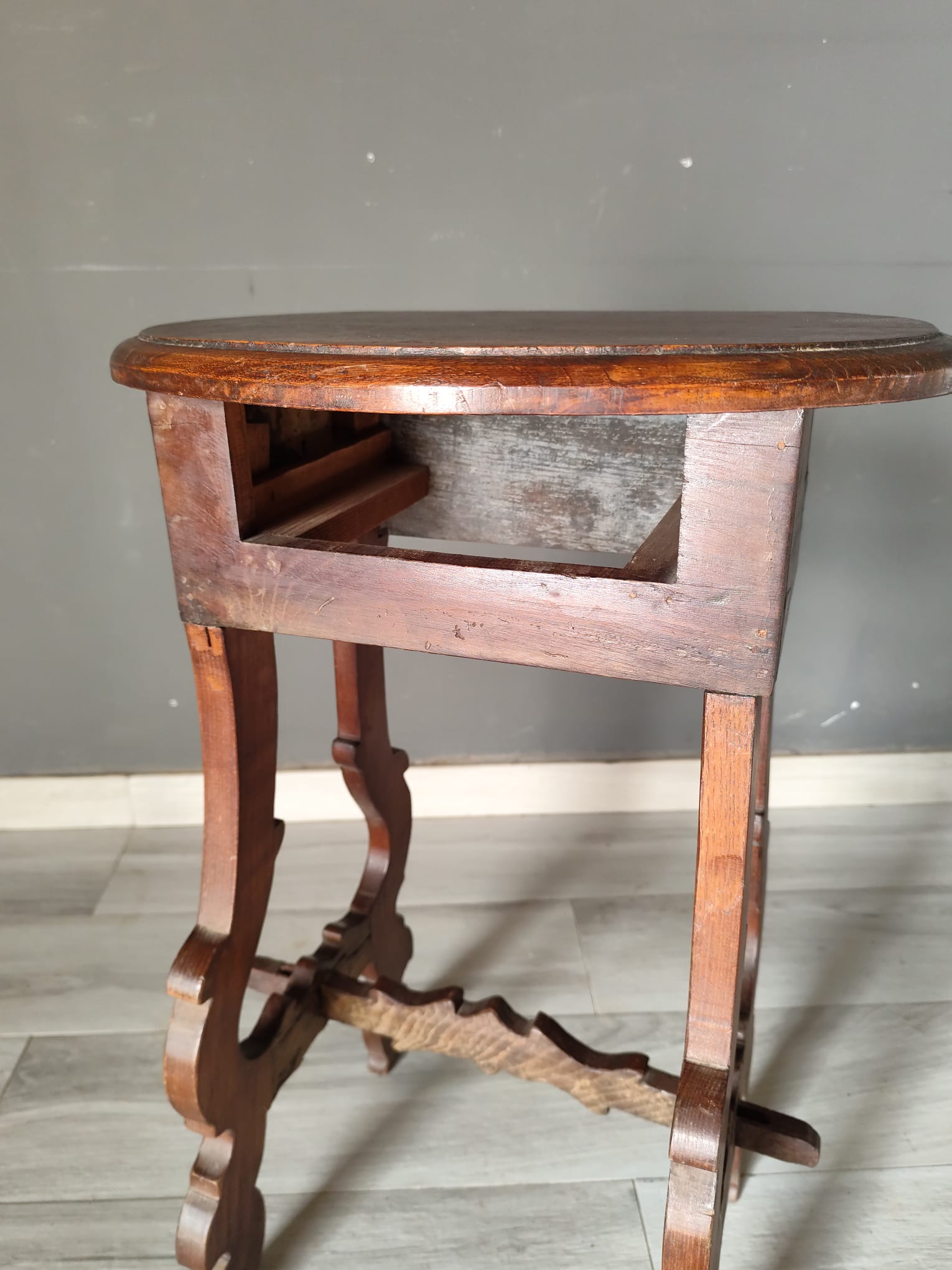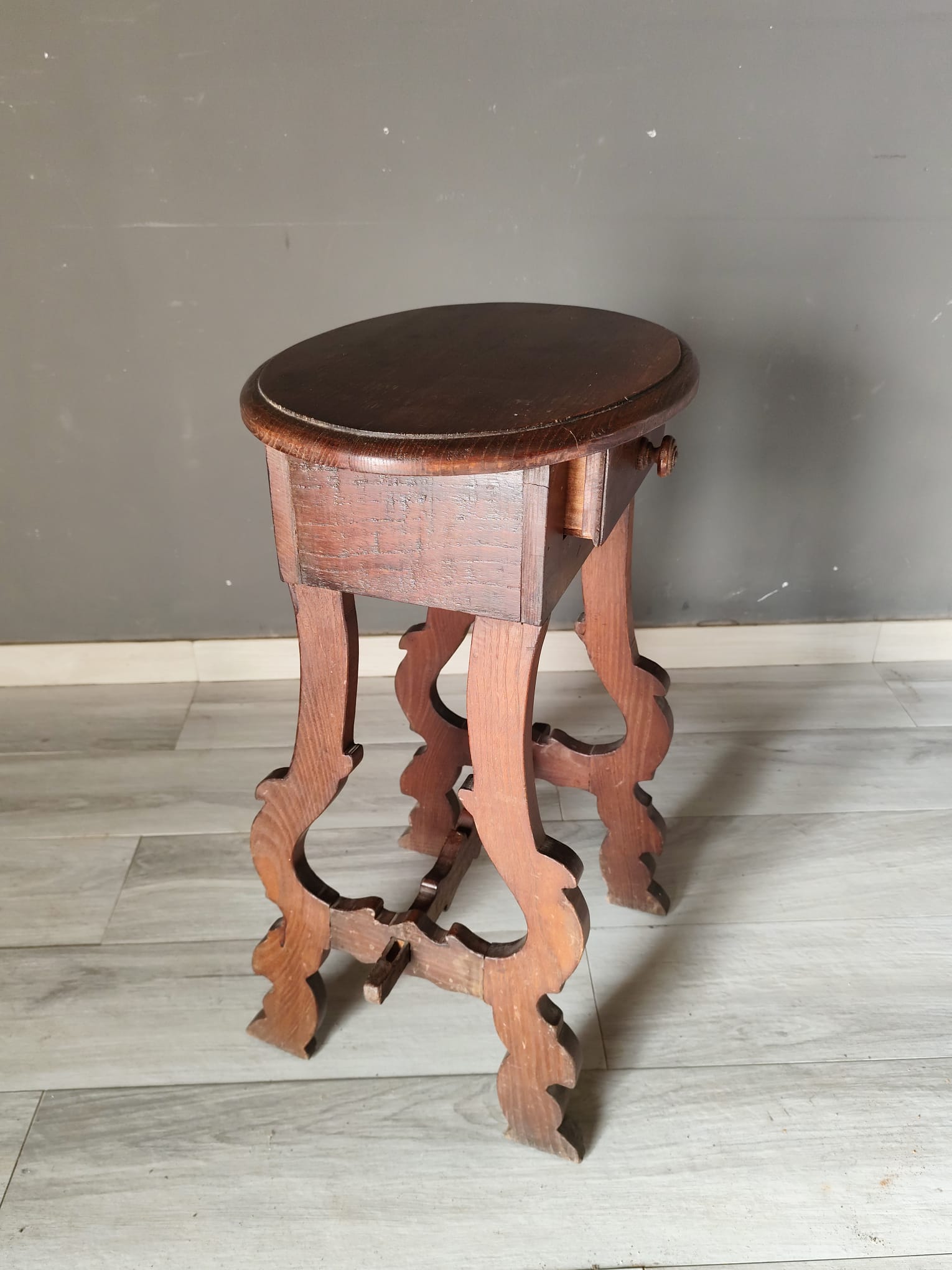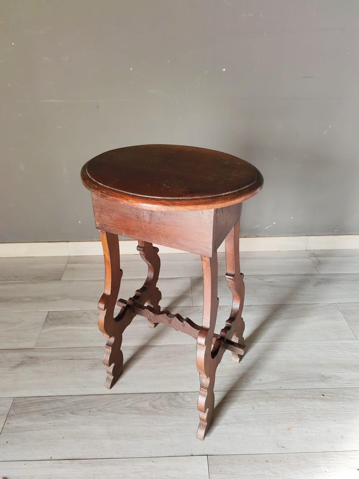 Tavolino di piccole dimensioni di gusto fiorentino nello stile fratino di epoca ‘700. Realizzato interamente con legno di castagno, presenta un piccolo cassetto frontale ed il piano di forma ovale. In ottimo stato conservativo.