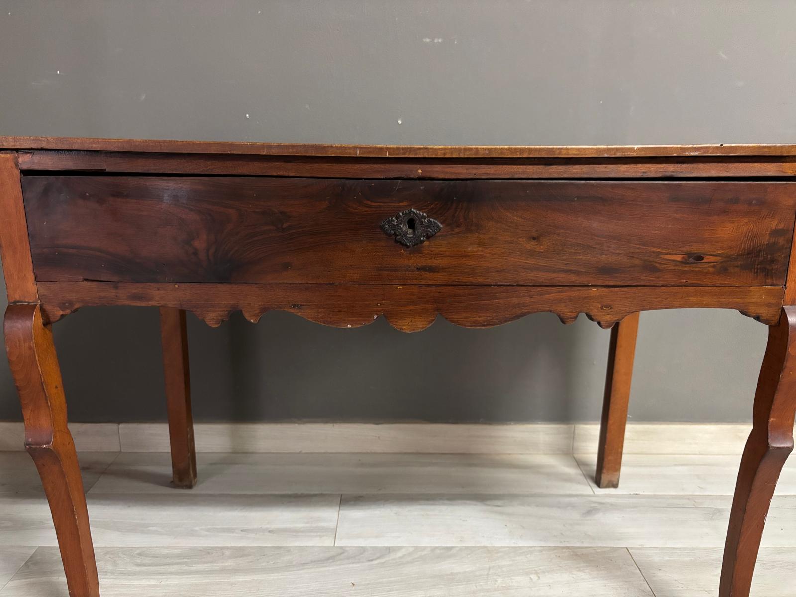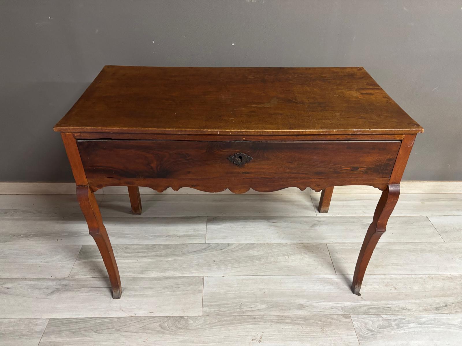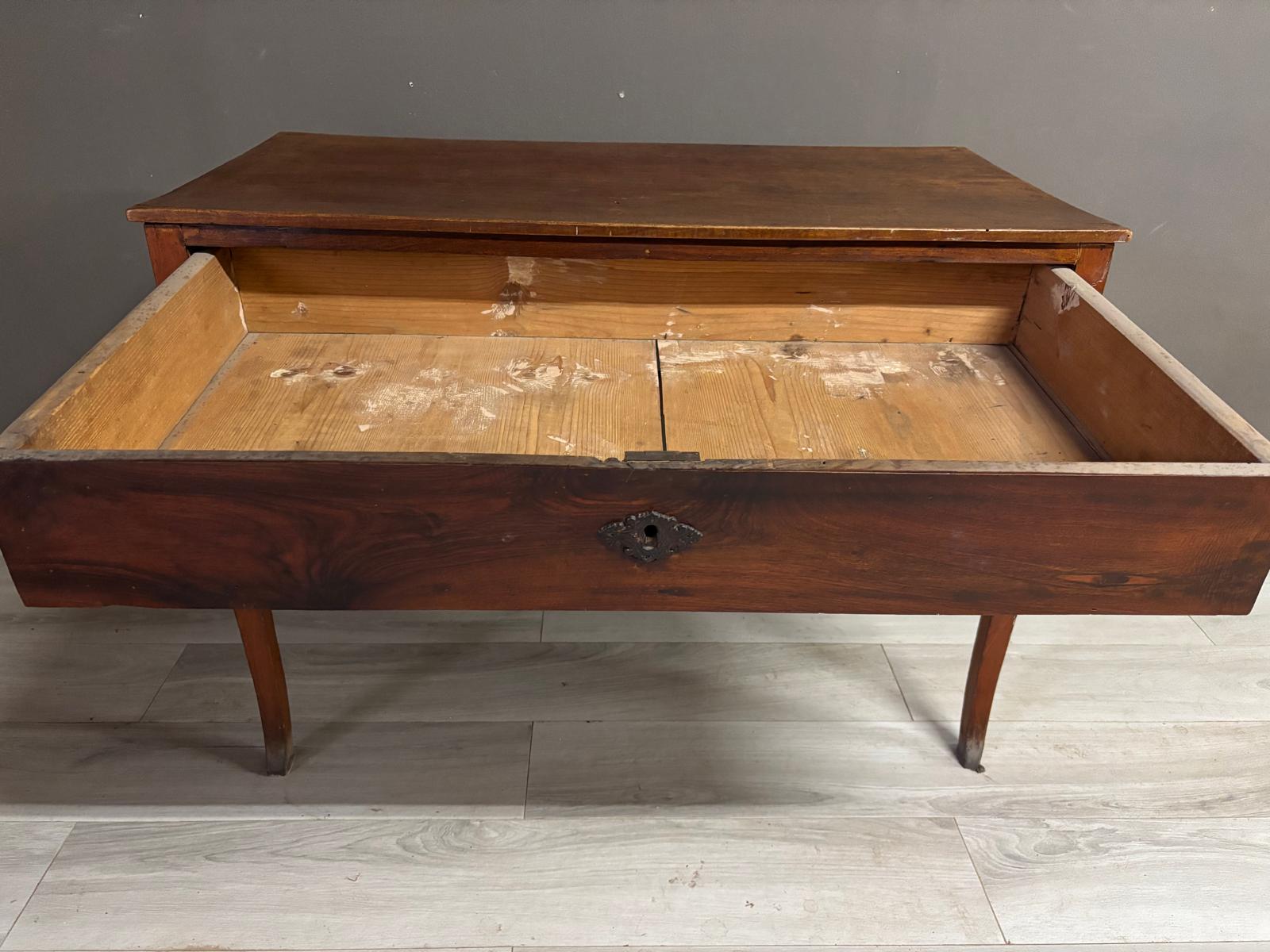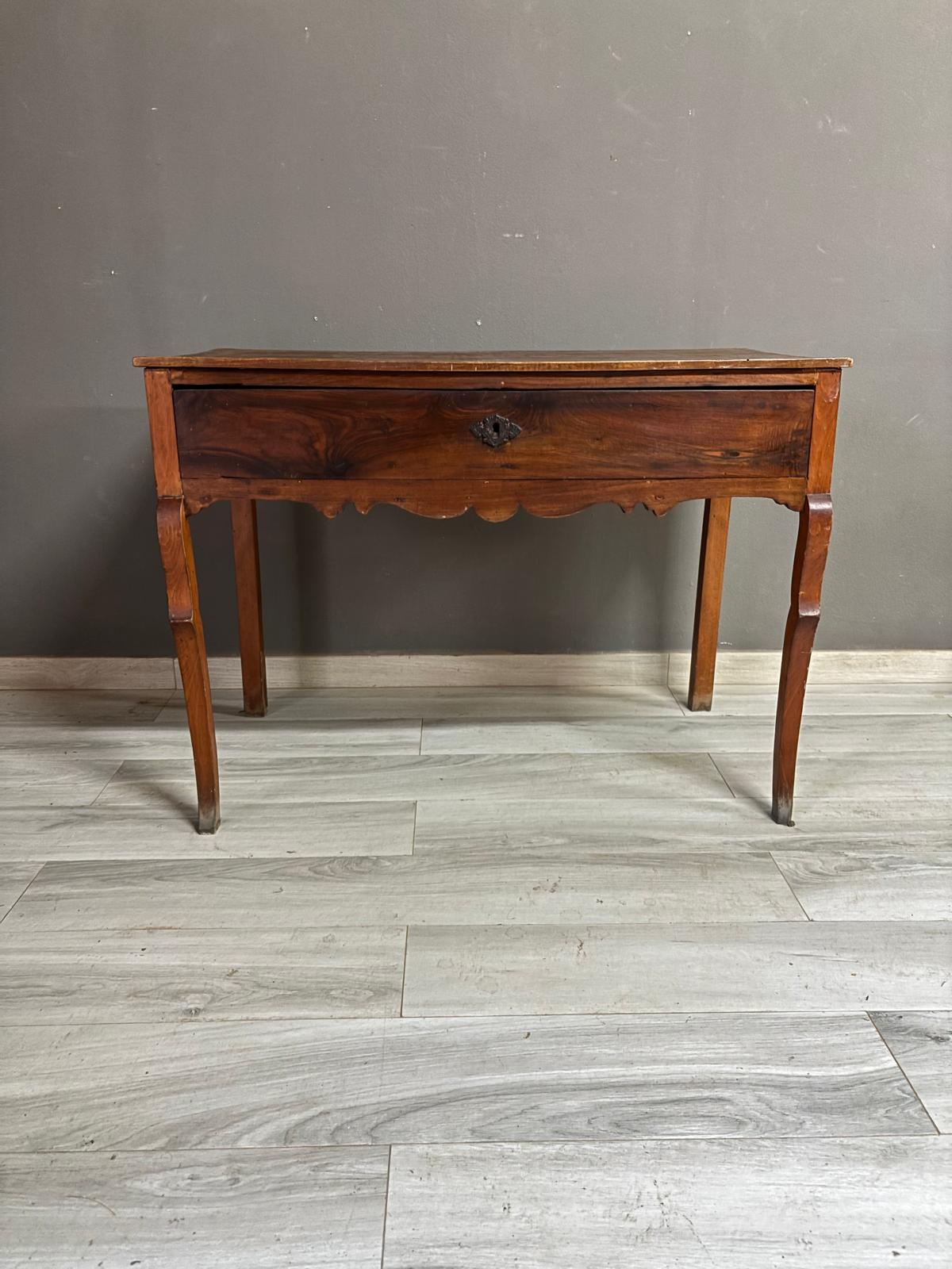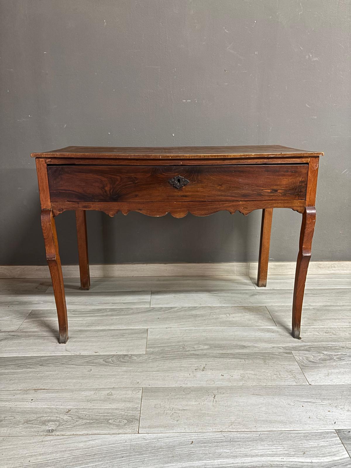 Tavolino da ingresso in massello di noce di epoca Direttorio ad un cassetto sul fronte. Conservato In patina.