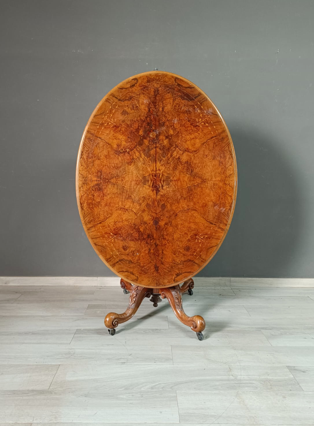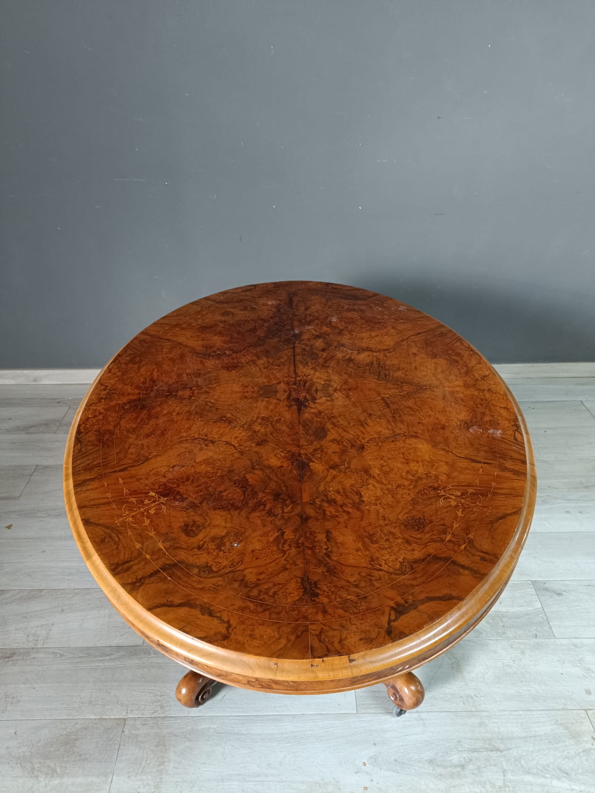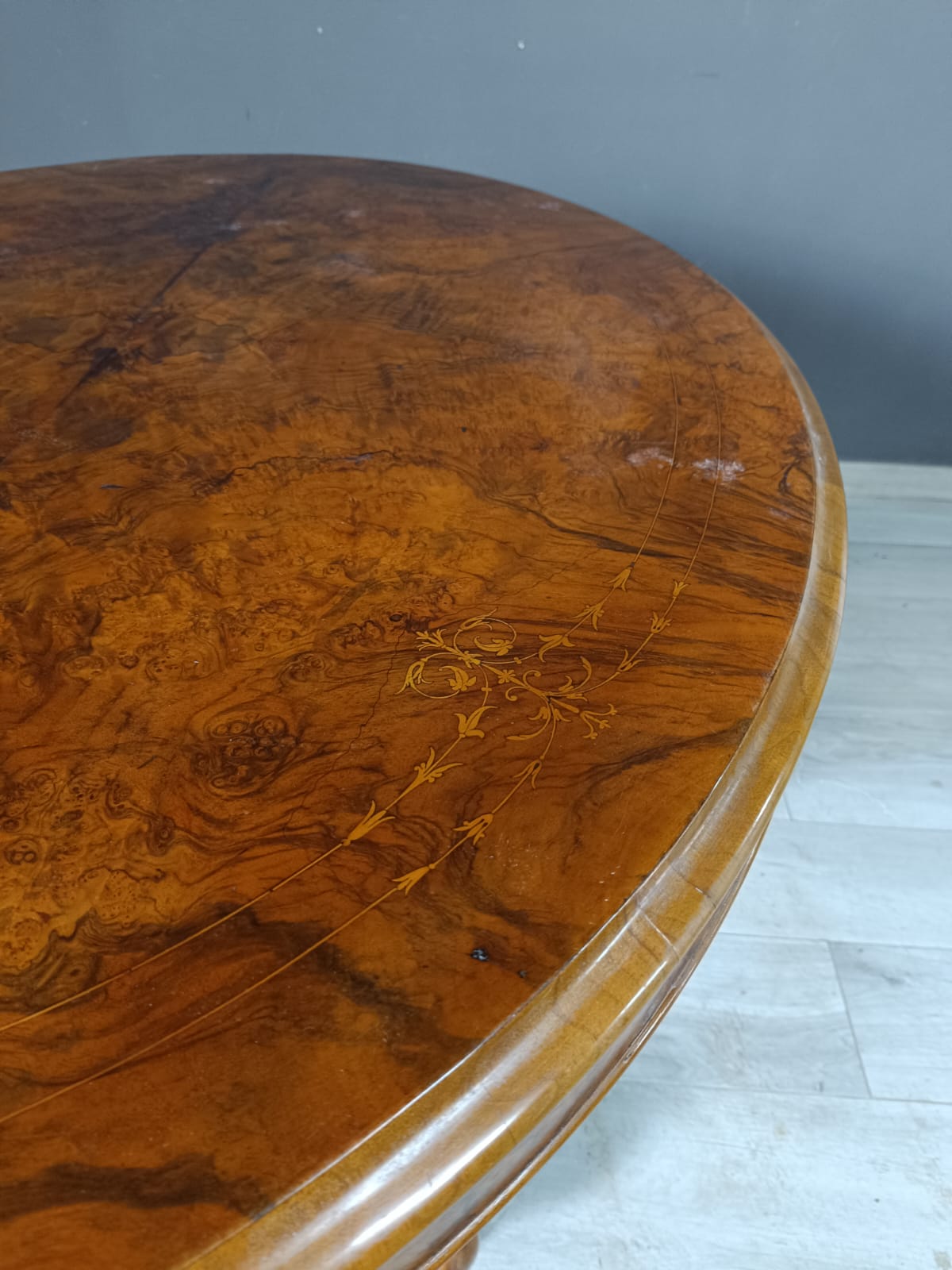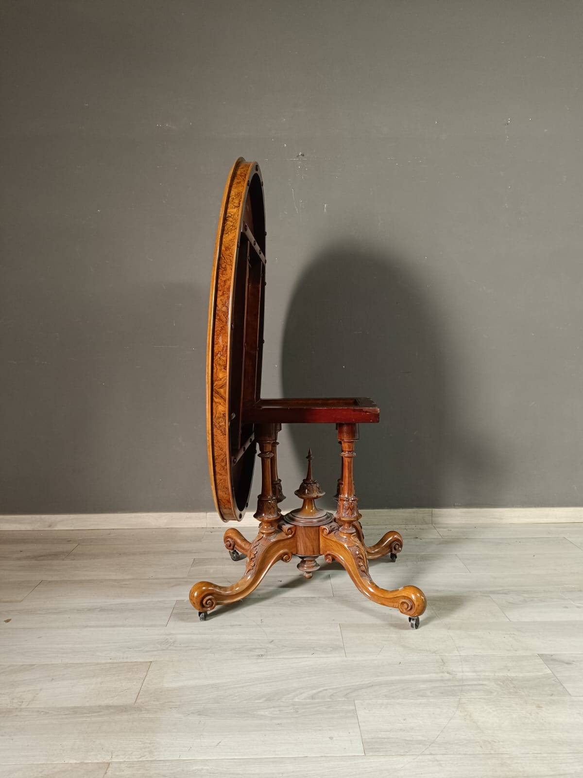 Tavolo a vela in stile vittoriano con il piano in radica di noce e intarsi in acero. Perfetto stato conservativo.
